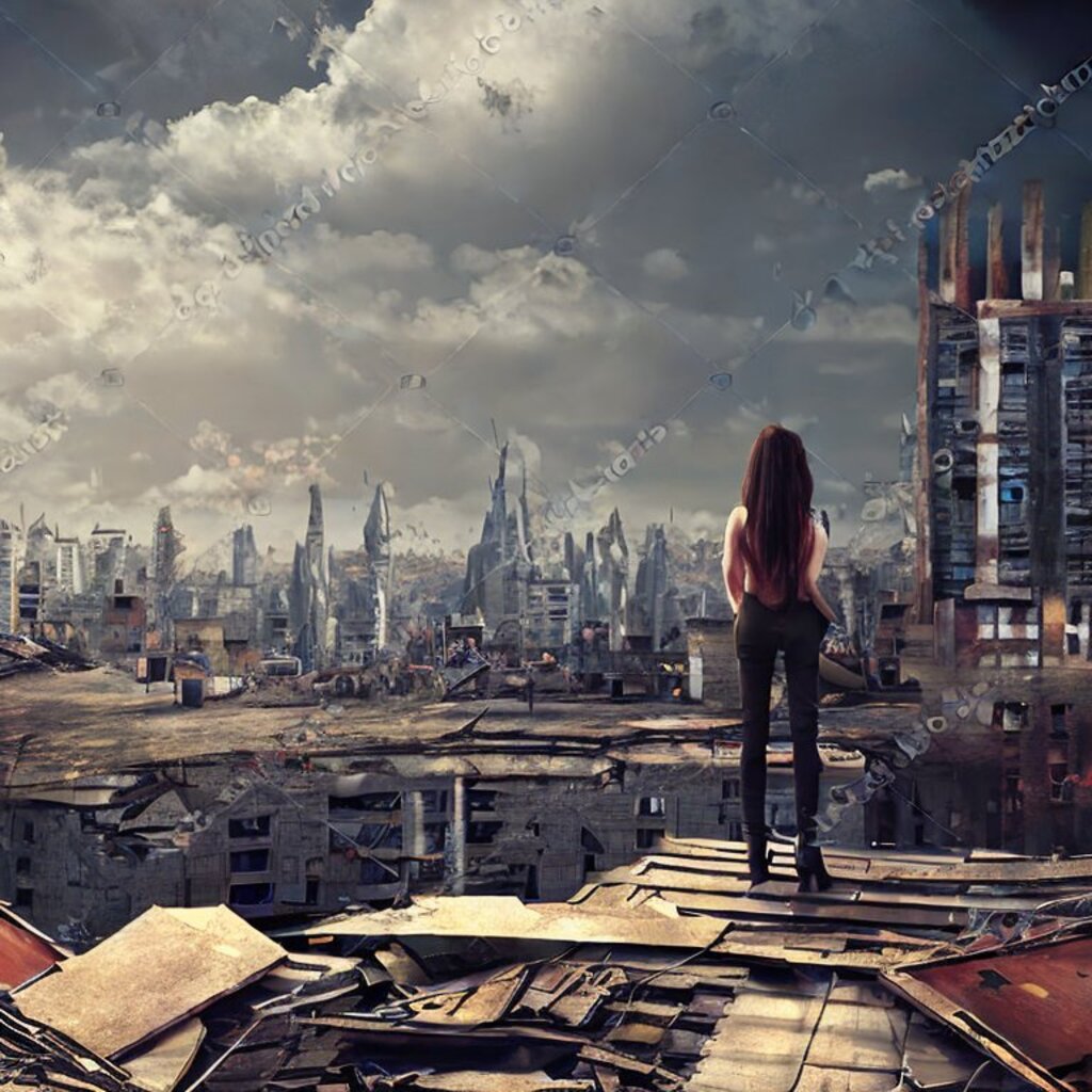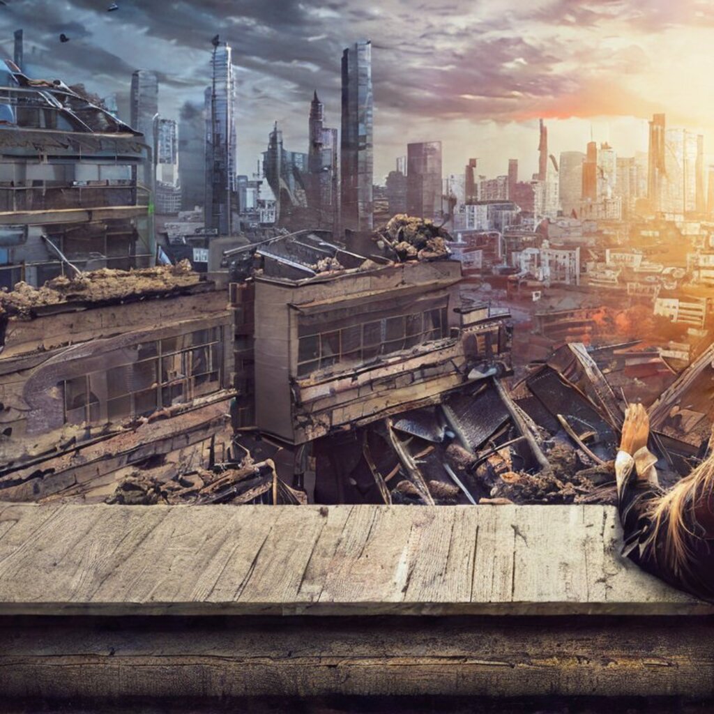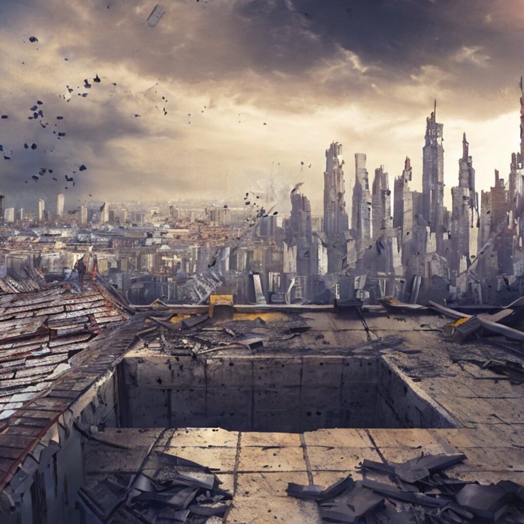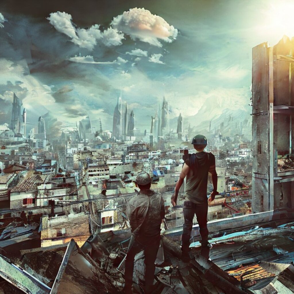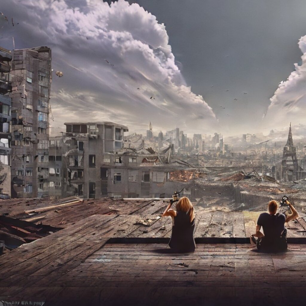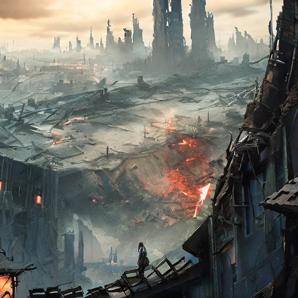 watching destroyed city from a rooftop, landscape photography, beautiful, Concept art