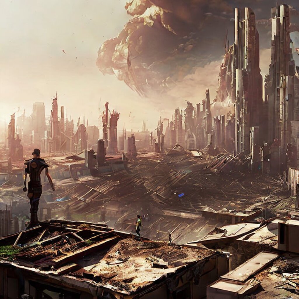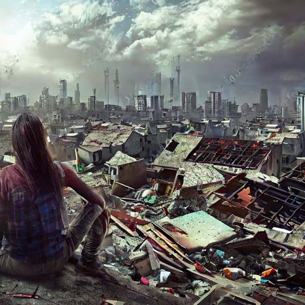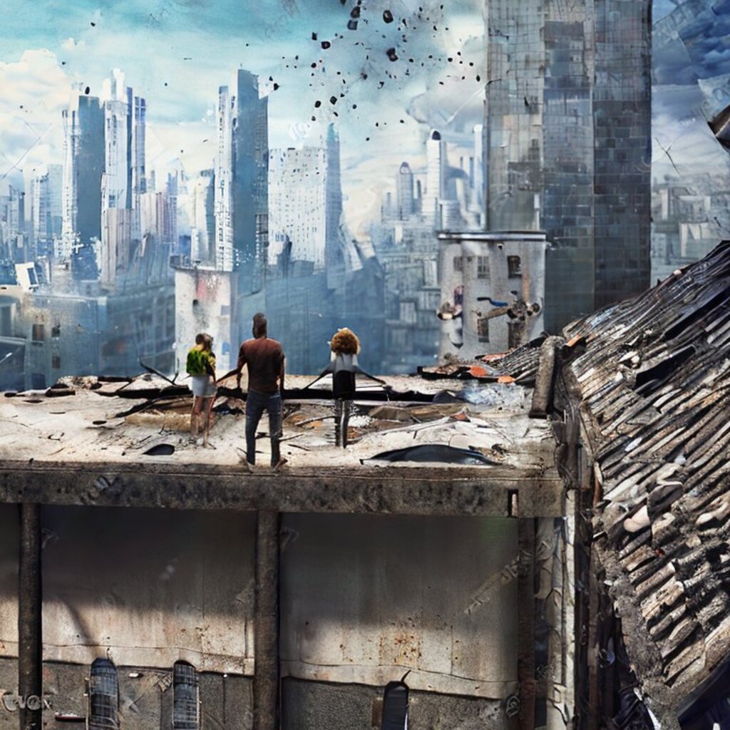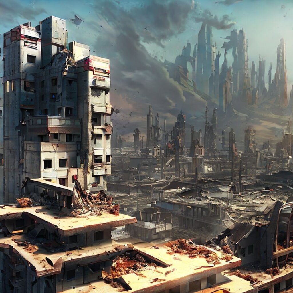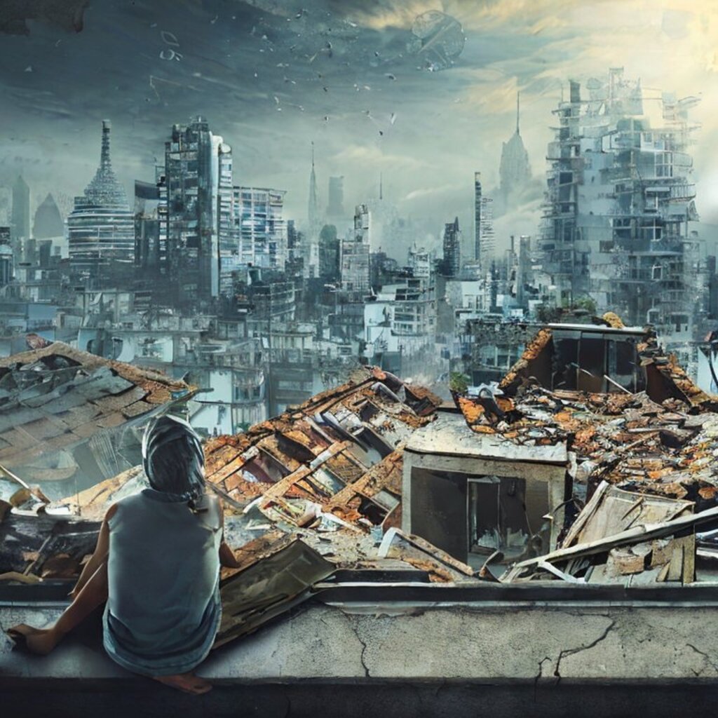 watching destroyed city from a rooftop, landscape photography, beautiful, Concept art