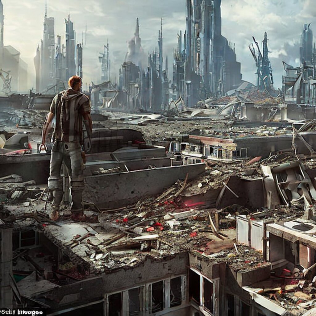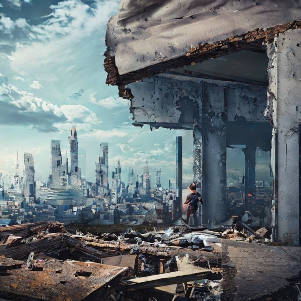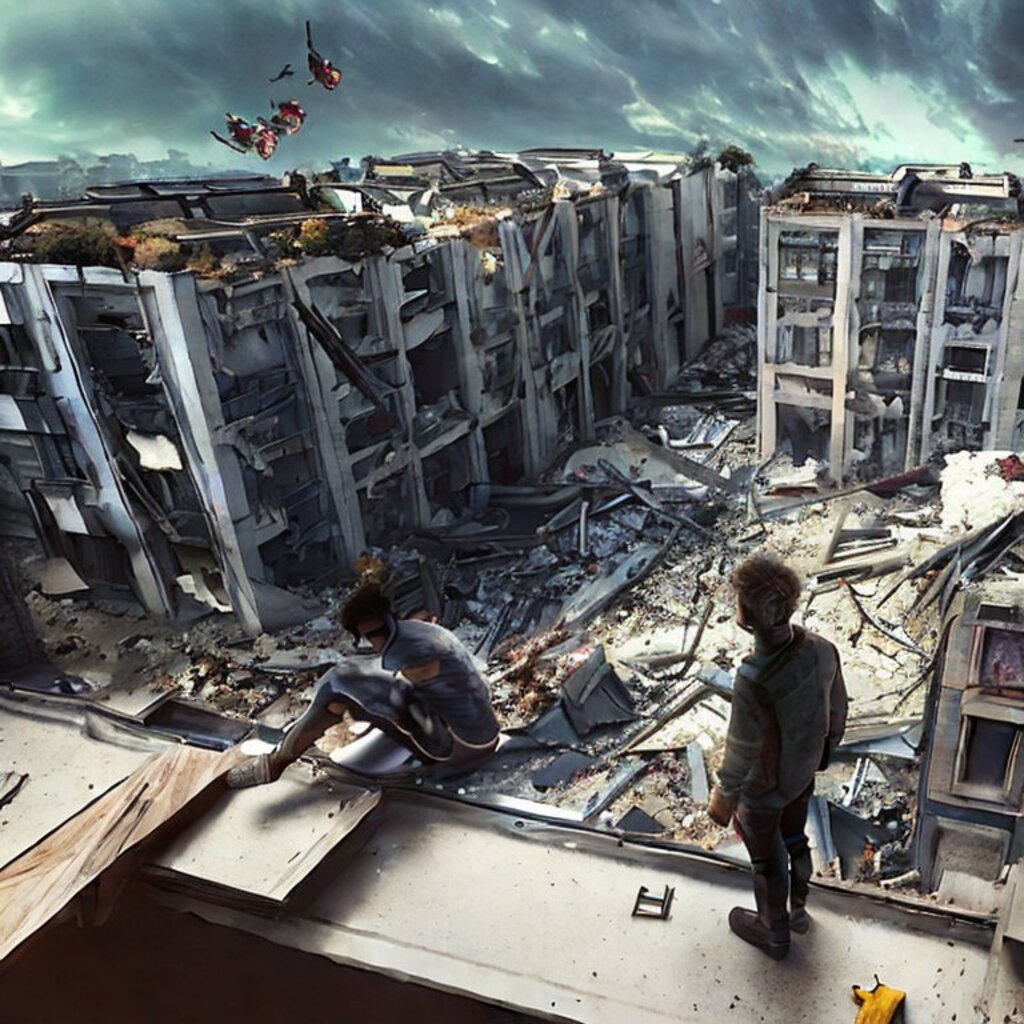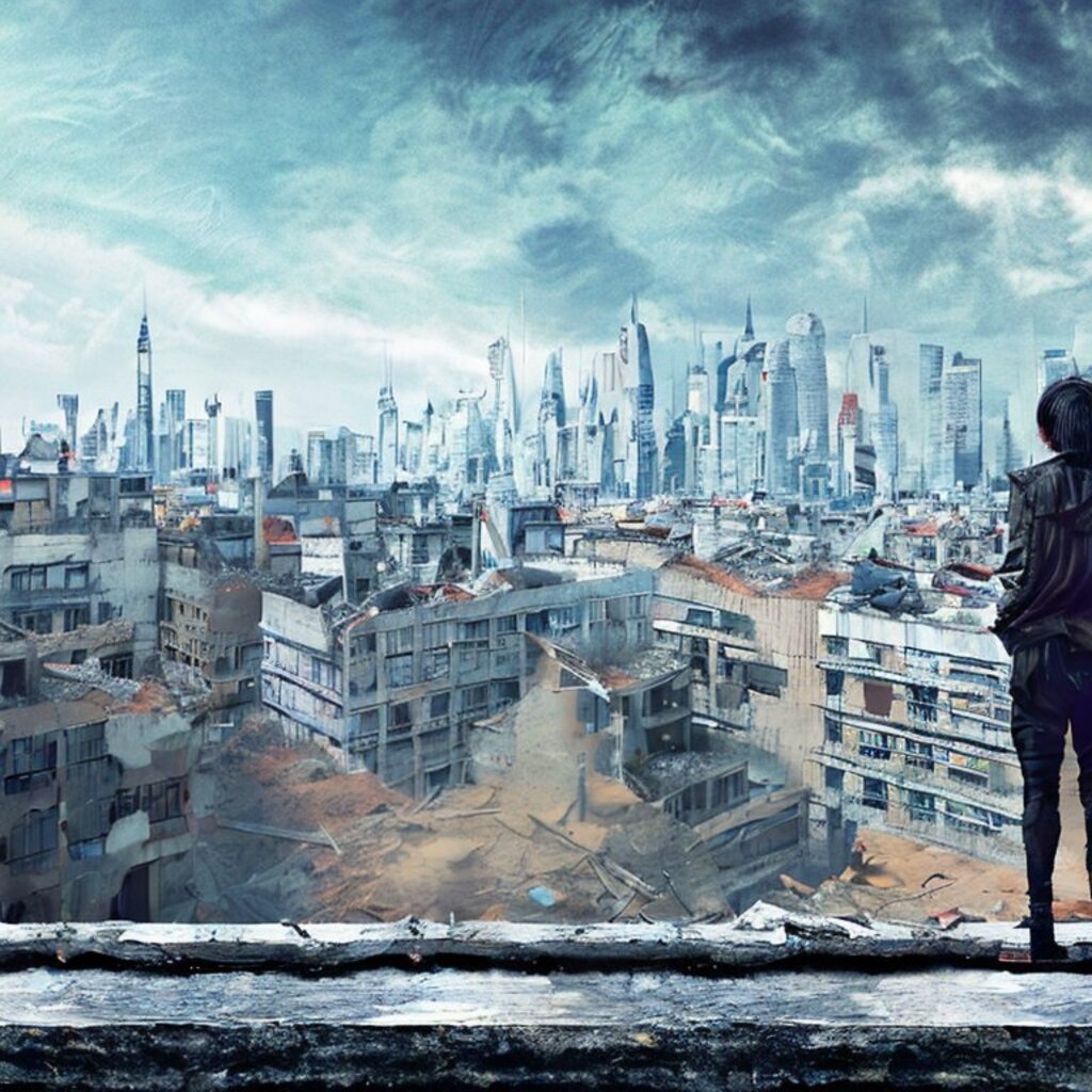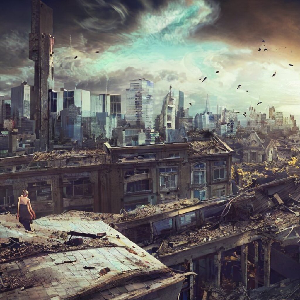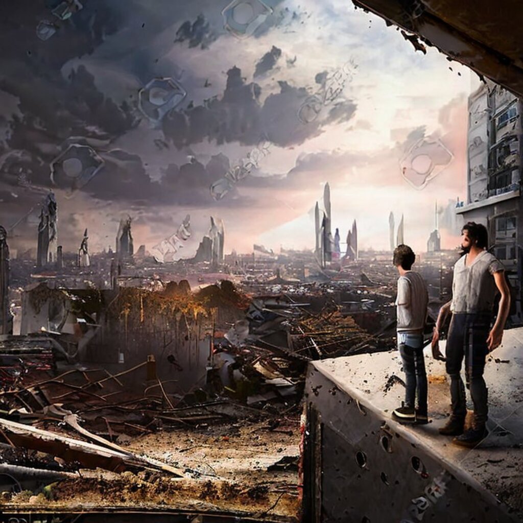 watching destroyed city from a rooftop, landscape photography, beautiful, Concept art
