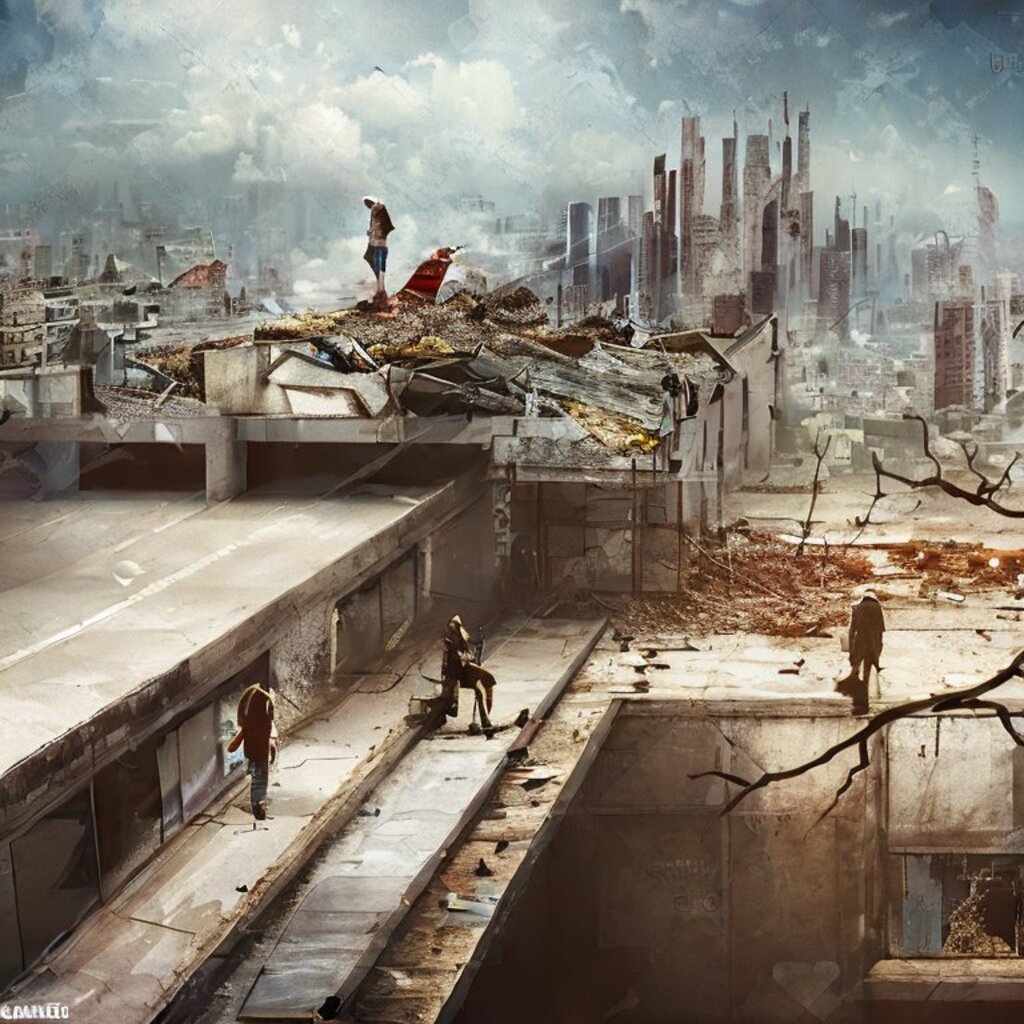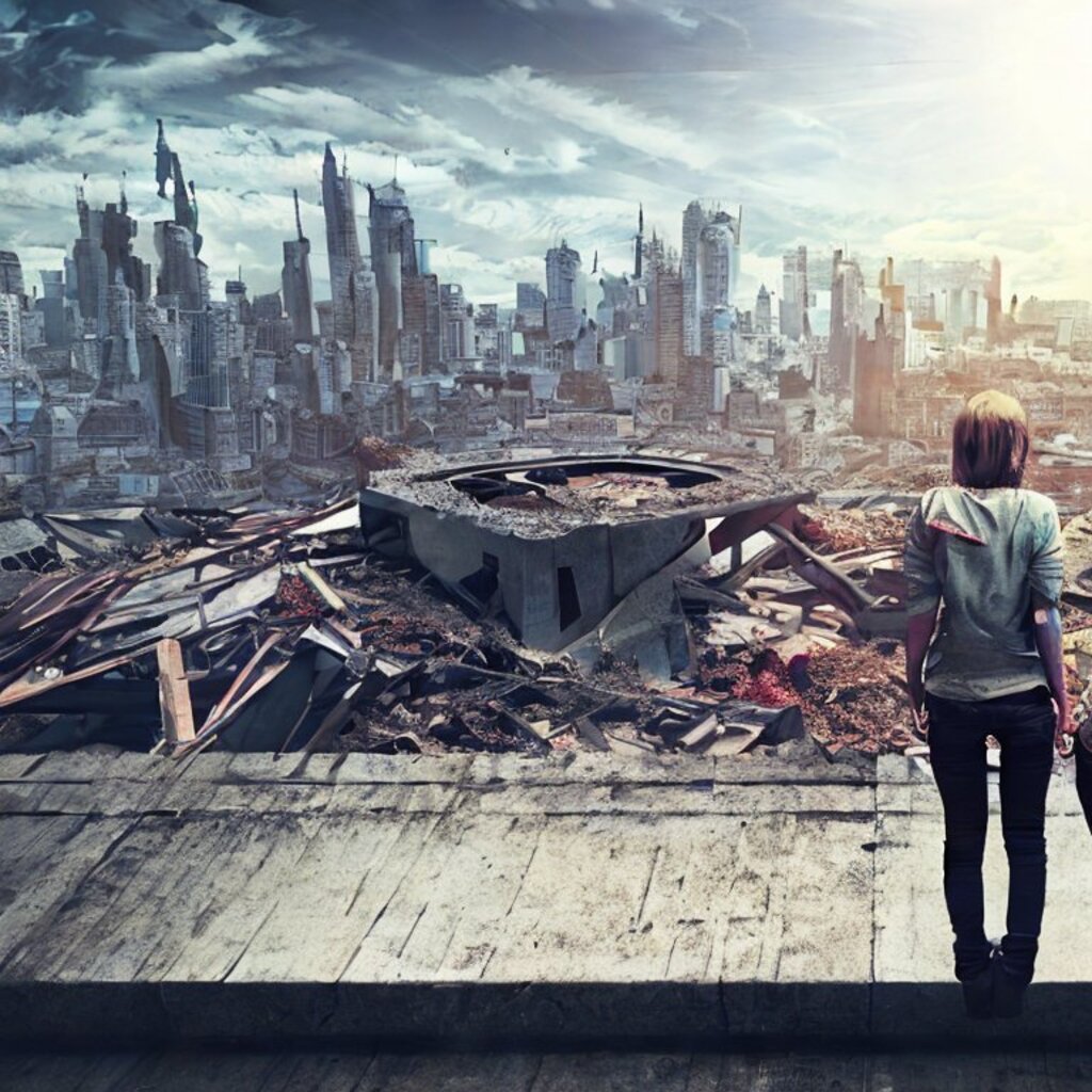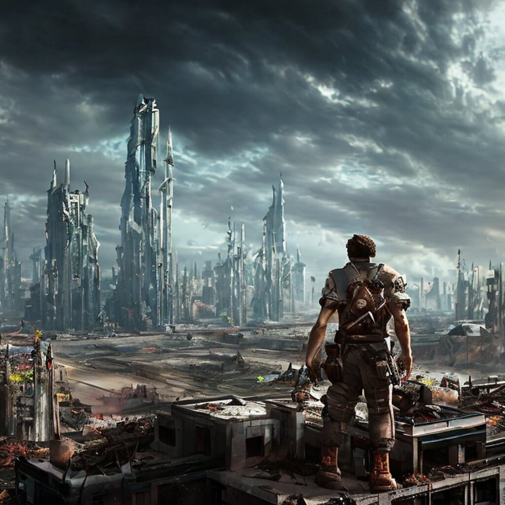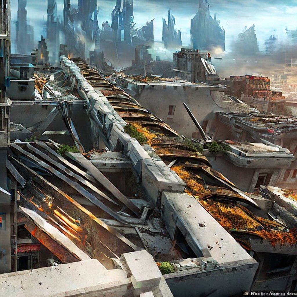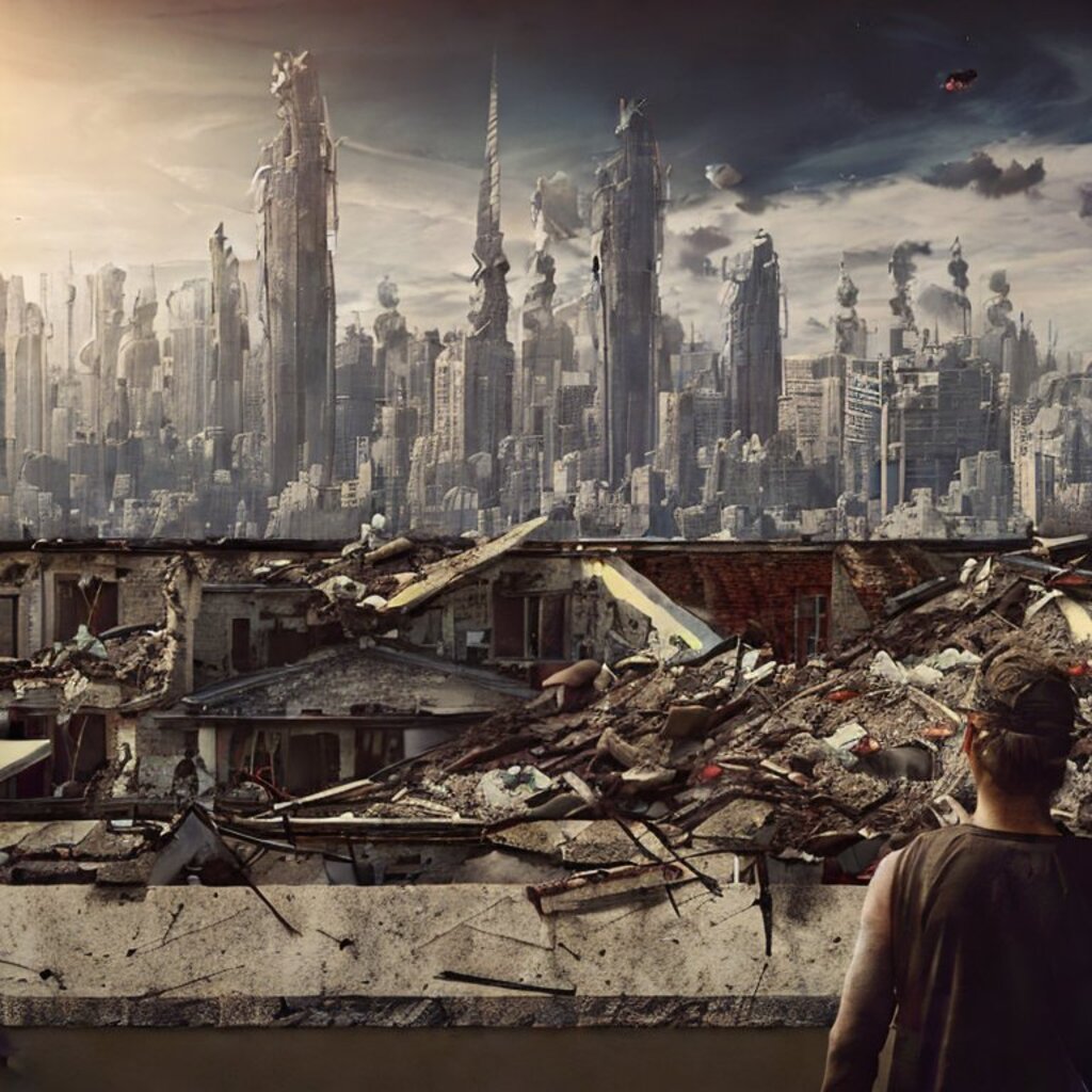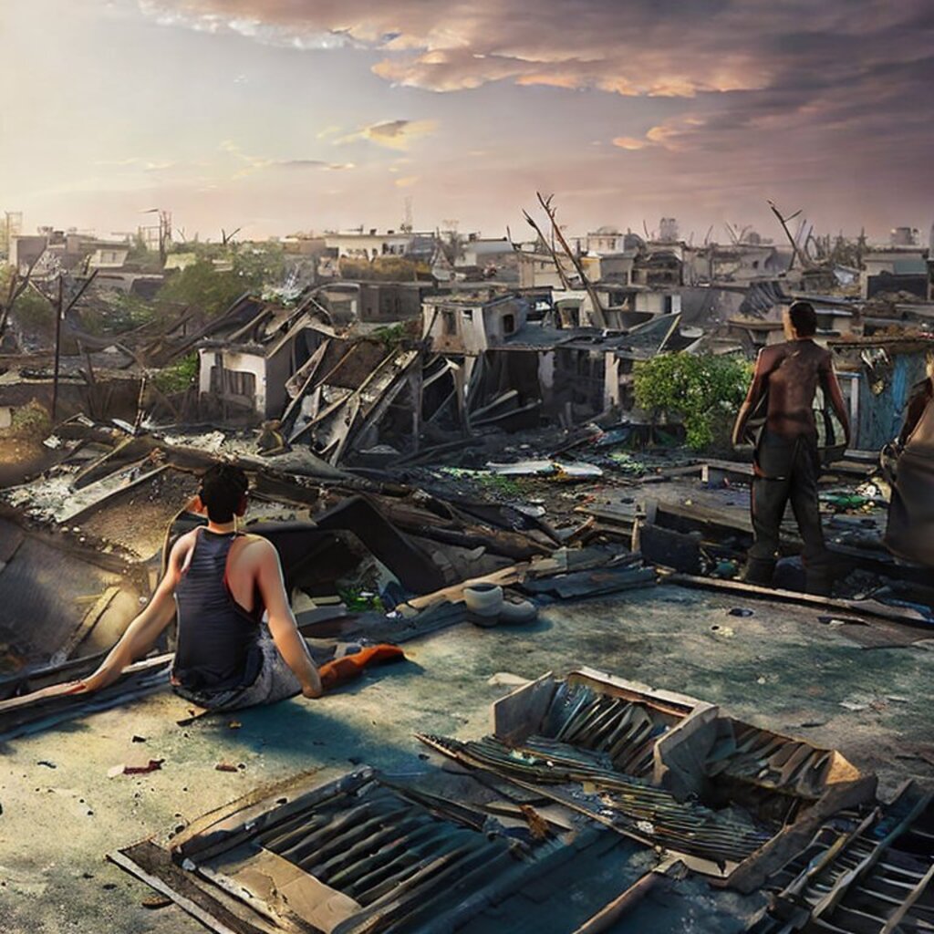 watching destroyed city from a rooftop, landscape photography, beautiful, Concept art