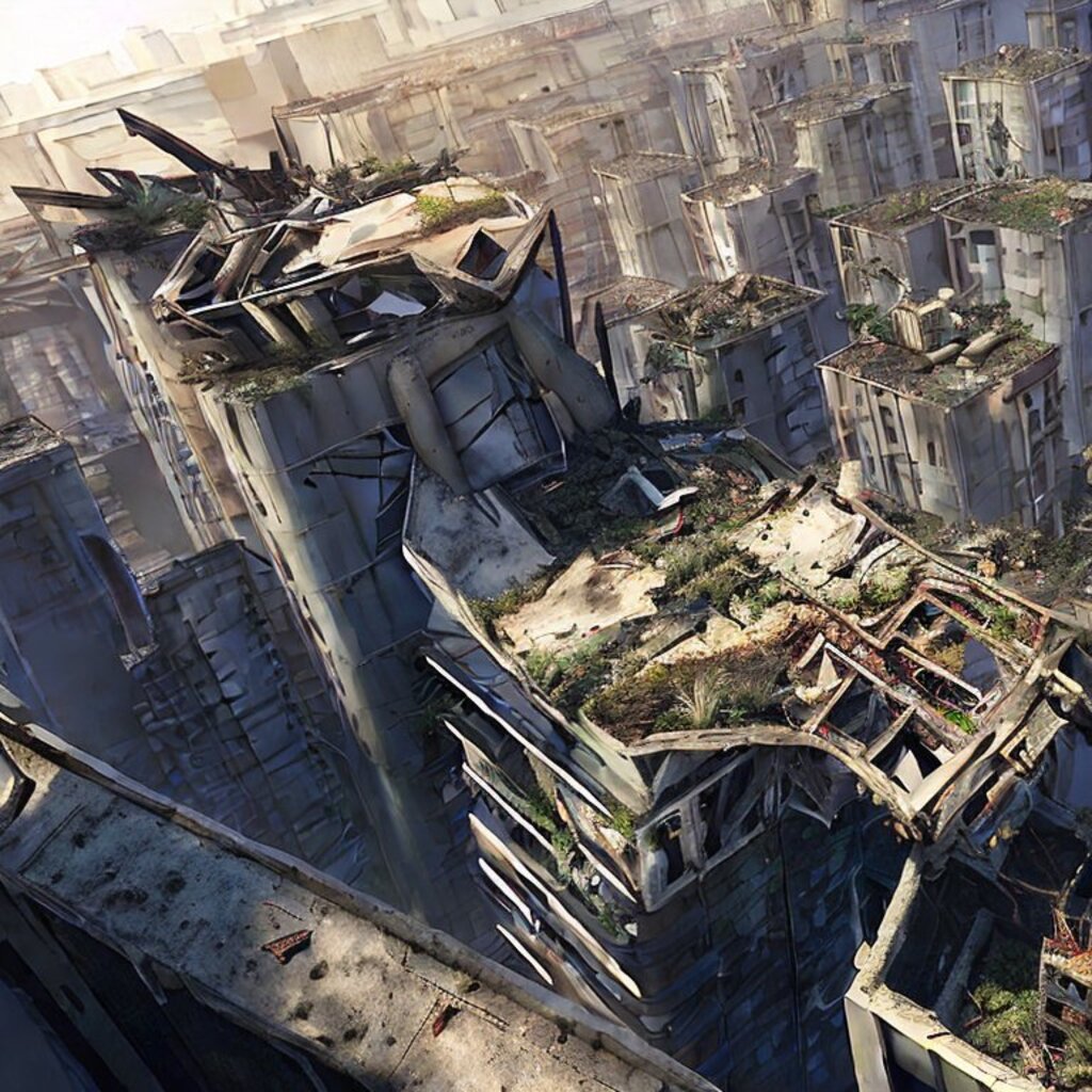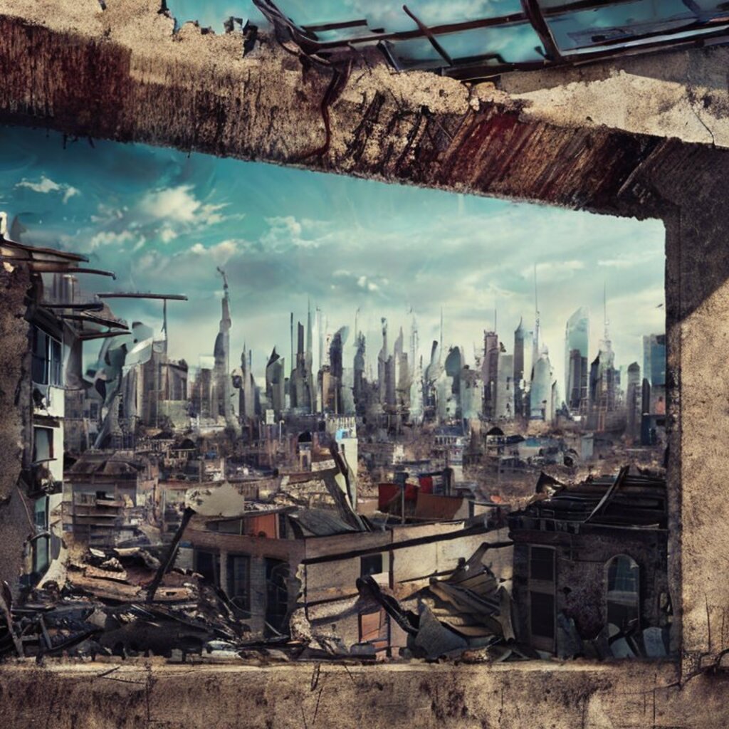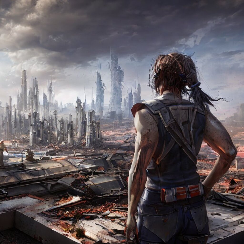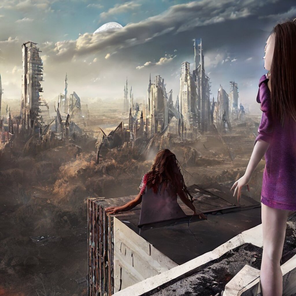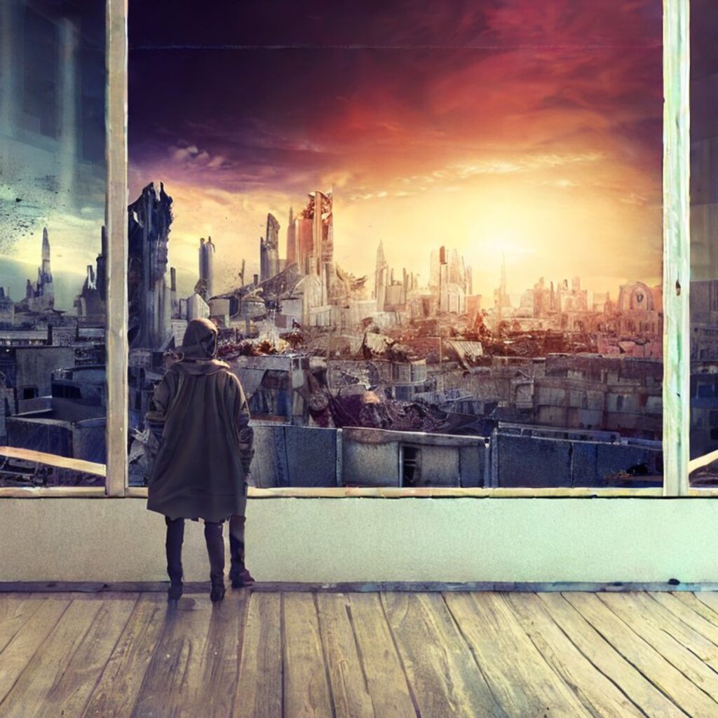 watching destroyed city from a rooftop, landscape photography, beautiful, Concept art