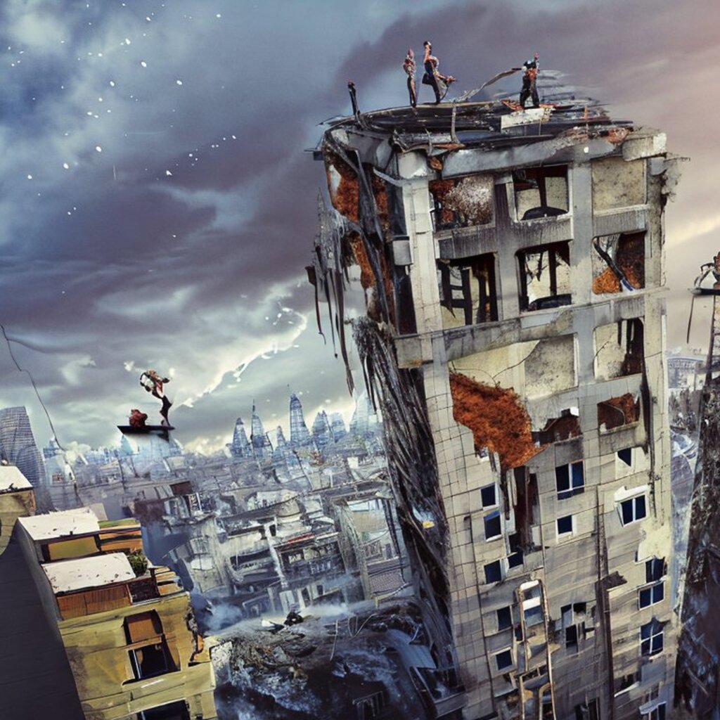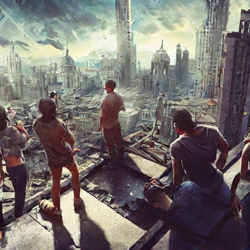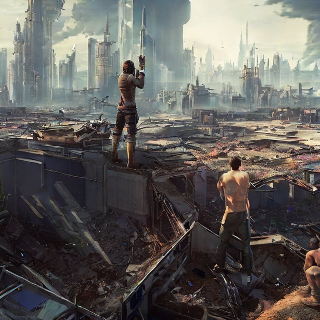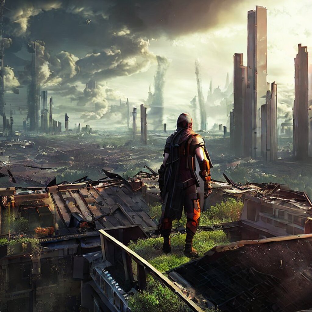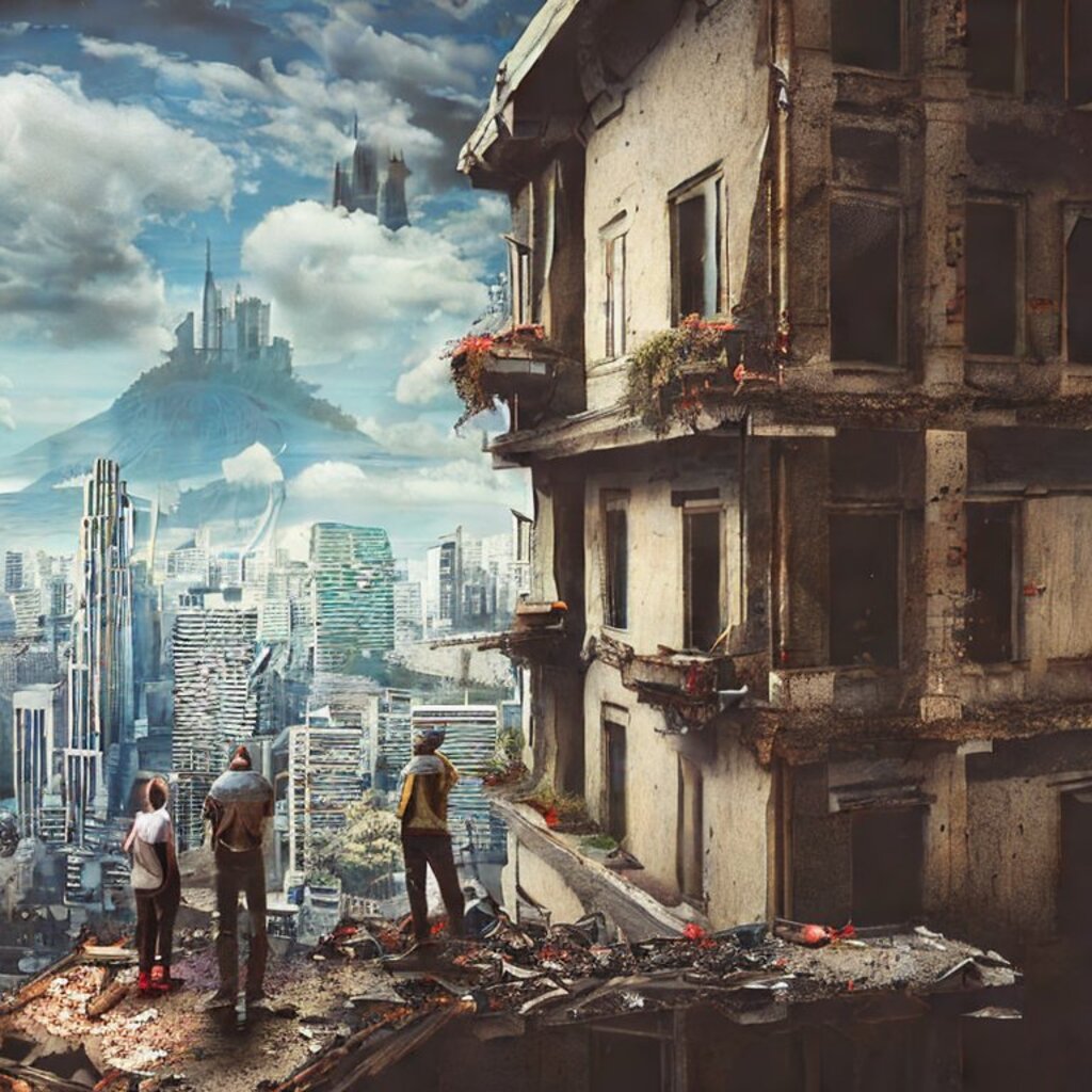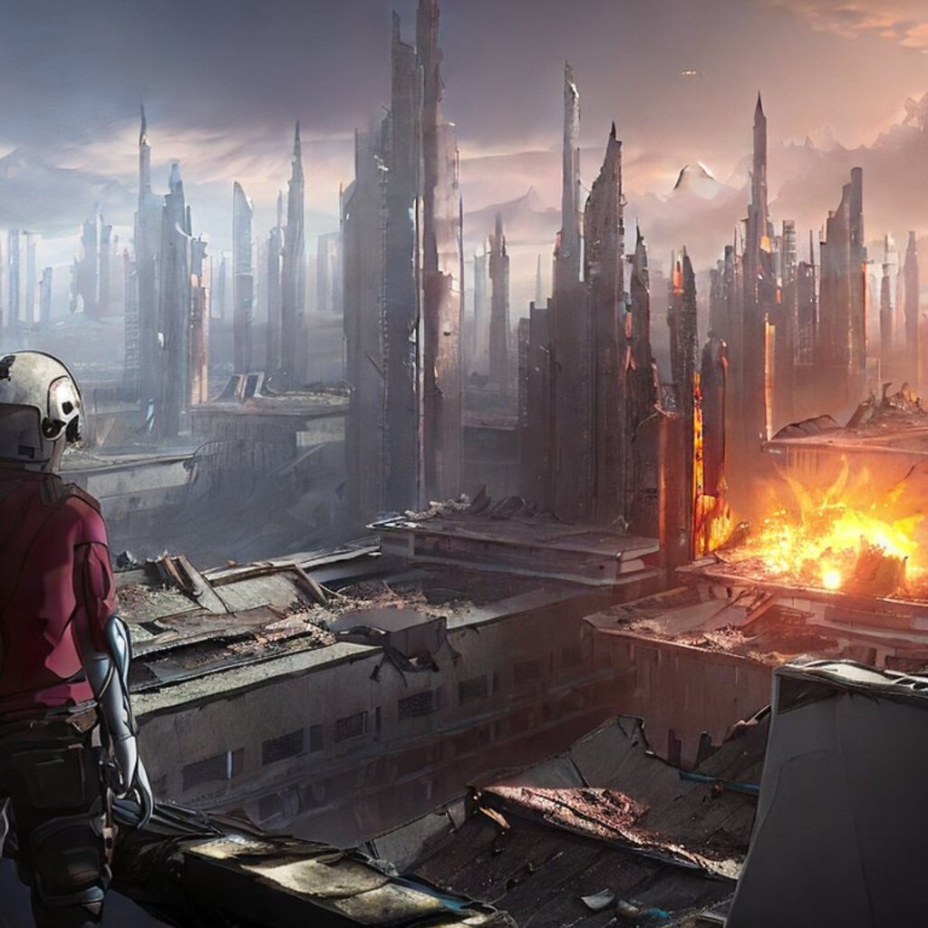 watching destroyed city from a rooftop, landscape photography, beautiful, Concept art