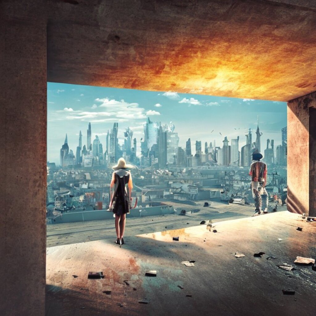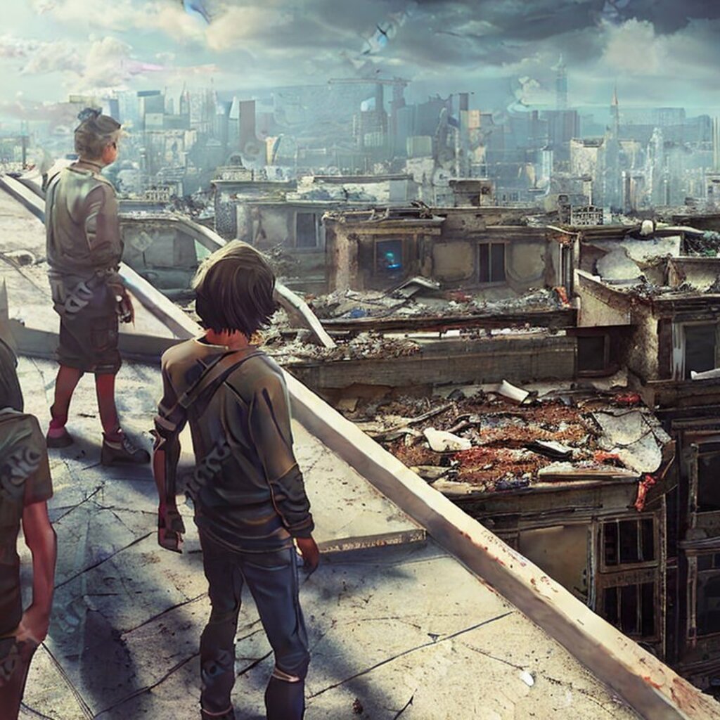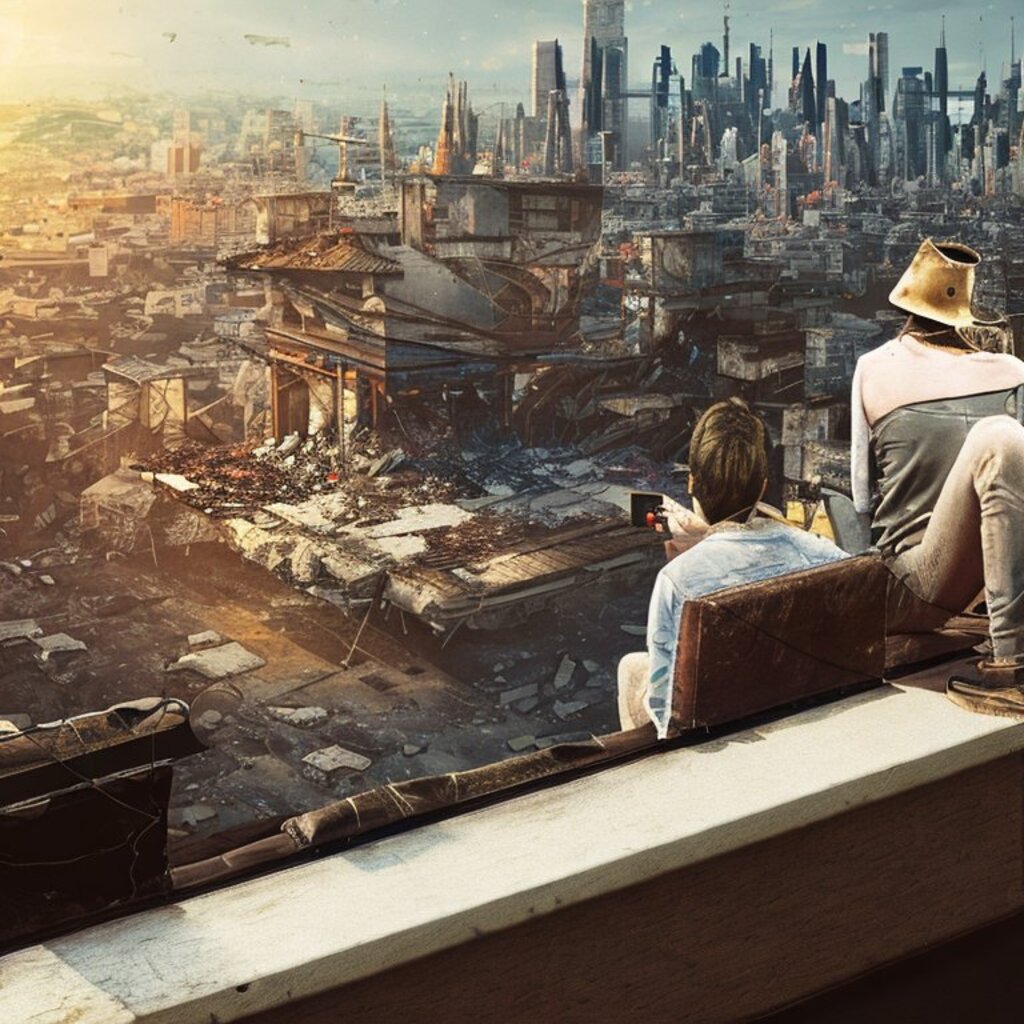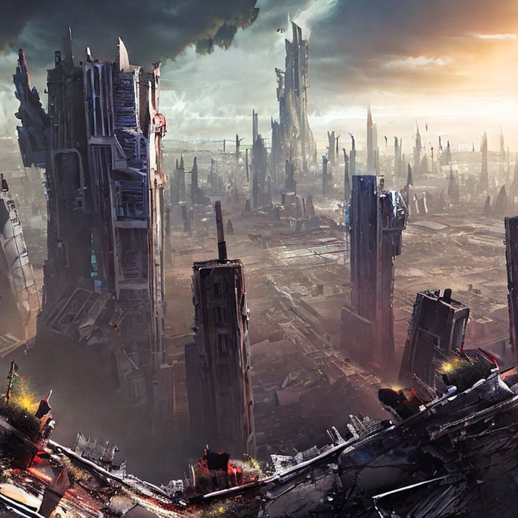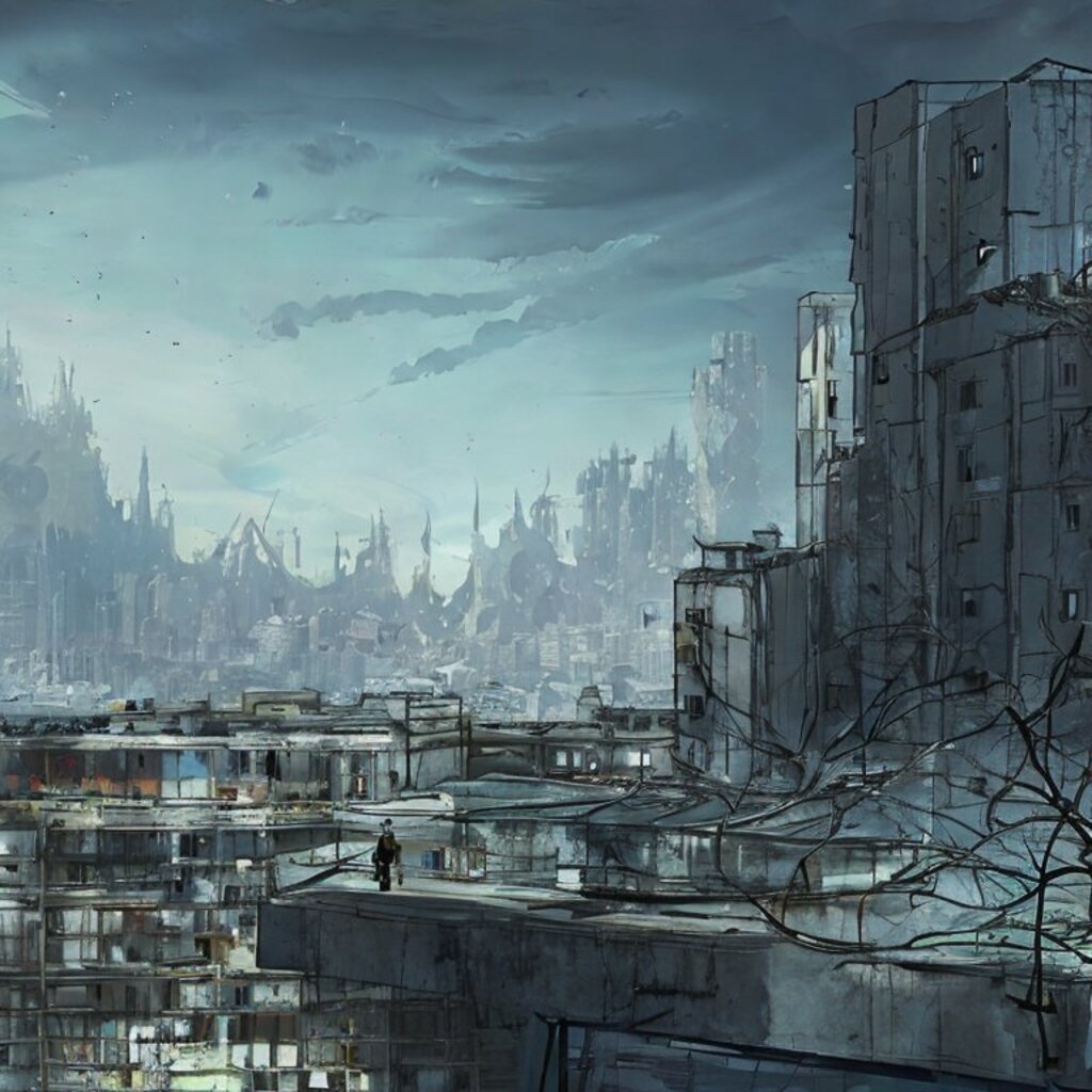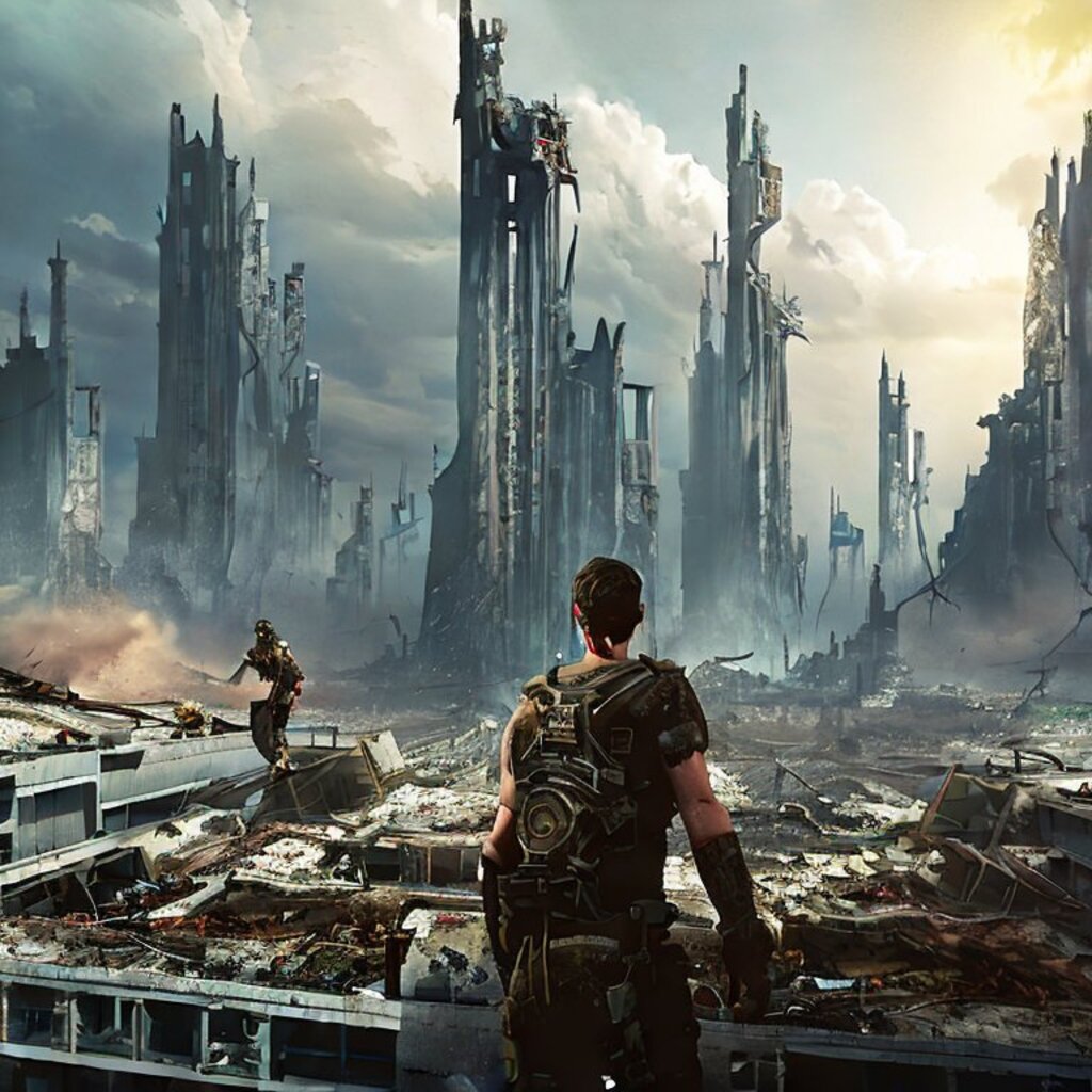 watching destroyed city from a rooftop, landscape photography, beautiful, Concept art