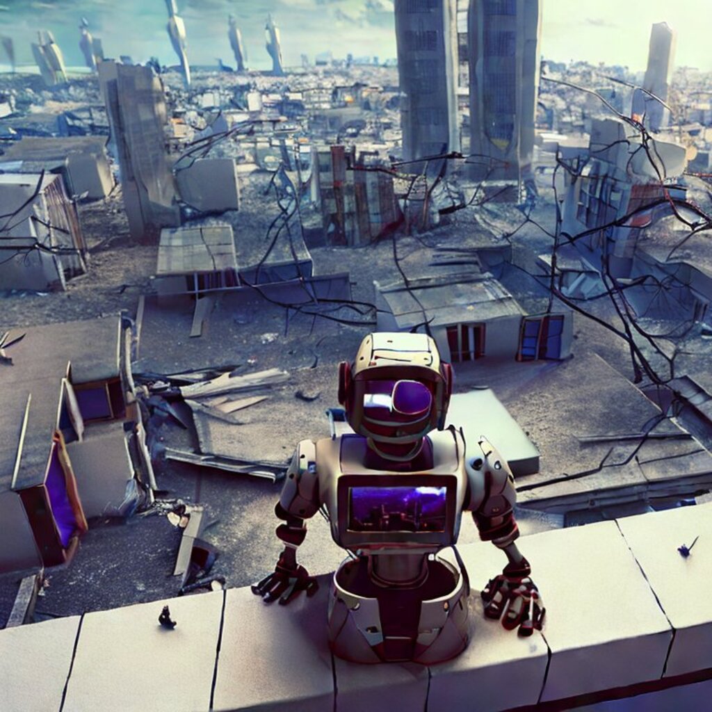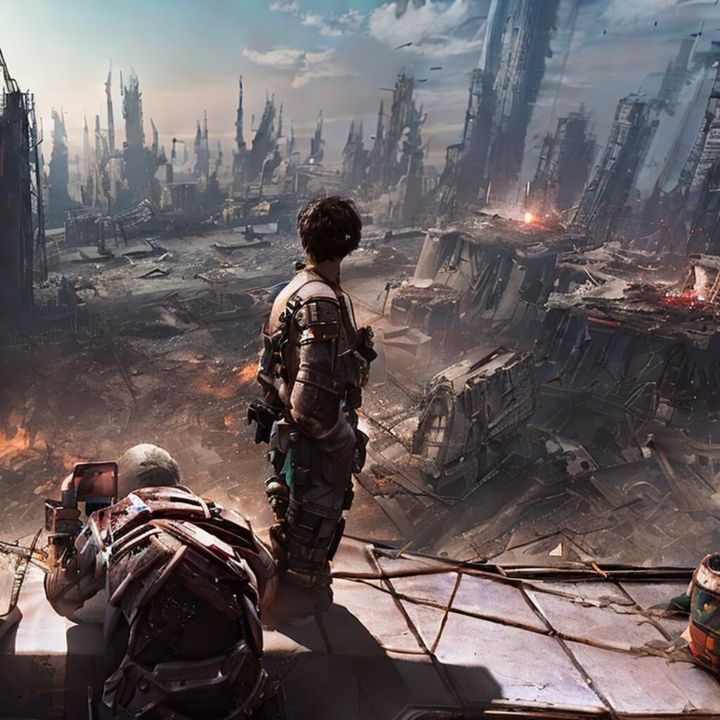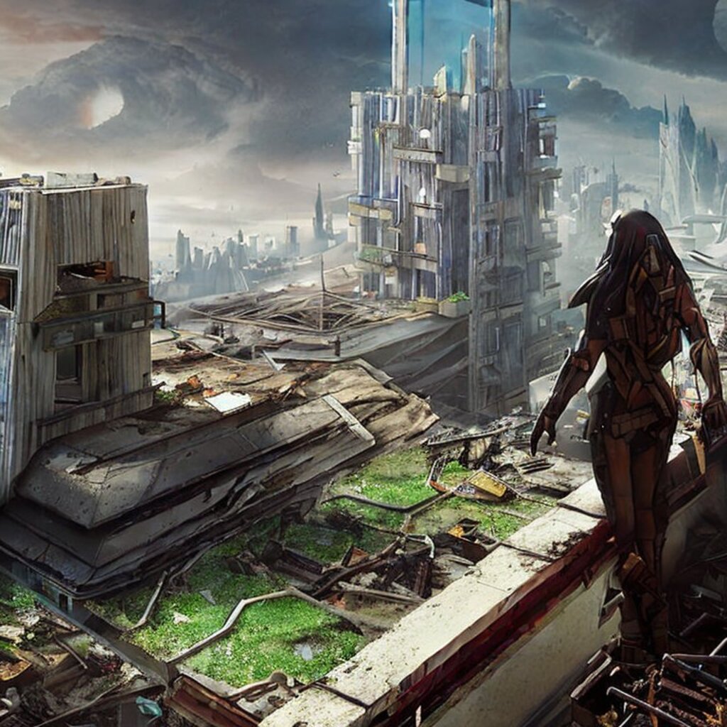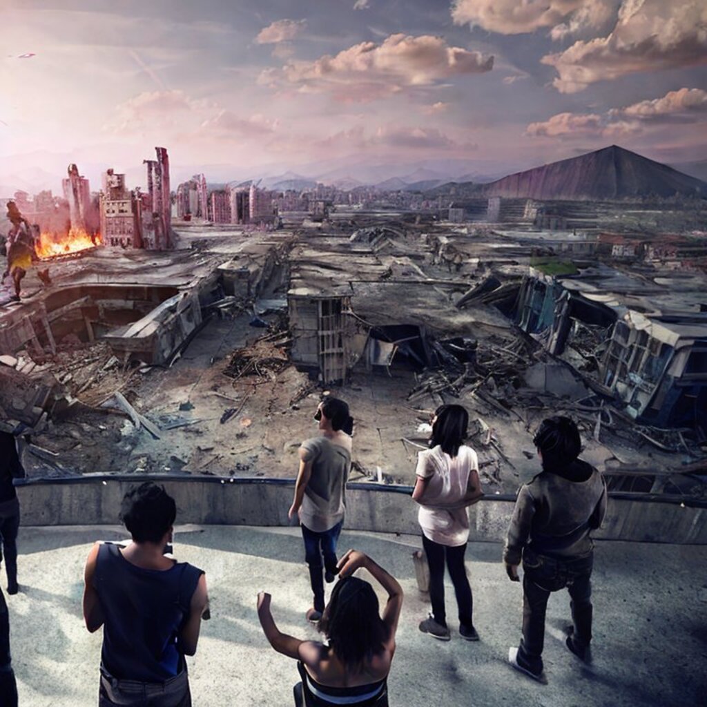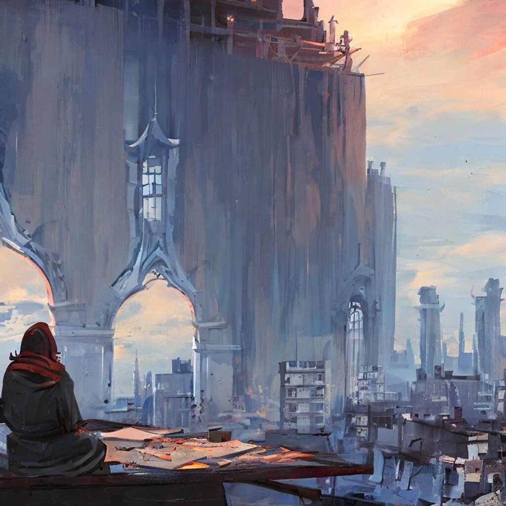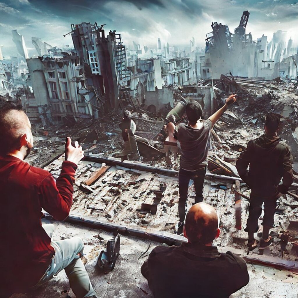 watching destroyed city from a rooftop, landscape photography, beautiful, Concept art