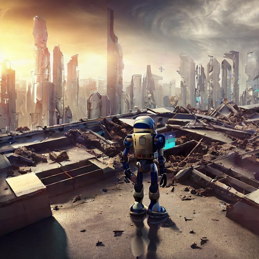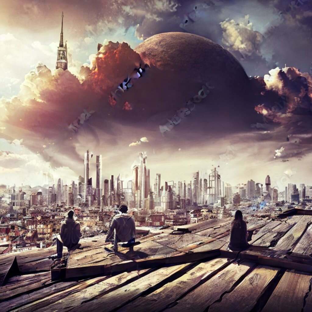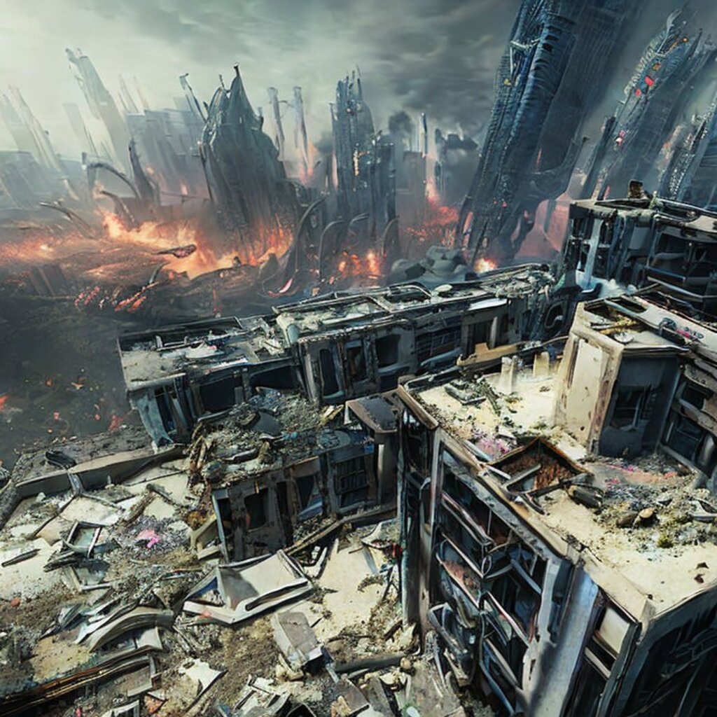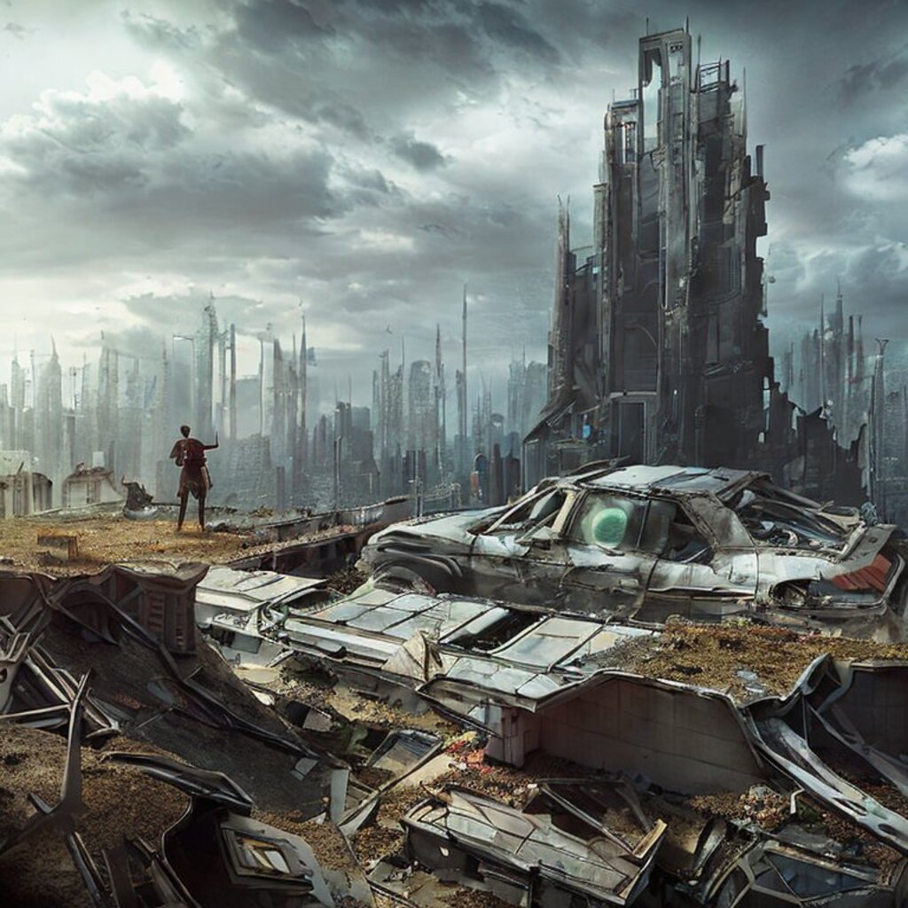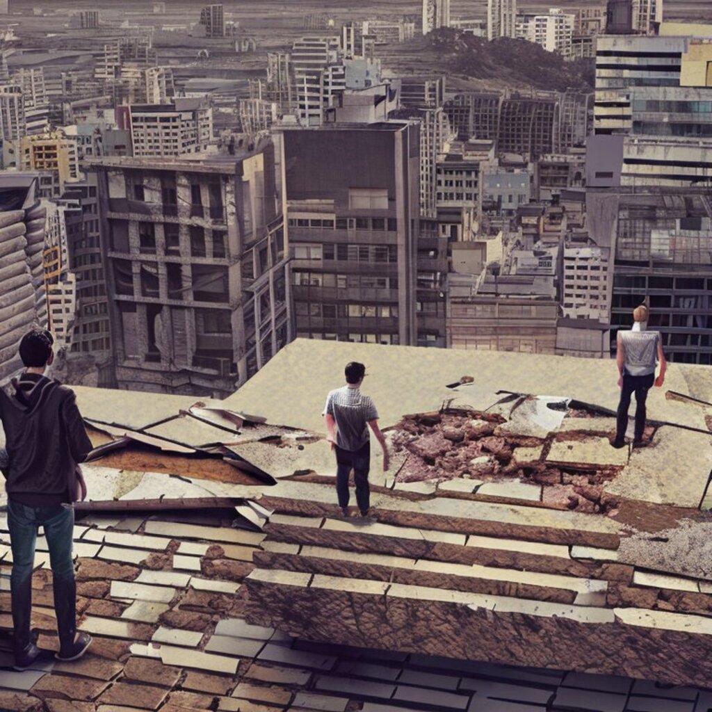 watching destroyed city from a rooftop, landscape photography, beautiful, Concept art