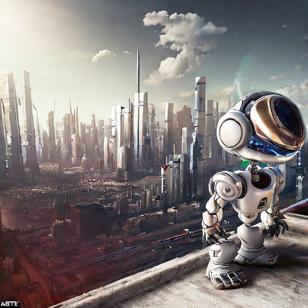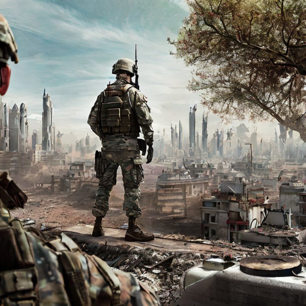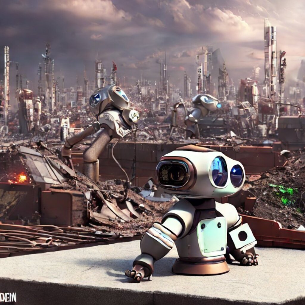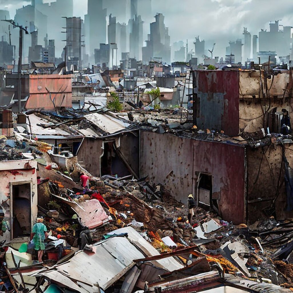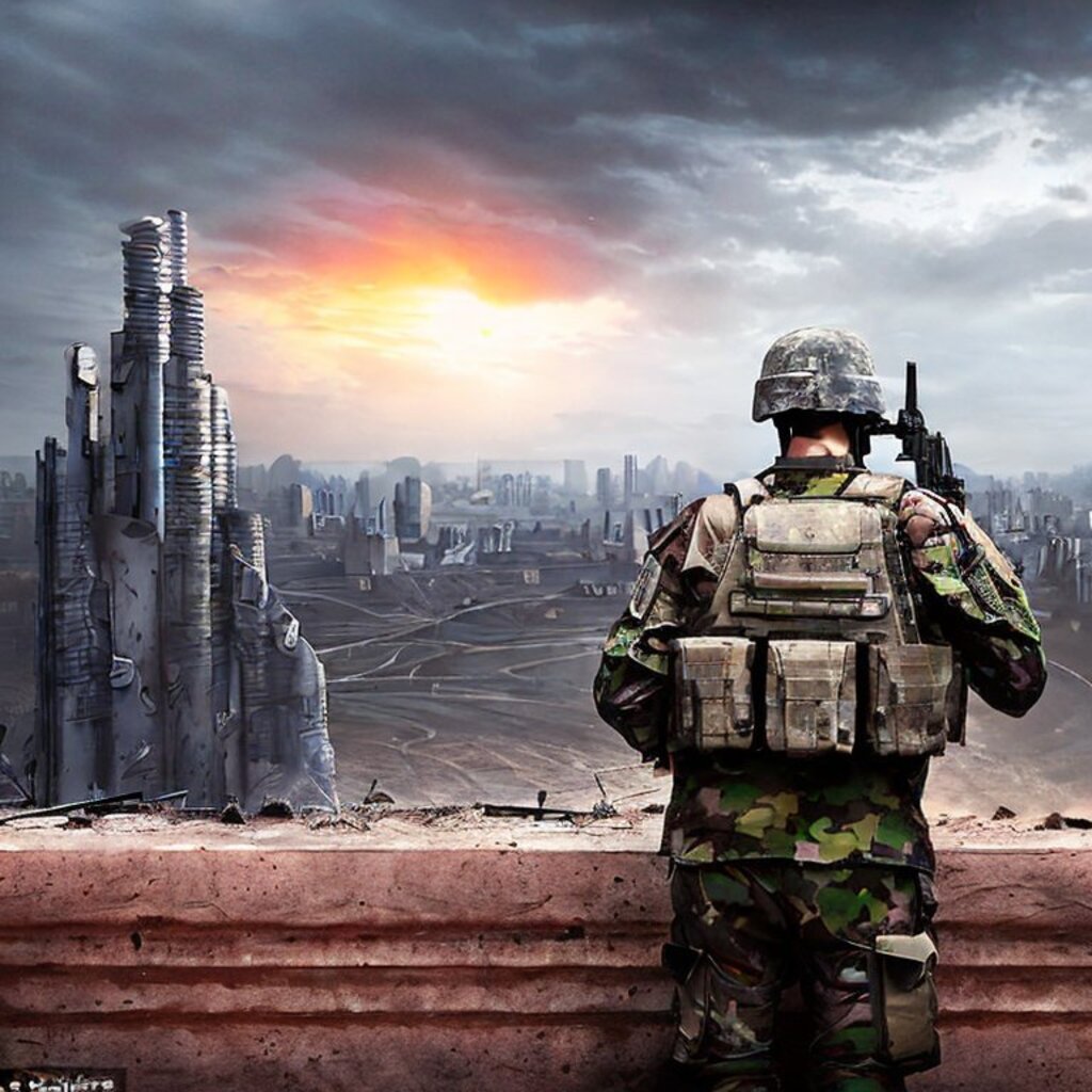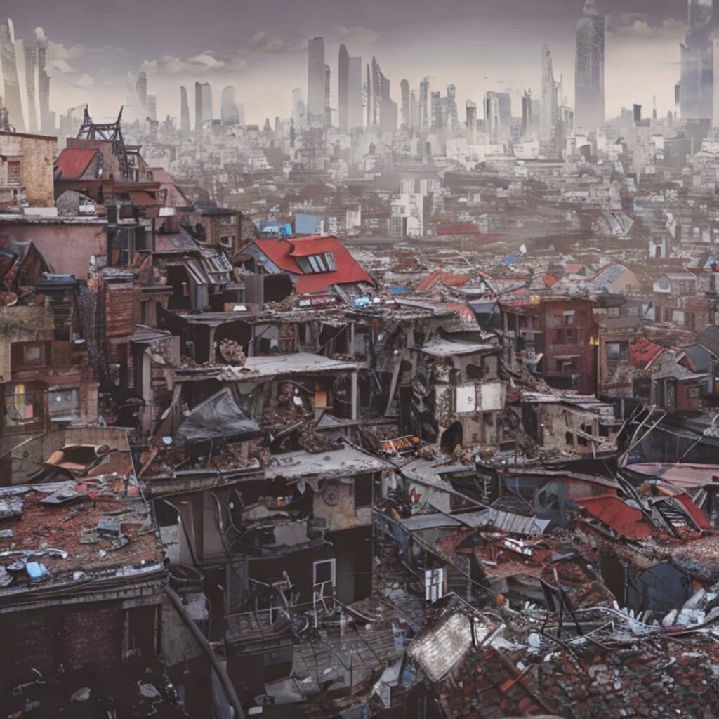 watching destroyed city from a rooftop, landscape photography, beautiful, Concept art