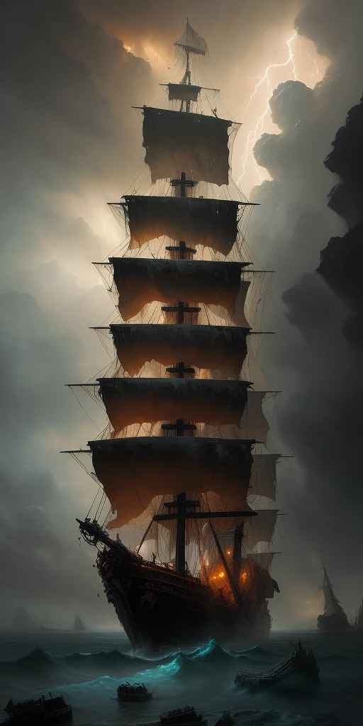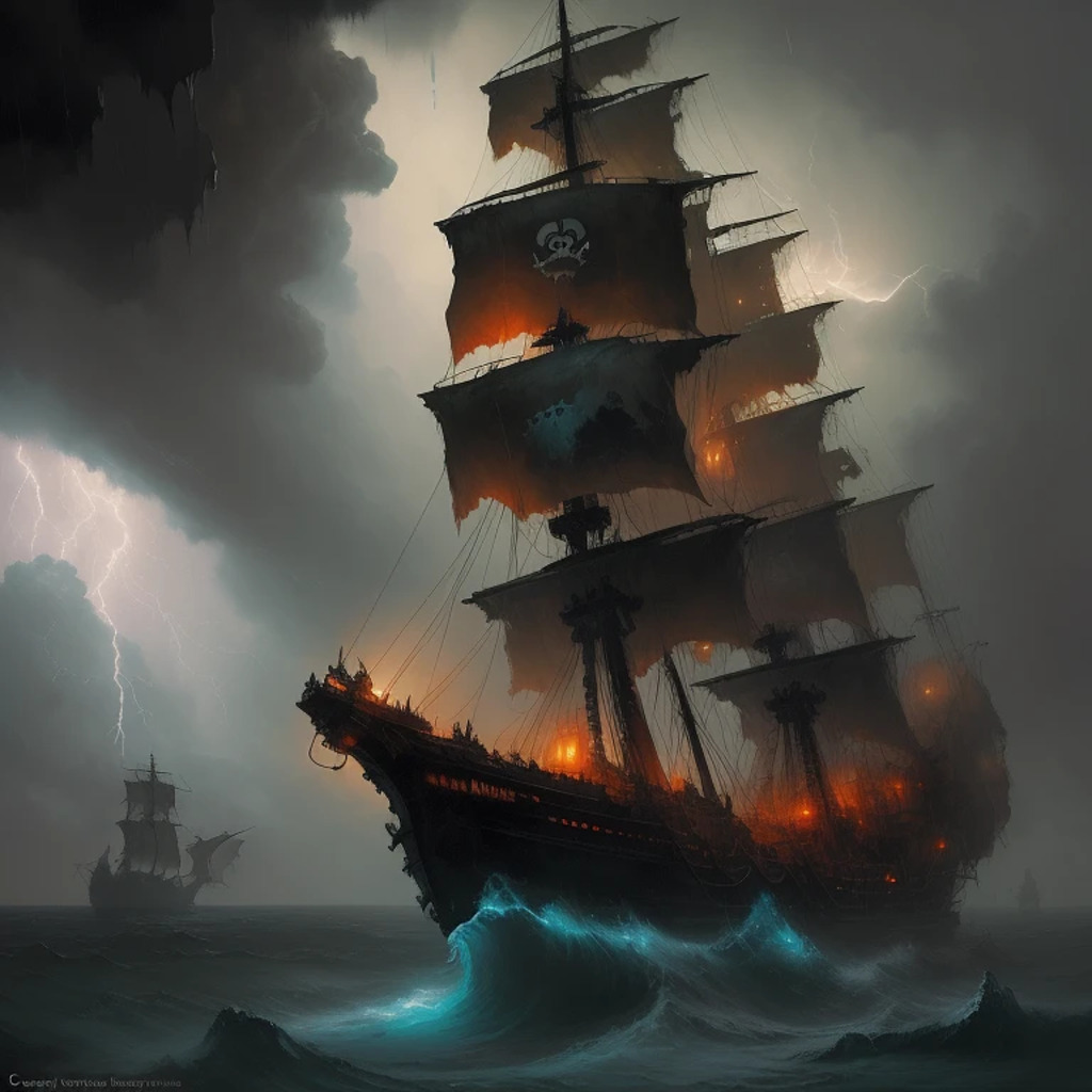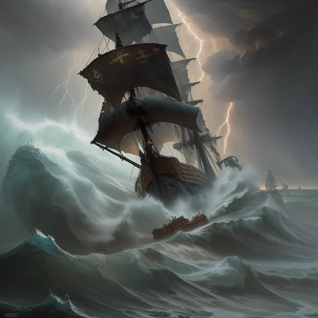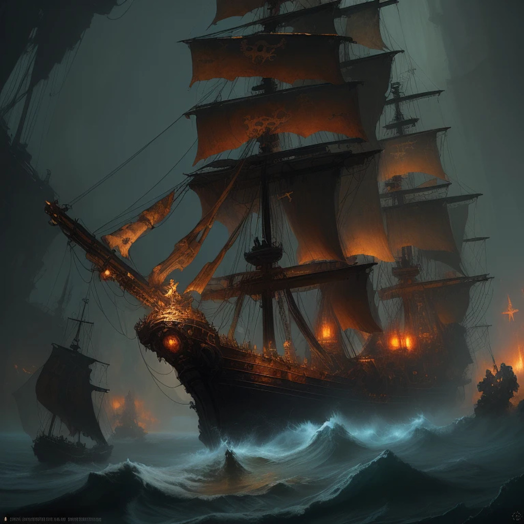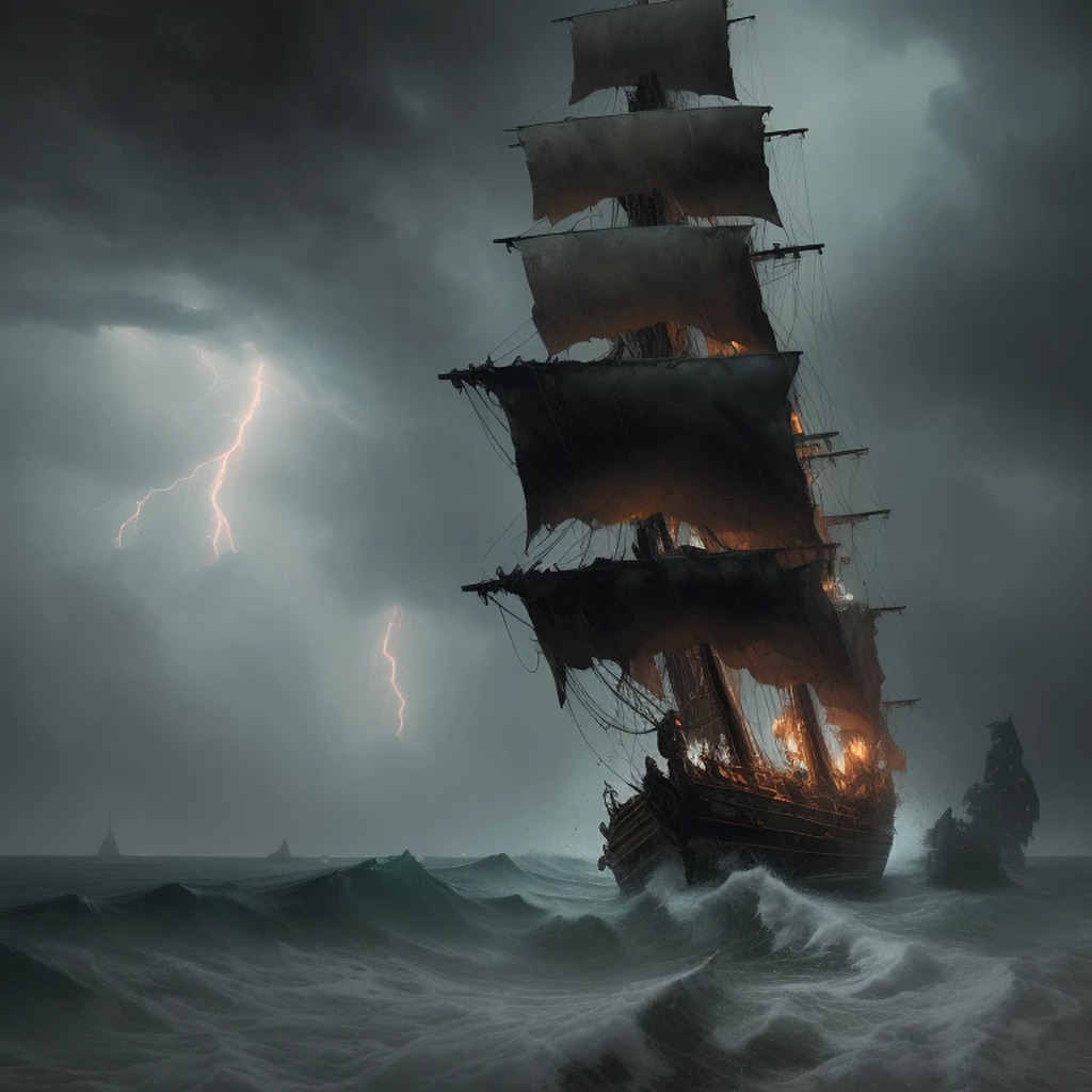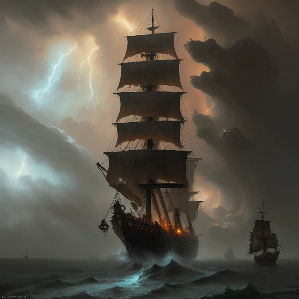 Prompt: oil painting with heavy impasto of a pirate ship, turbulent sea, thunderstorm, rain, cosmic horror painting, elegant intricate artstation concept art by craig mullins detailed, cinematic, hyper realism, high detail, octane render, 8k