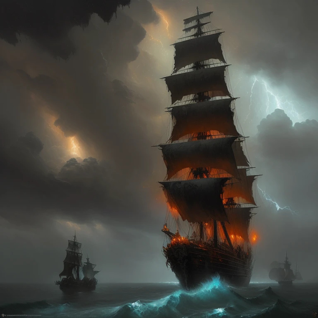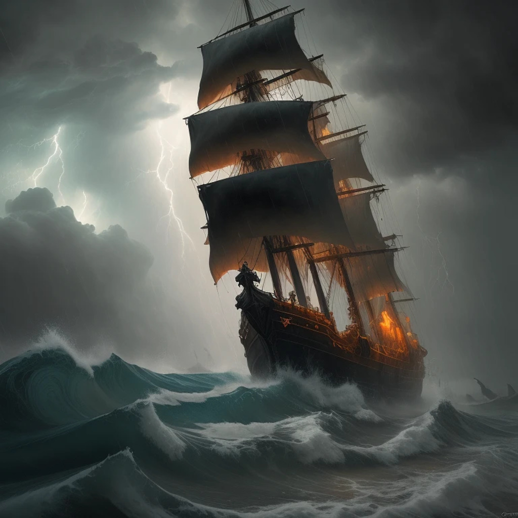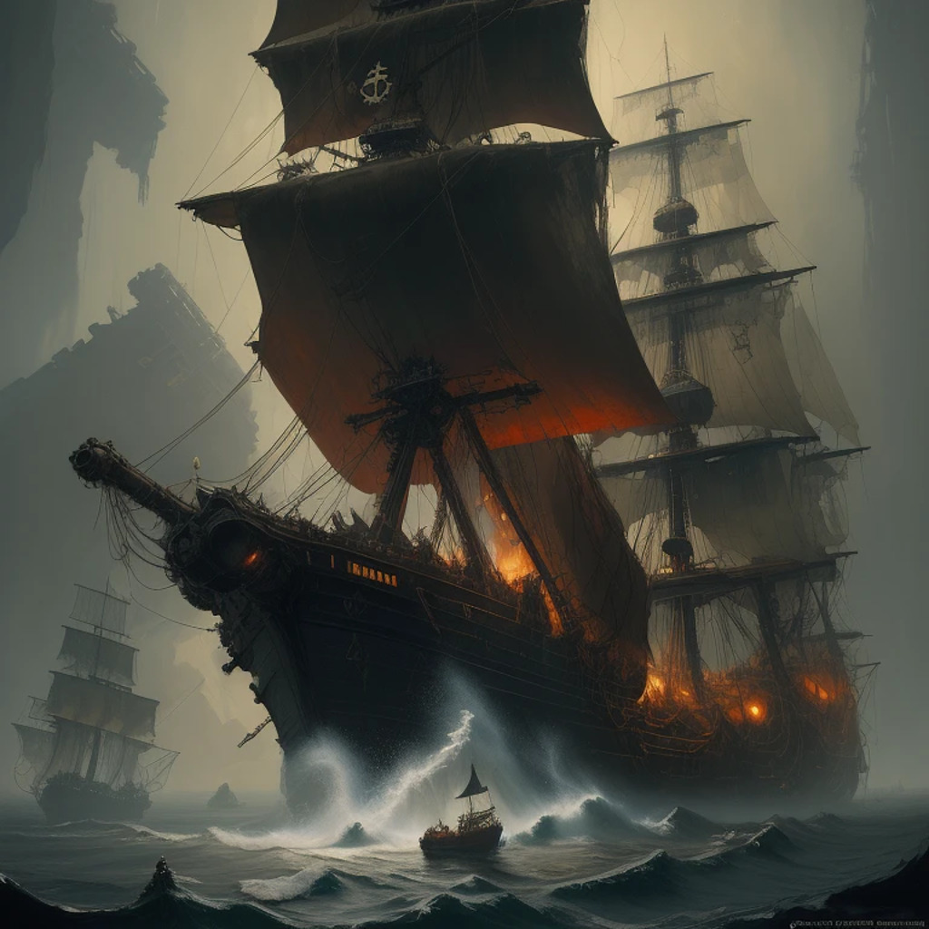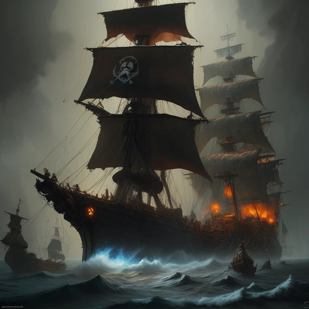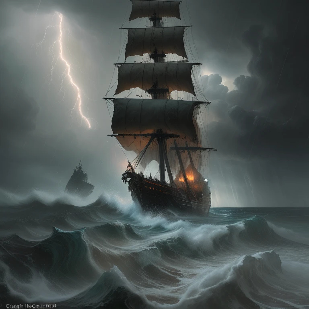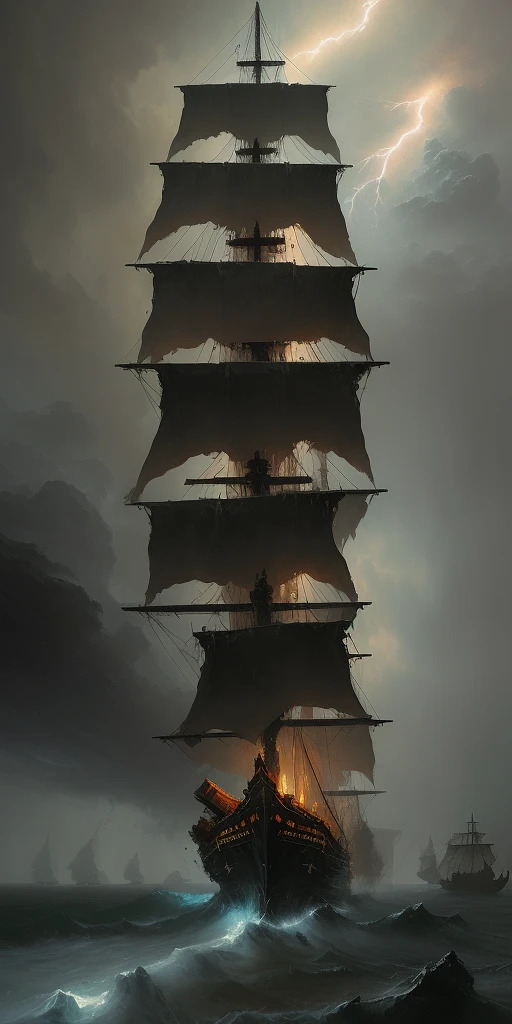 Prompt: oil painting with heavy impasto of a pirate ship, turbulent sea, thunderstorm, rain, cosmic horror painting, elegant intricate artstation concept art by craig mullins detailed, cinematic, hyper realism, high detail, octane render, 8k