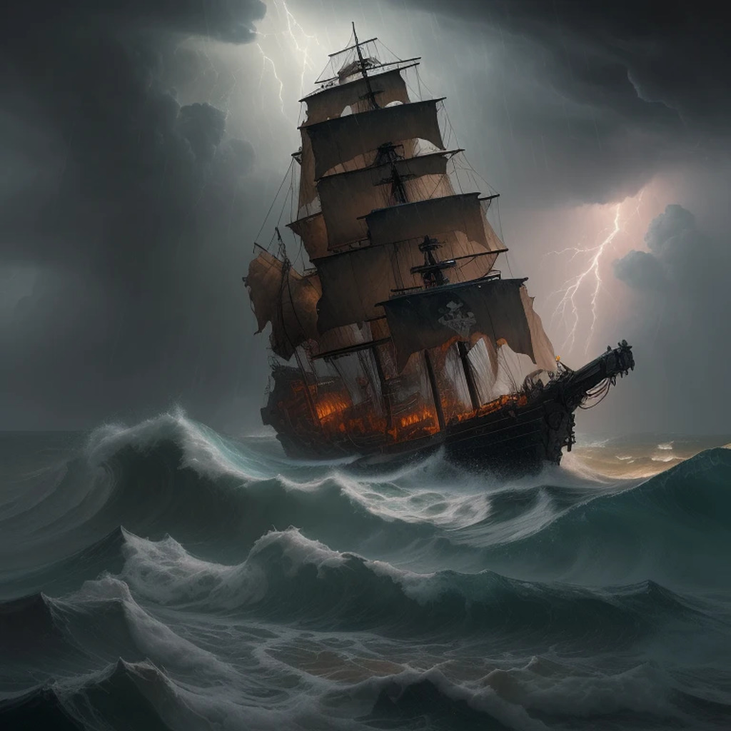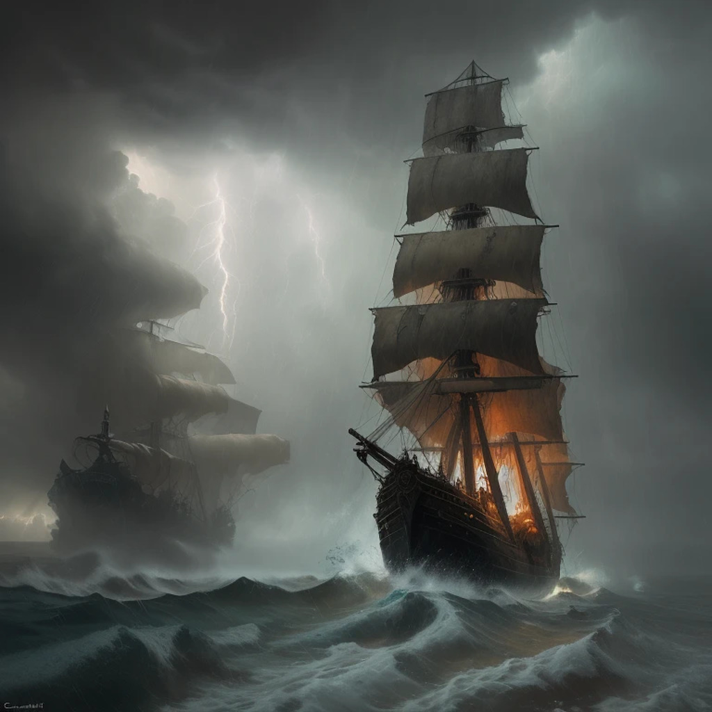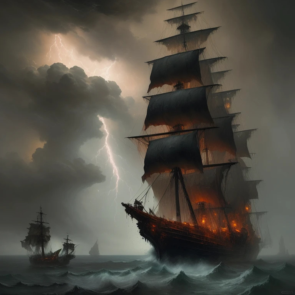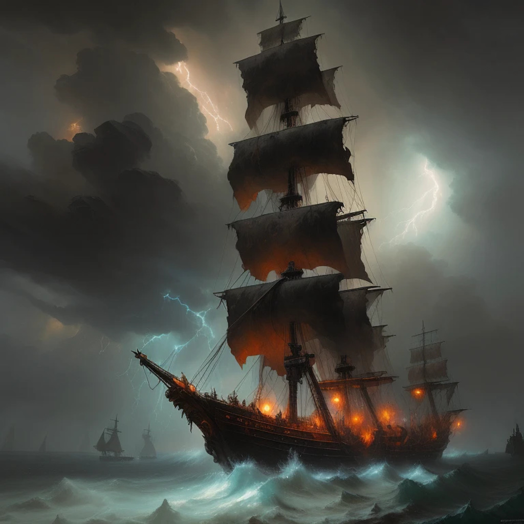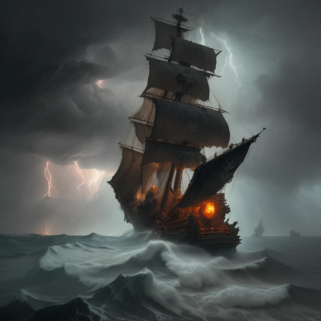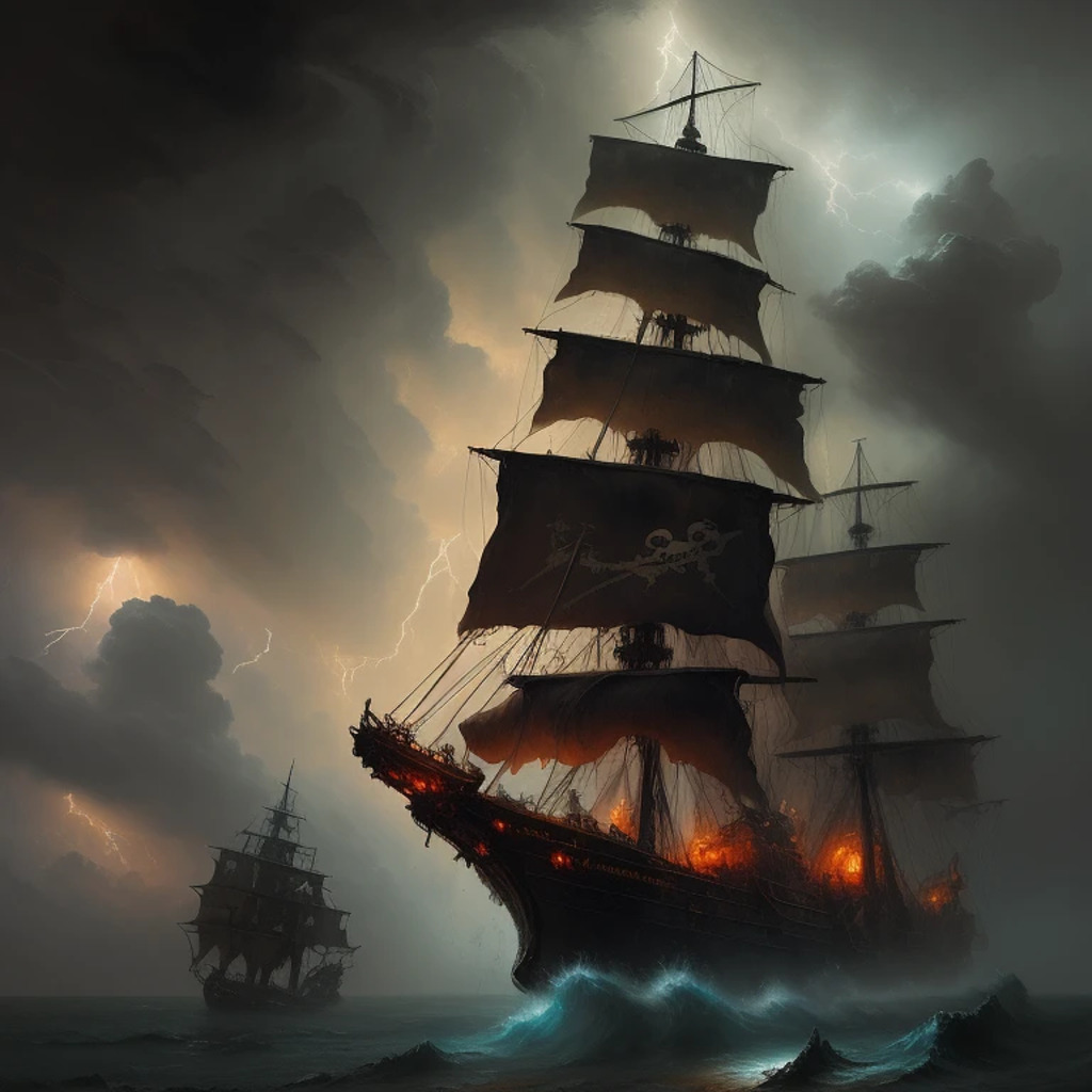 Prompt: oil painting with heavy impasto of a pirate ship, turbulent sea, thunderstorm, rain, cosmic horror painting, elegant intricate artstation concept art by craig mullins detailed, cinematic, hyper realism, high detail, octane render, 8k