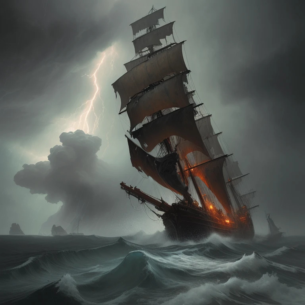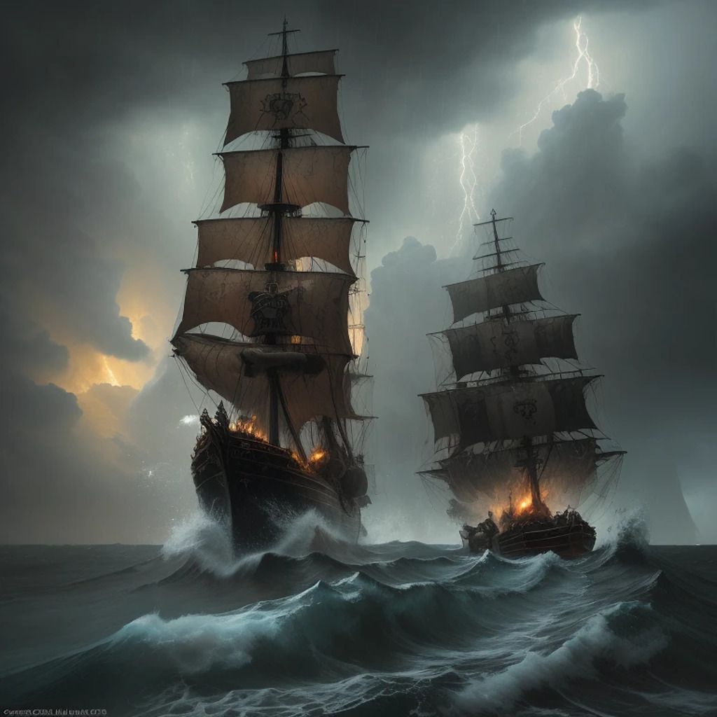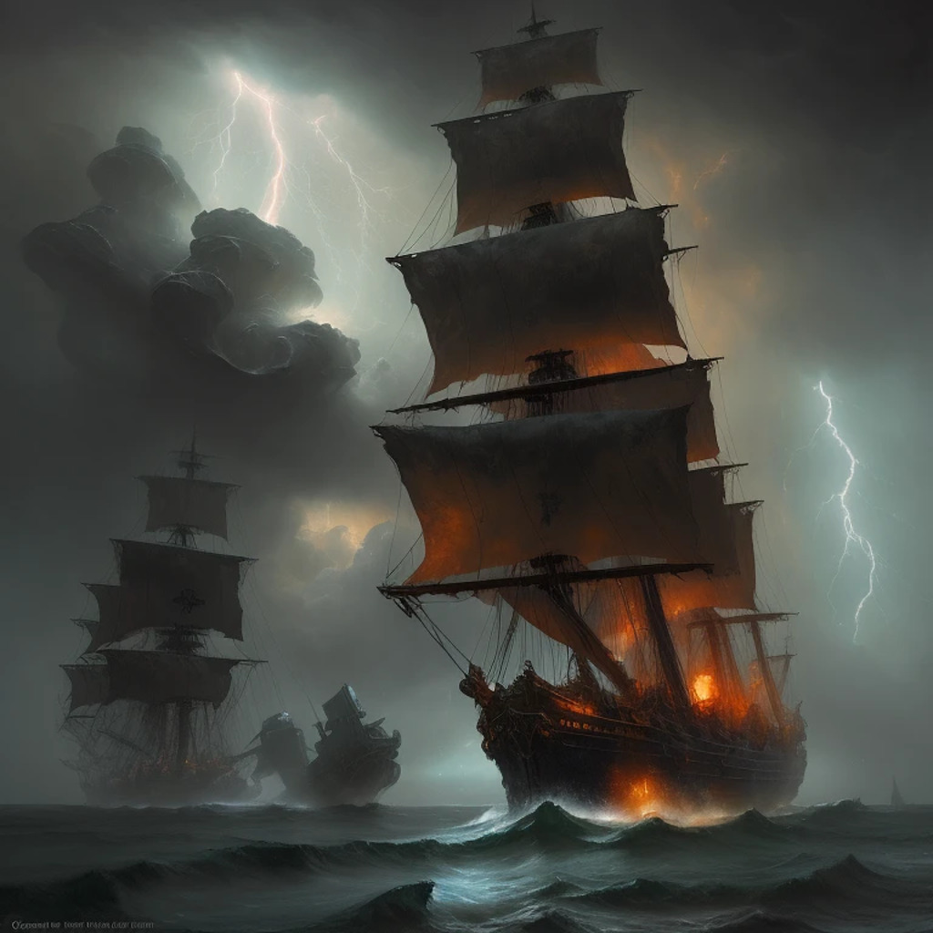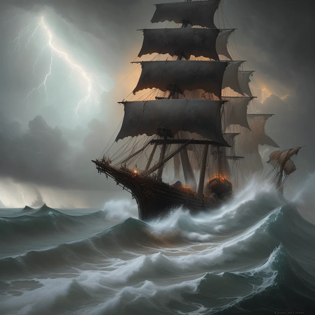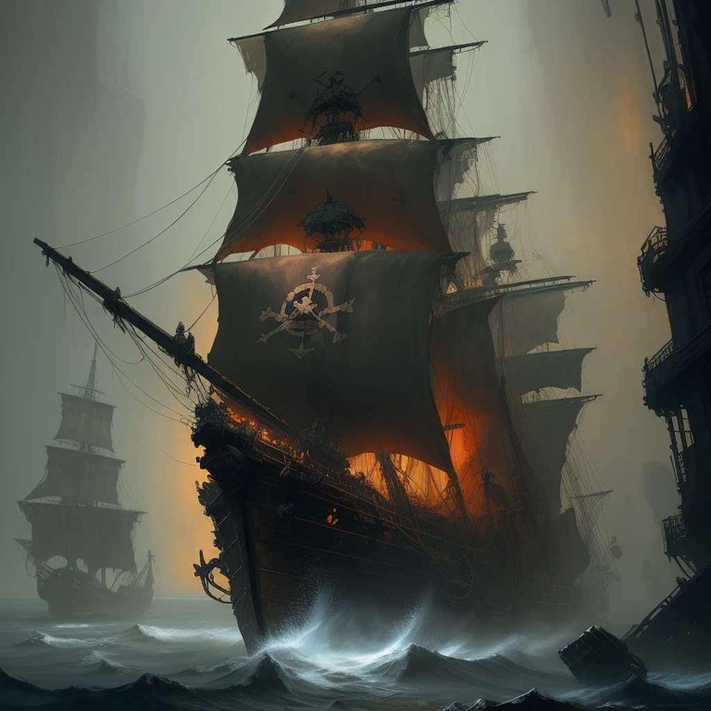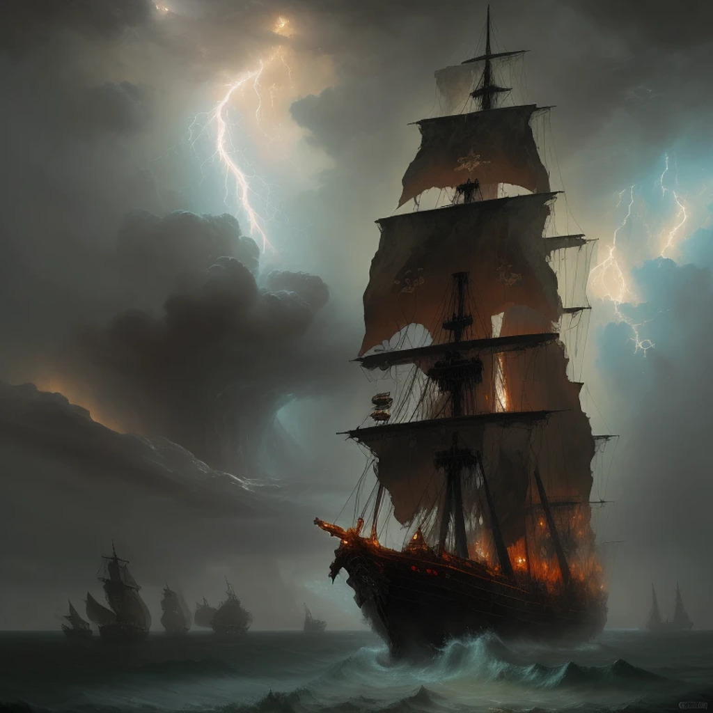 Prompt: oil painting with heavy impasto of a pirate ship, turbulent sea, thunderstorm, rain, cosmic horror painting, elegant intricate artstation concept art by craig mullins detailed, cinematic, hyper realism, high detail, octane render, 8k