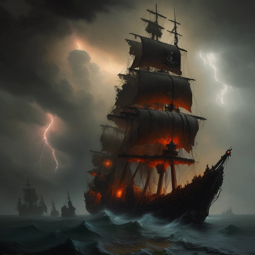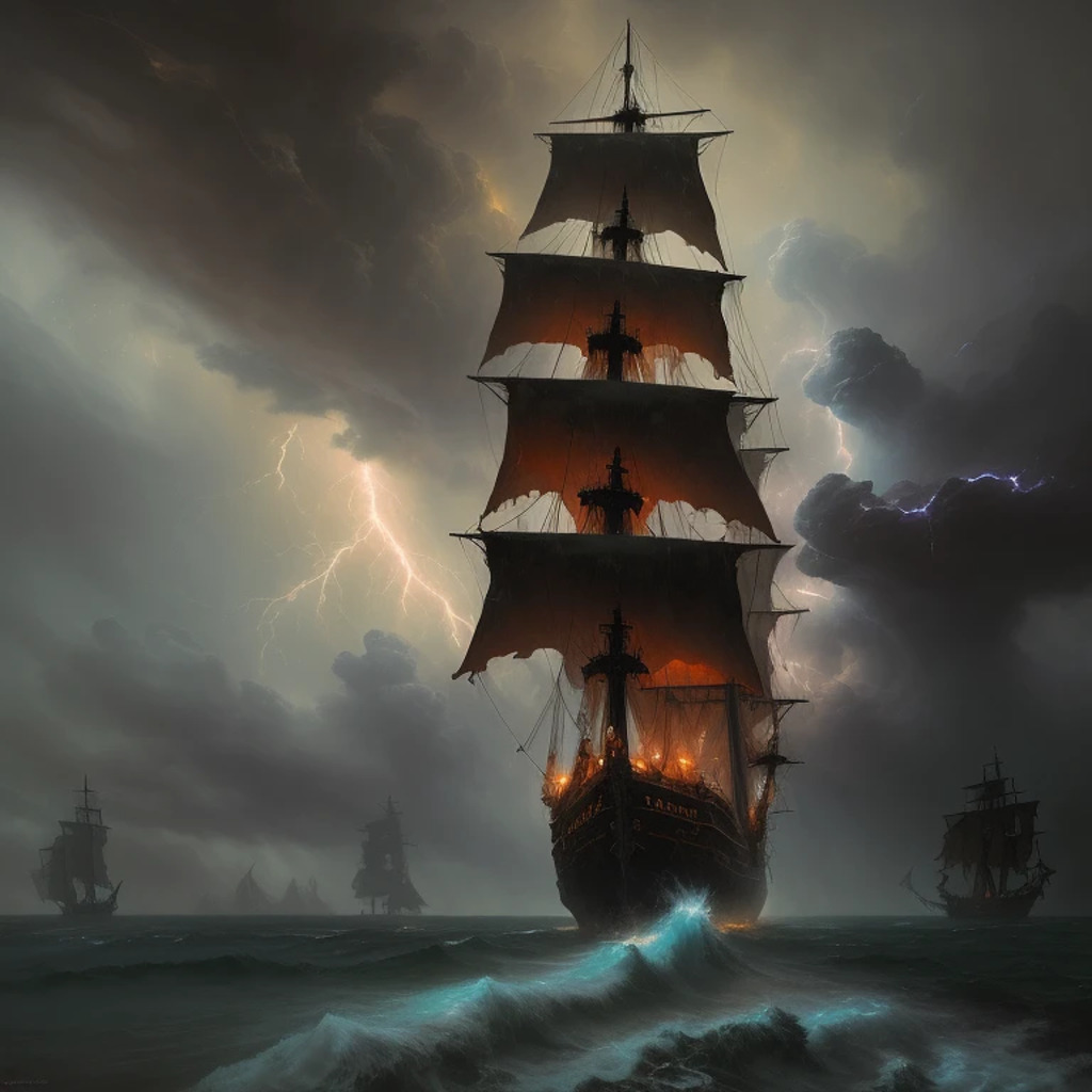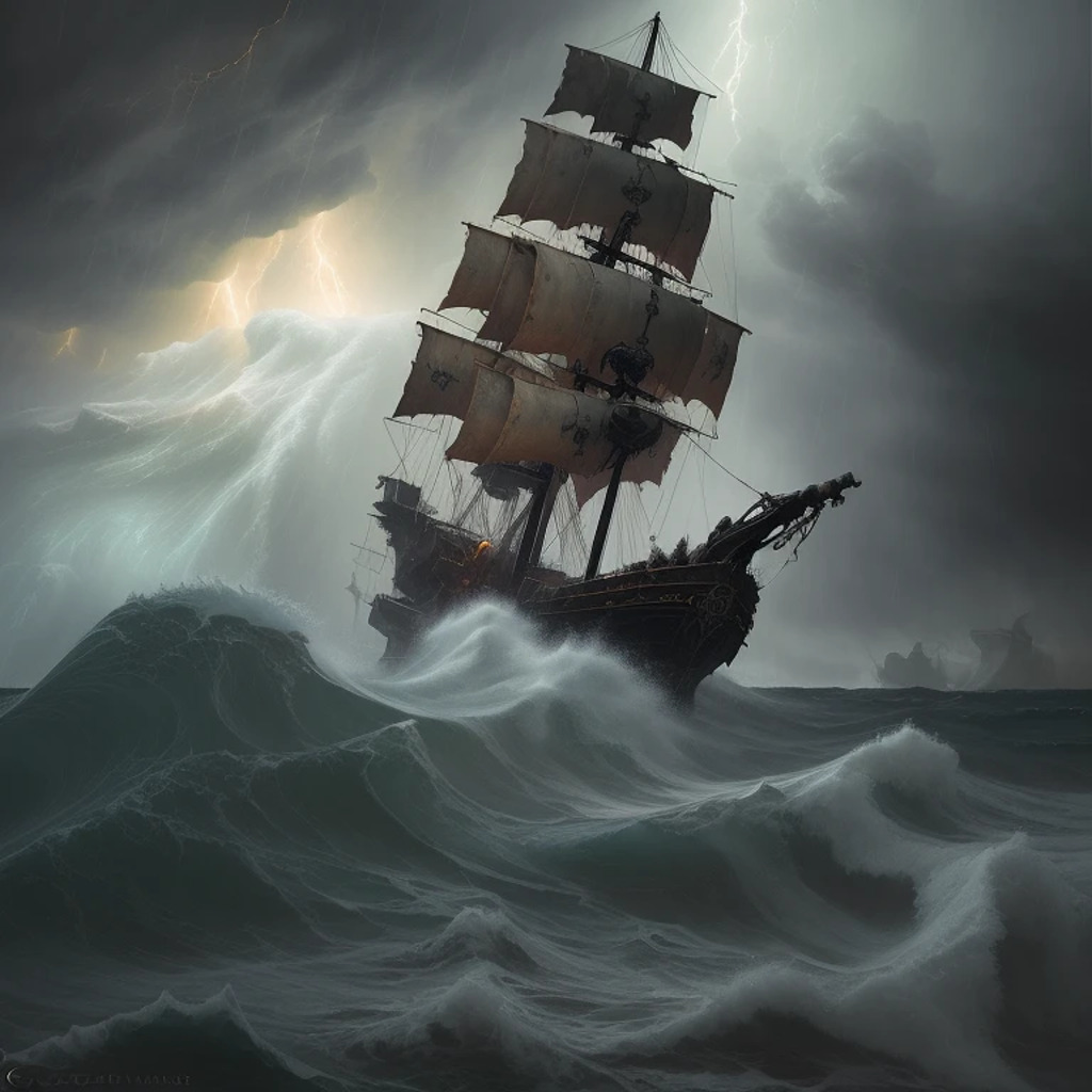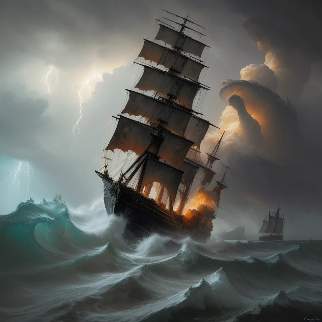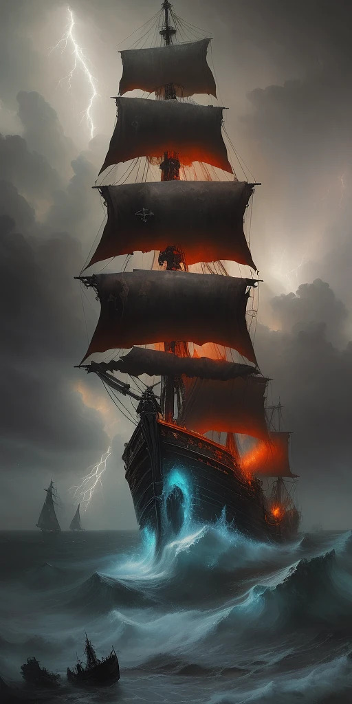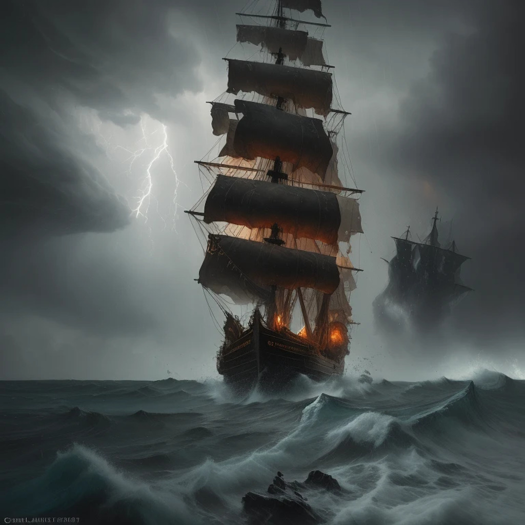 Prompt: oil painting with heavy impasto of a pirate ship, turbulent sea, thunderstorm, rain, cosmic horror painting, elegant intricate artstation concept art by craig mullins detailed, cinematic, hyper realism, high detail, octane render, 8k