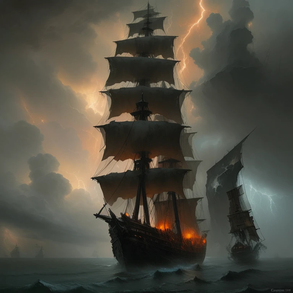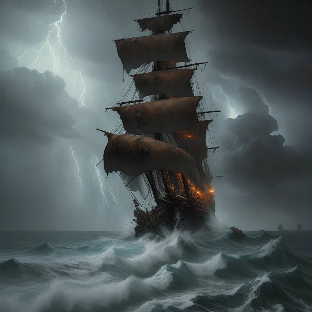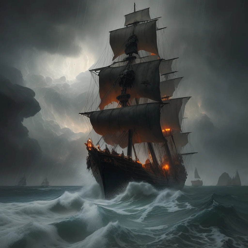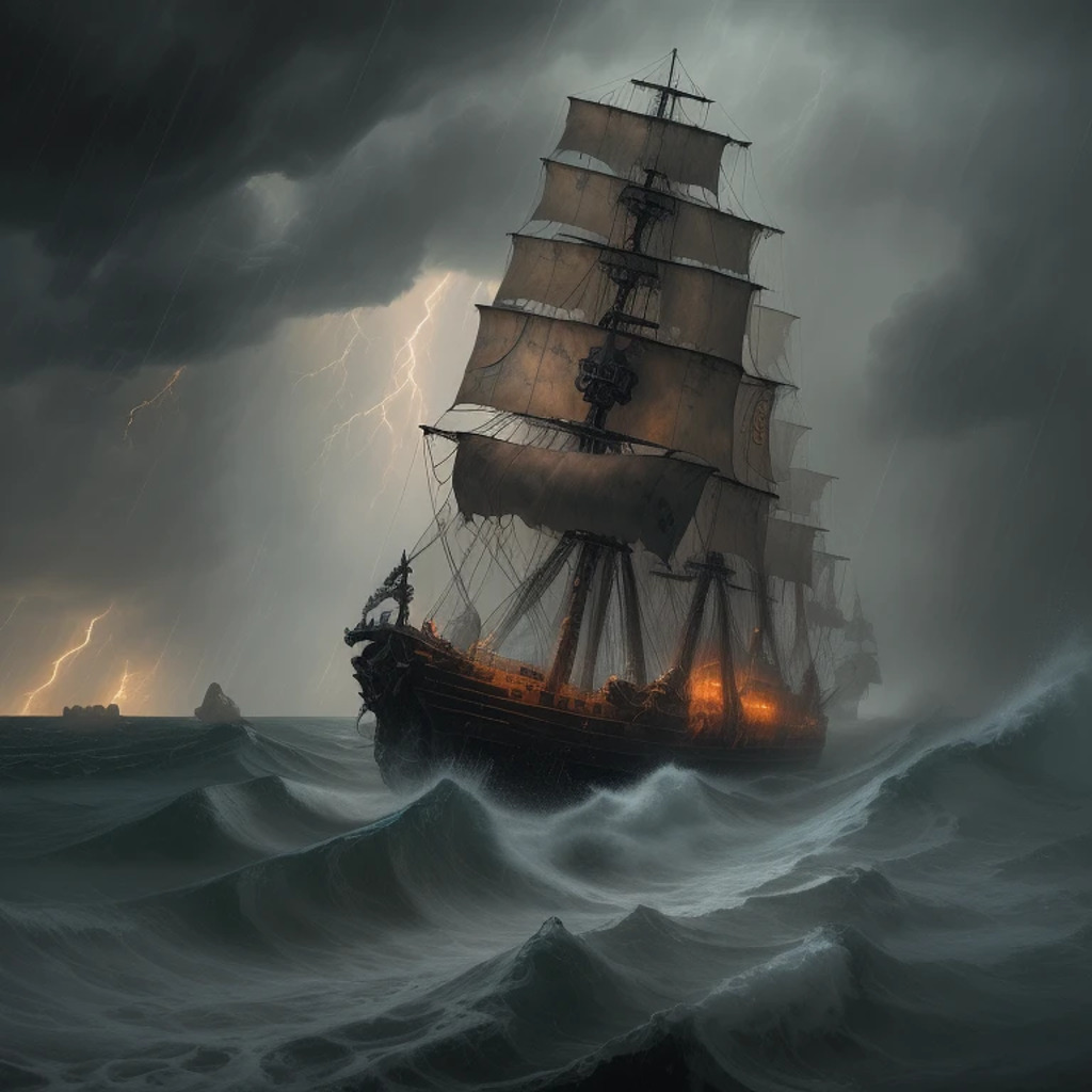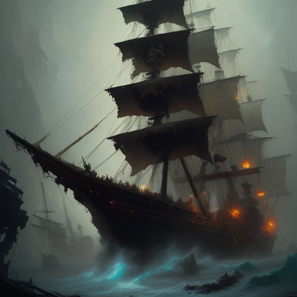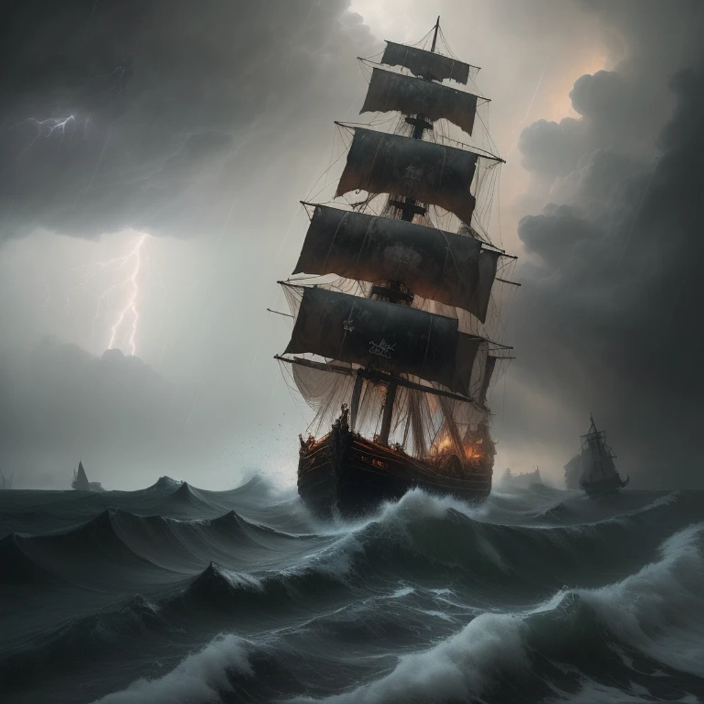 Prompt: oil painting with heavy impasto of a pirate ship, turbulent sea, thunderstorm, rain, cosmic horror painting, elegant intricate artstation concept art by craig mullins detailed, cinematic, hyper realism, high detail, octane render, 8k