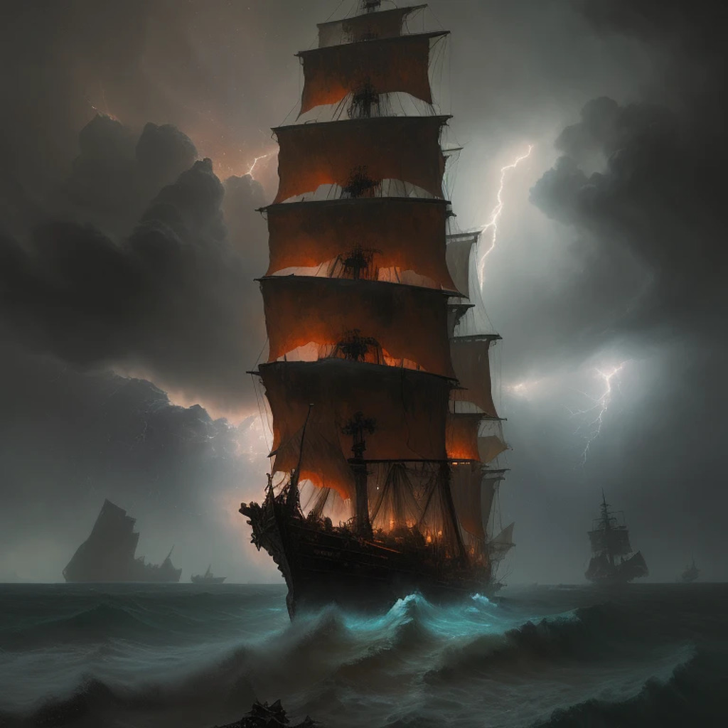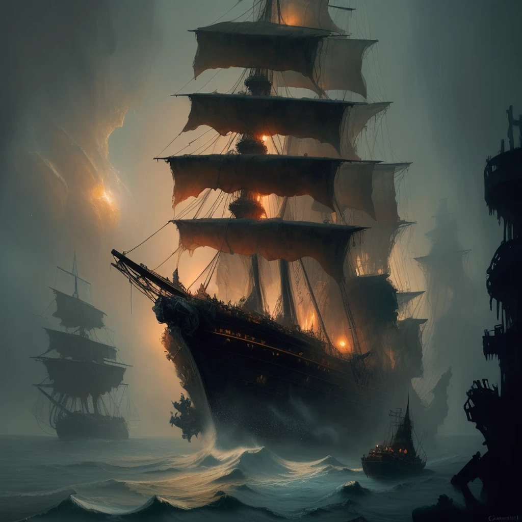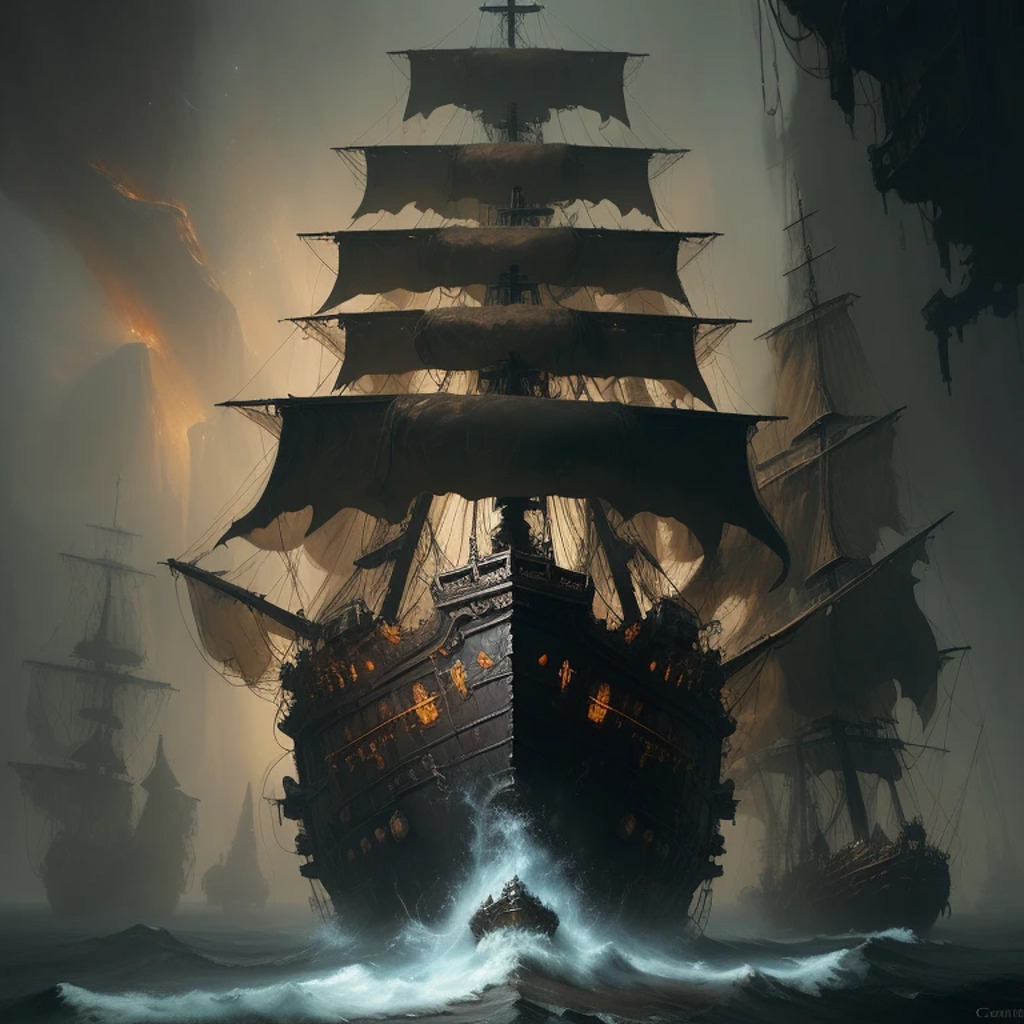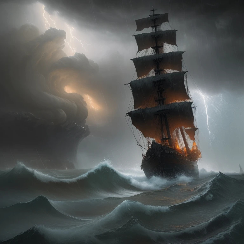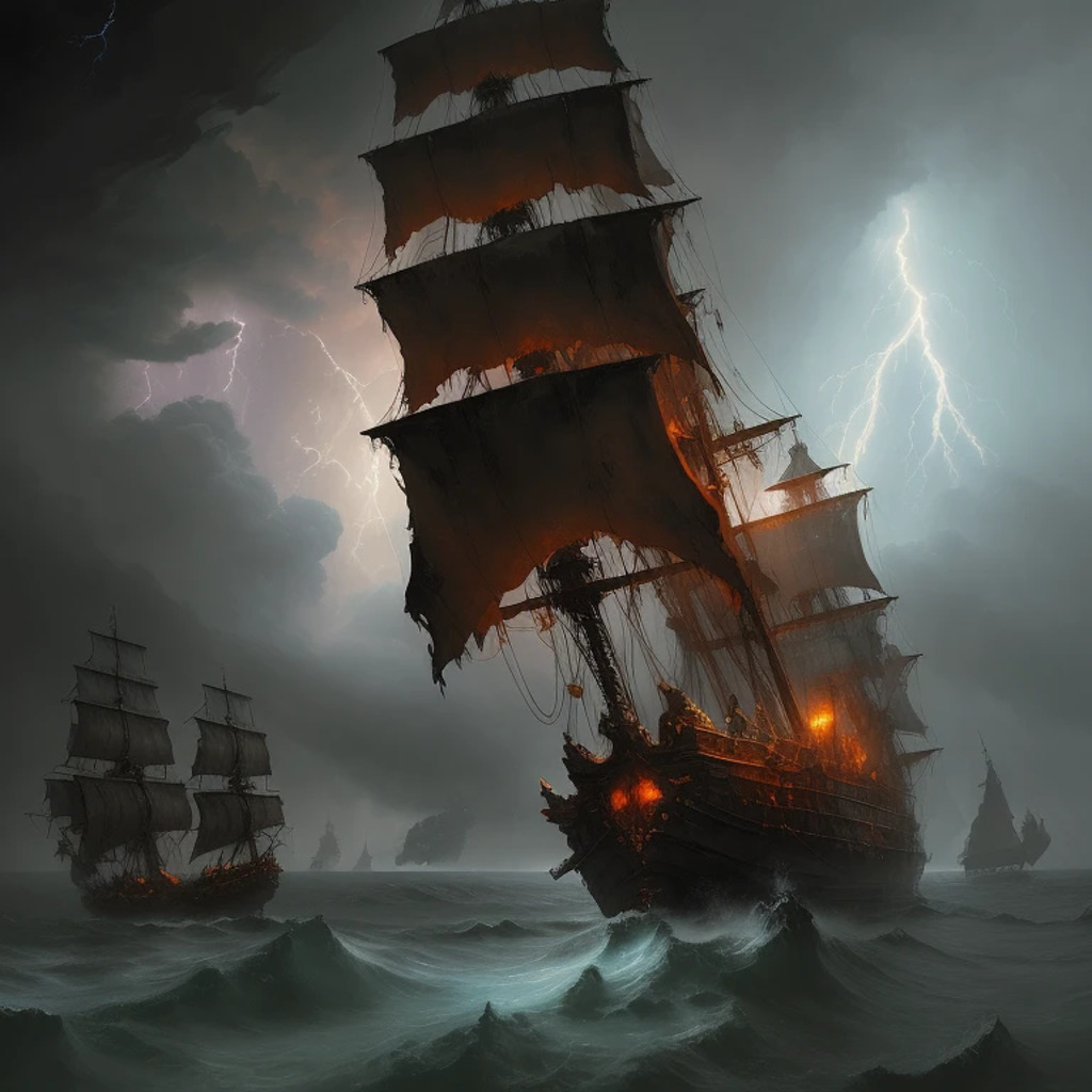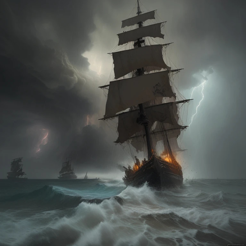 Prompt: oil painting with heavy impasto of a pirate ship, turbulent sea, thunderstorm, rain, cosmic horror painting, elegant intricate artstation concept art by craig mullins detailed, cinematic, hyper realism, high detail, octane render, 8k