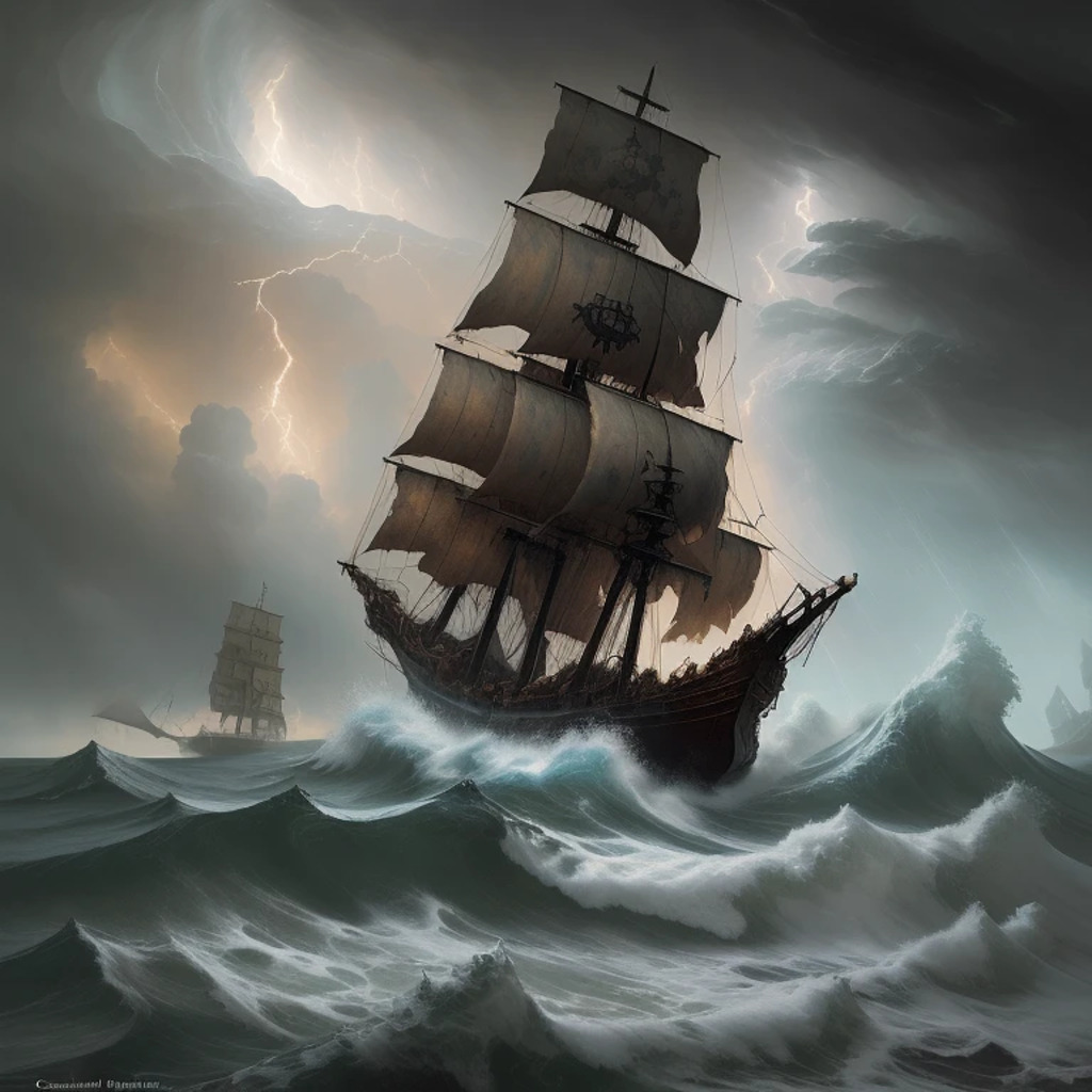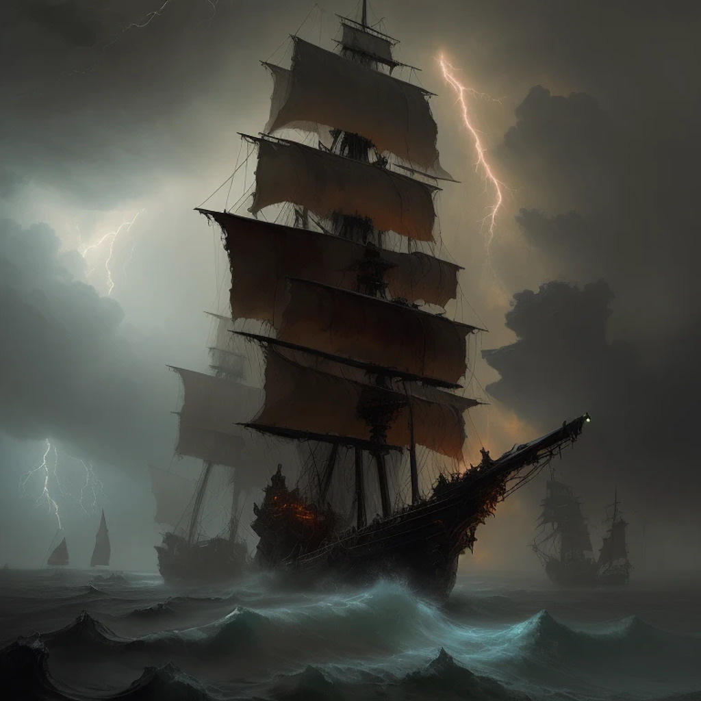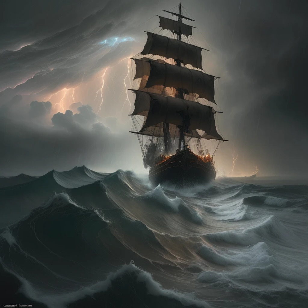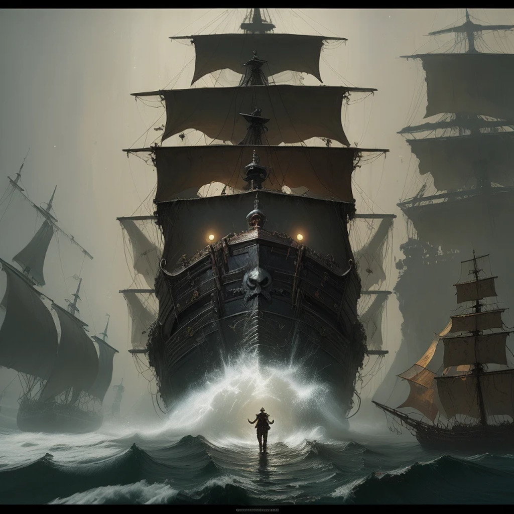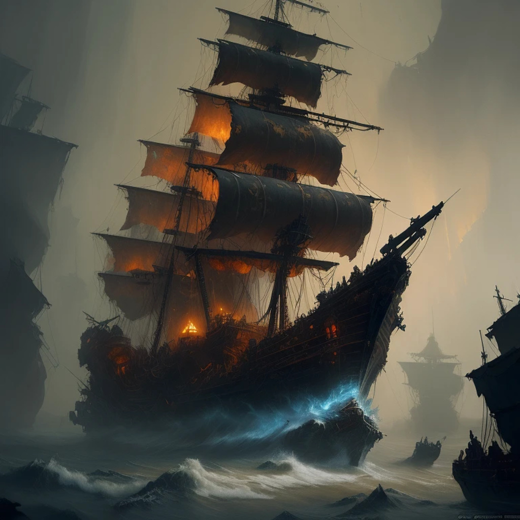 Prompt: oil painting with heavy impasto of a pirate ship, turbulent sea, thunderstorm, rain, cosmic horror painting, elegant intricate artstation concept art by craig mullins detailed, cinematic, hyper realism, high detail, octane render, 8k