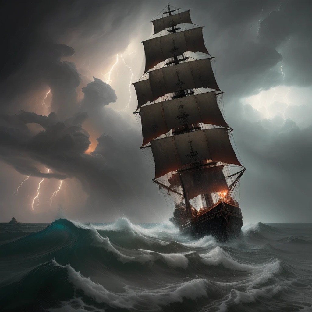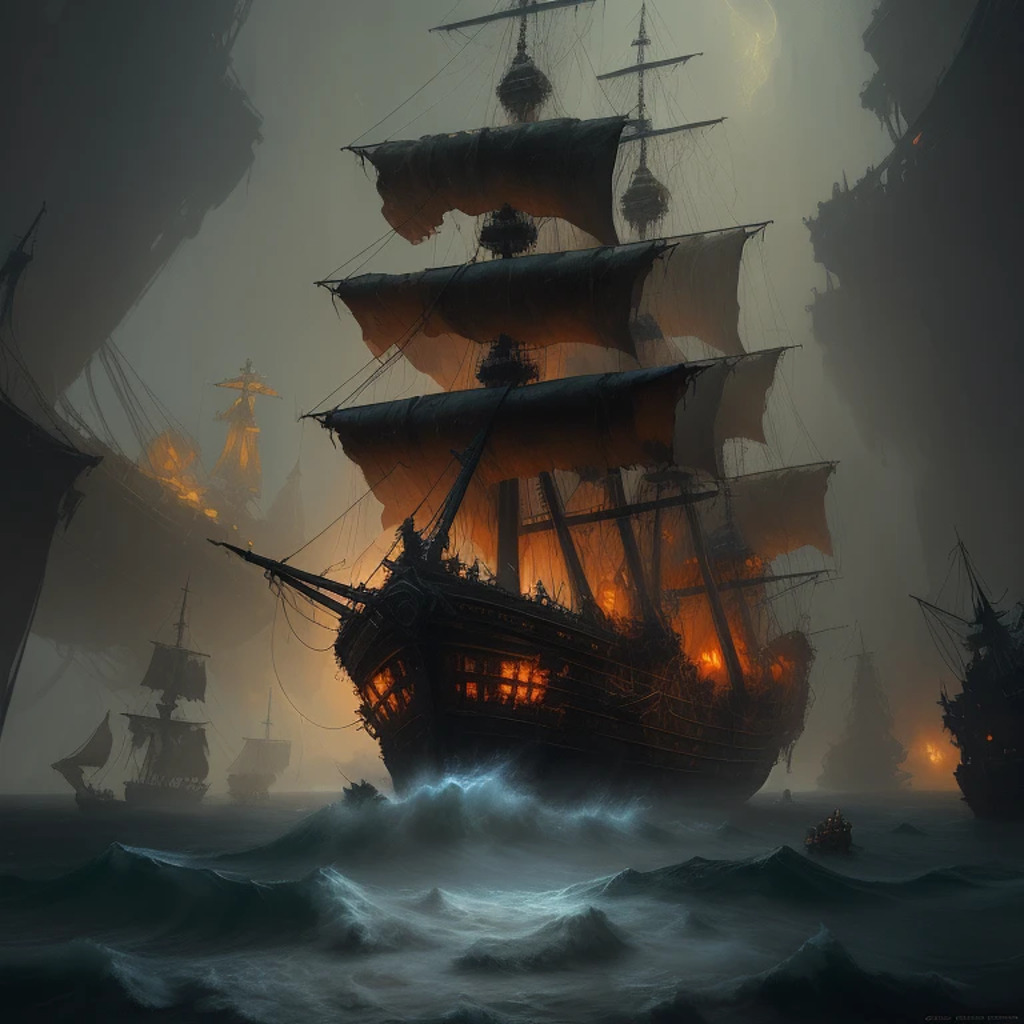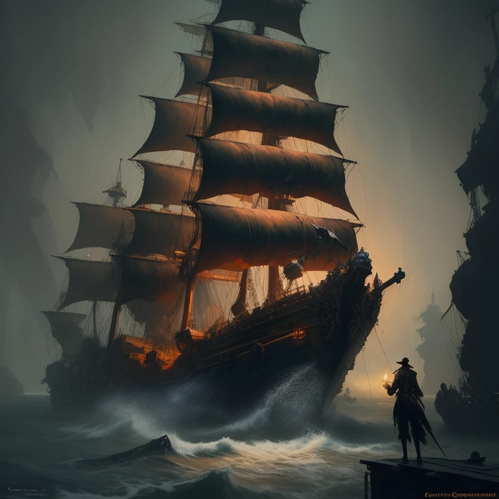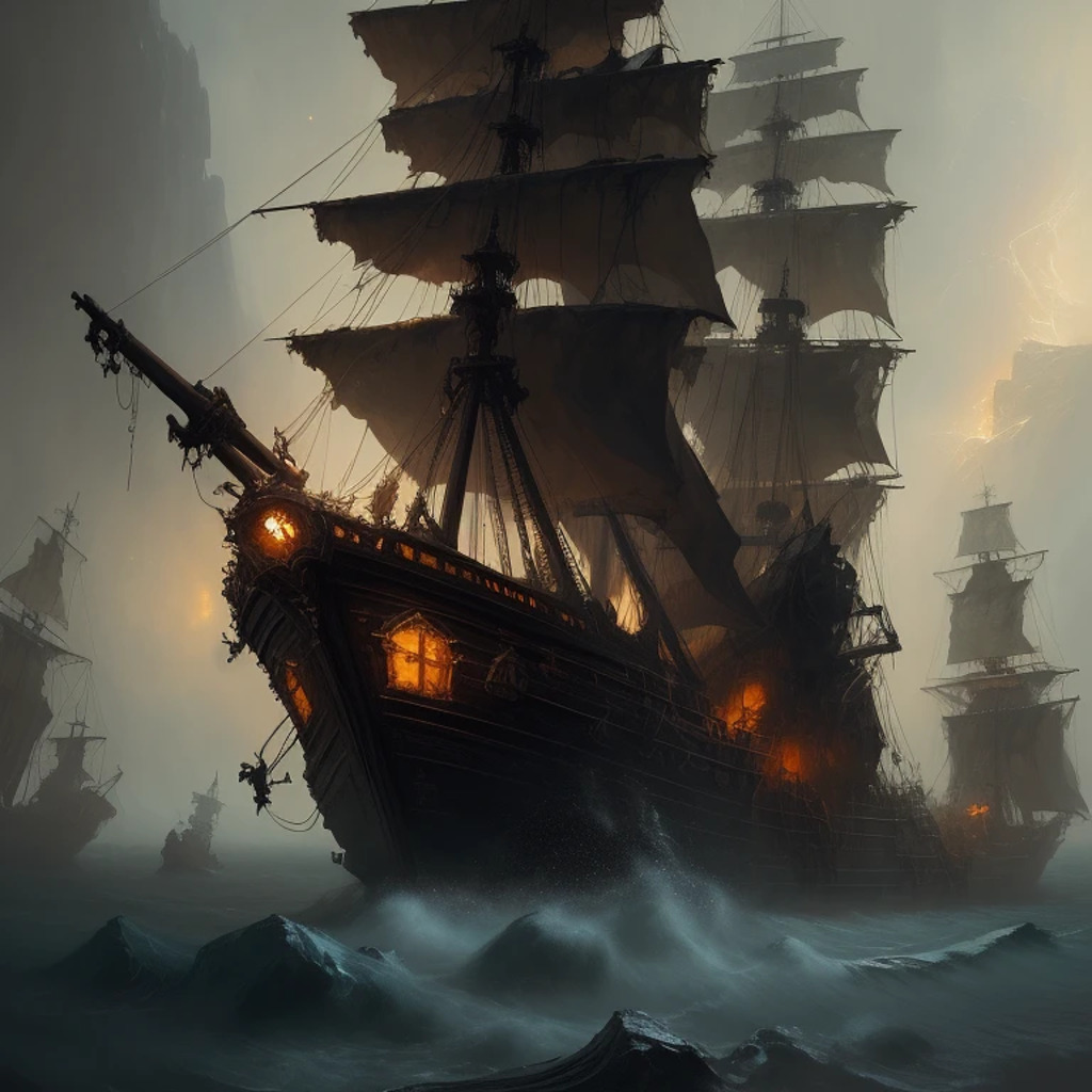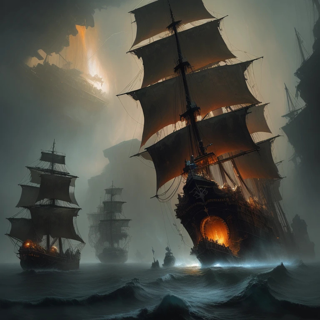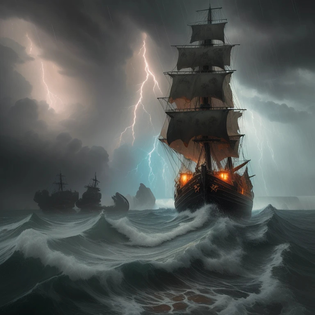 Prompt: oil painting with heavy impasto of a pirate ship, turbulent sea, thunderstorm, rain, cosmic horror painting, elegant intricate artstation concept art by craig mullins detailed, cinematic, hyper realism, high detail, octane render, 8k