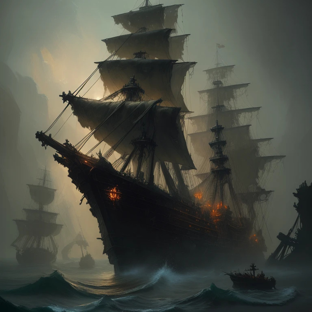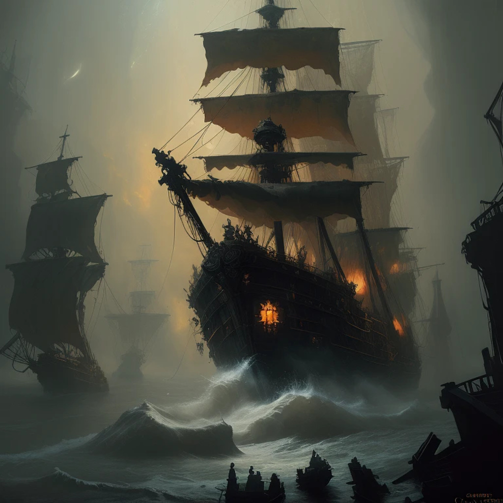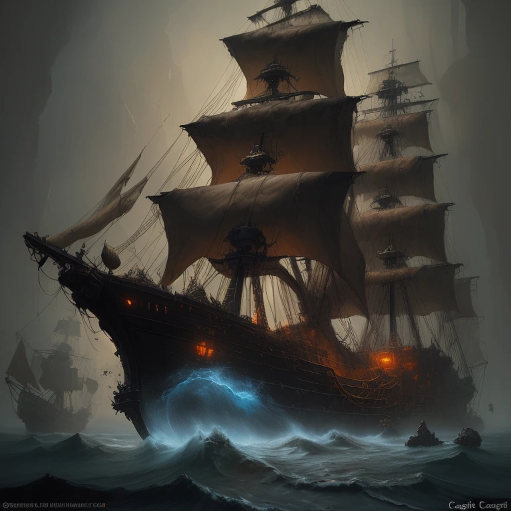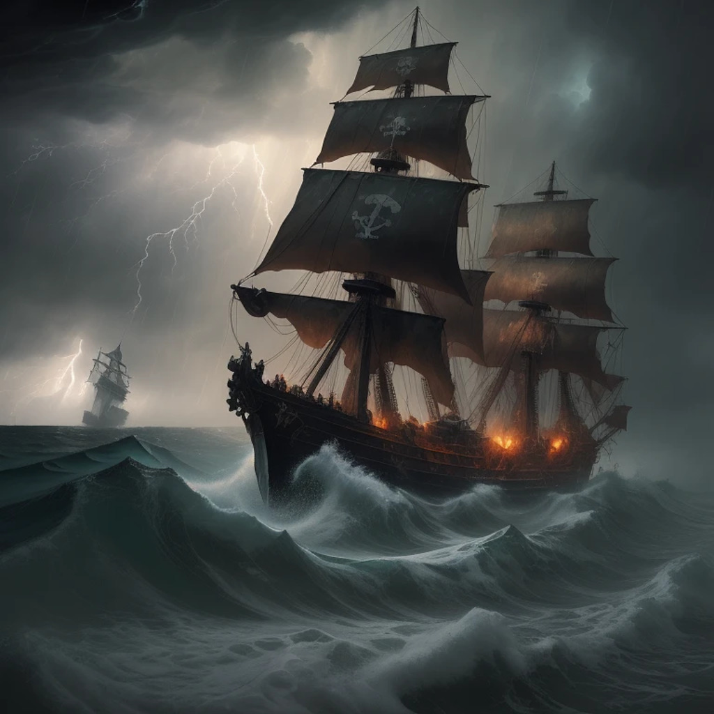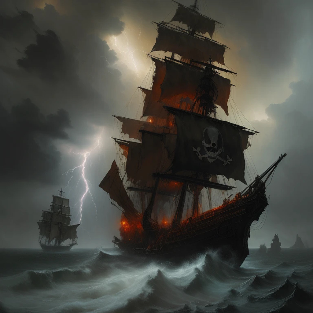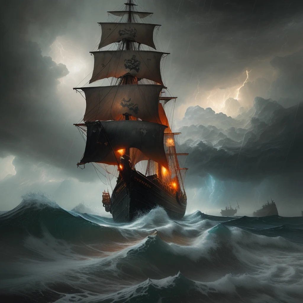 Prompt: oil painting with heavy impasto of a pirate ship, turbulent sea, thunderstorm, rain, cosmic horror painting, elegant intricate artstation concept art by craig mullins detailed, cinematic, hyper realism, high detail, octane render, 8k