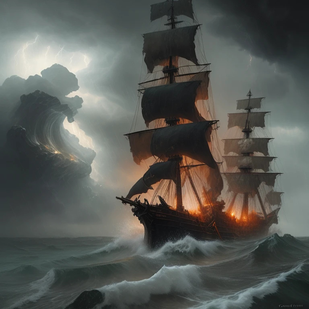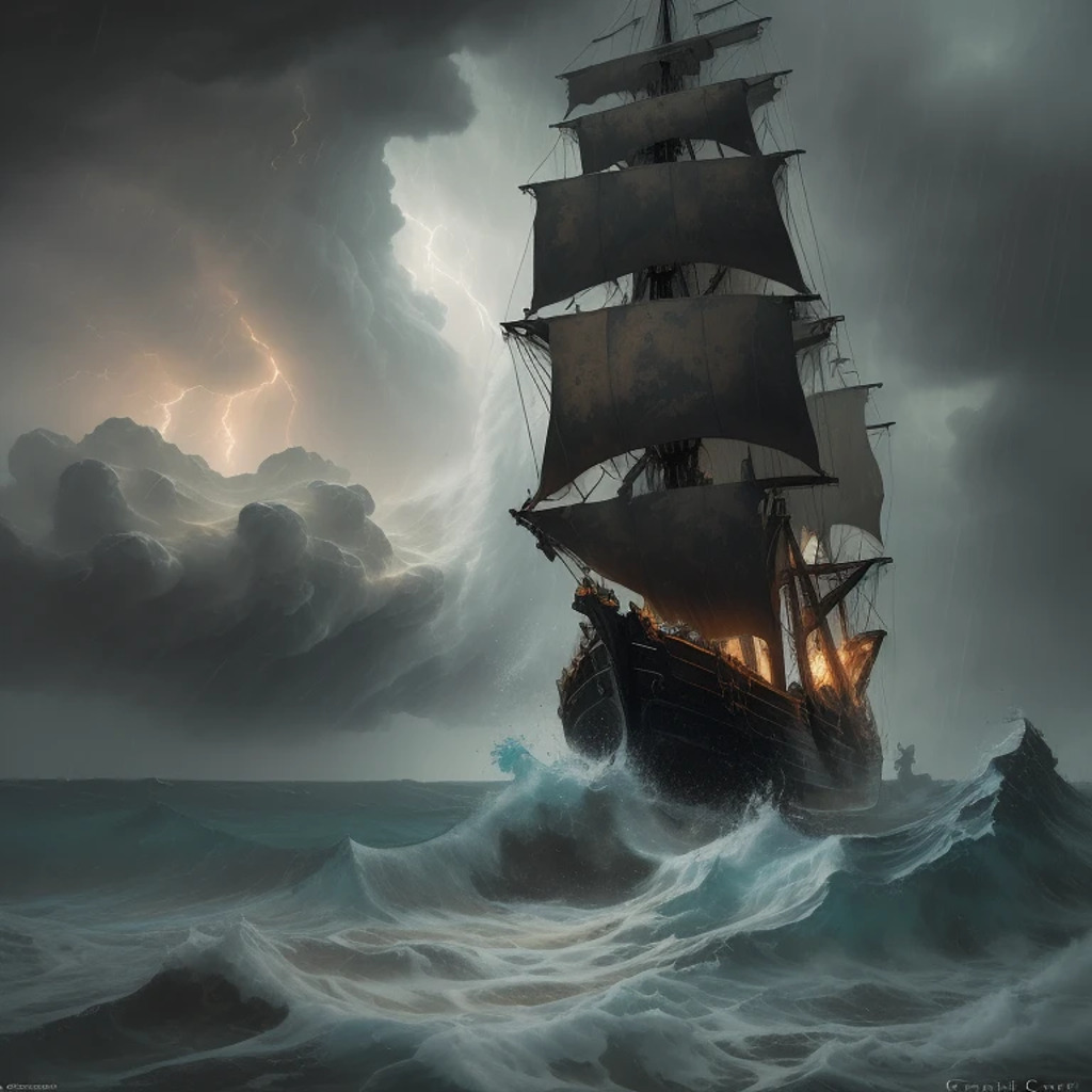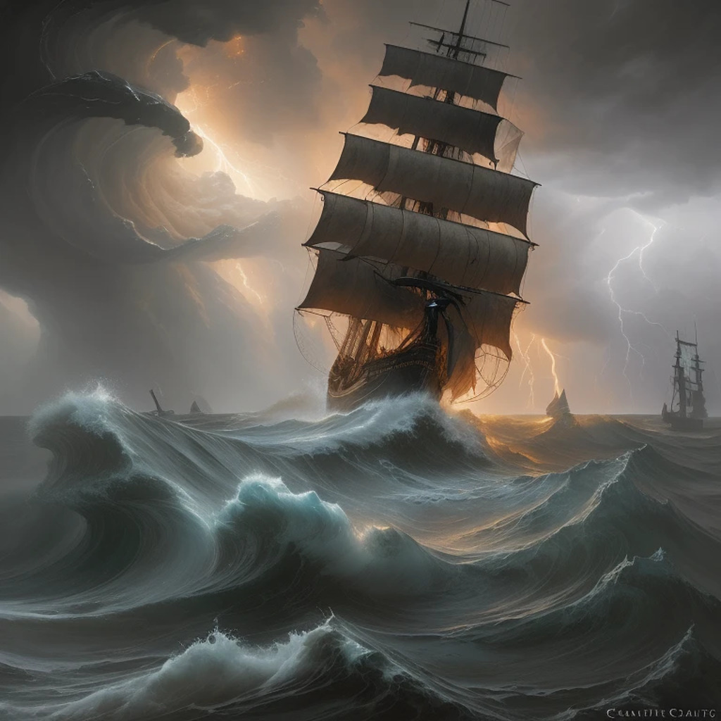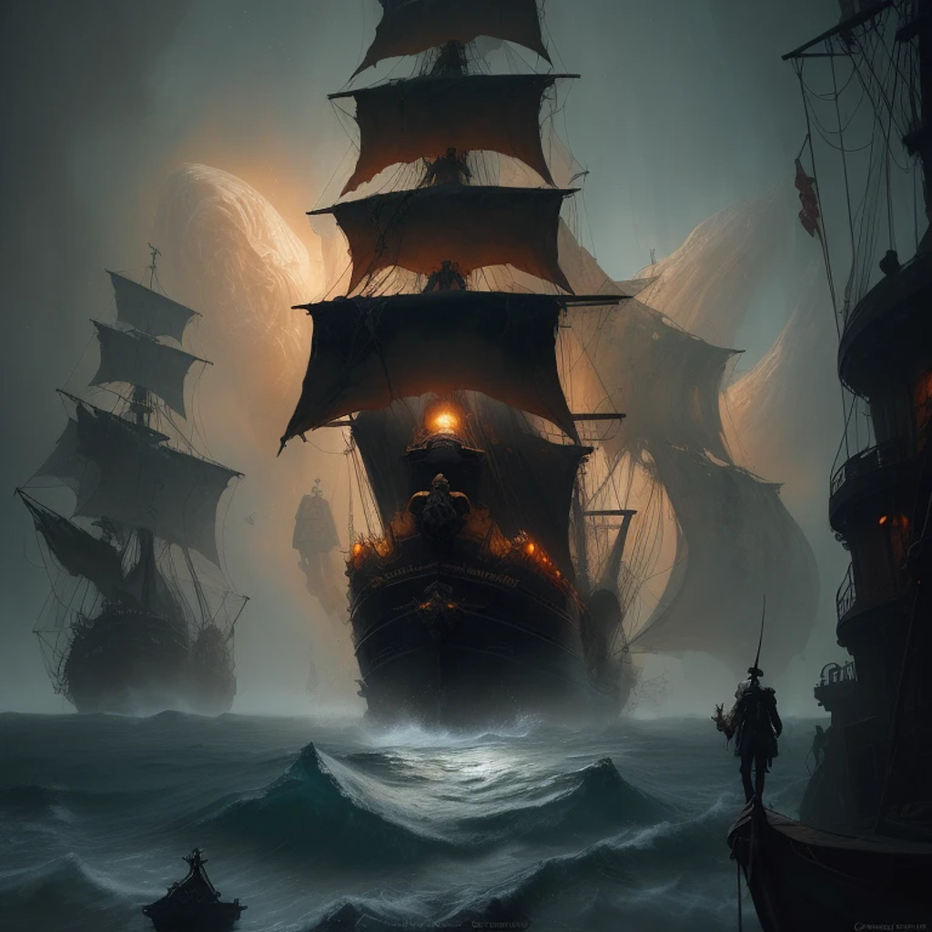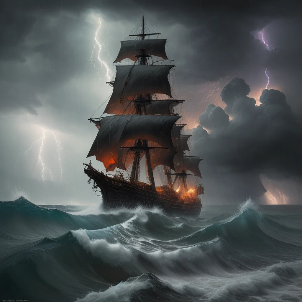 Prompt: oil painting with heavy impasto of a pirate ship, turbulent sea, thunderstorm, rain, cosmic horror painting, elegant intricate artstation concept art by craig mullins detailed, cinematic, hyper realism, high detail, octane render, 8k