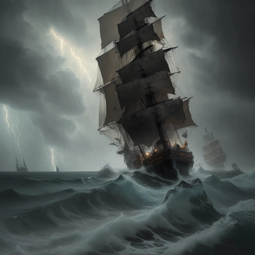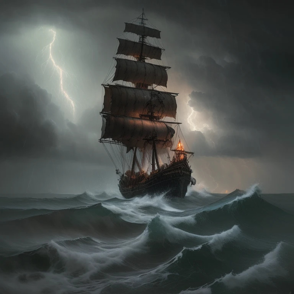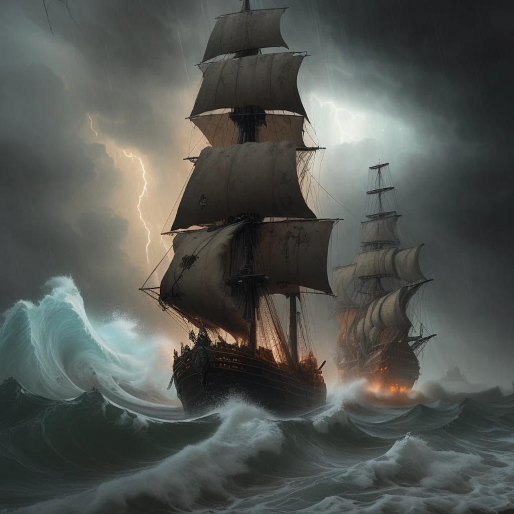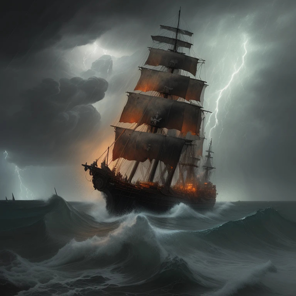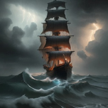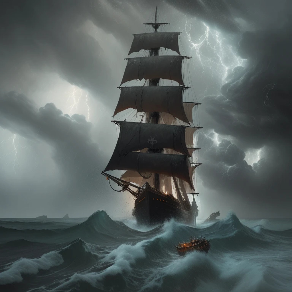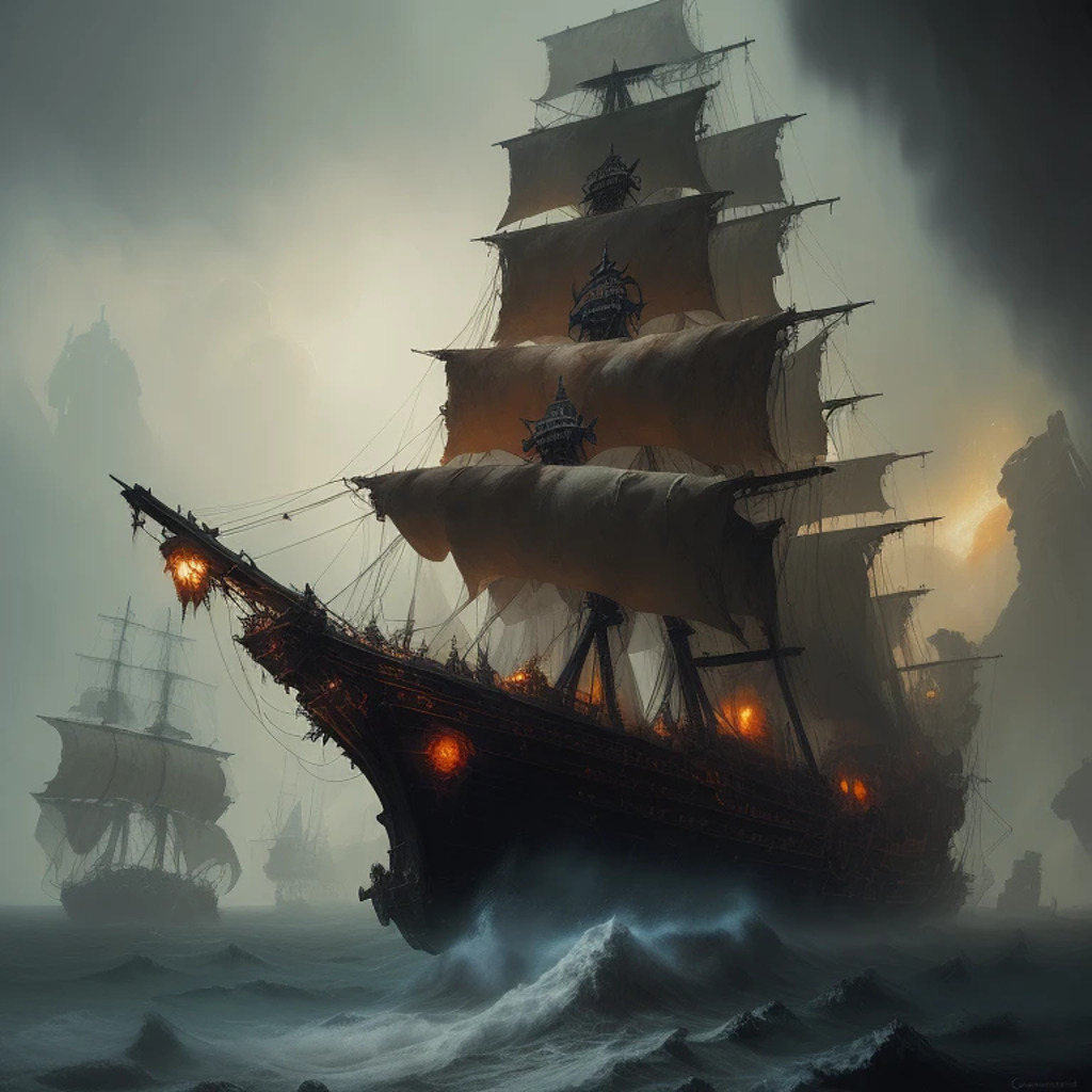Prompt: oil painting with heavy impasto of a pirate ship, turbulent sea, thunderstorm, rain, cosmic horror painting, elegant intricate artstation concept art by craig mullins detailed, cinematic, hyper realism, high detail, octane render, 8k