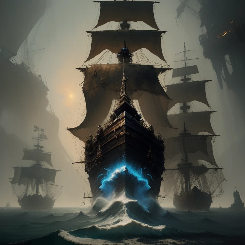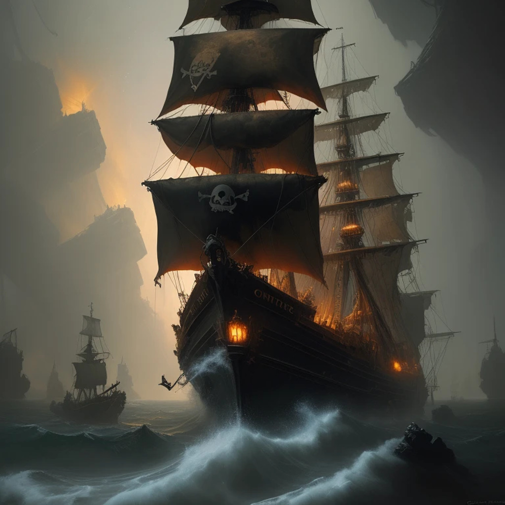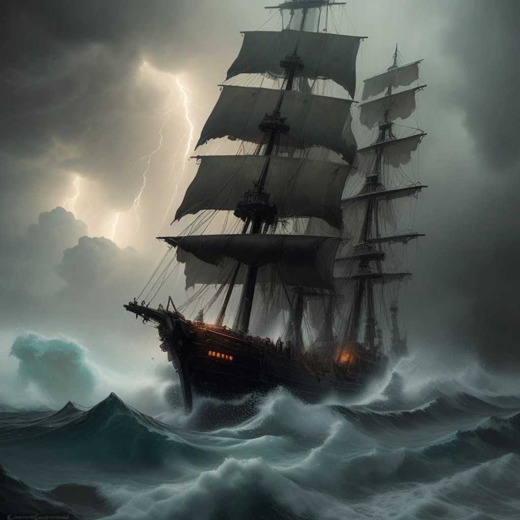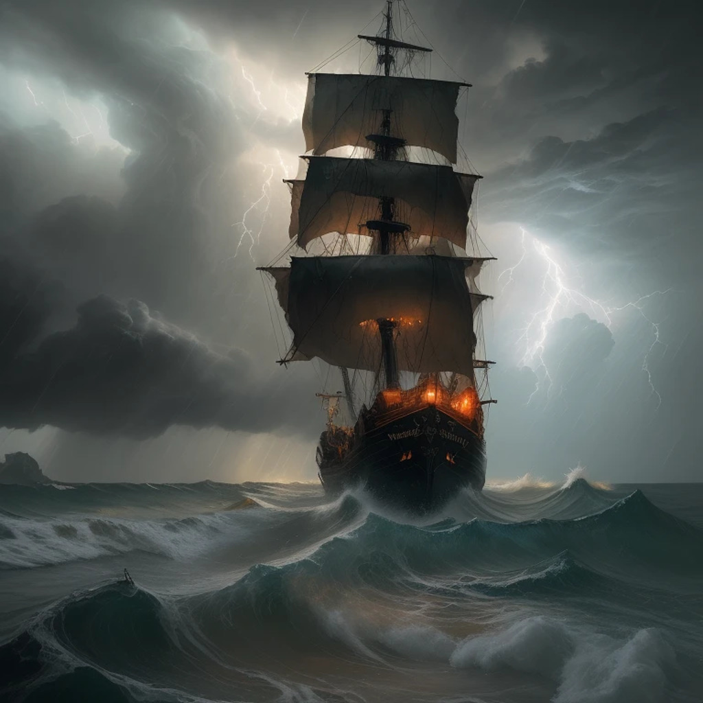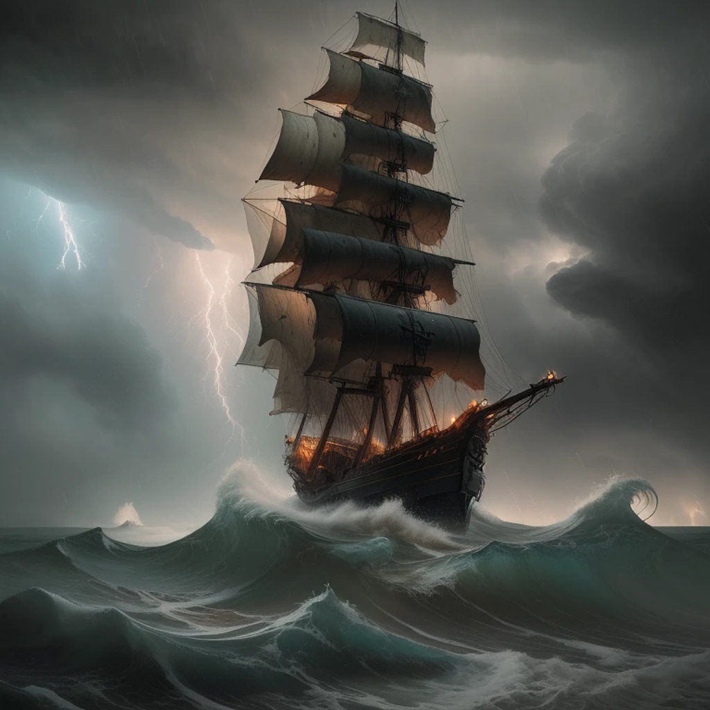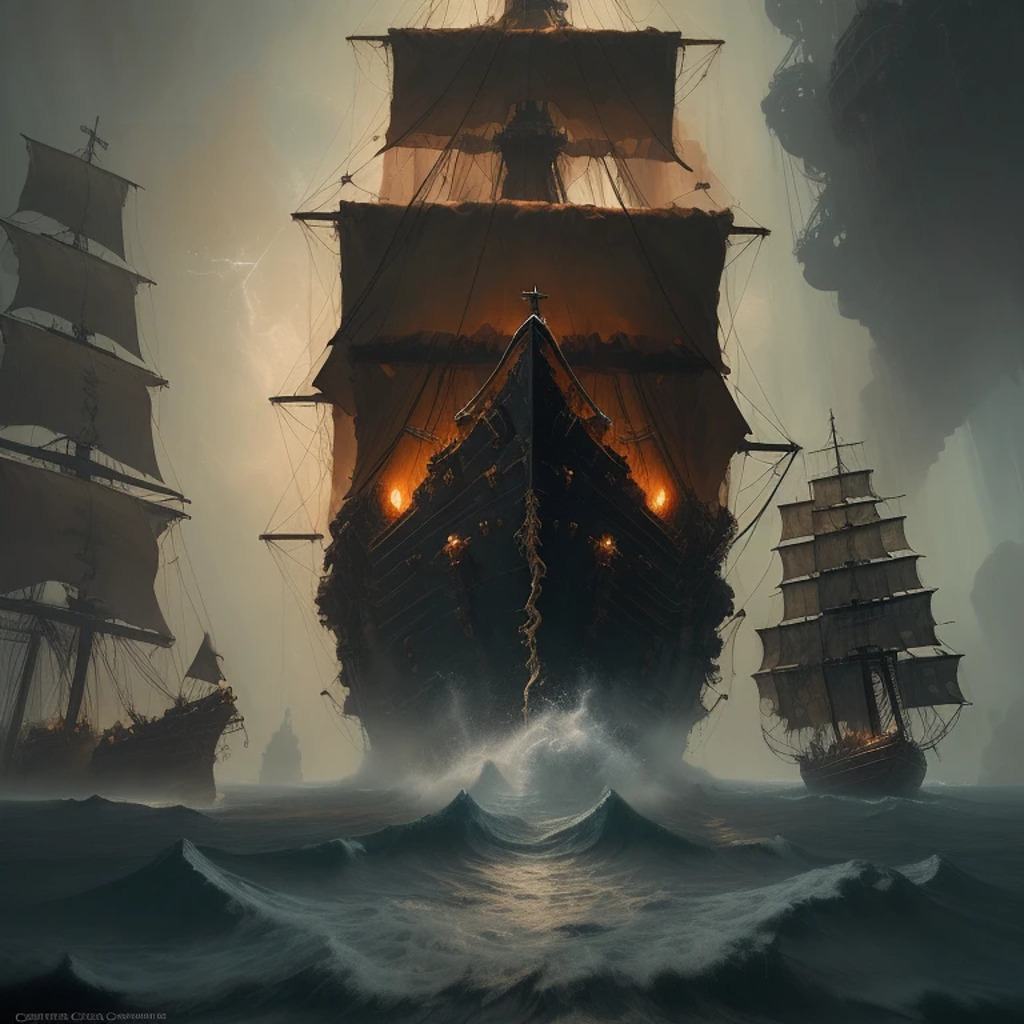 Prompt: oil painting with heavy impasto of a pirate ship, turbulent sea, thunderstorm, rain, cosmic horror painting, elegant intricate artstation concept art by craig mullins detailed, cinematic, hyper realism, high detail, octane render, 8k