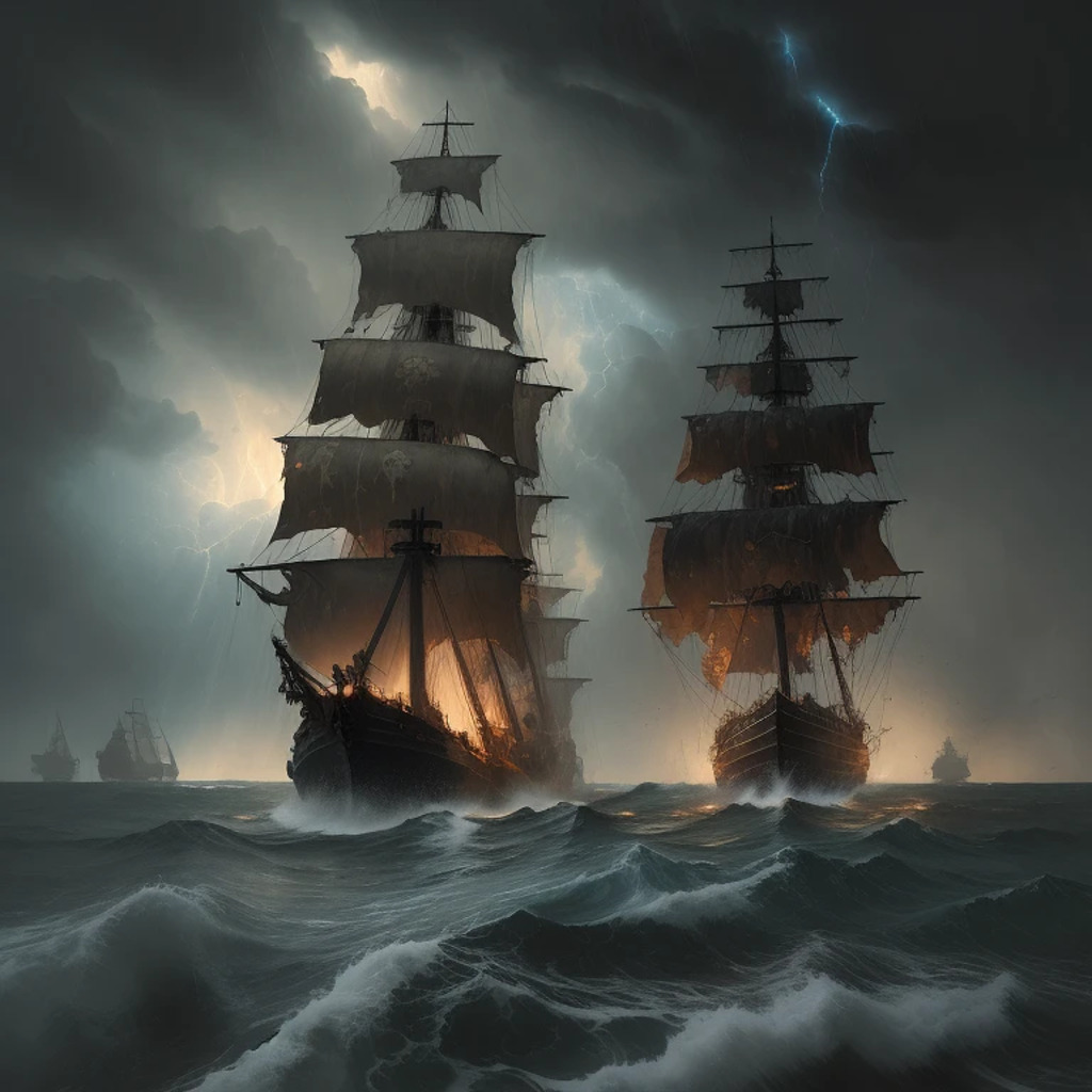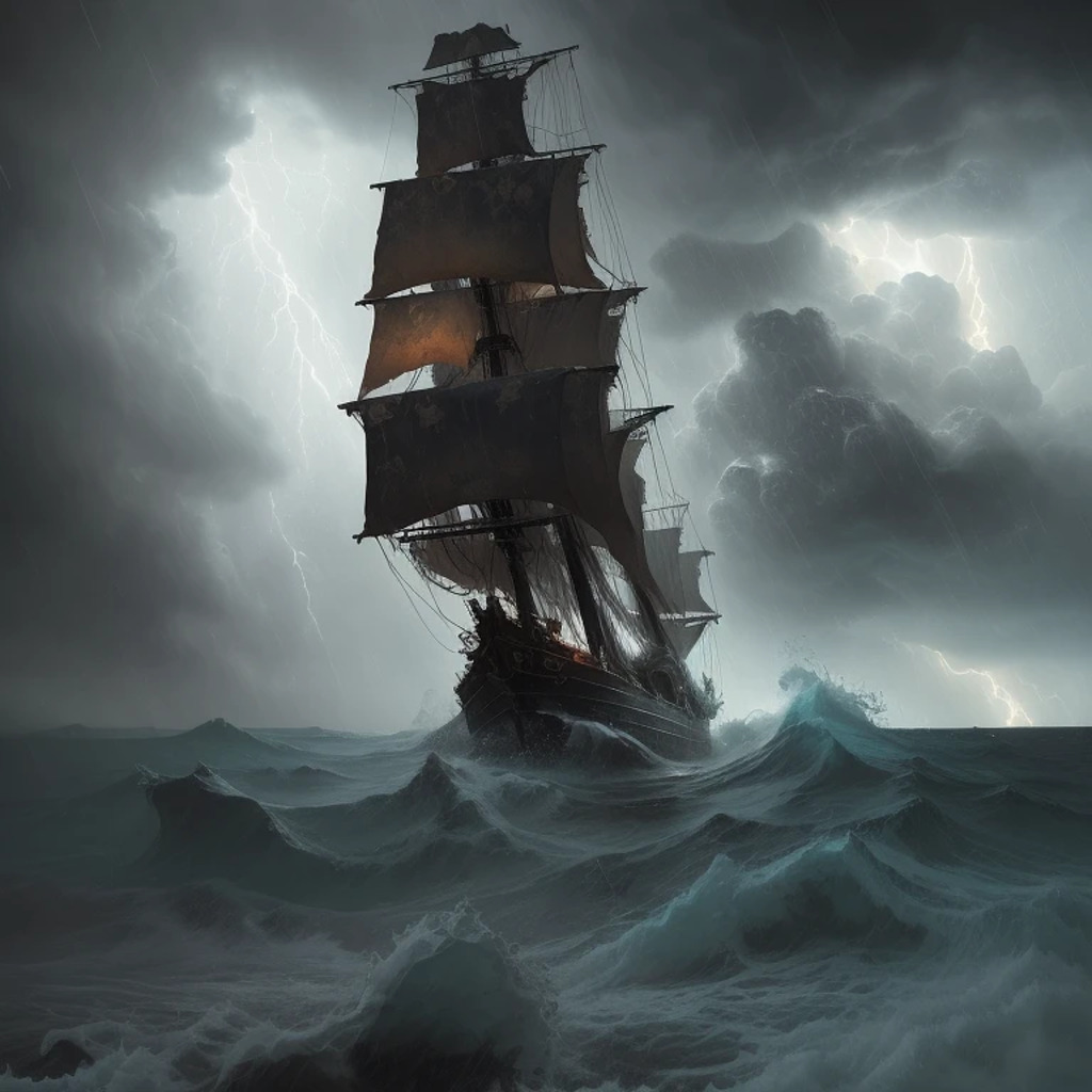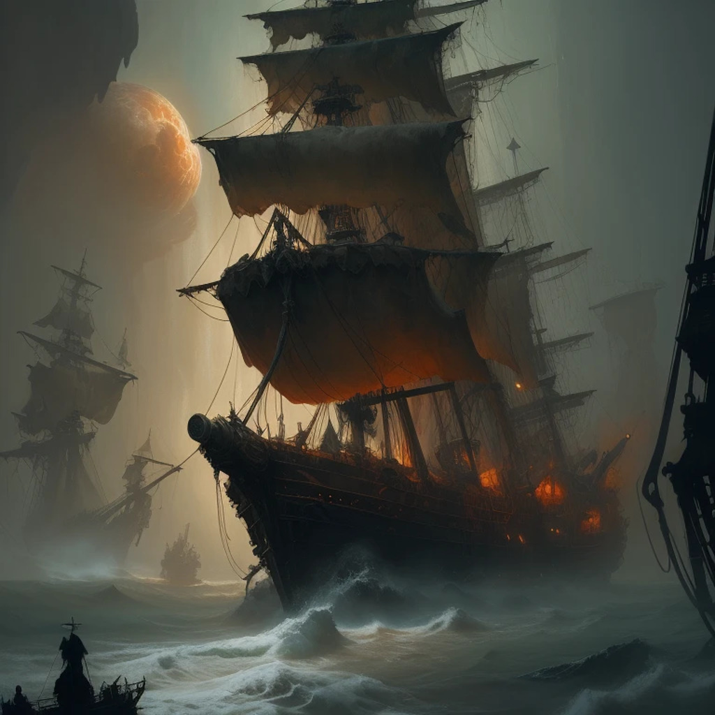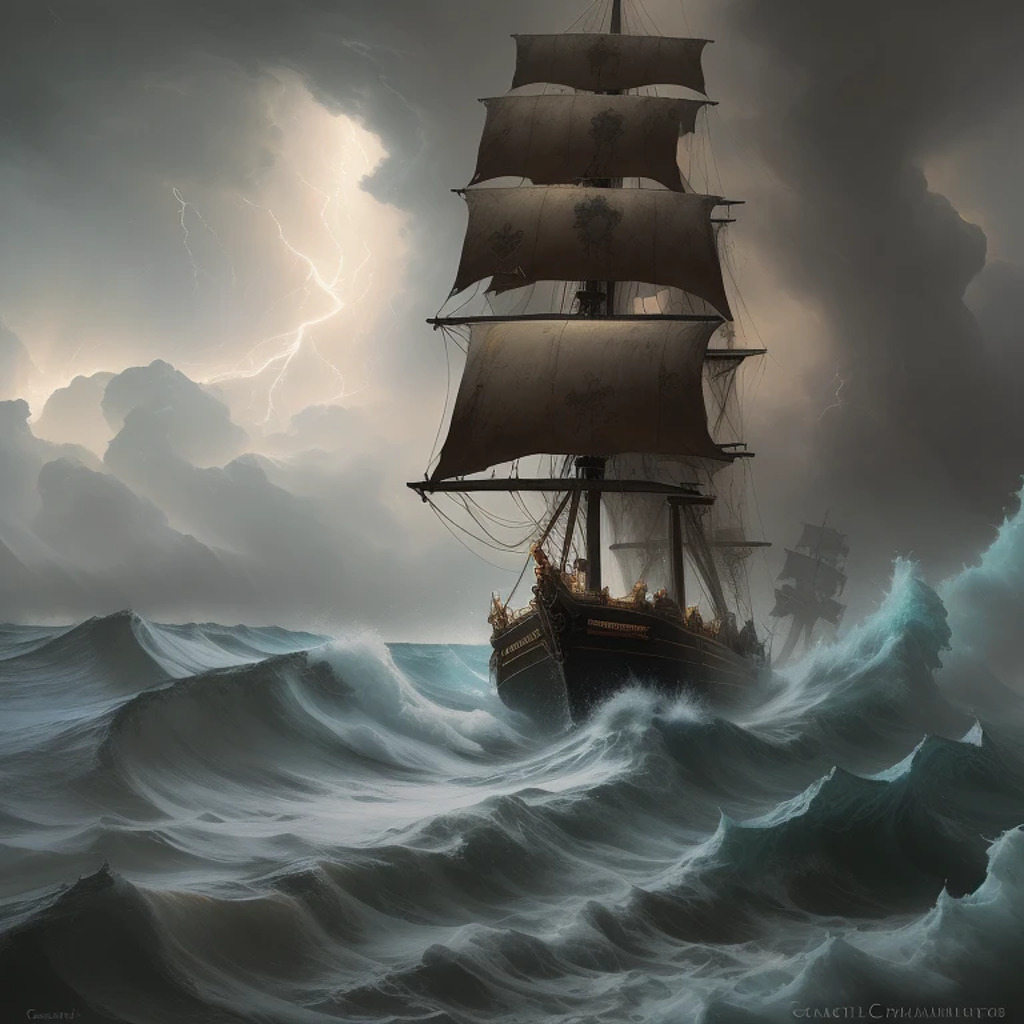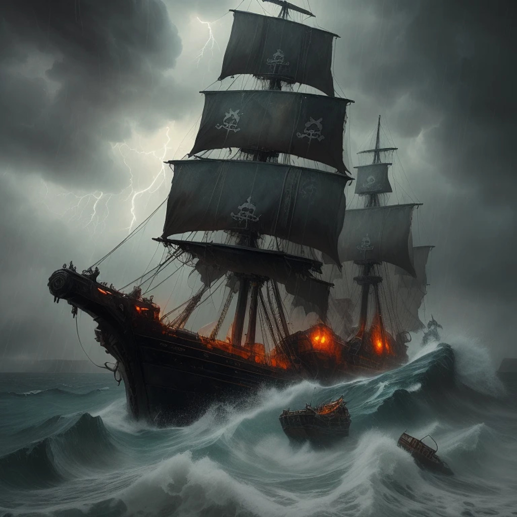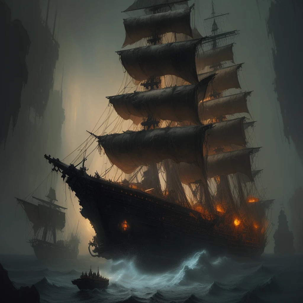 Prompt: oil painting with heavy impasto of a pirate ship, turbulent sea, thunderstorm, rain, cosmic horror painting, elegant intricate artstation concept art by craig mullins detailed, cinematic, hyper realism, high detail, octane render, 8k