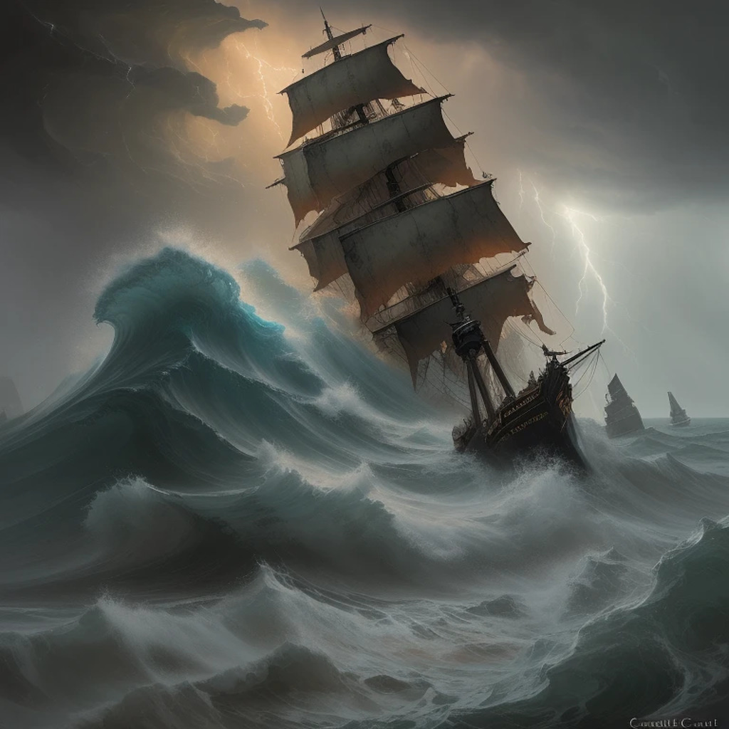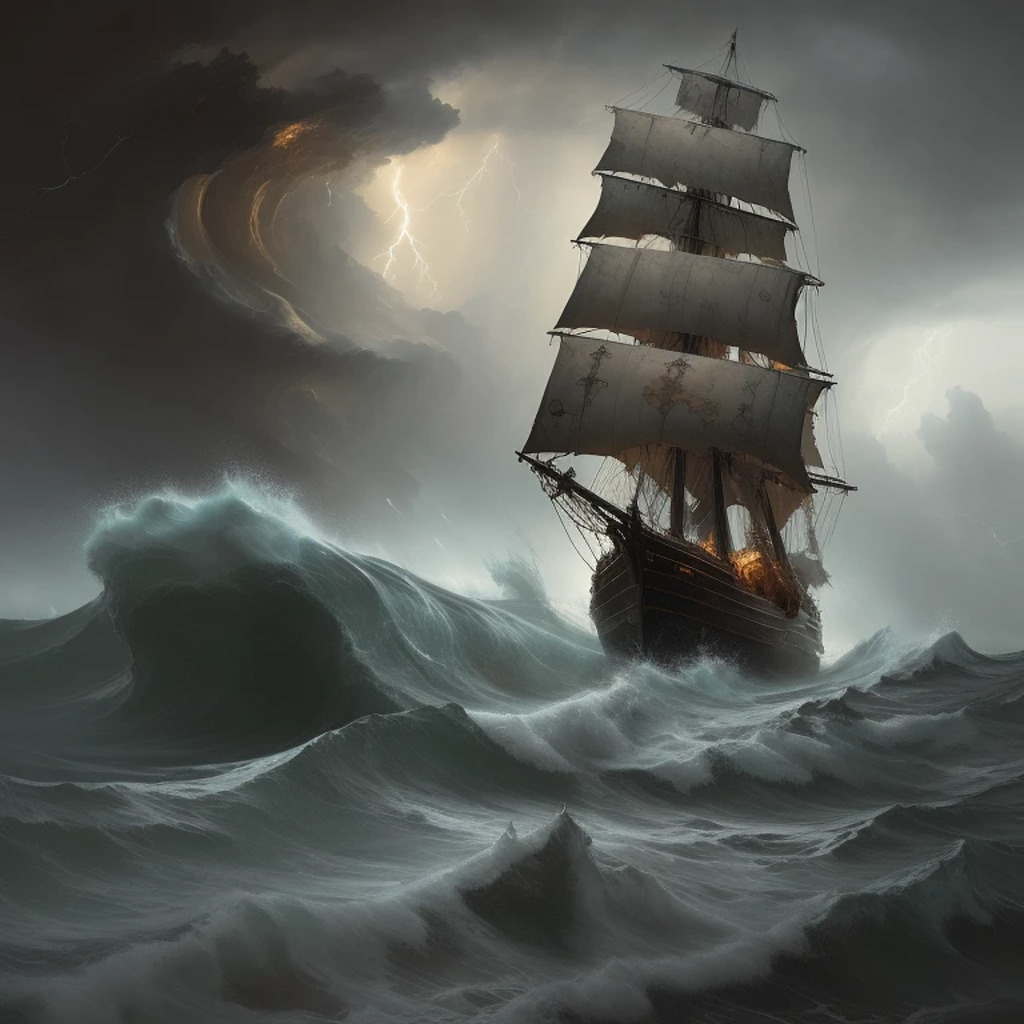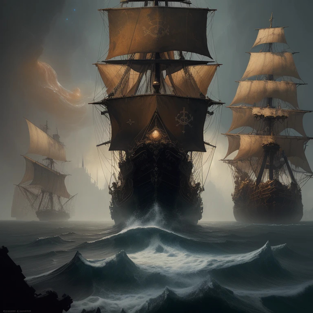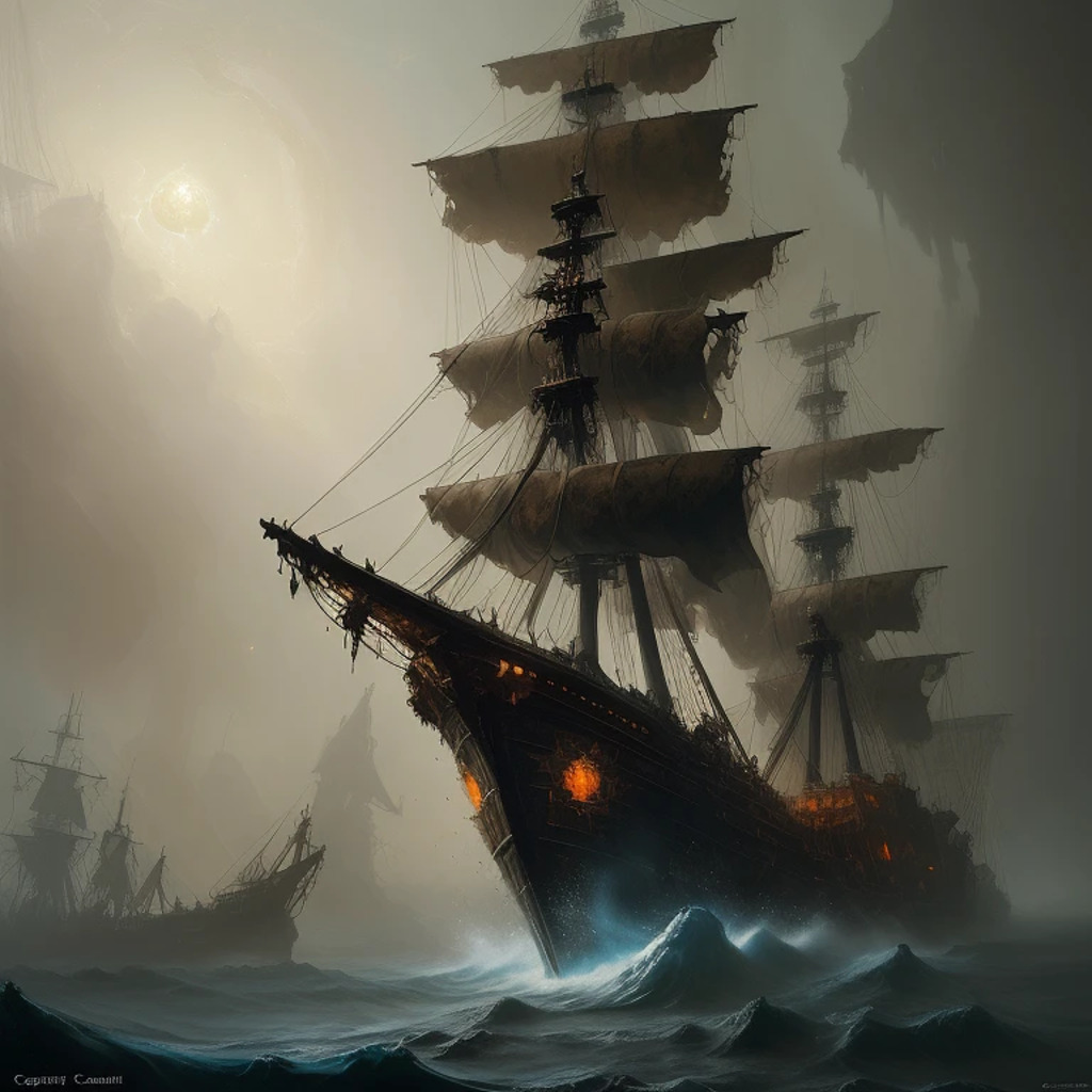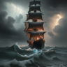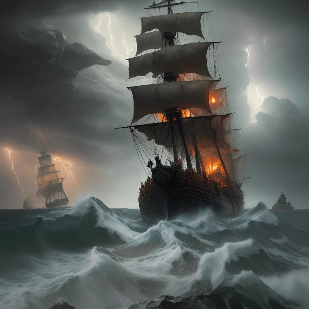 Prompt: oil painting with heavy impasto of a pirate ship, turbulent sea, thunderstorm, rain, cosmic horror painting, elegant intricate artstation concept art by craig mullins detailed, cinematic, hyper realism, high detail, octane render, 8k