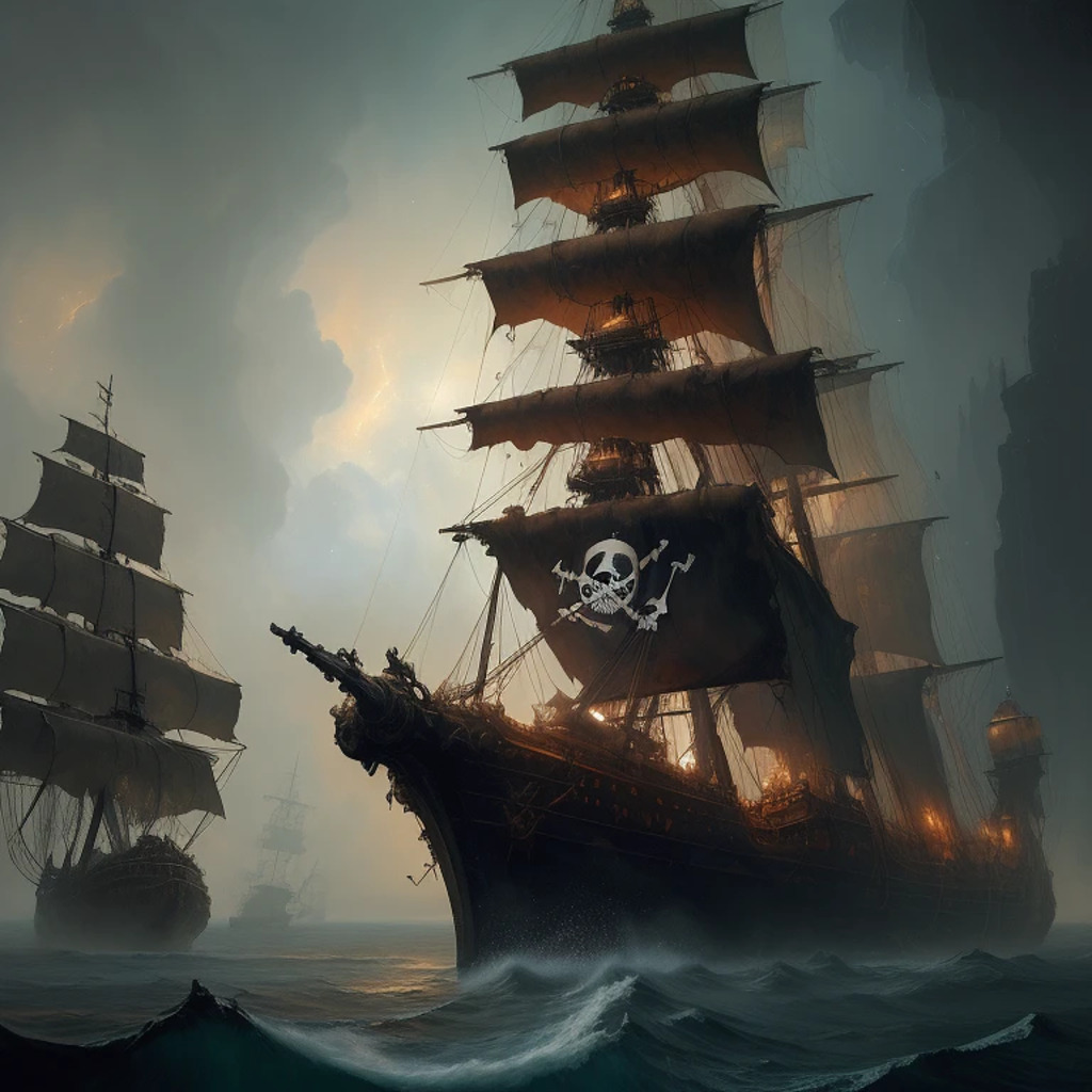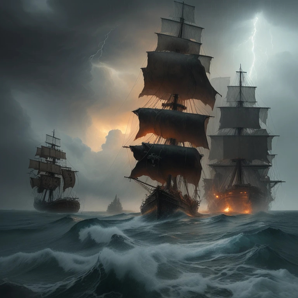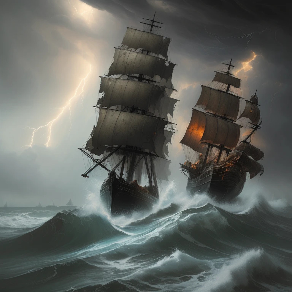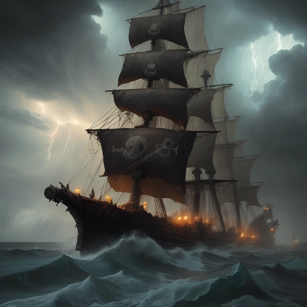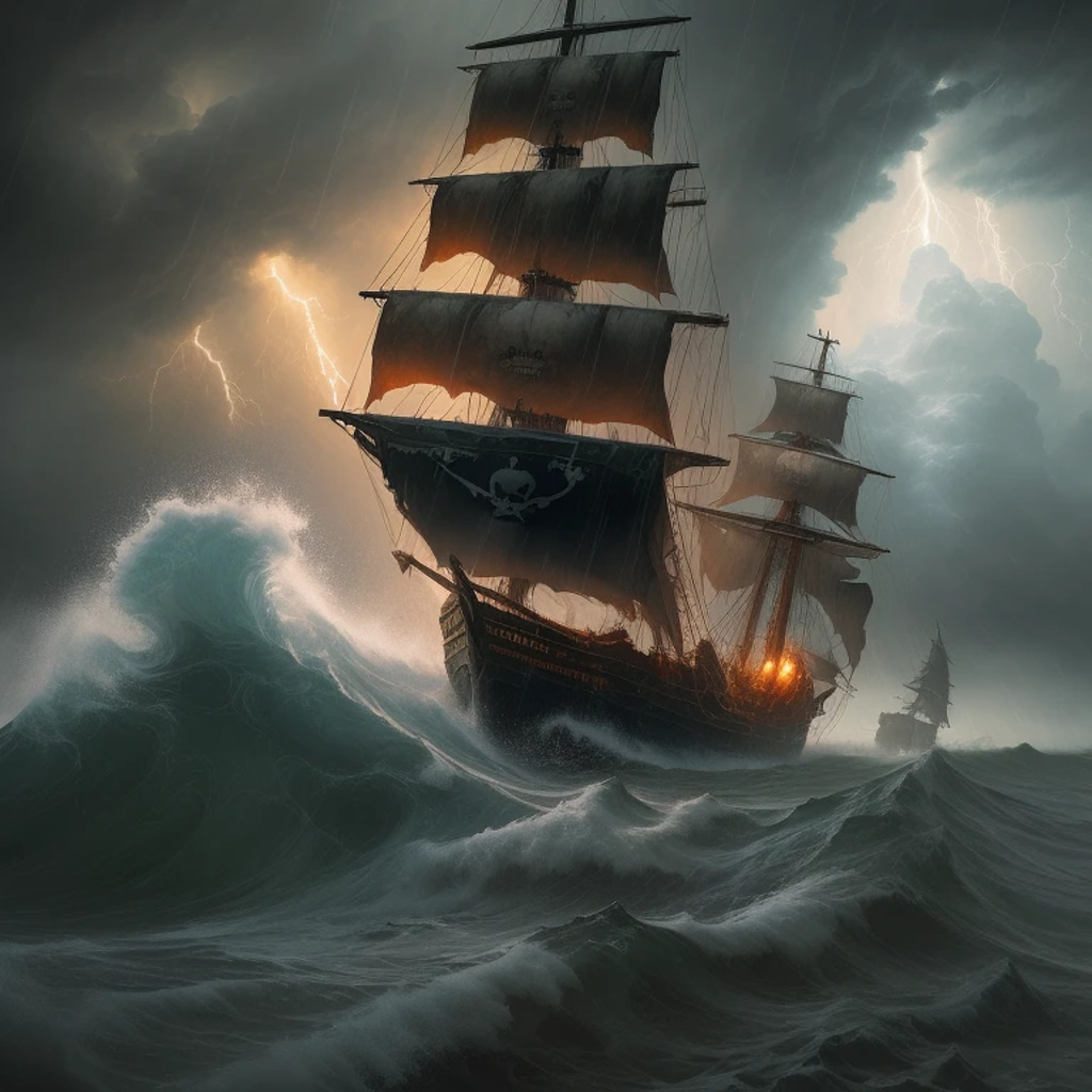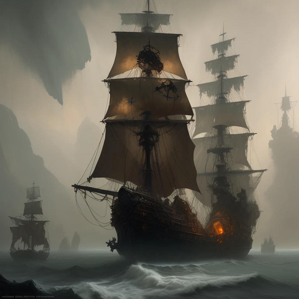 Prompt: oil painting with heavy impasto of a pirate ship, turbulent sea, thunderstorm, rain, cosmic horror painting, elegant intricate artstation concept art by craig mullins detailed, cinematic, hyper realism, high detail, octane render, 8k