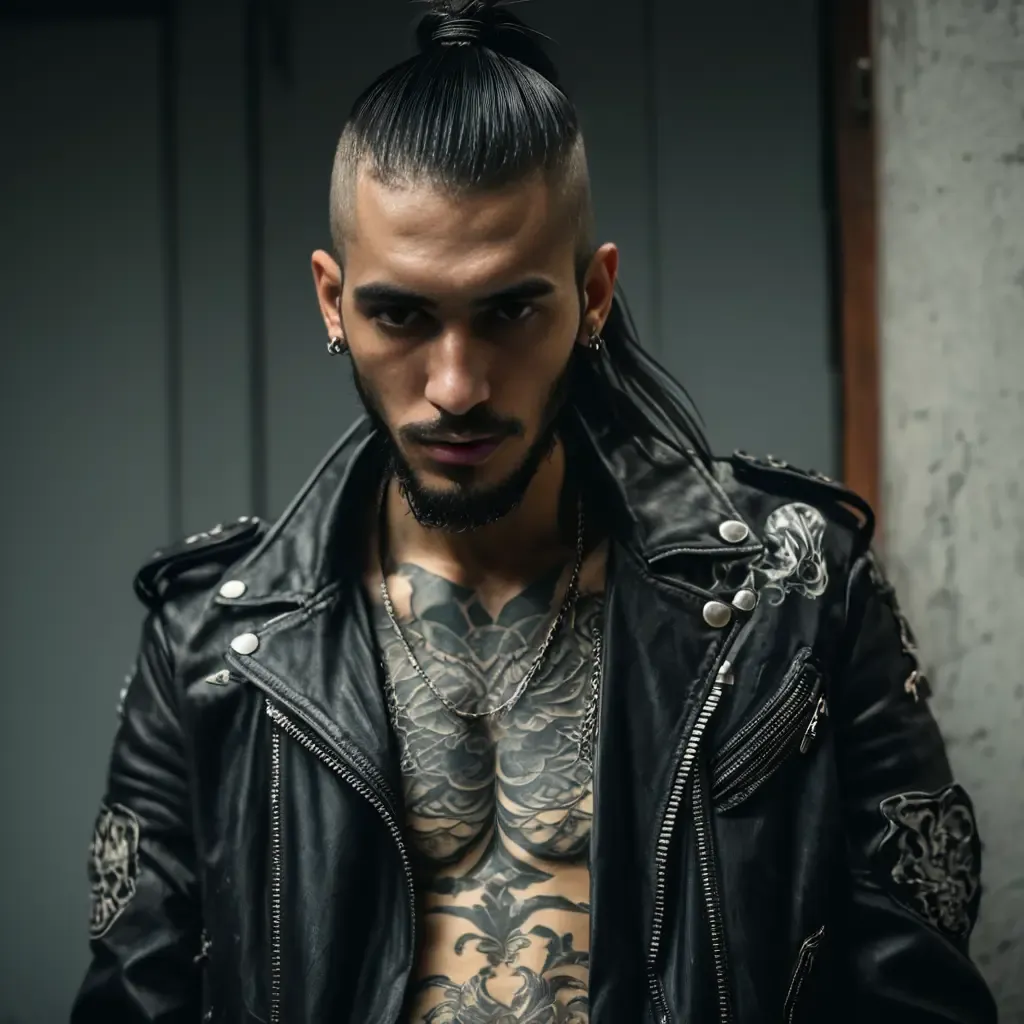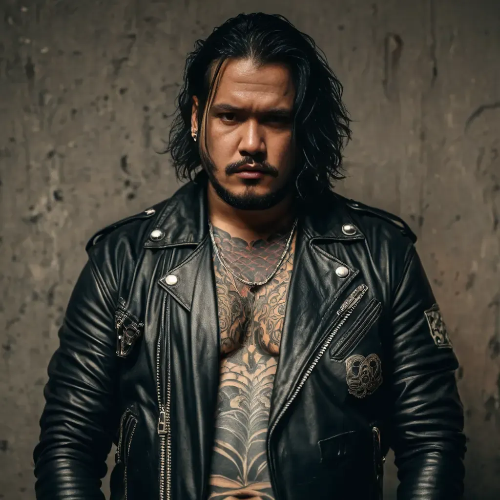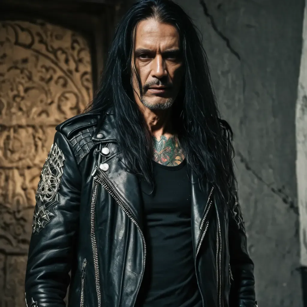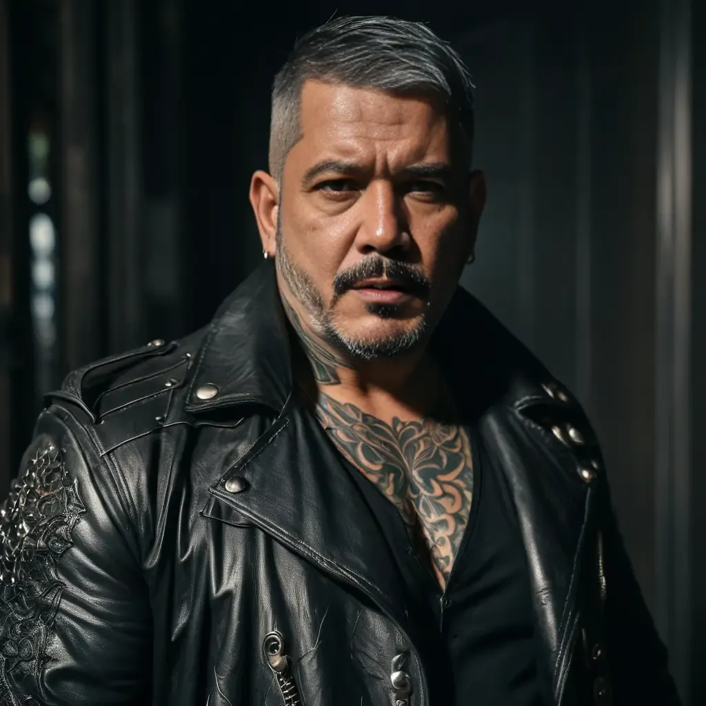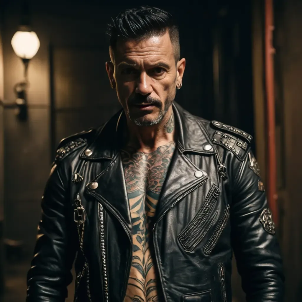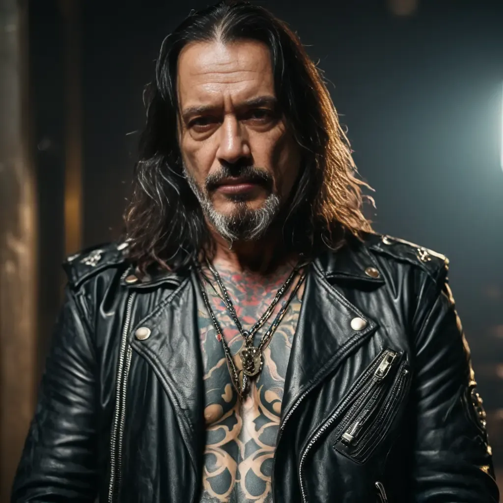 He is just wearing an old {biker jacket|t-shirt|open leather coat}.