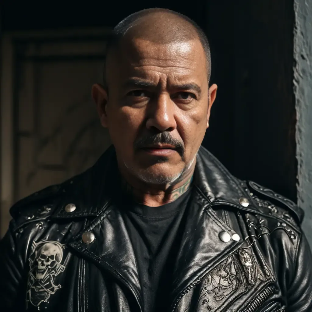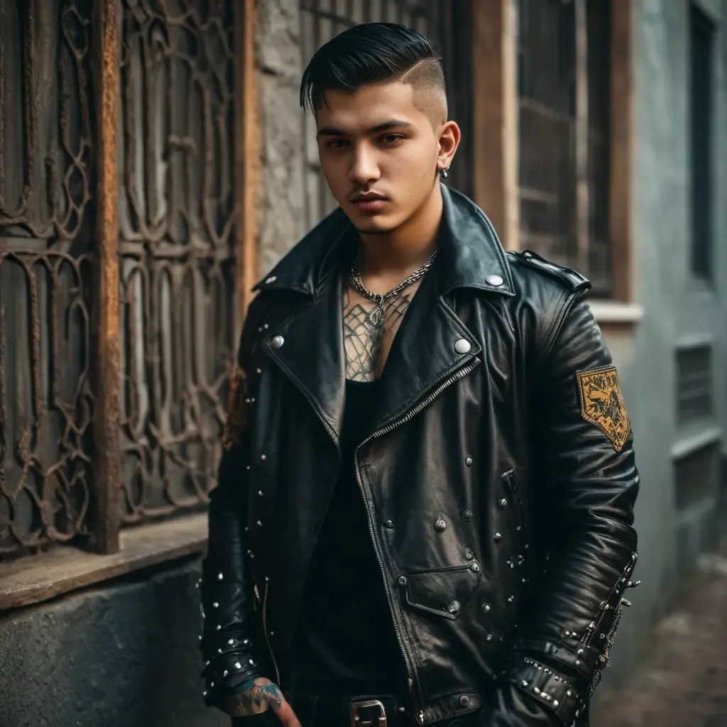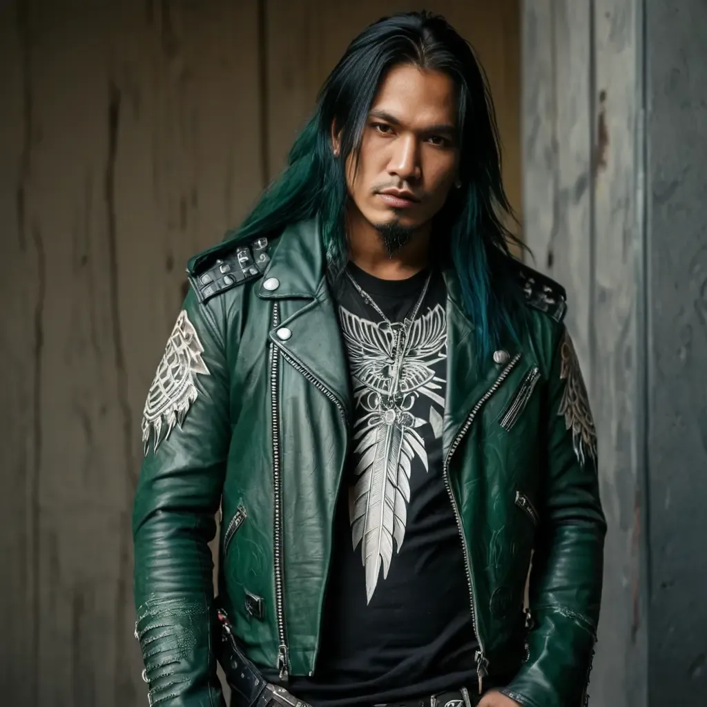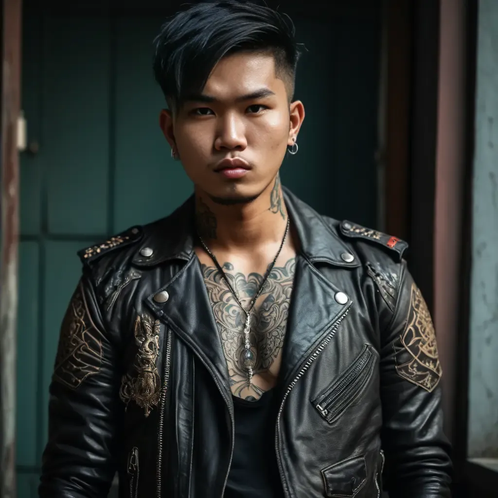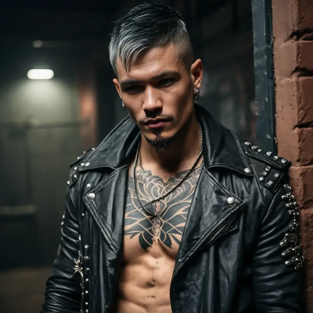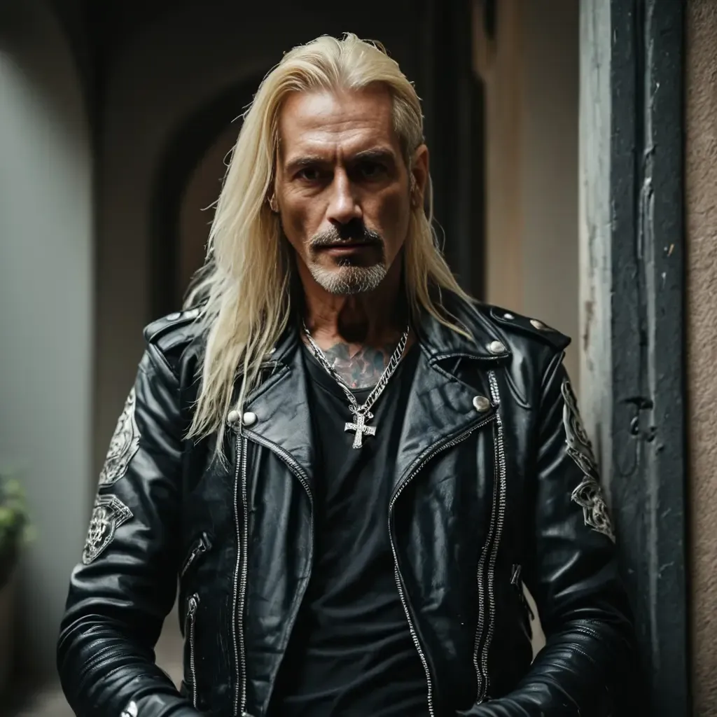 He is just wearing an old {biker jacket|t-shirt|open leather coat}.