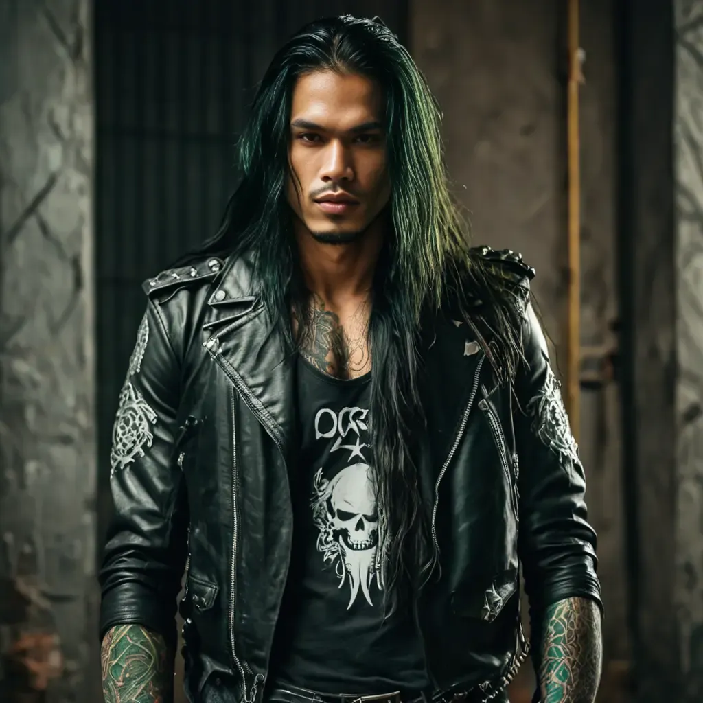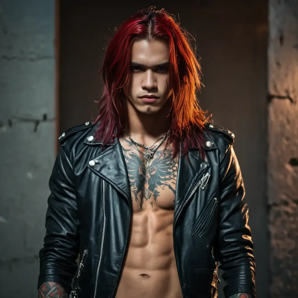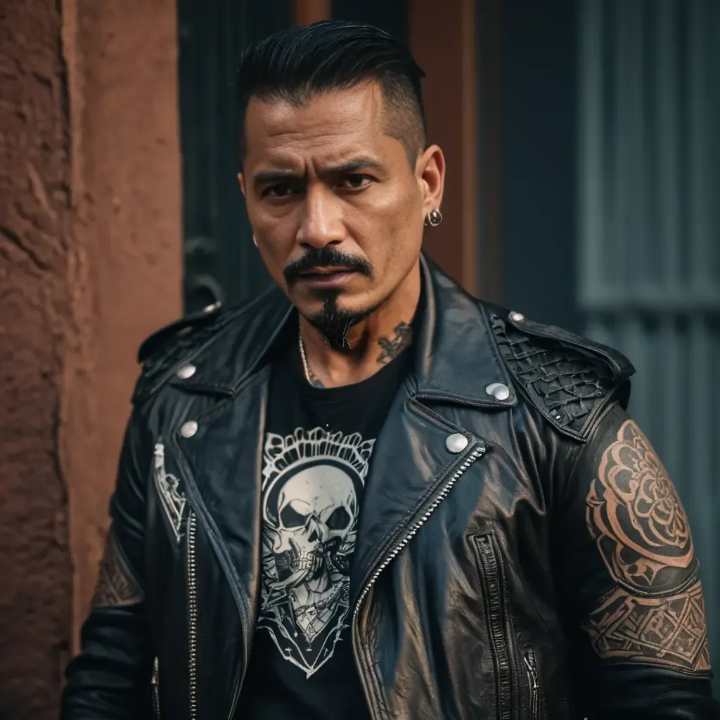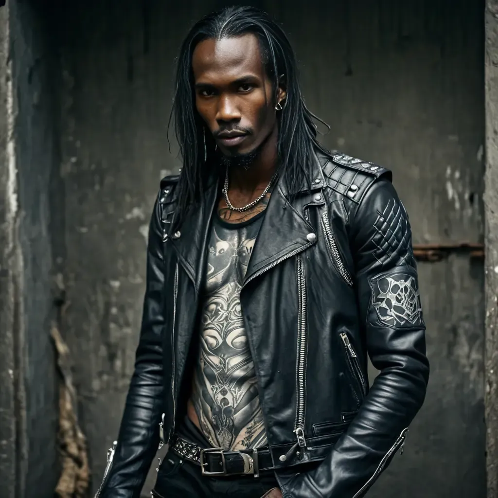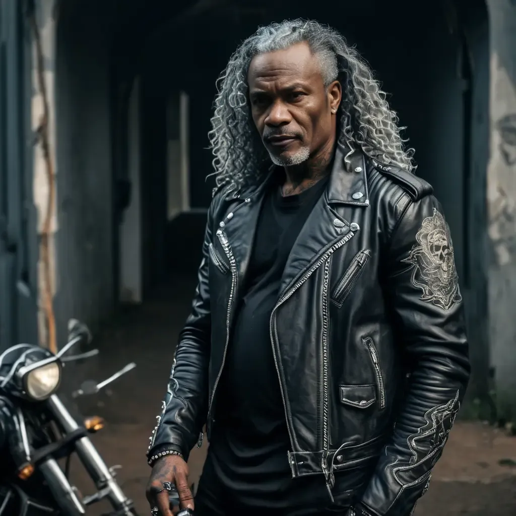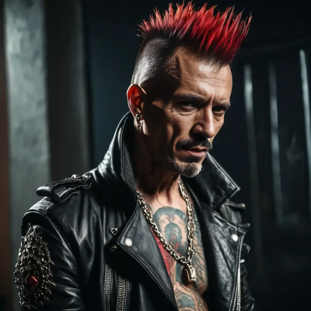 He is just wearing an old {biker jacket|t-shirt|open leather coat}.