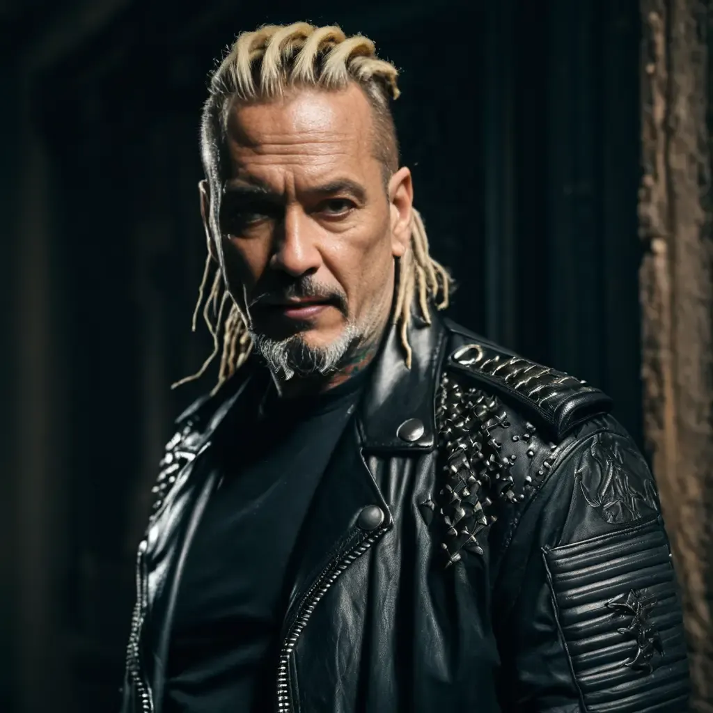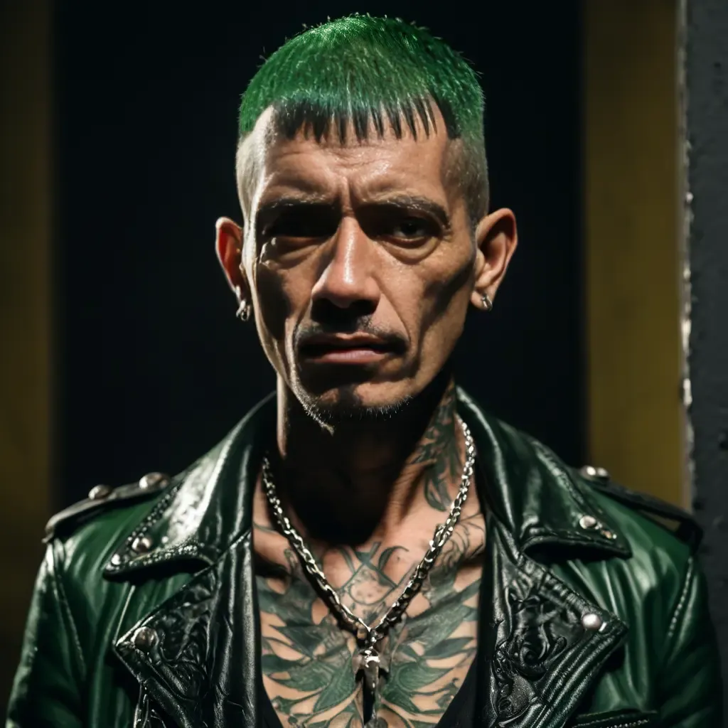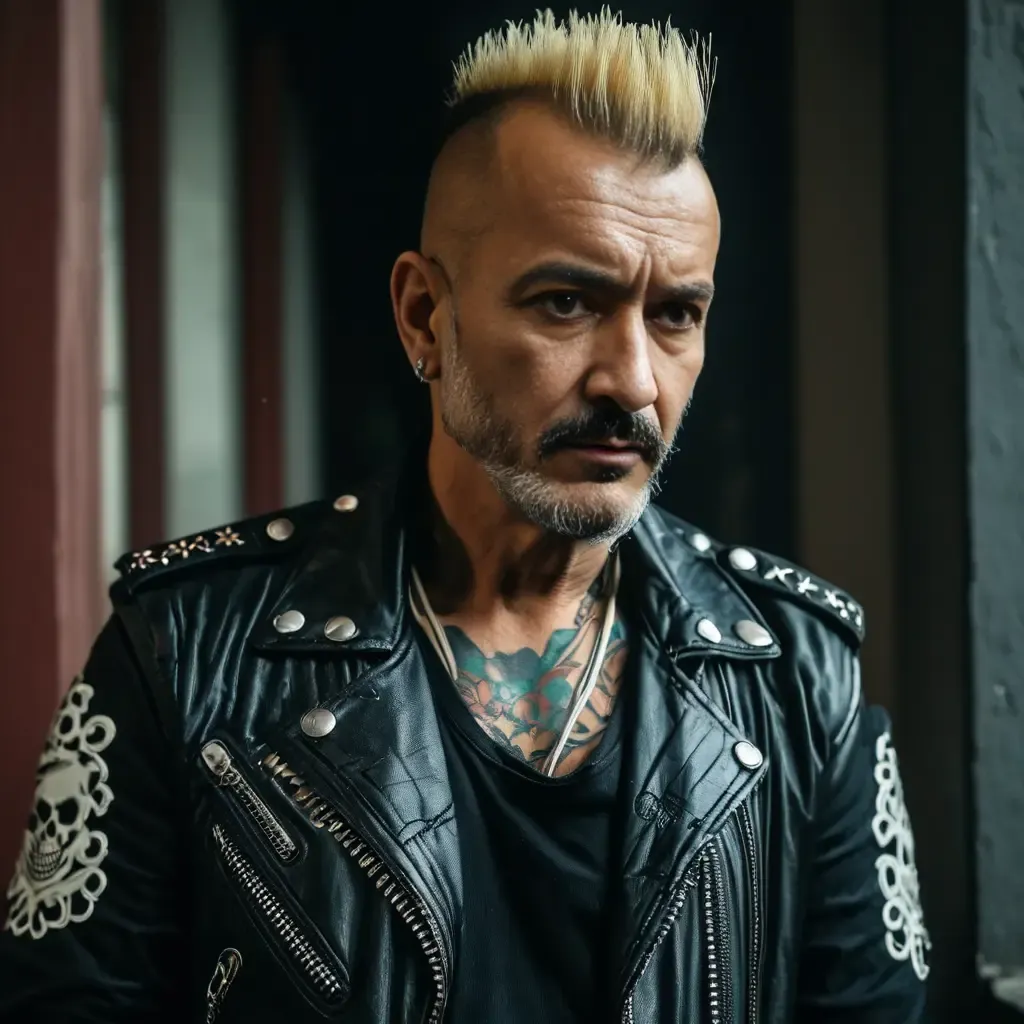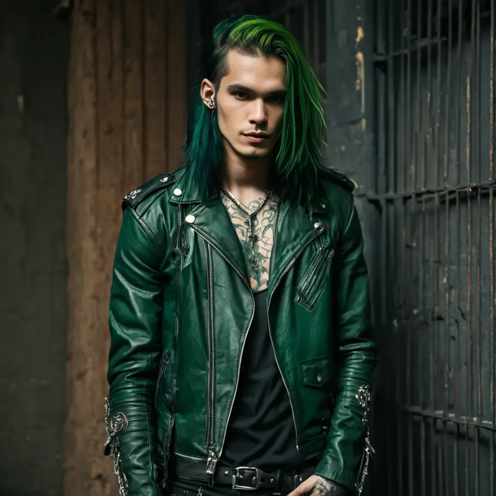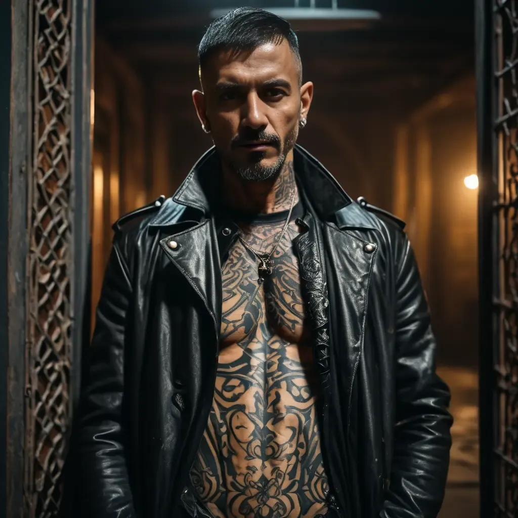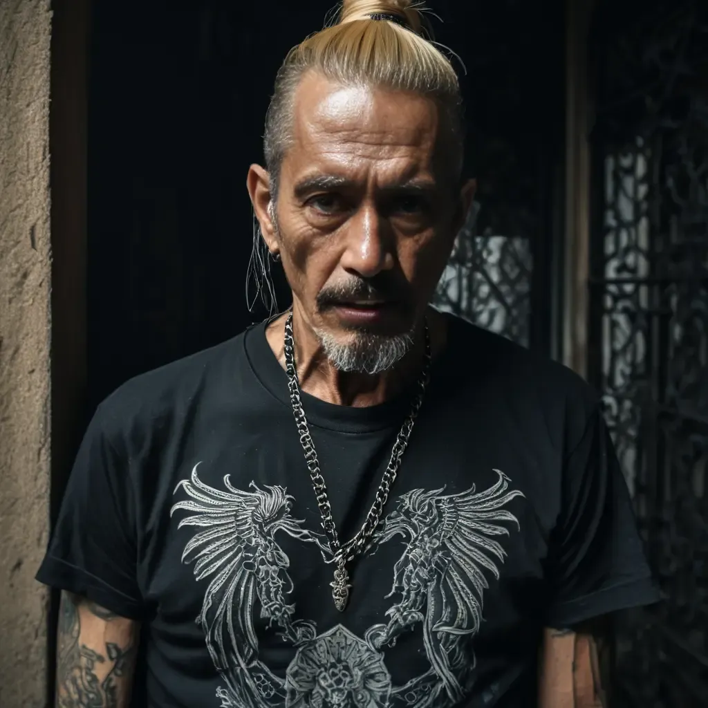 He is just wearing an old {biker jacket|t-shirt|open leather coat}.
