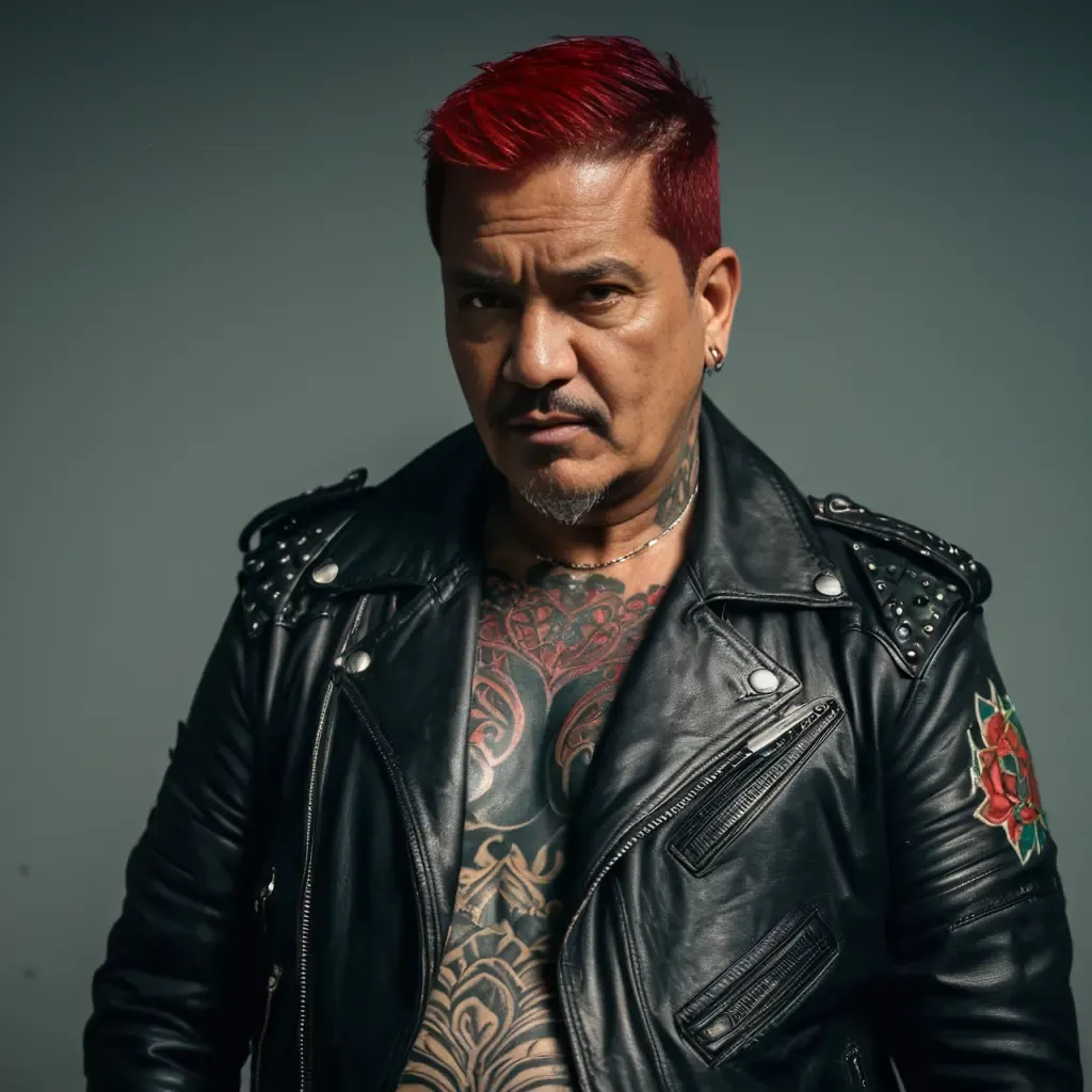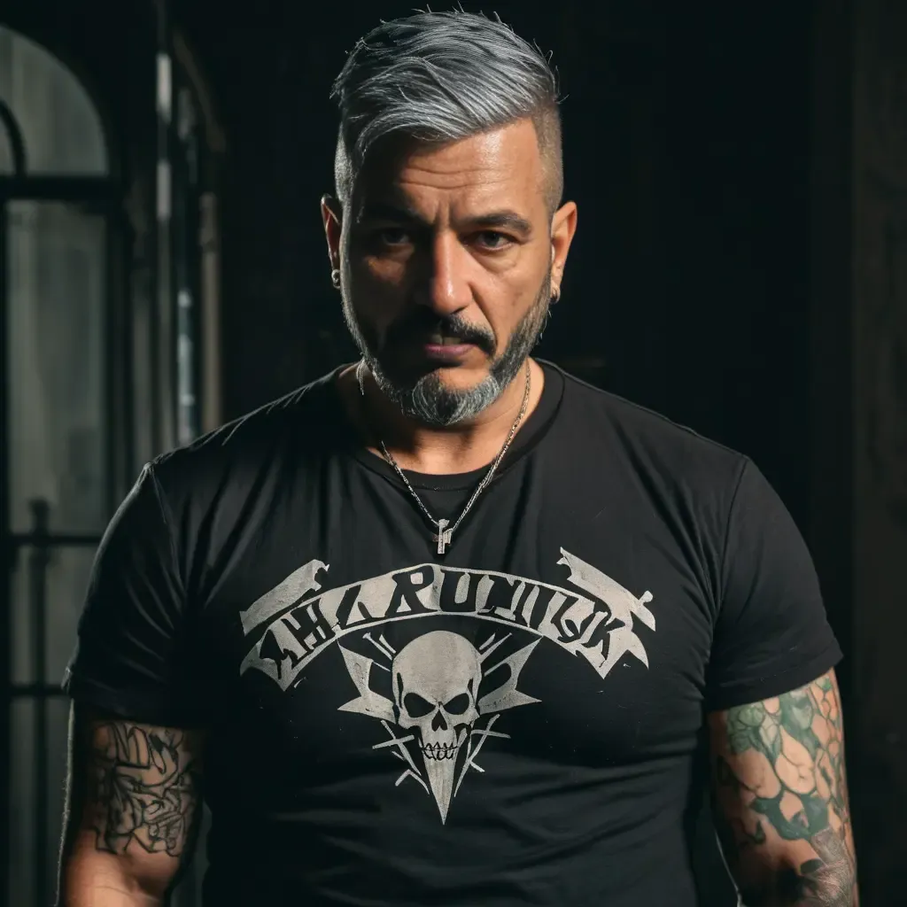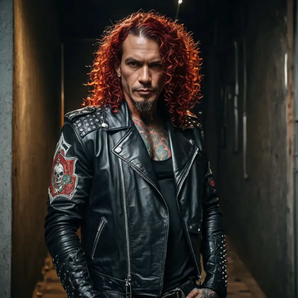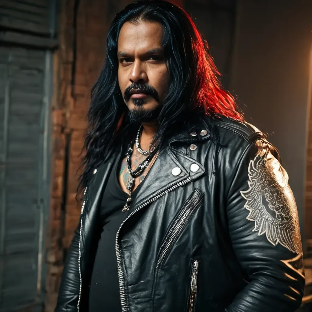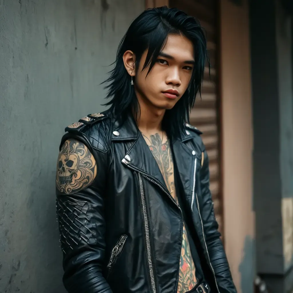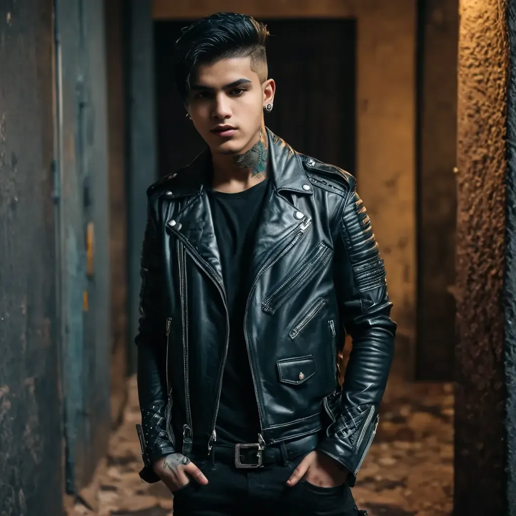 He is just wearing an old {biker jacket|t-shirt|open leather coat}.