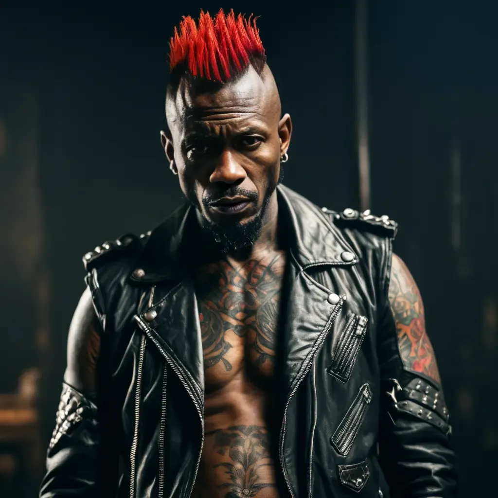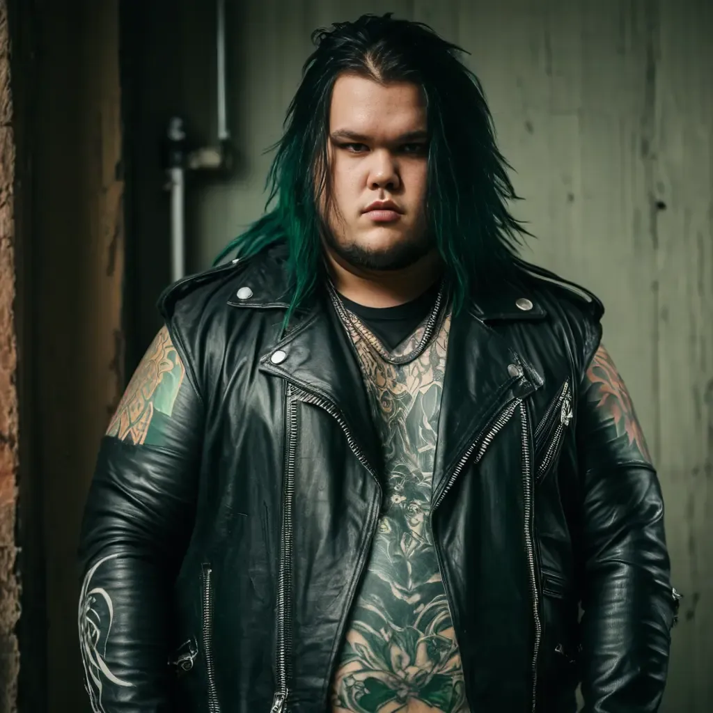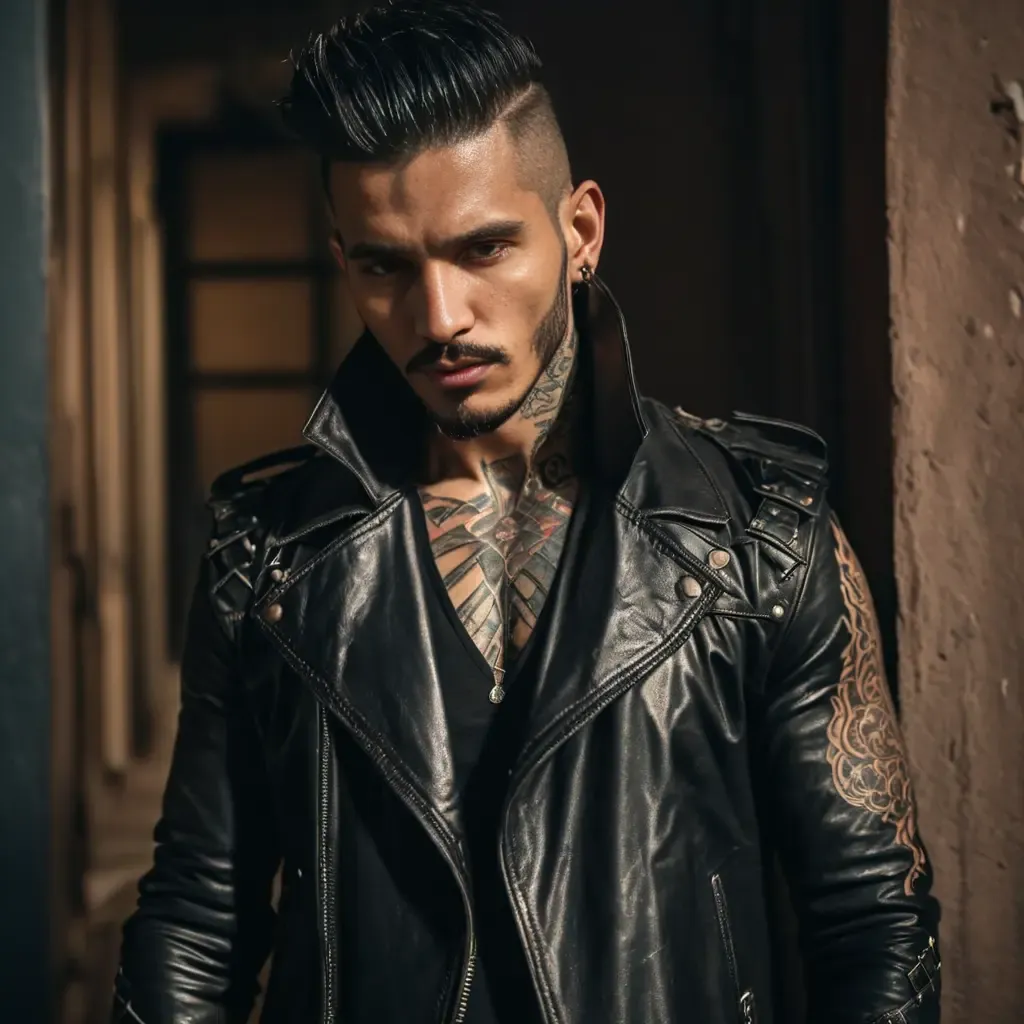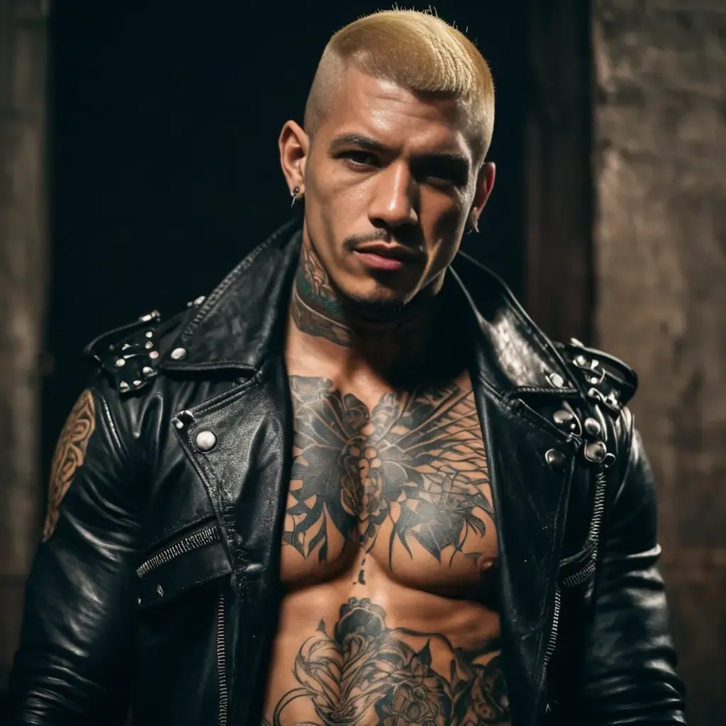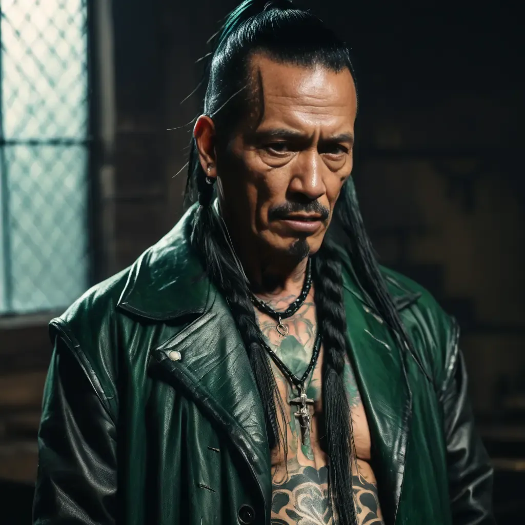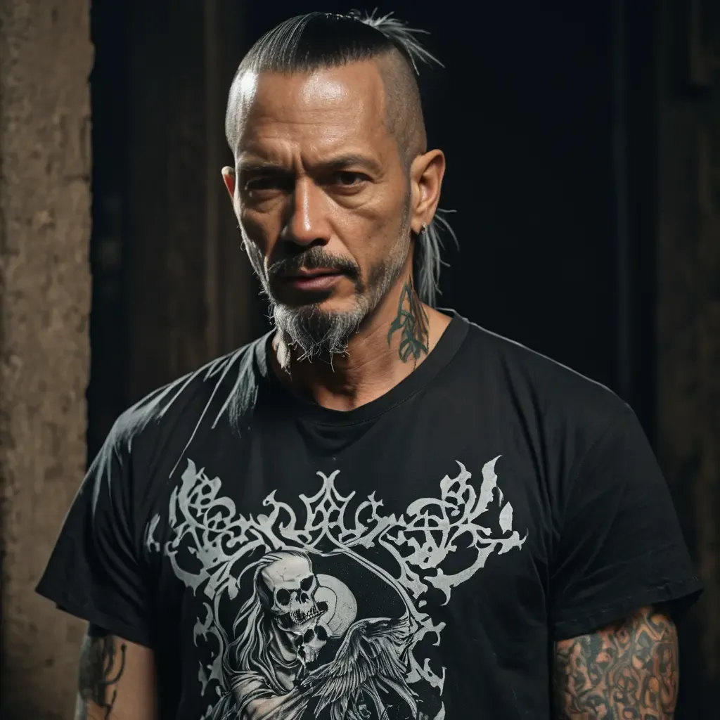 He is just wearing an old {biker jacket|t-shirt|open leather coat}.