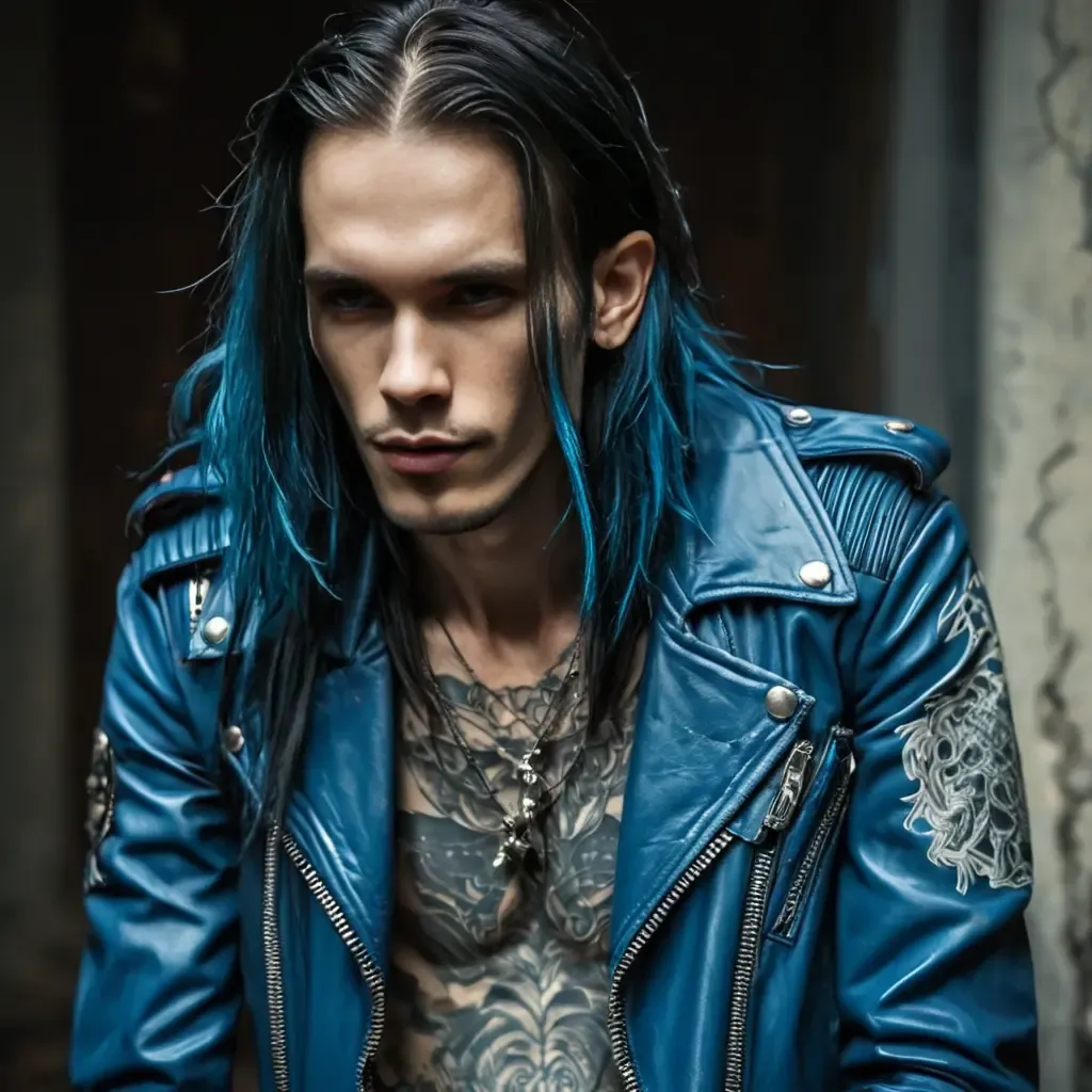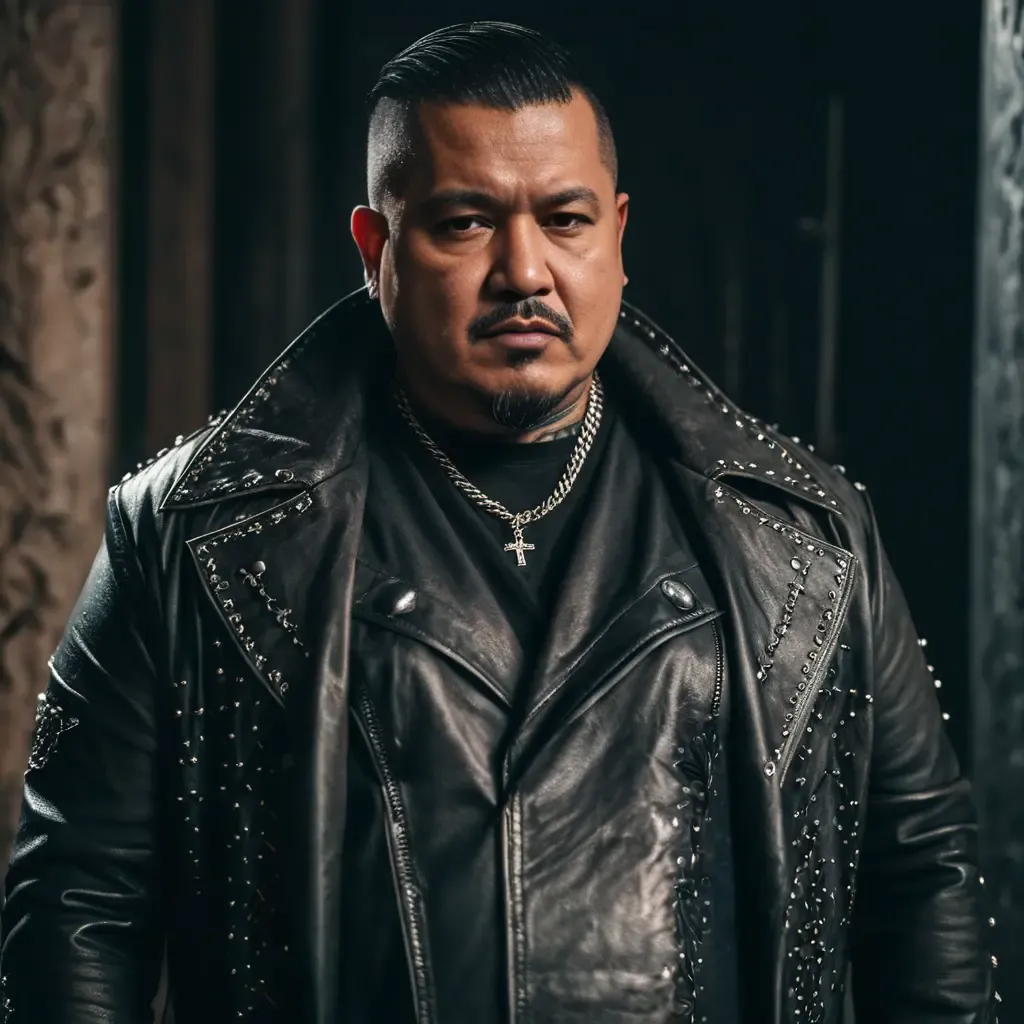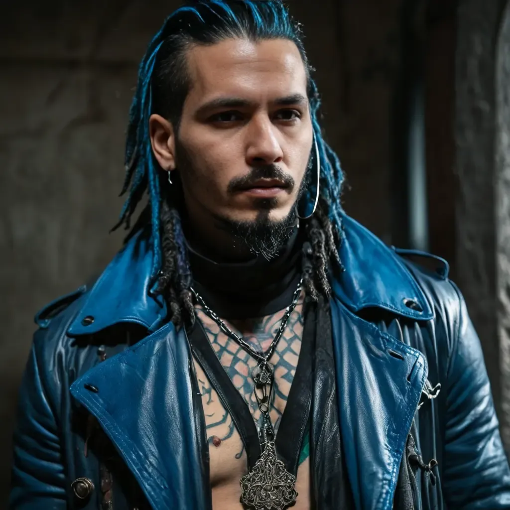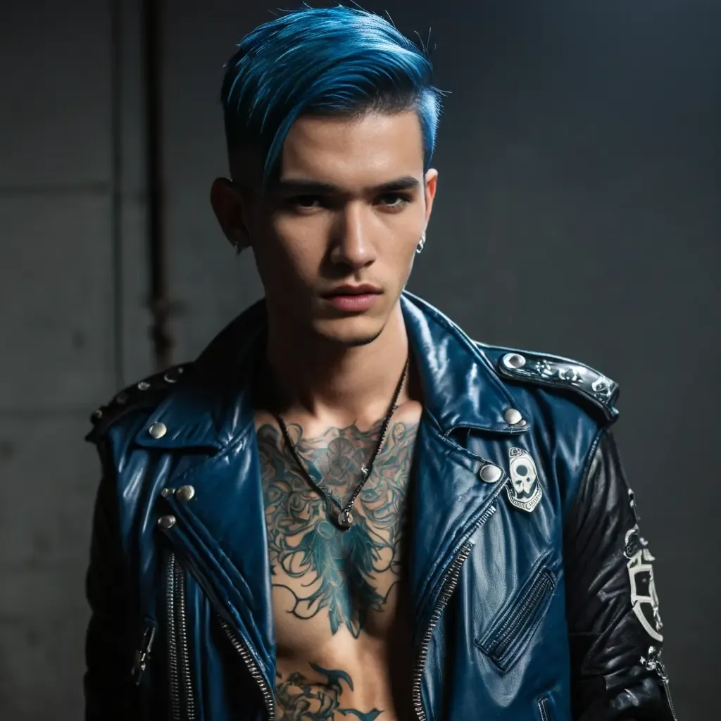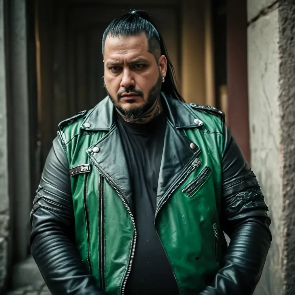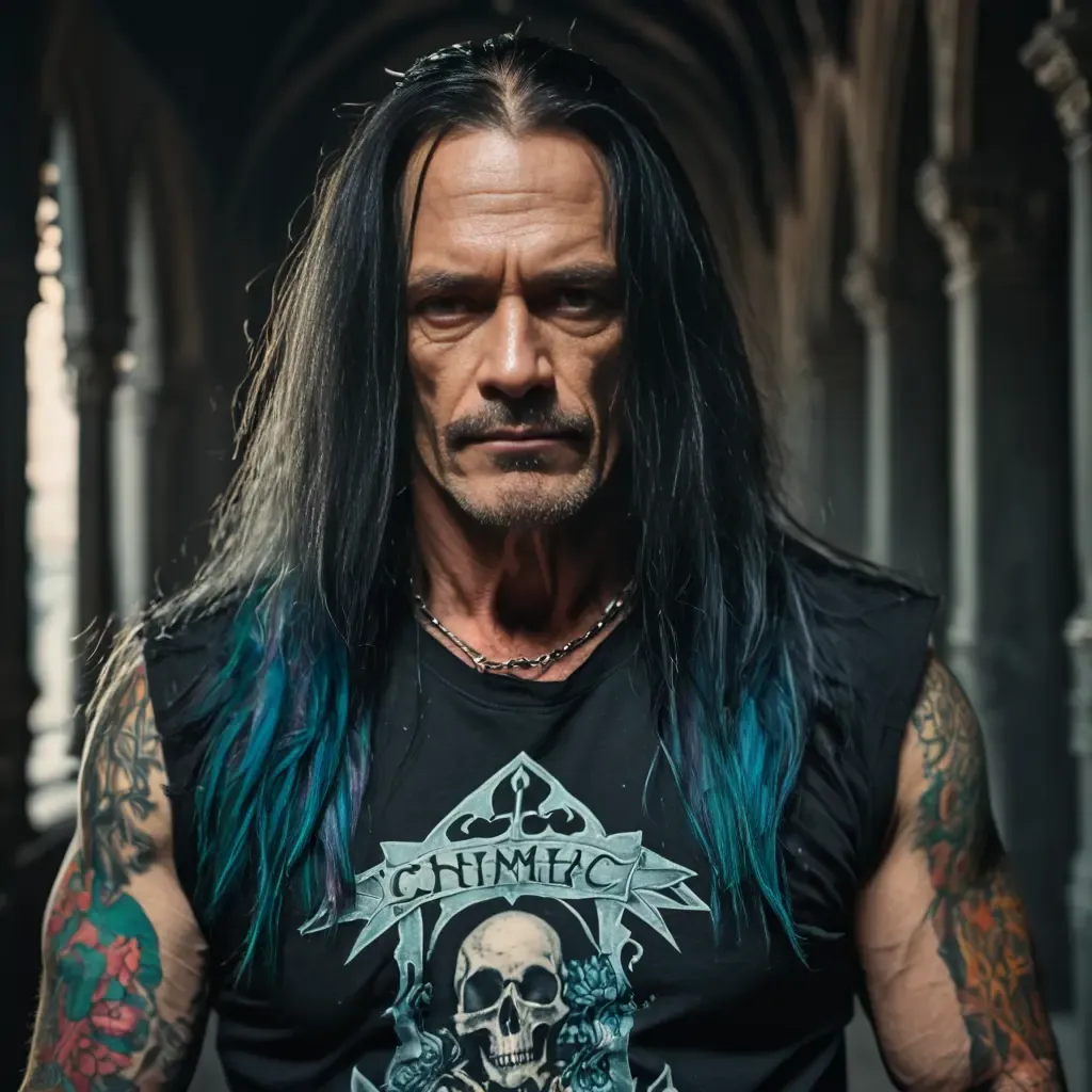 He is just wearing an old {biker jacket|t-shirt|open leather coat}.