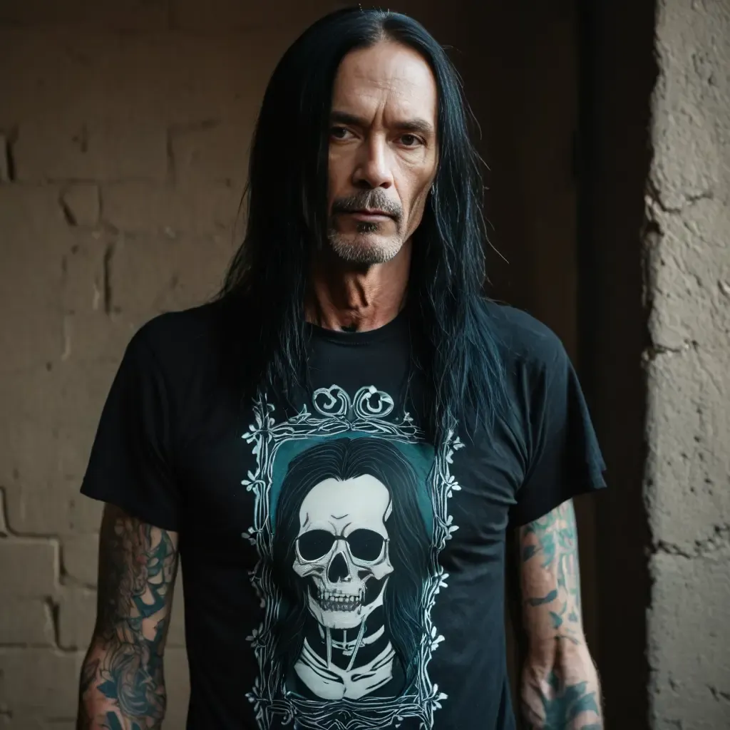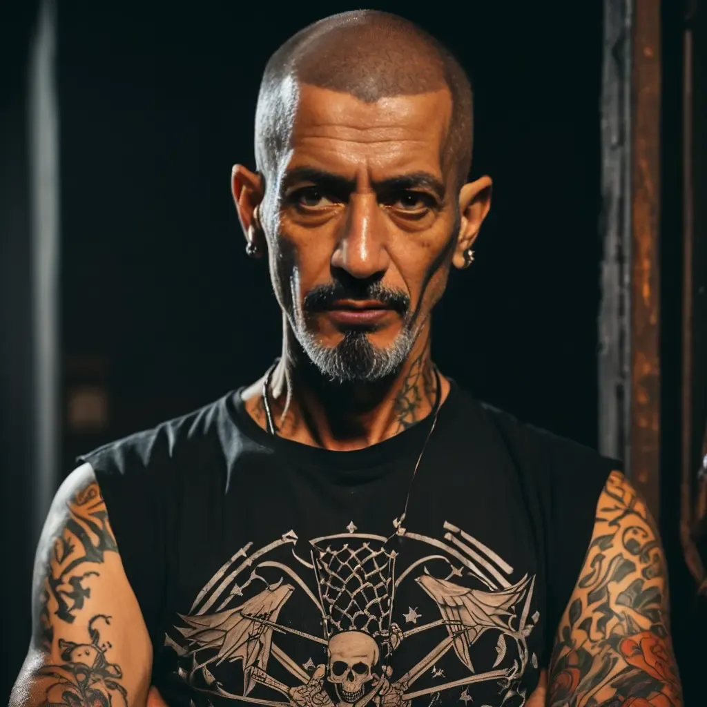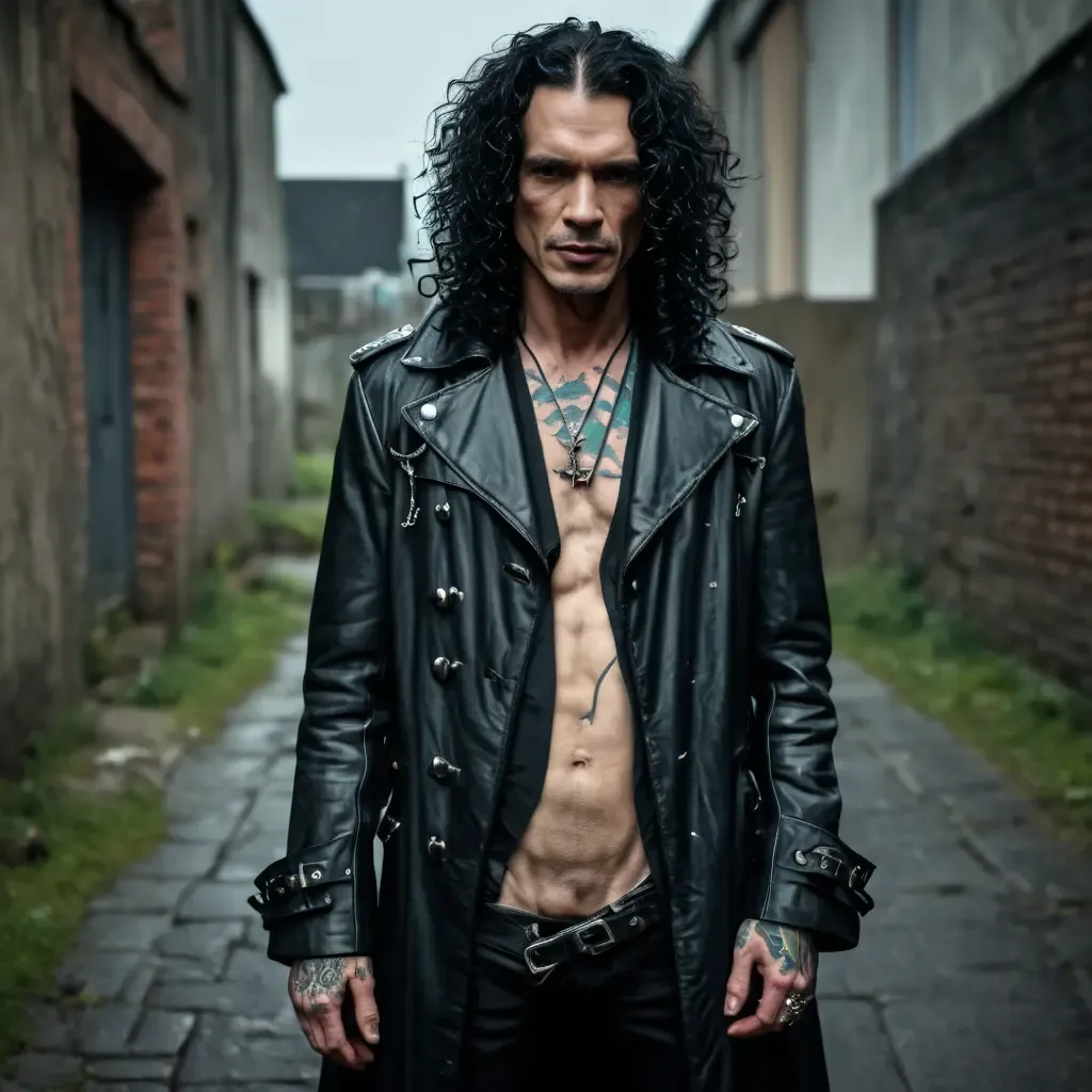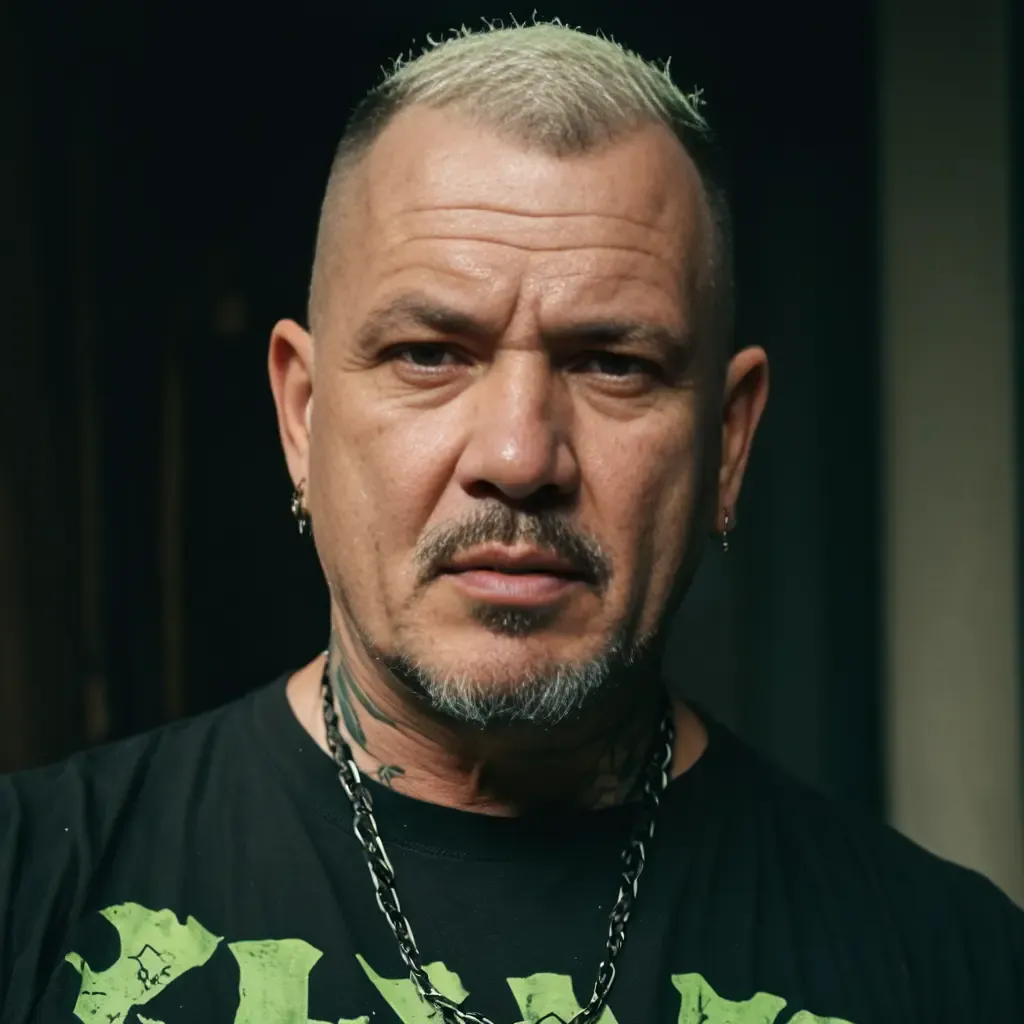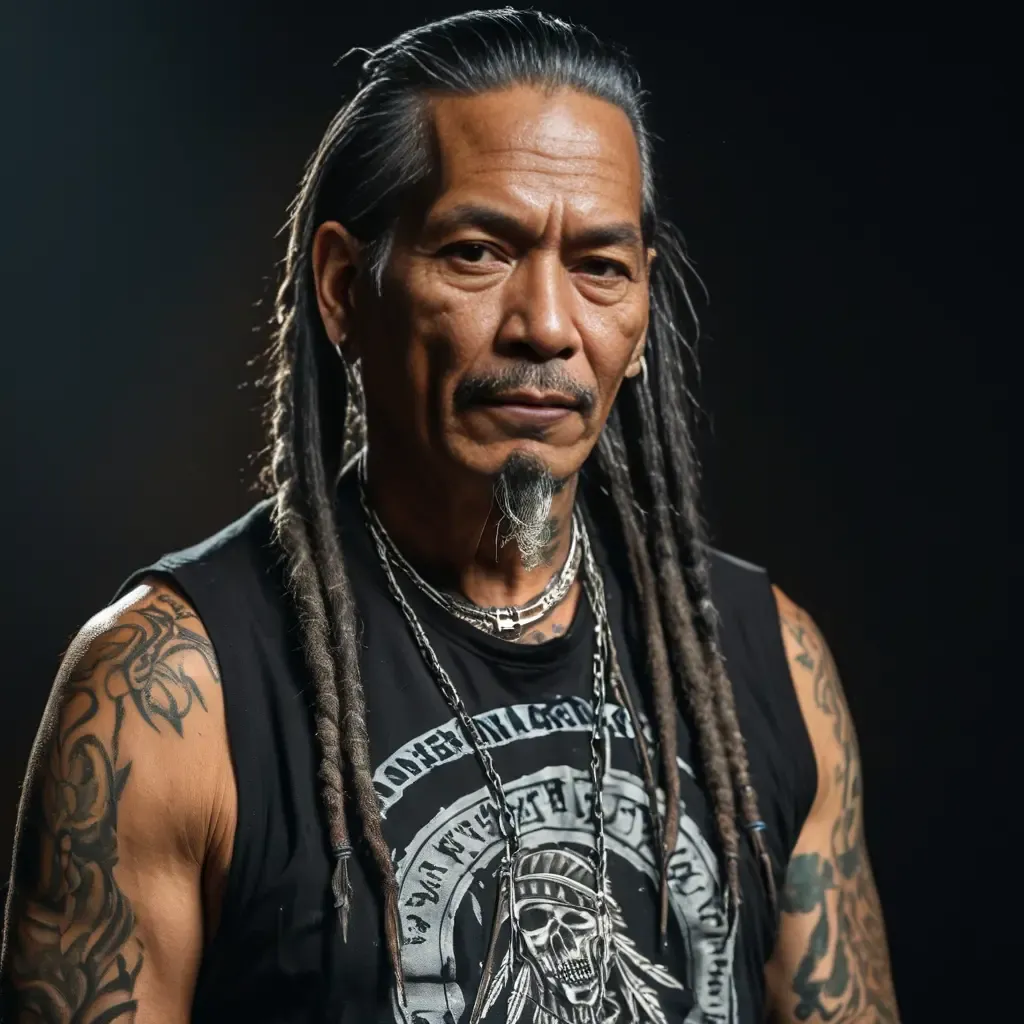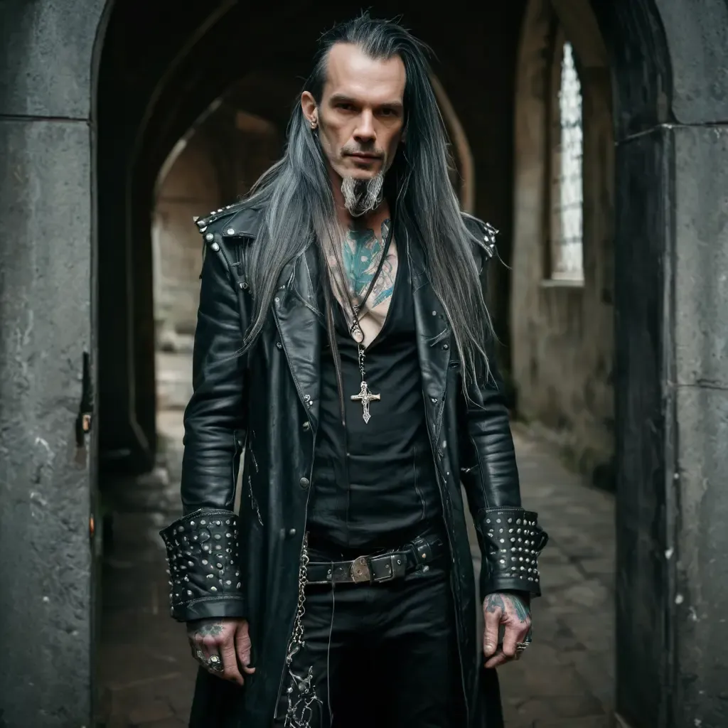 He is just wearing an old {biker jacket|t-shirt|open leather coat}.
