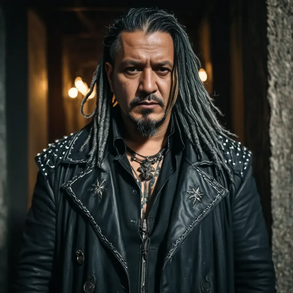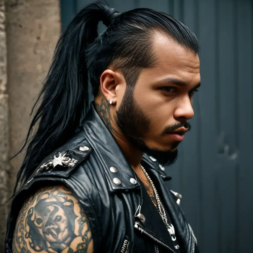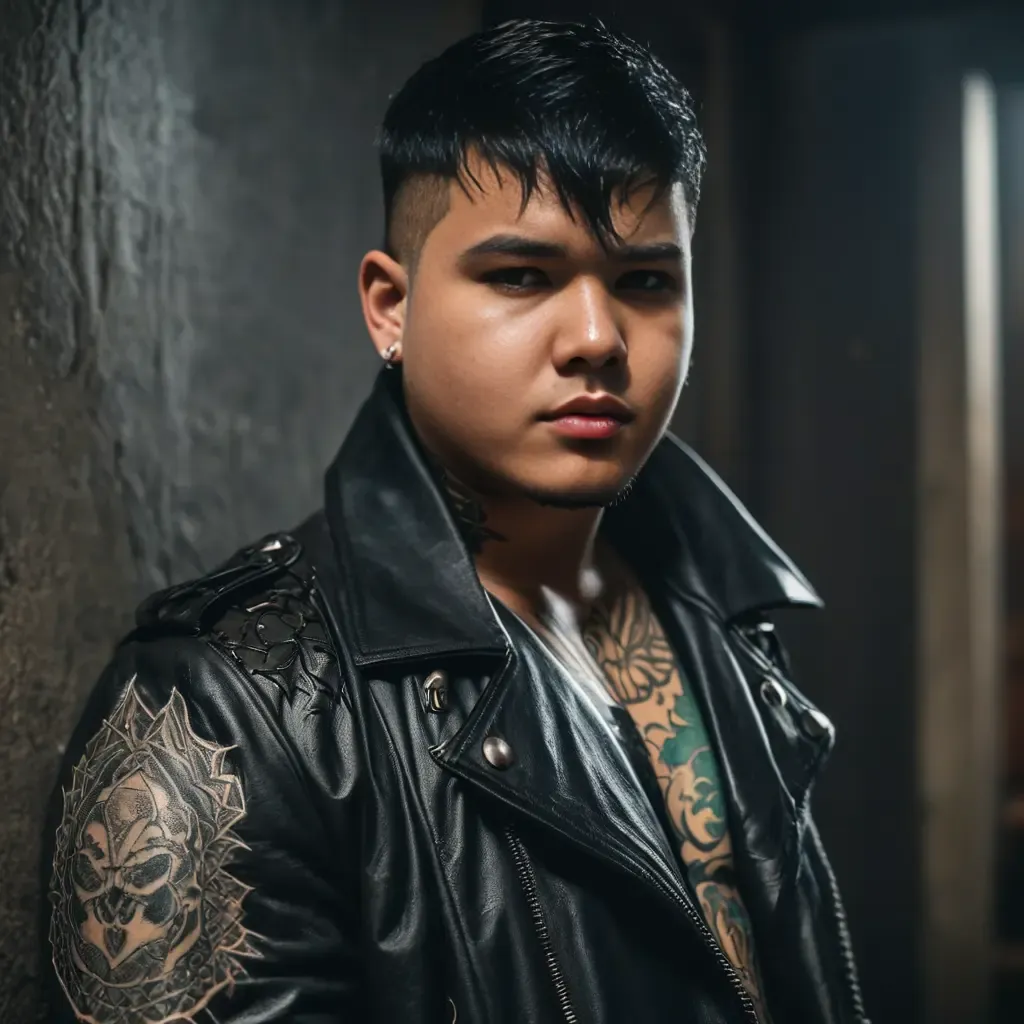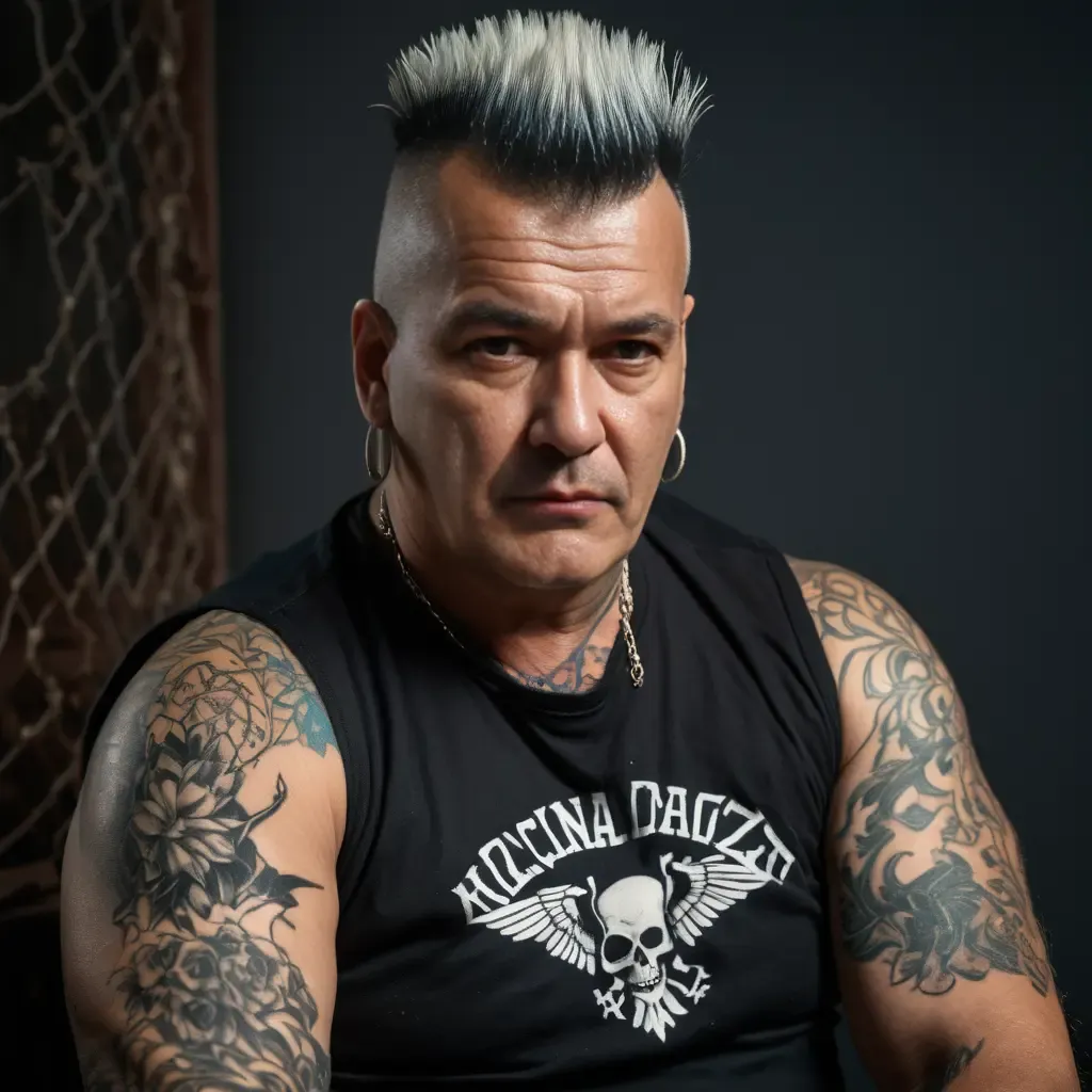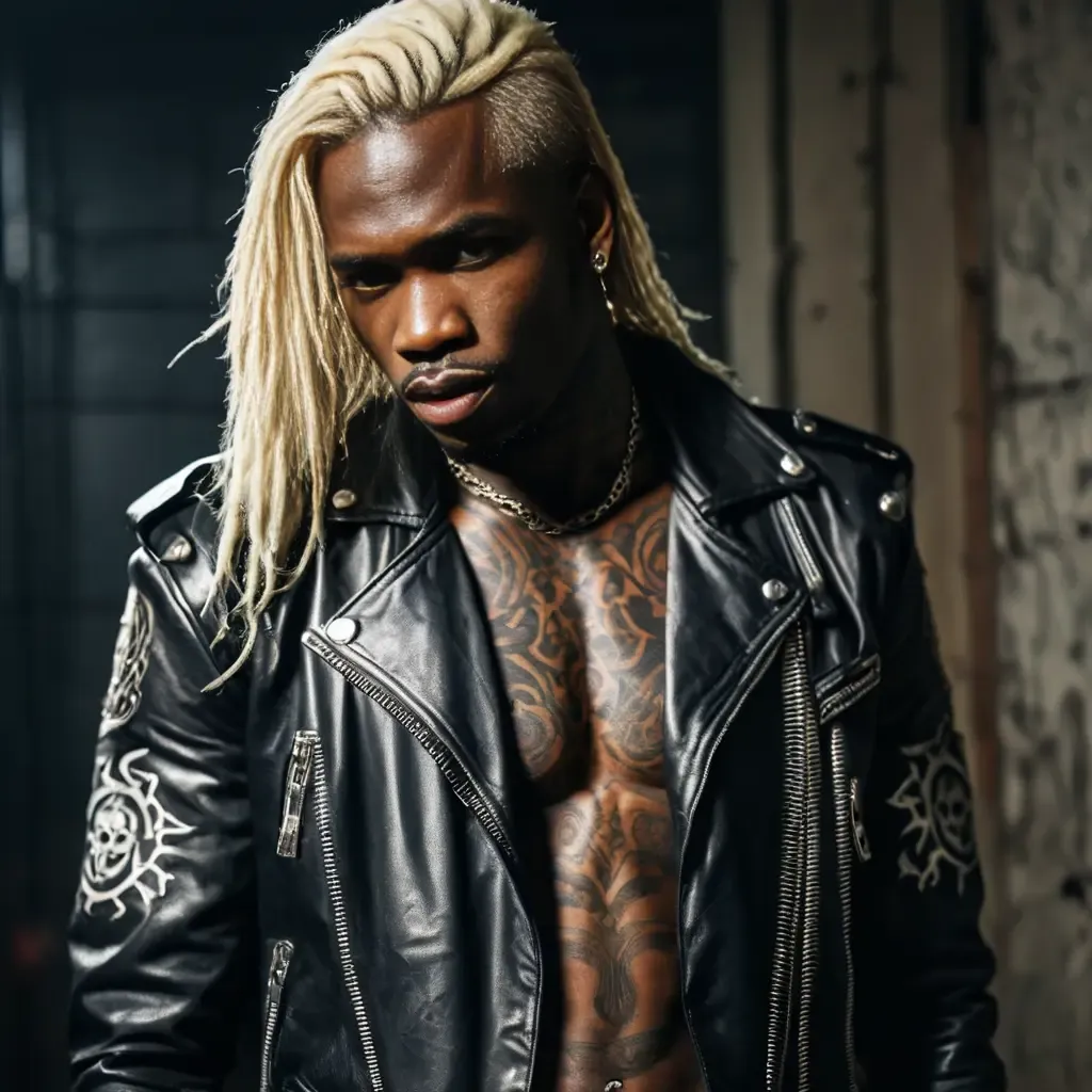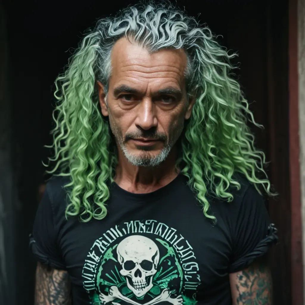 He is just wearing an old {biker jacket|t-shirt|open leather coat}.