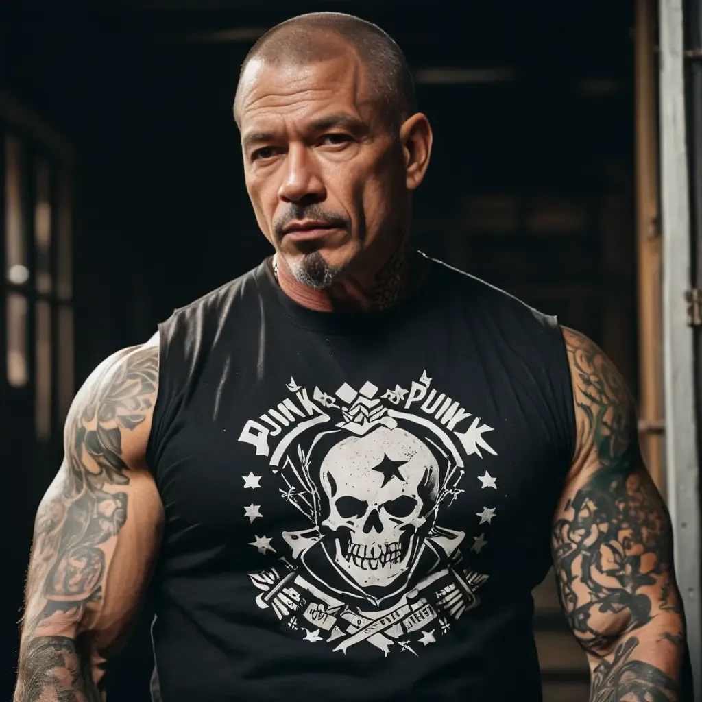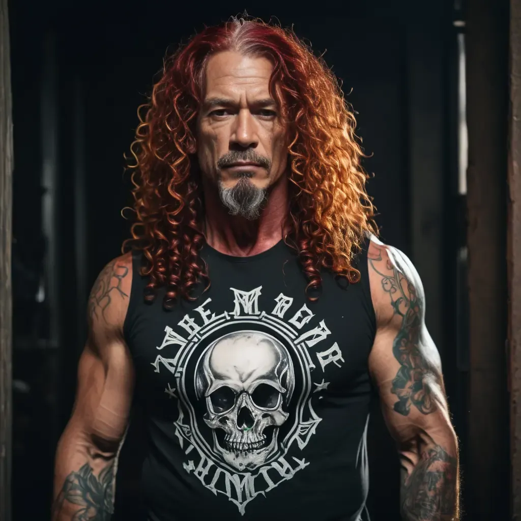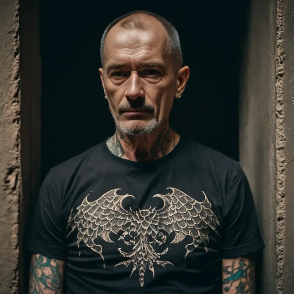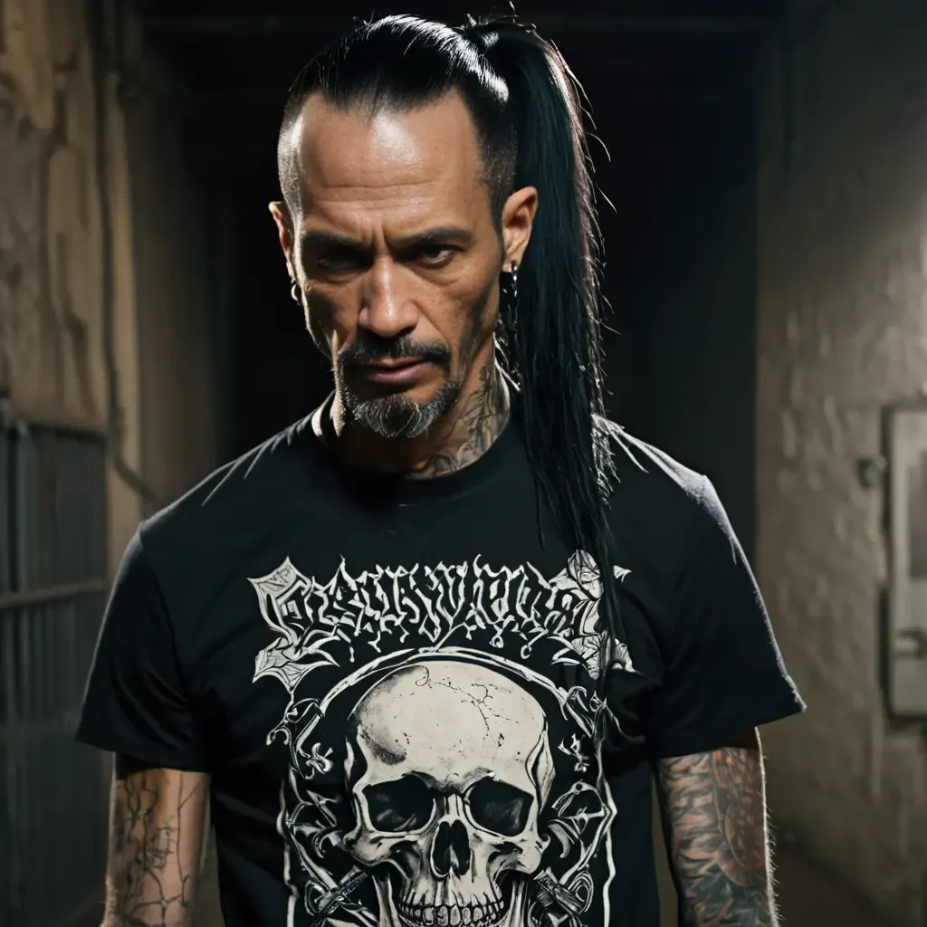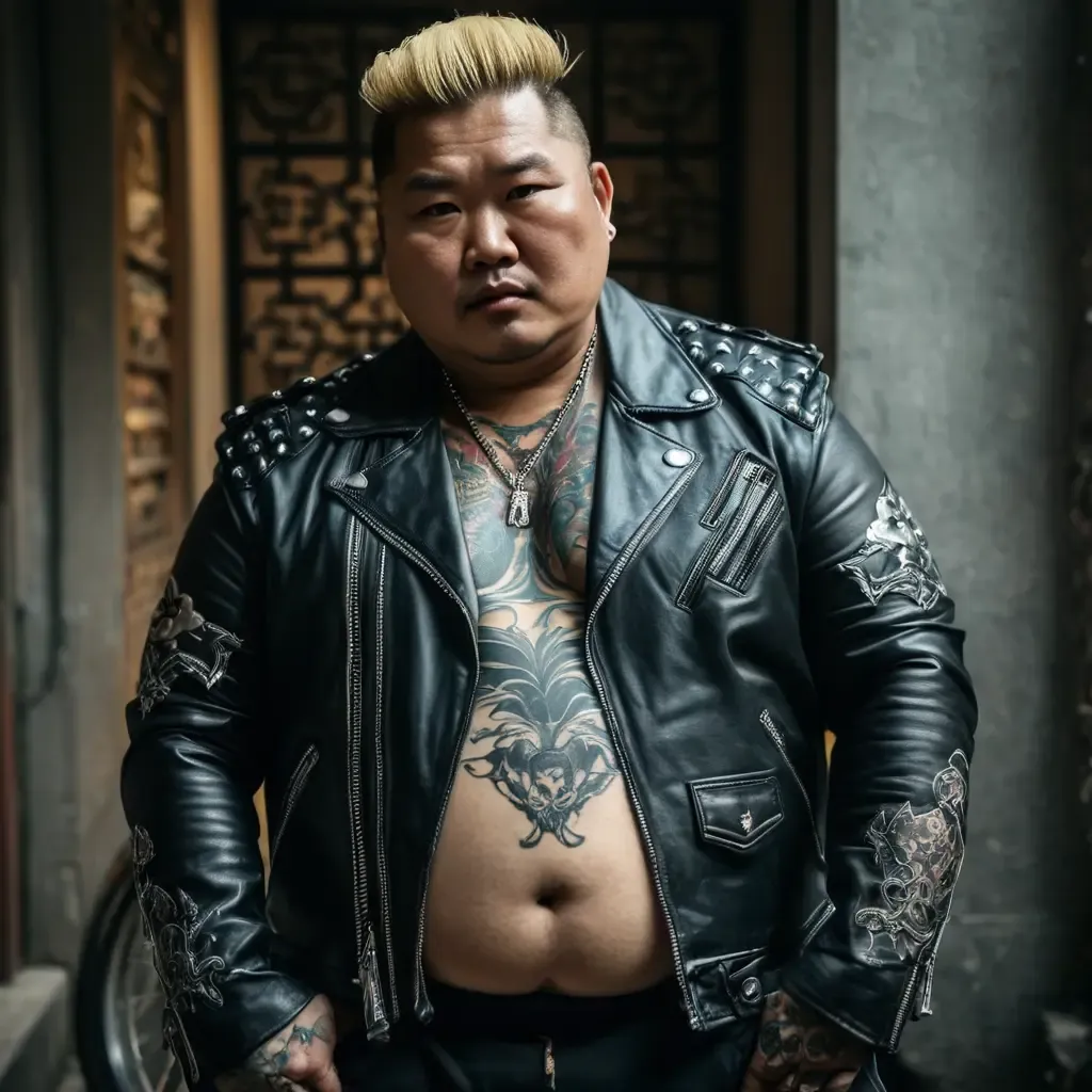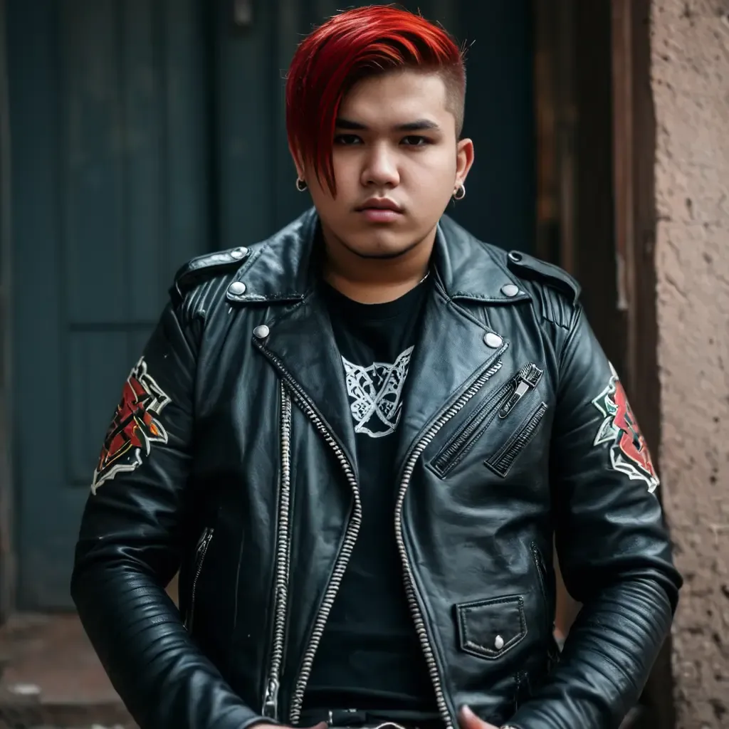 He is just wearing an old {biker jacket|t-shirt|open leather coat}.