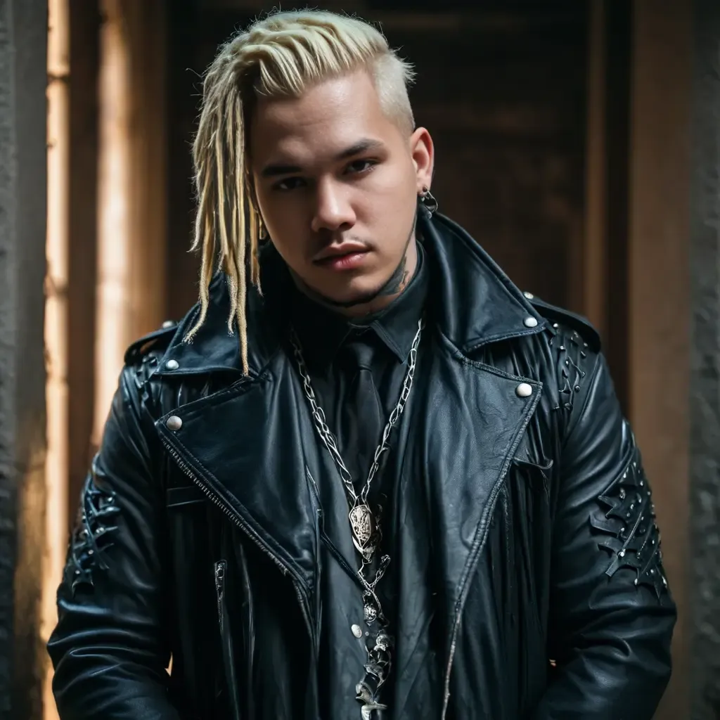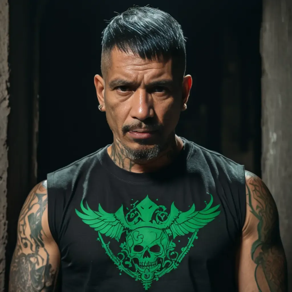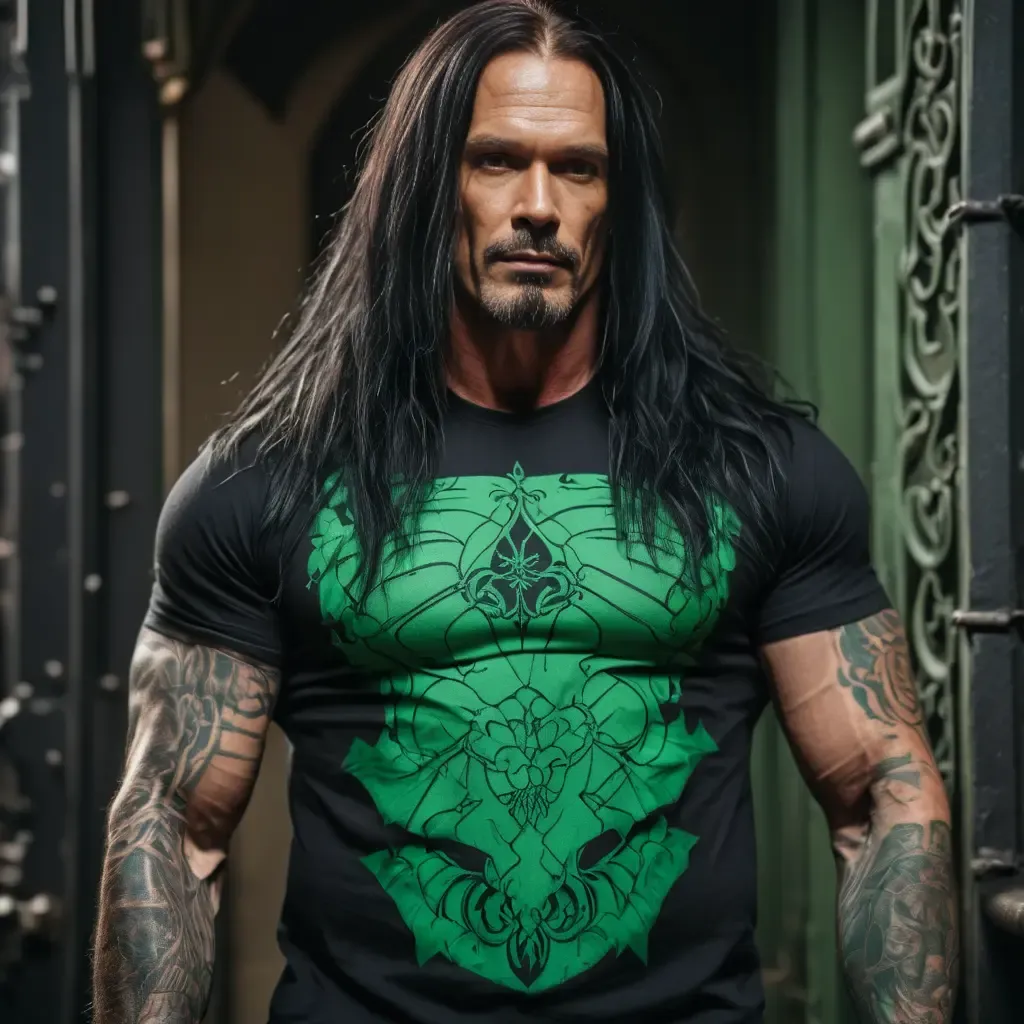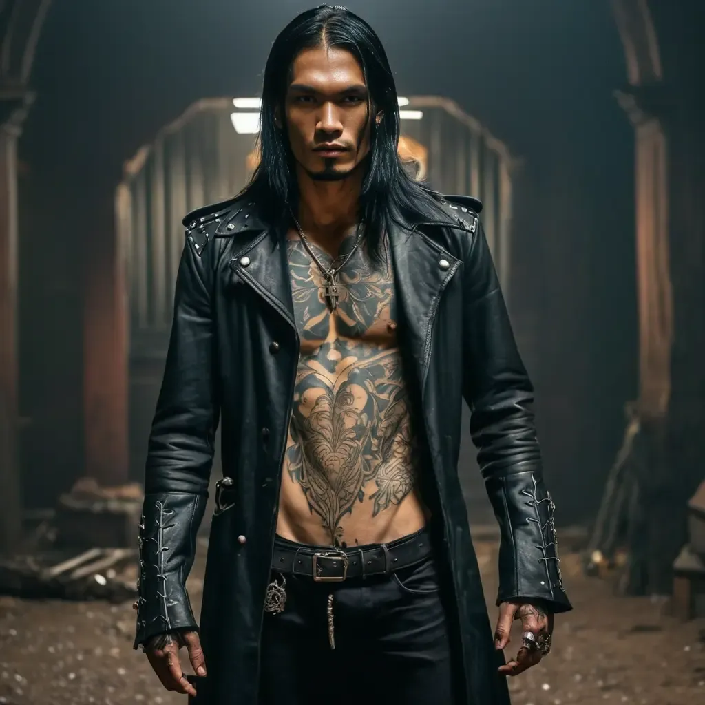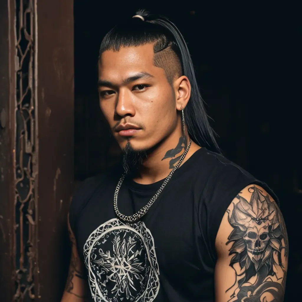 He is just wearing an old {biker jacket|t-shirt|open leather coat}.