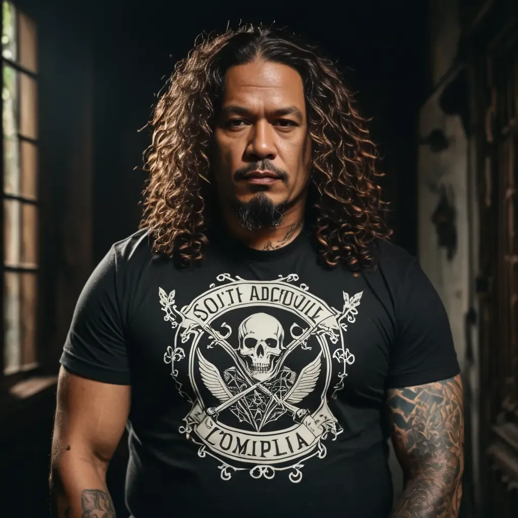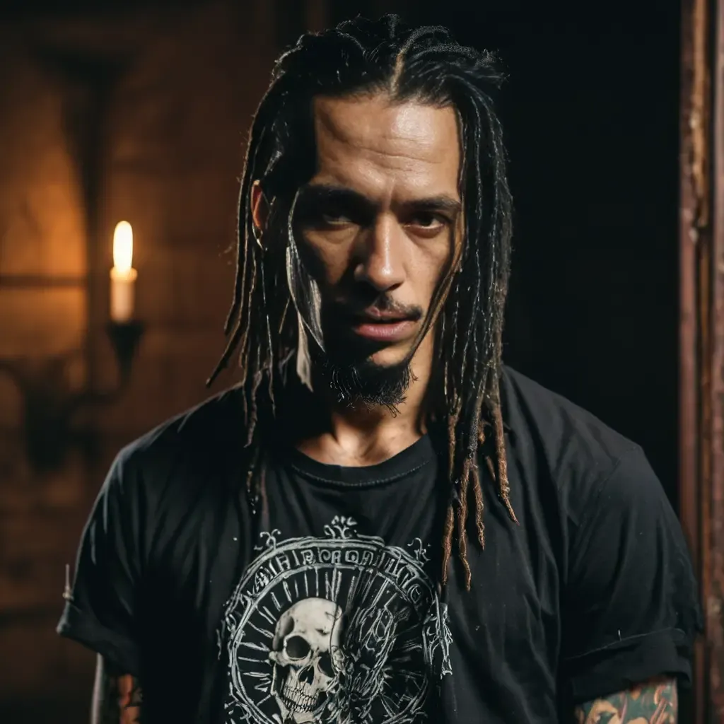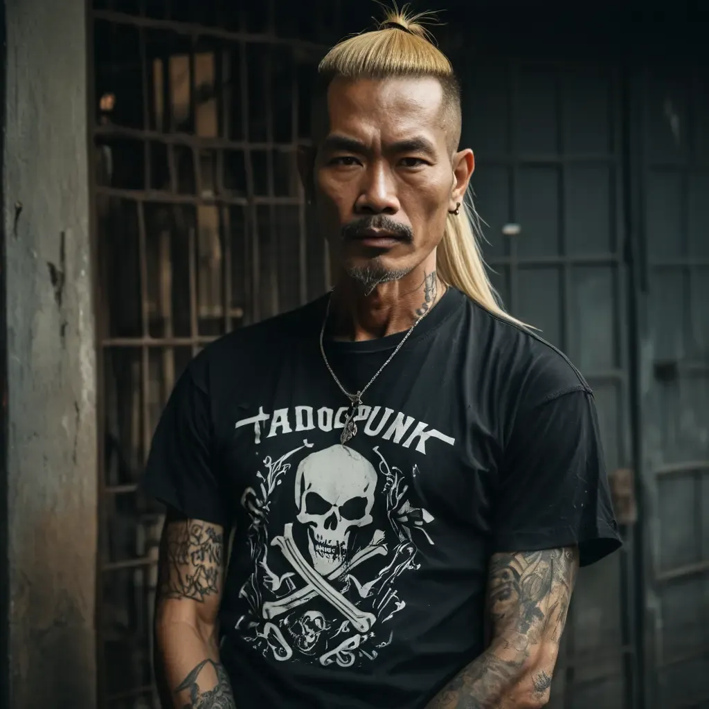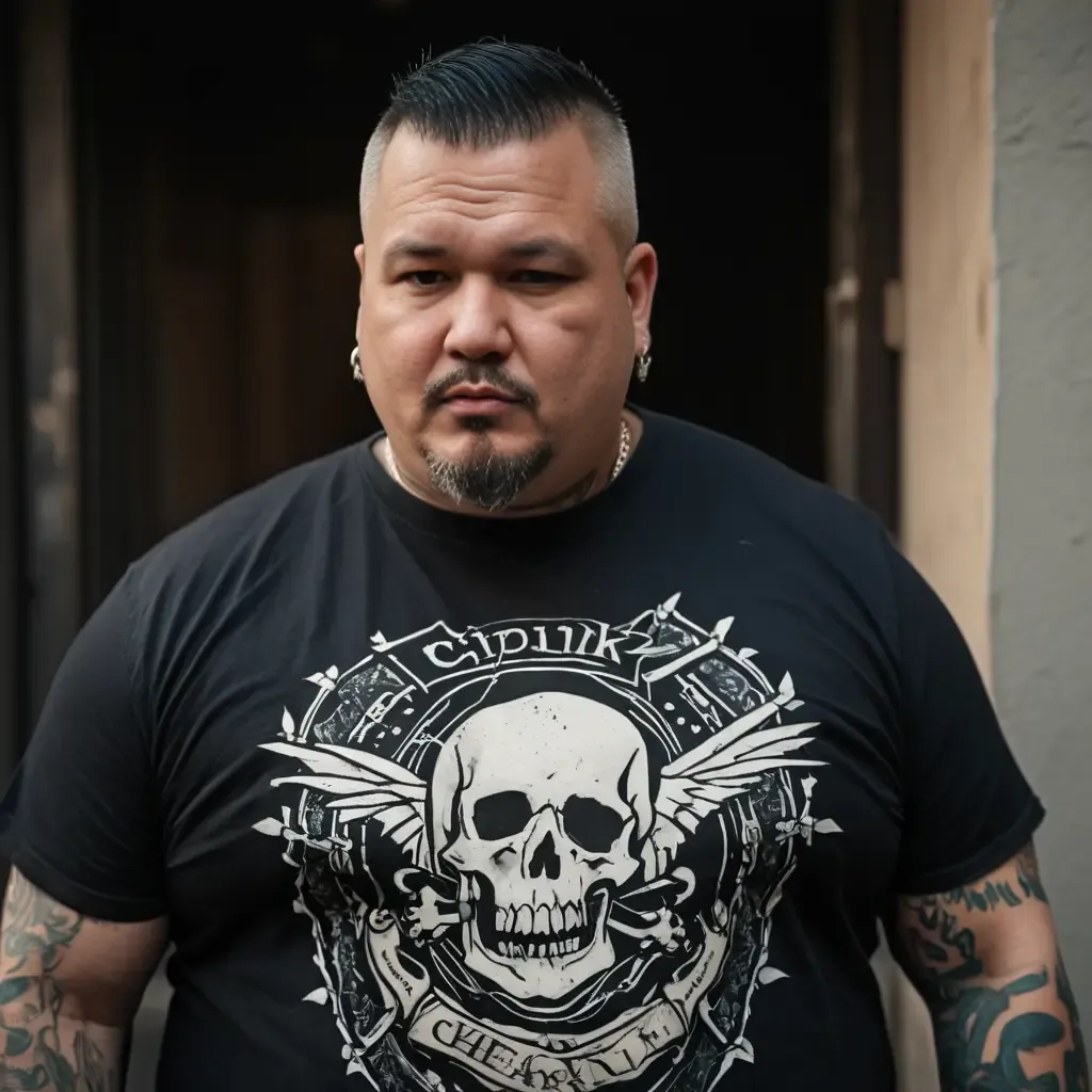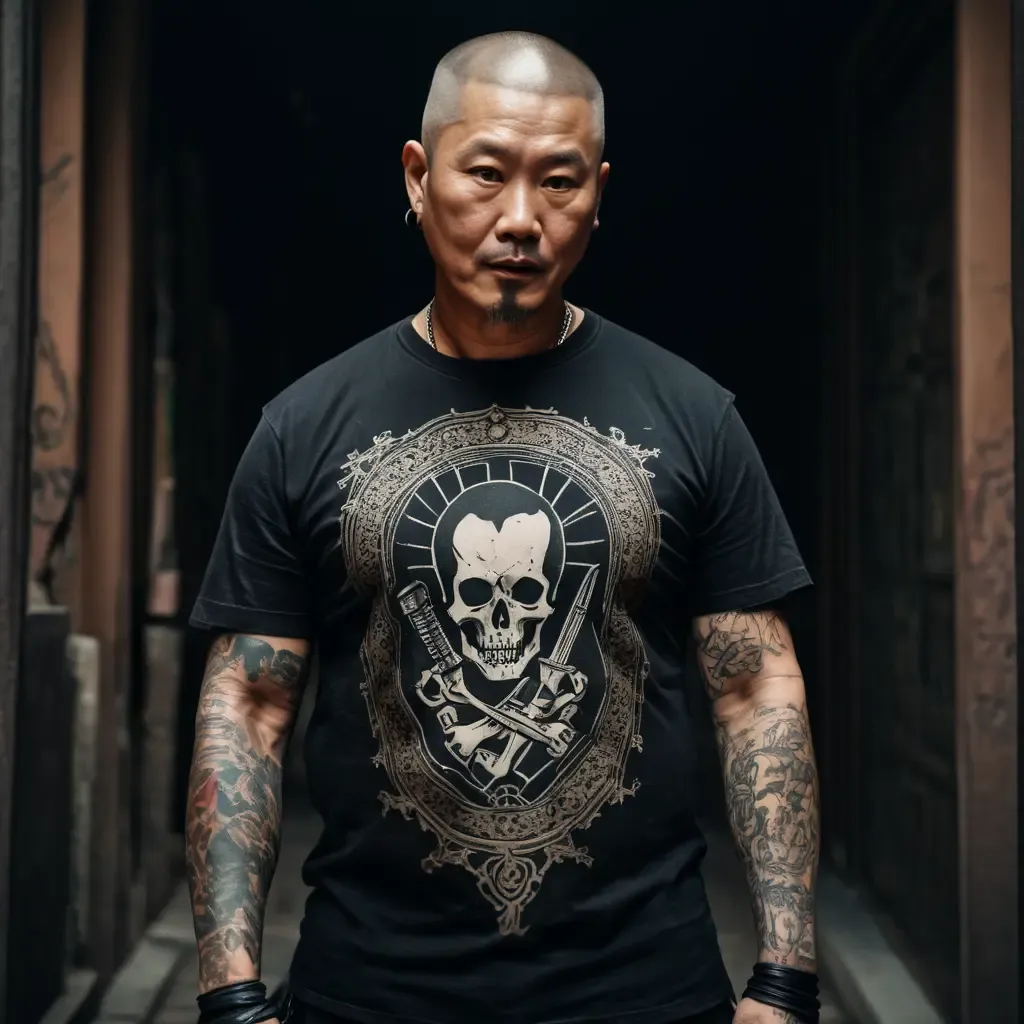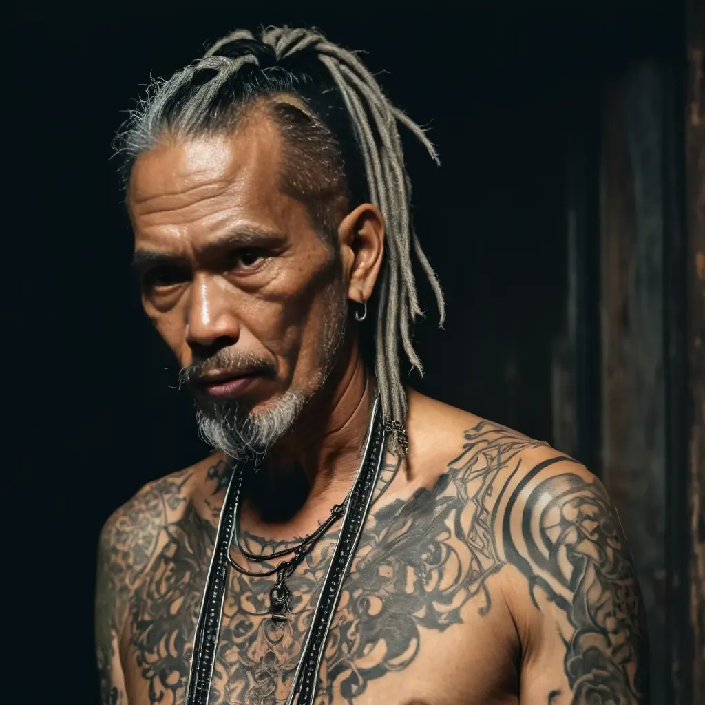 He is just wearing an old {biker jacket|t-shirt|open leather coat}.