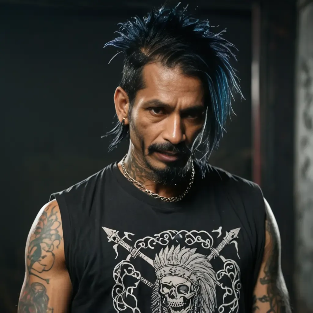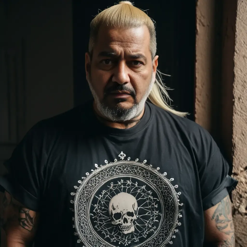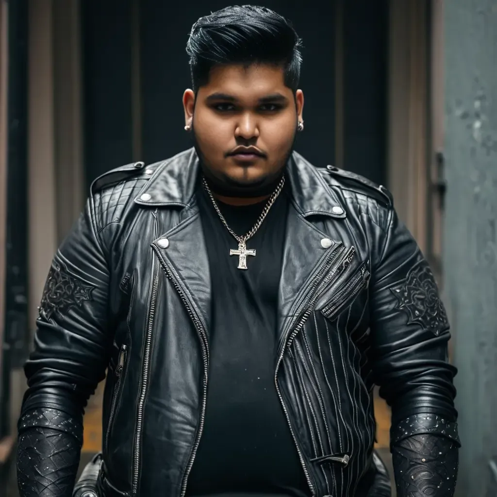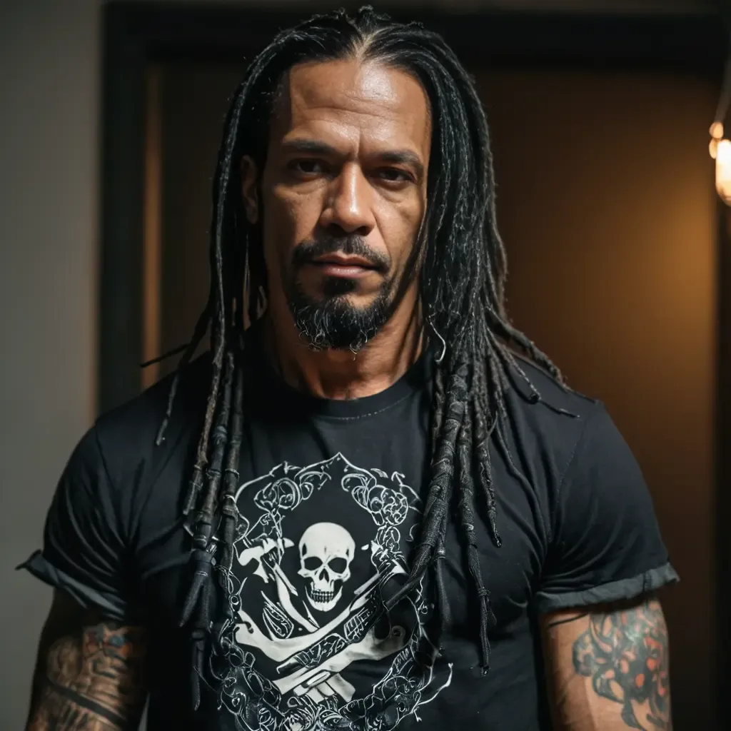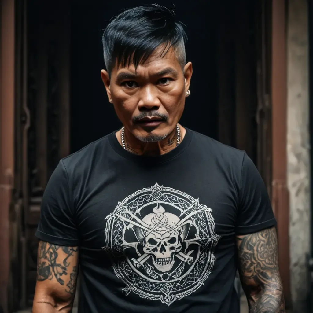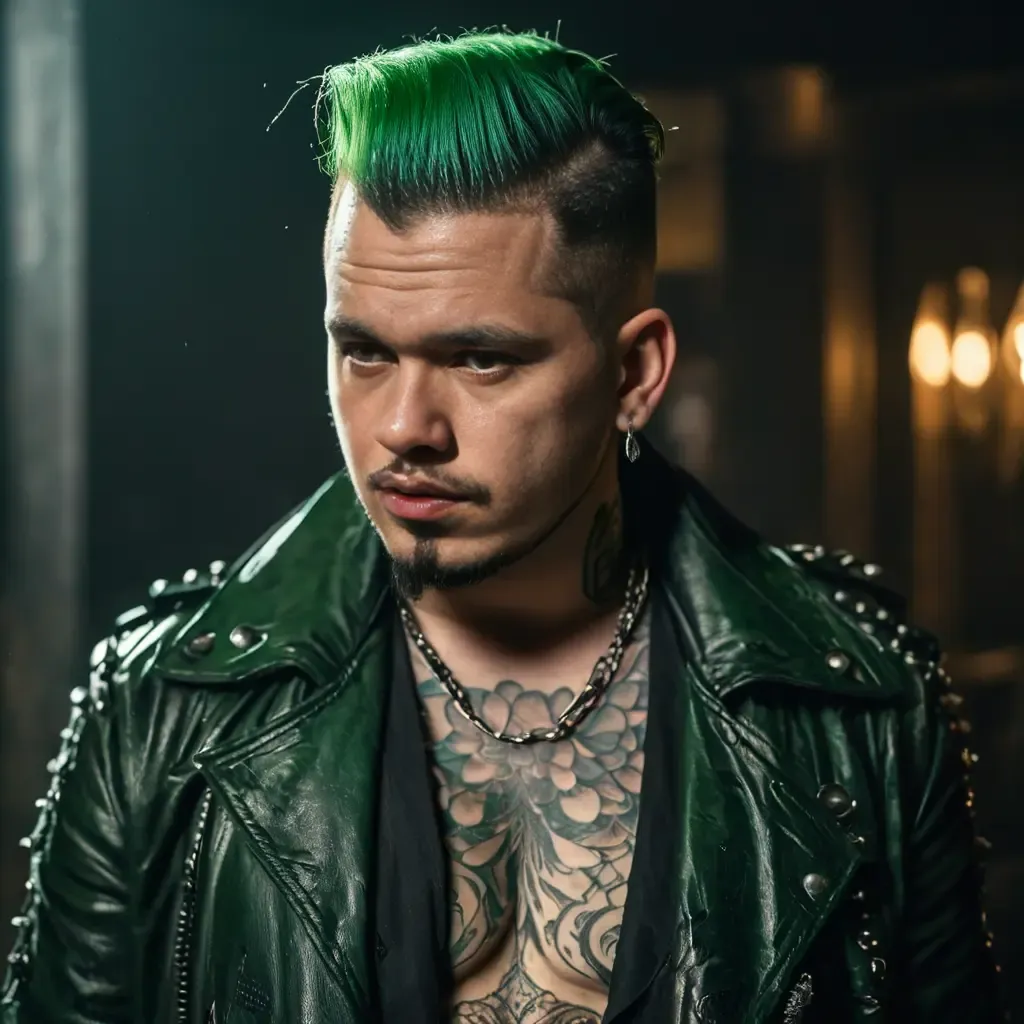 He is just wearing an old {biker jacket|t-shirt|open leather coat}.