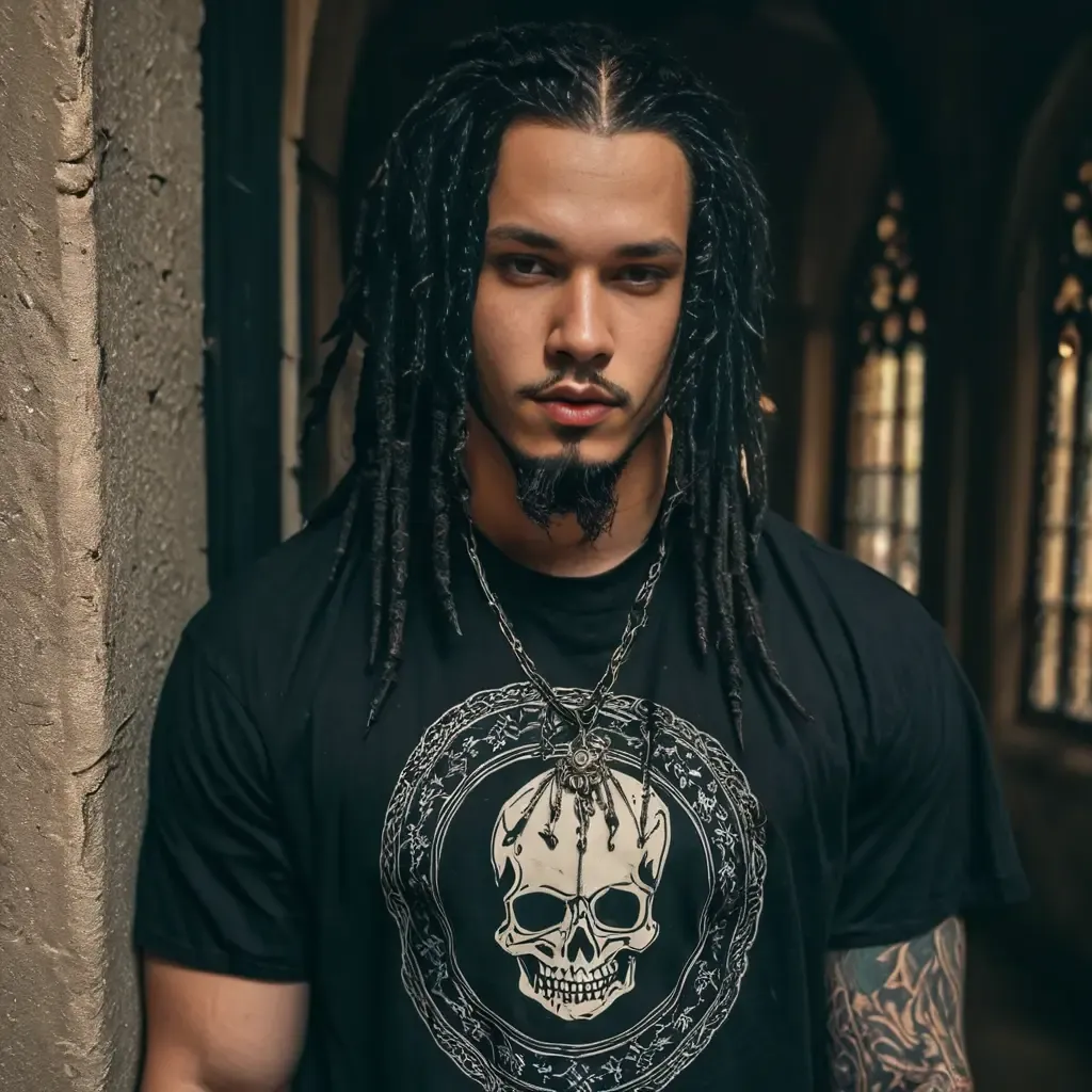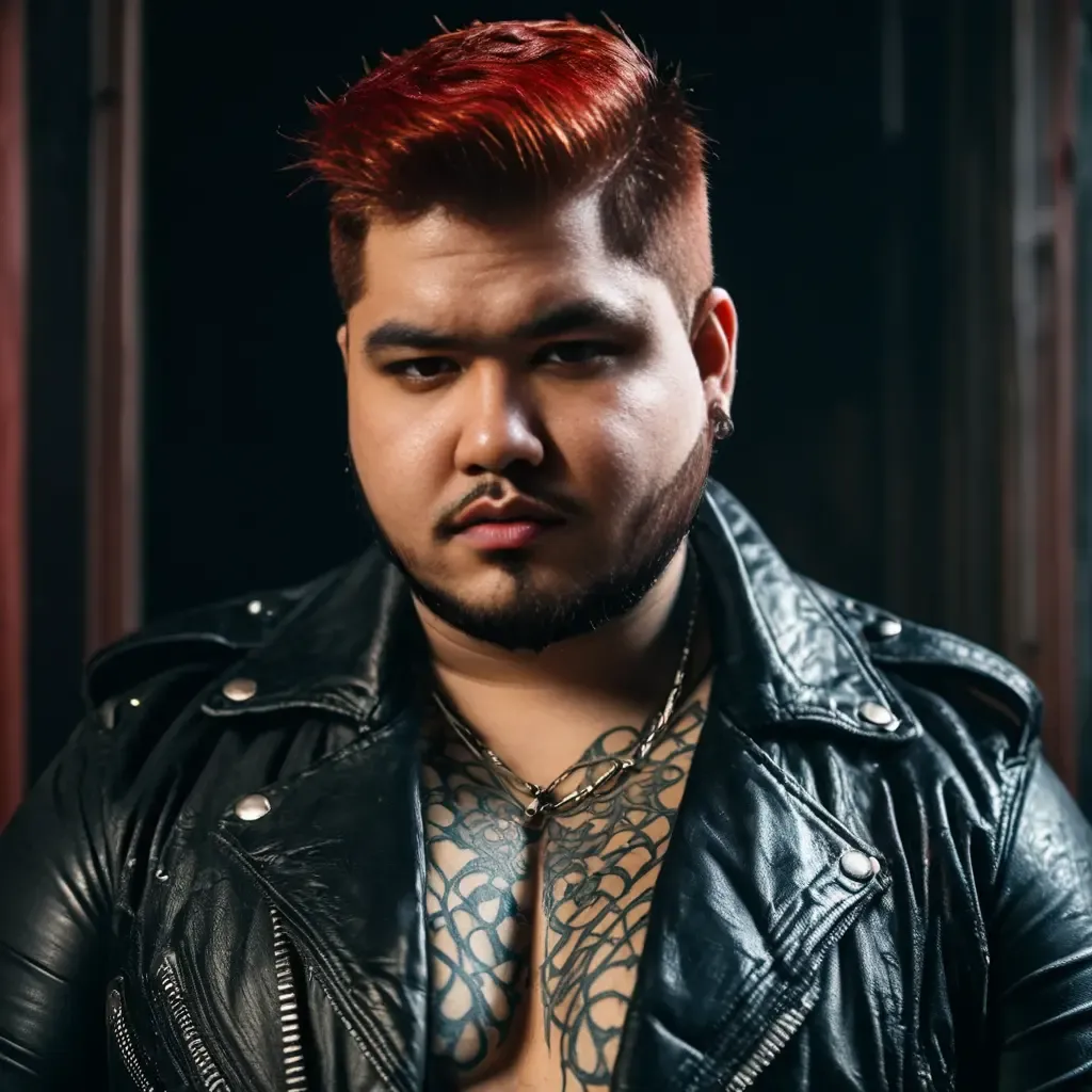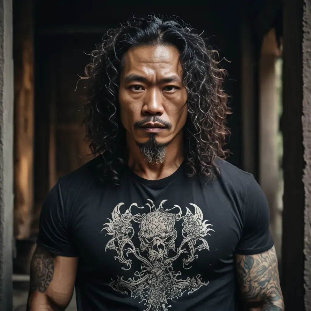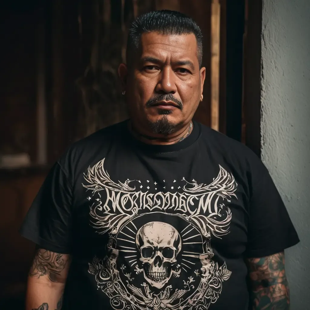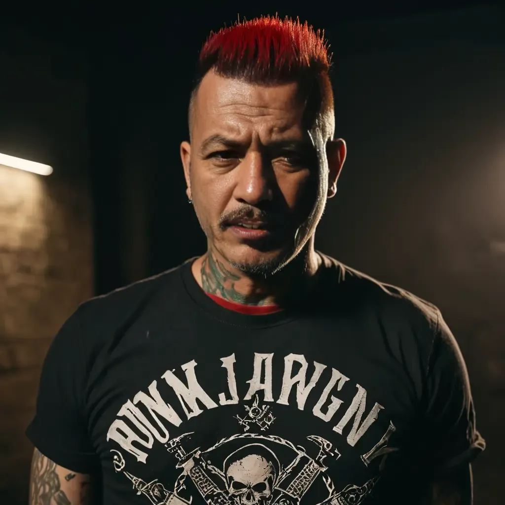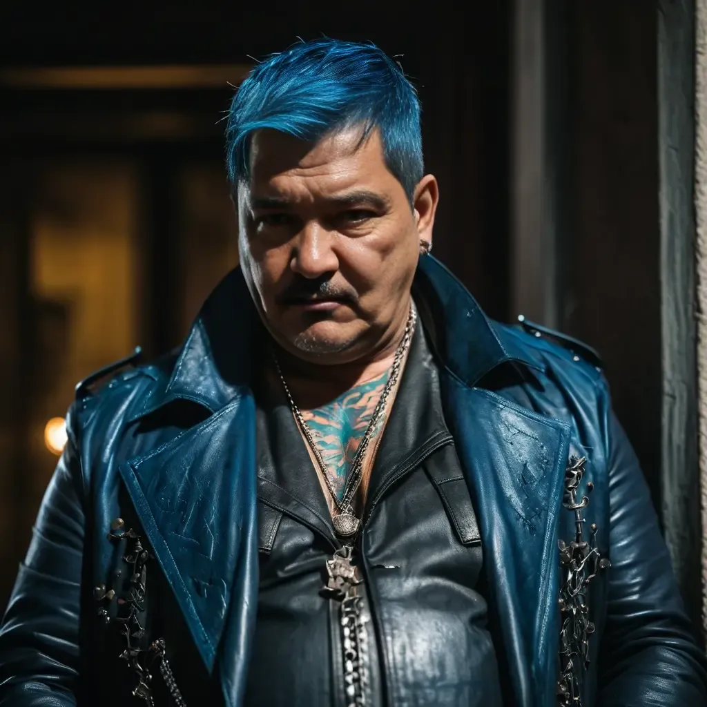 He is just wearing an old {biker jacket|t-shirt|open leather coat}.