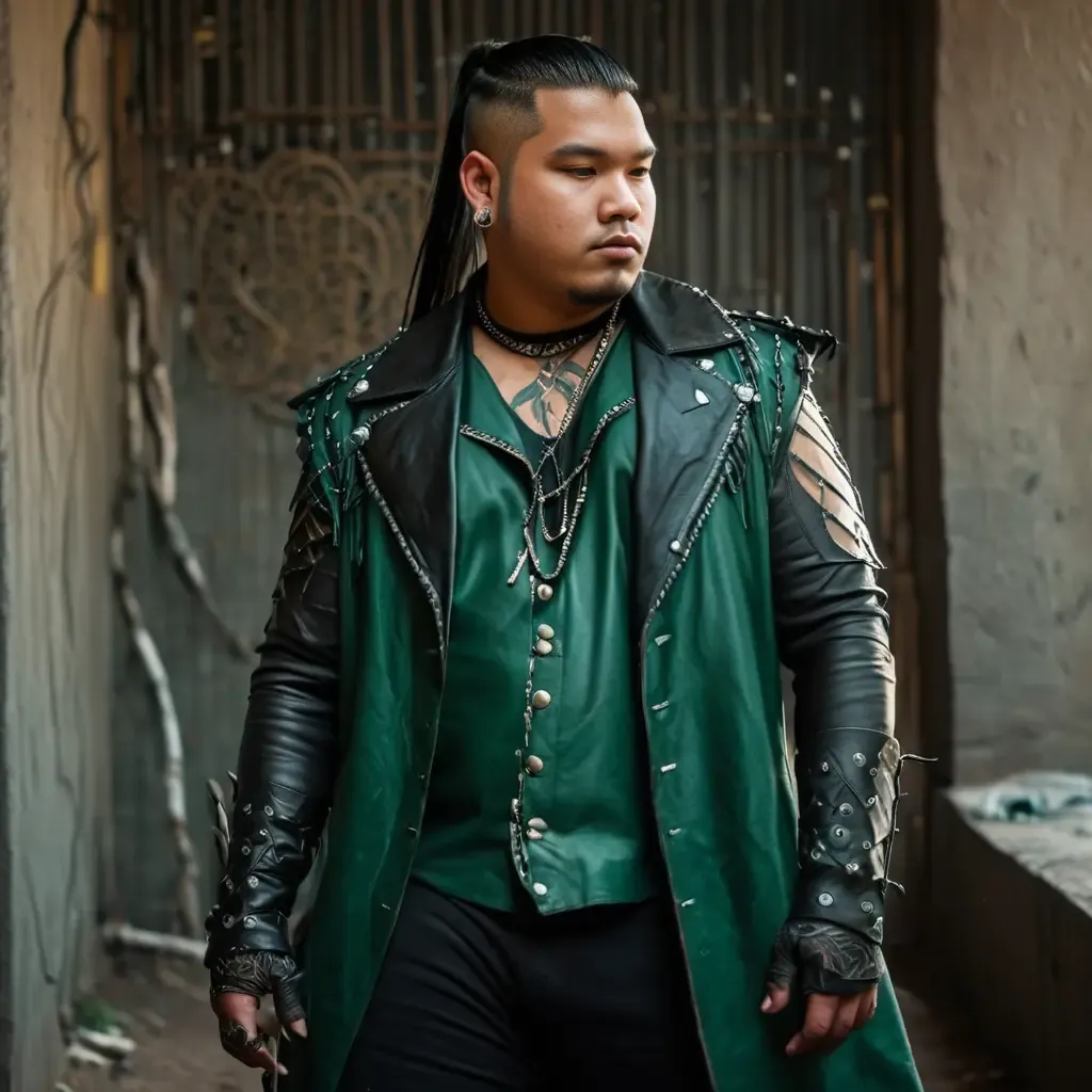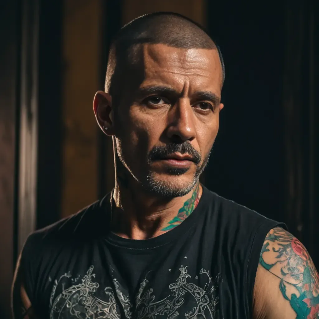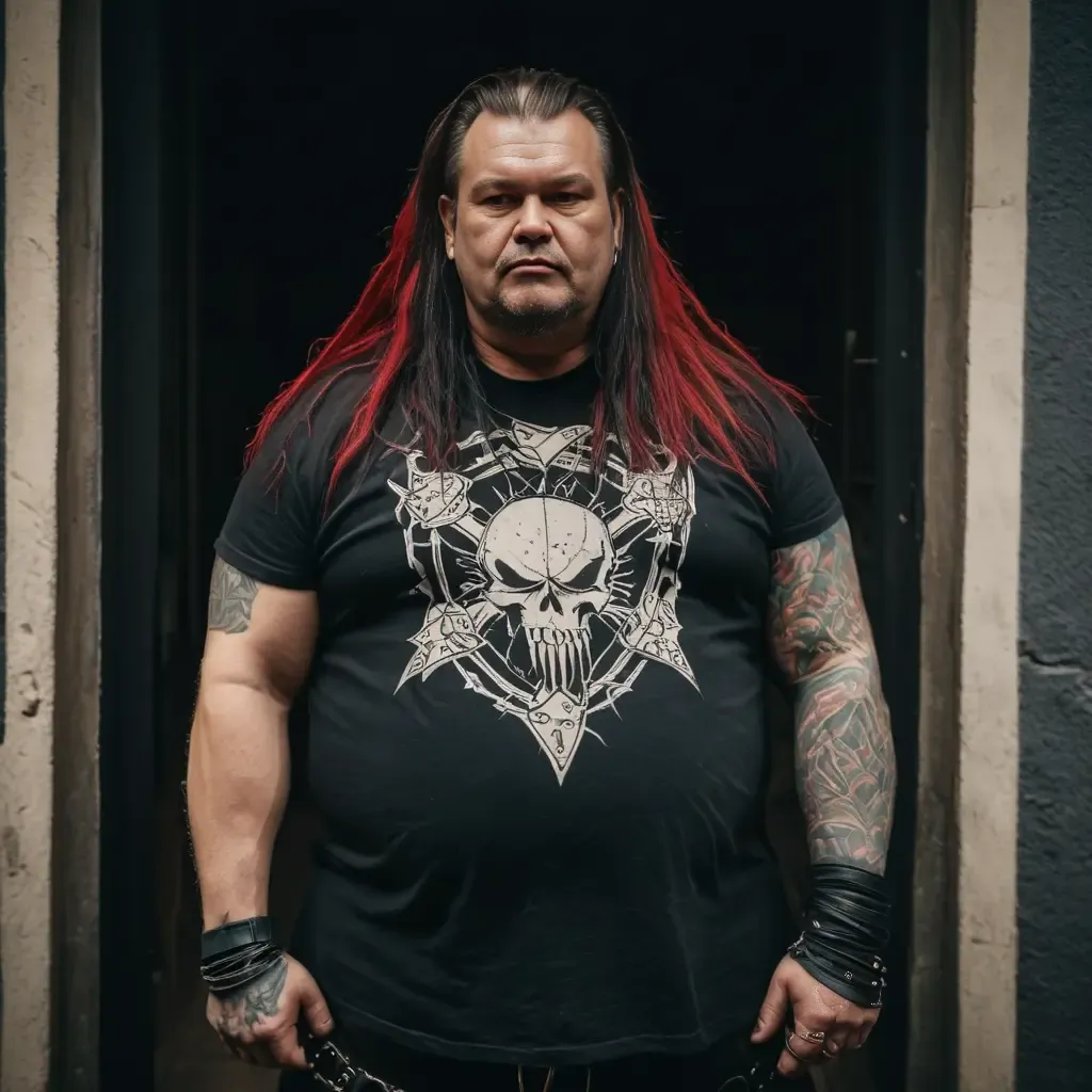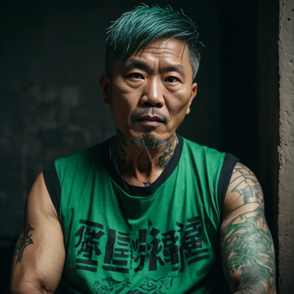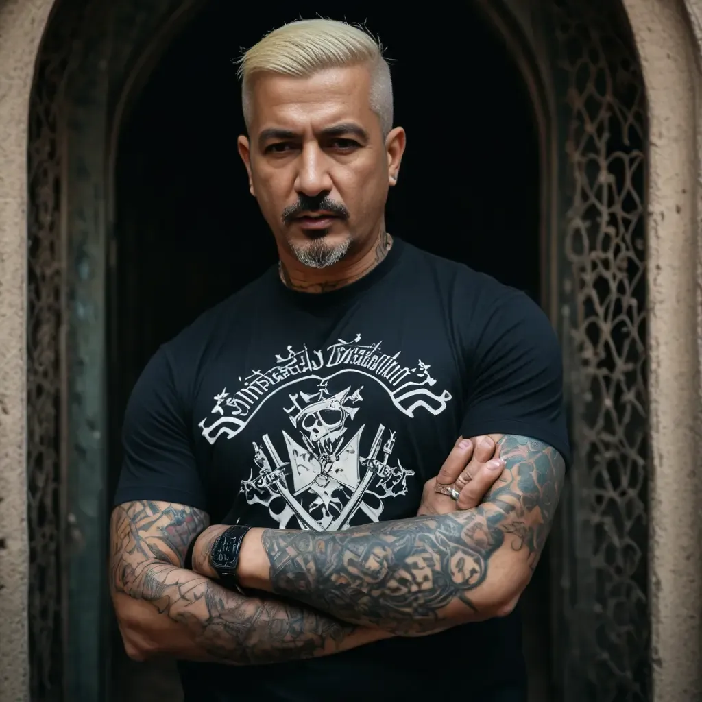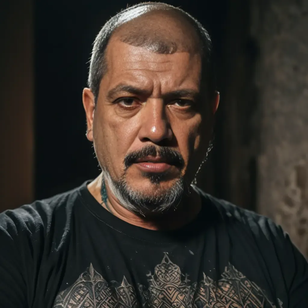 He is just wearing an old {biker jacket|t-shirt|open leather coat}.