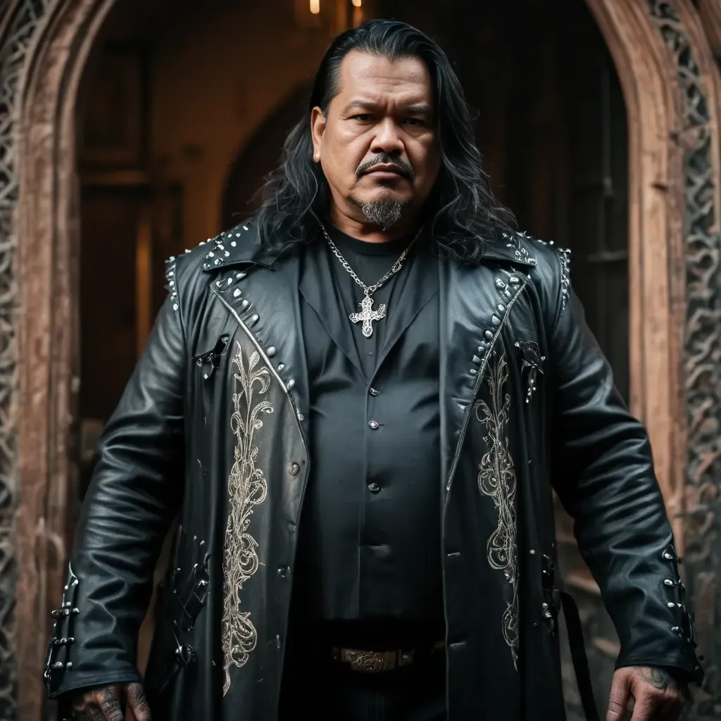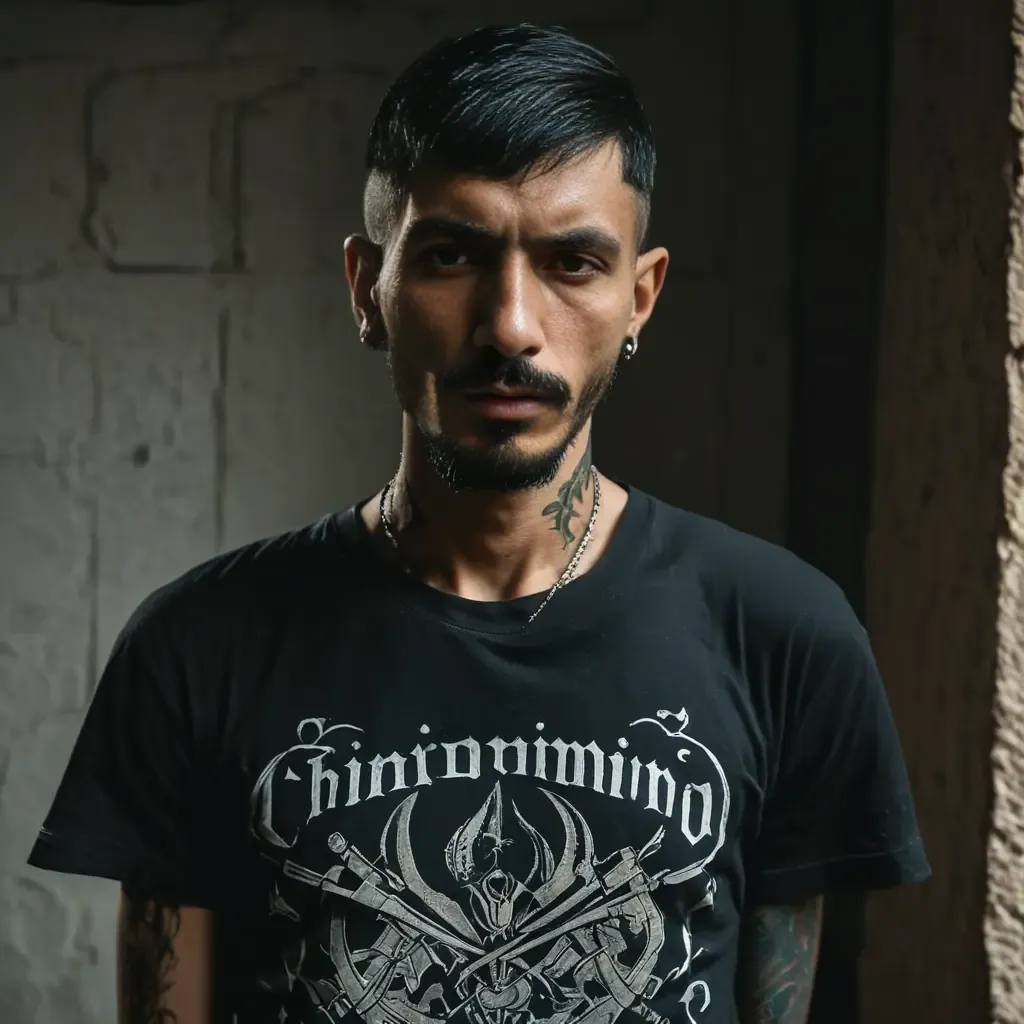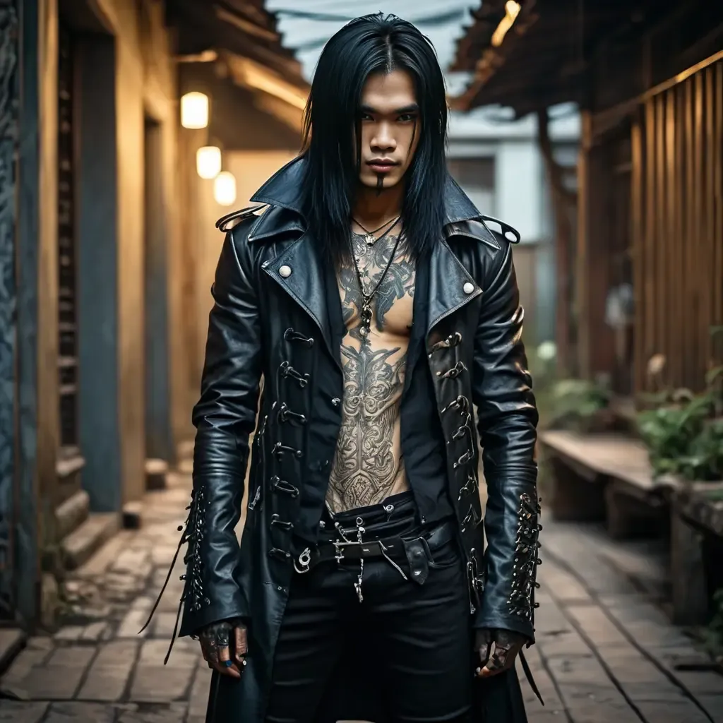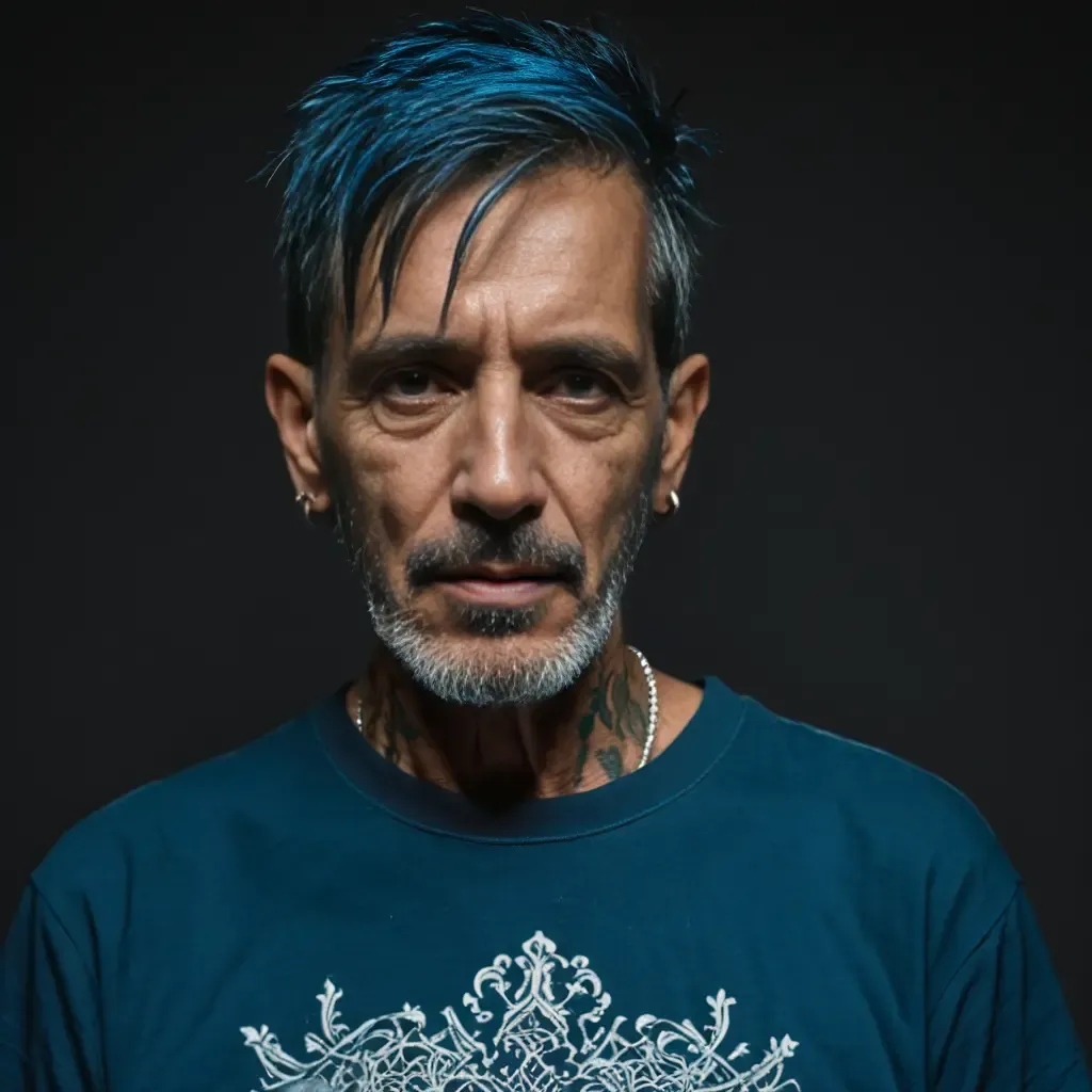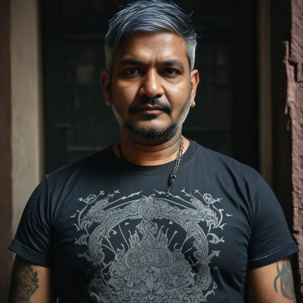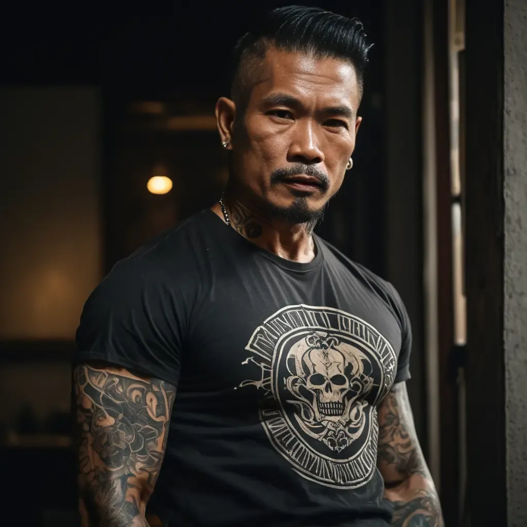 He is just wearing an old {biker jacket|t-shirt|open leather coat}.
