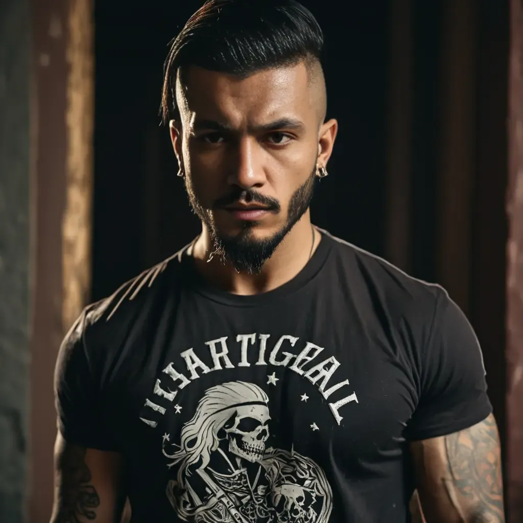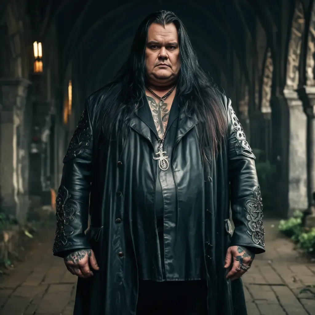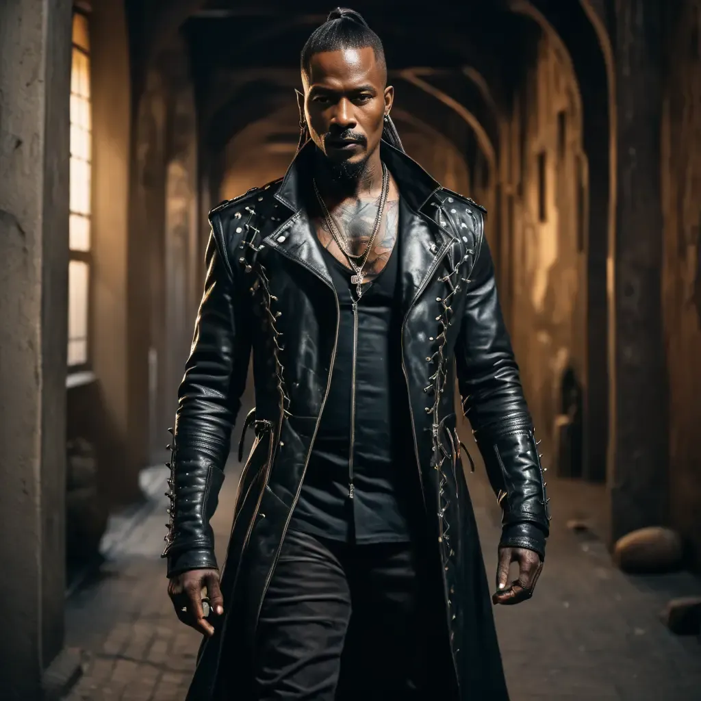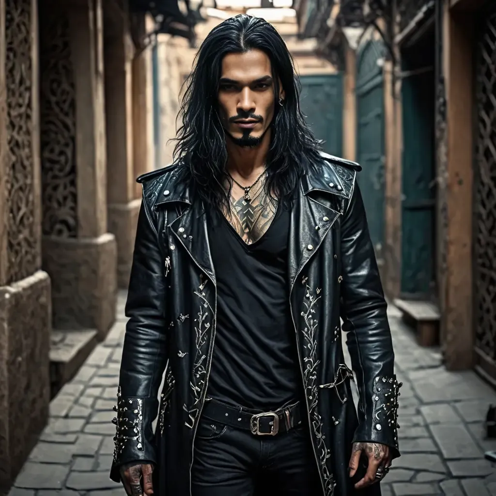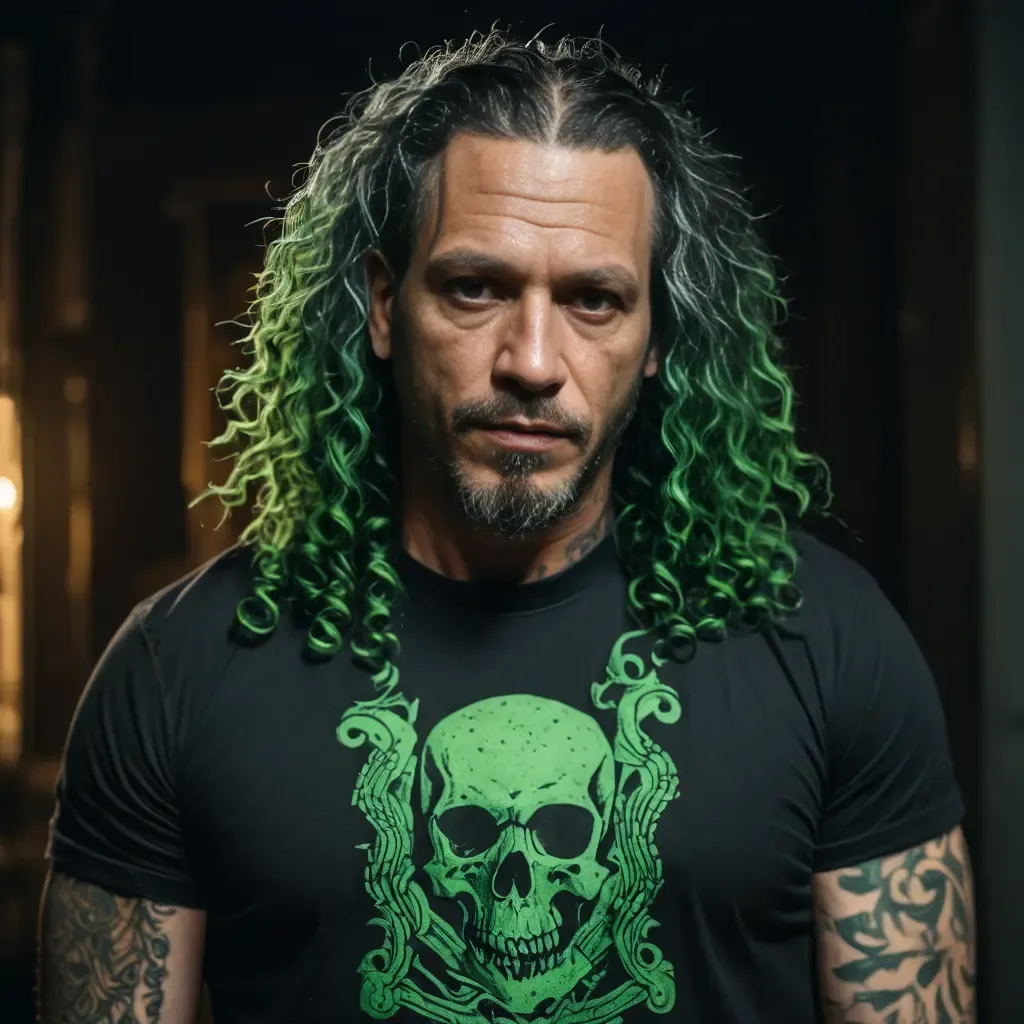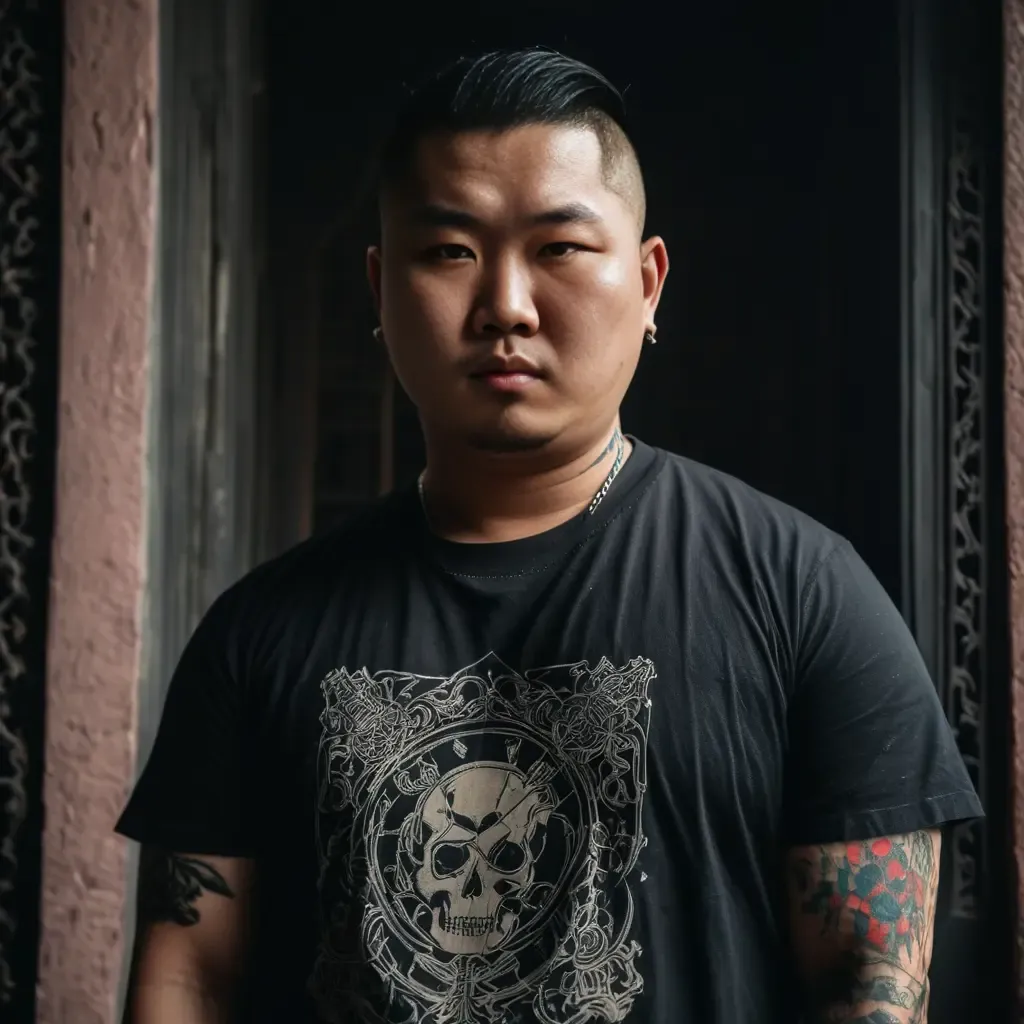 He is just wearing an old {biker jacket|t-shirt|open leather coat}.