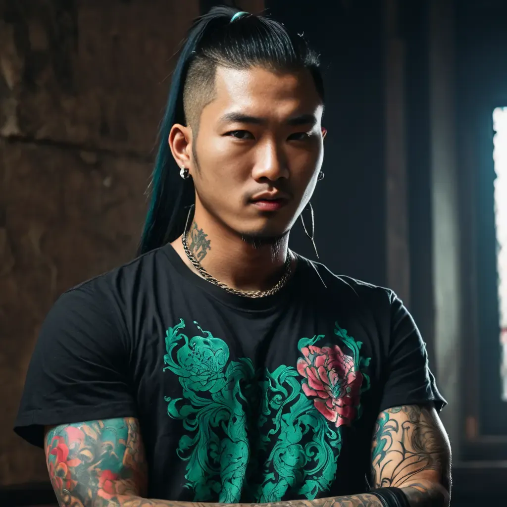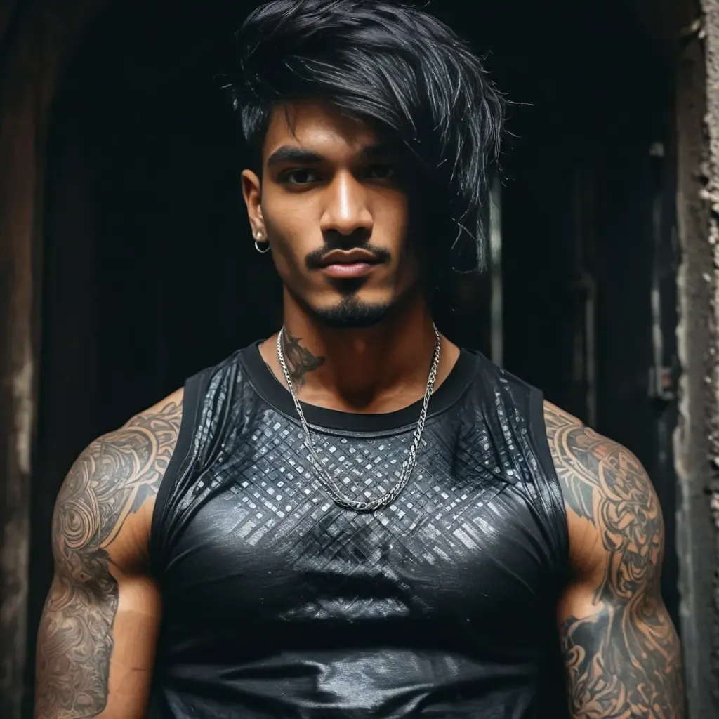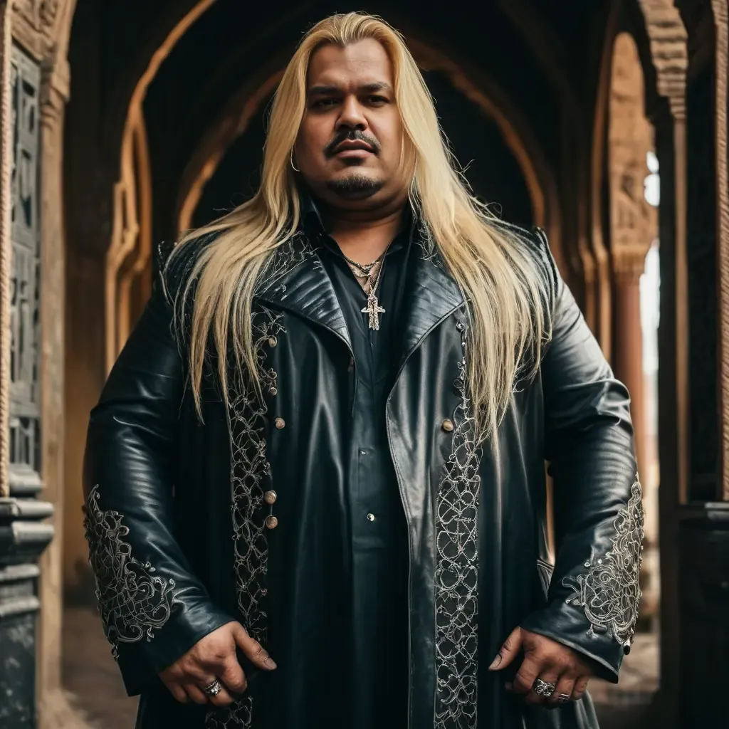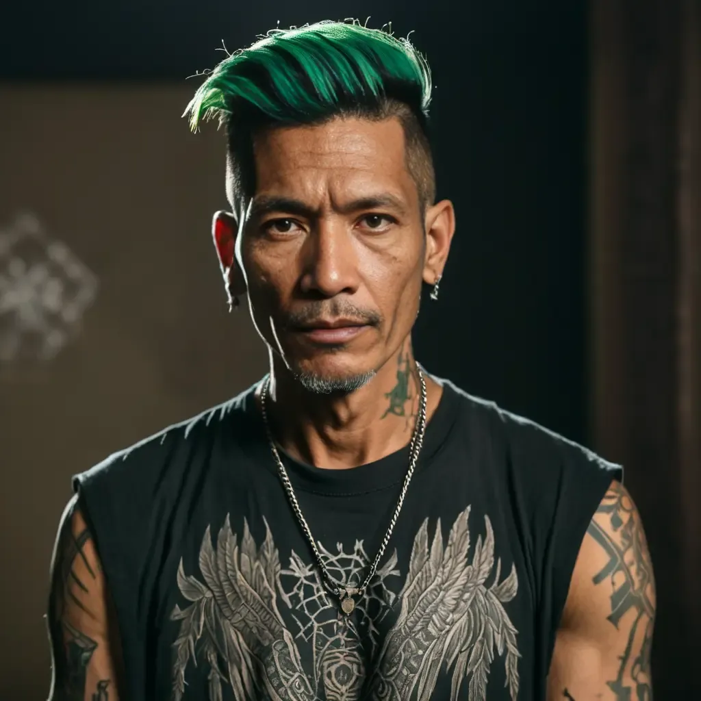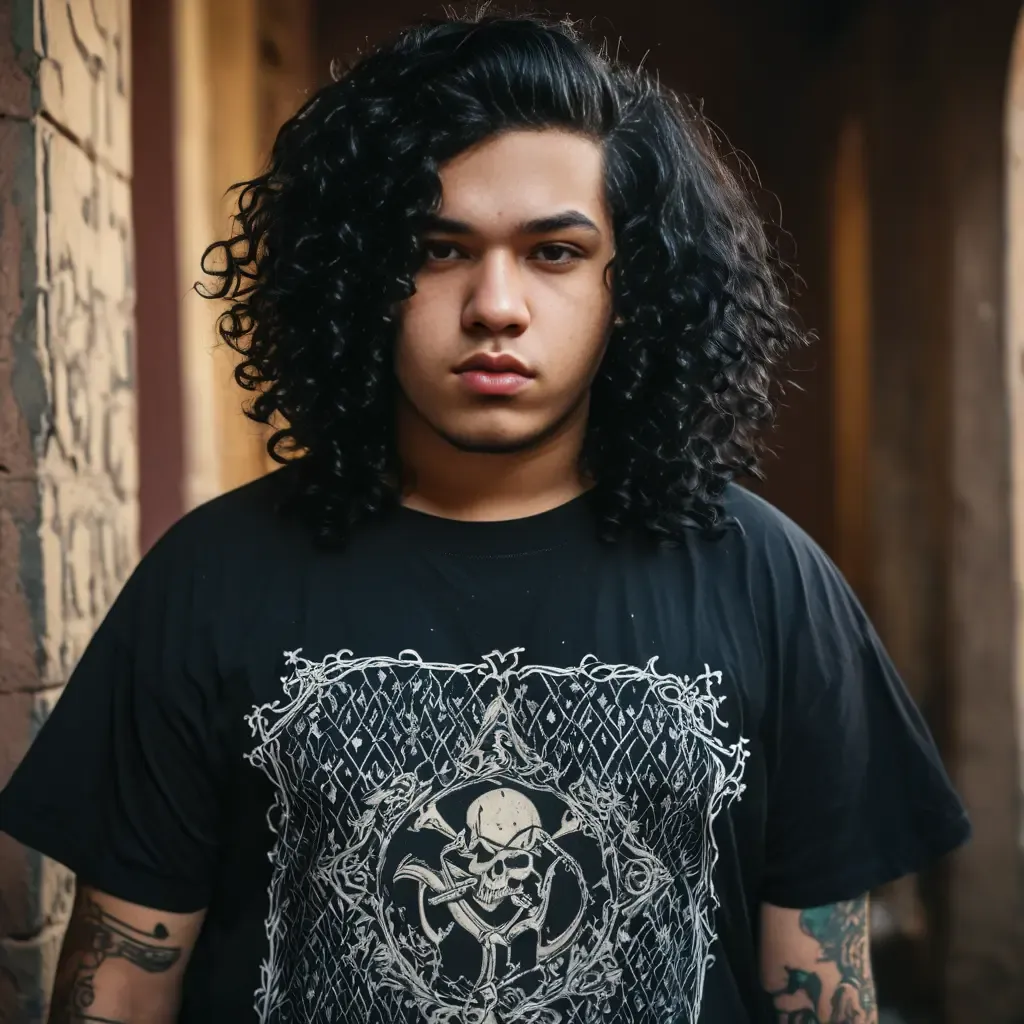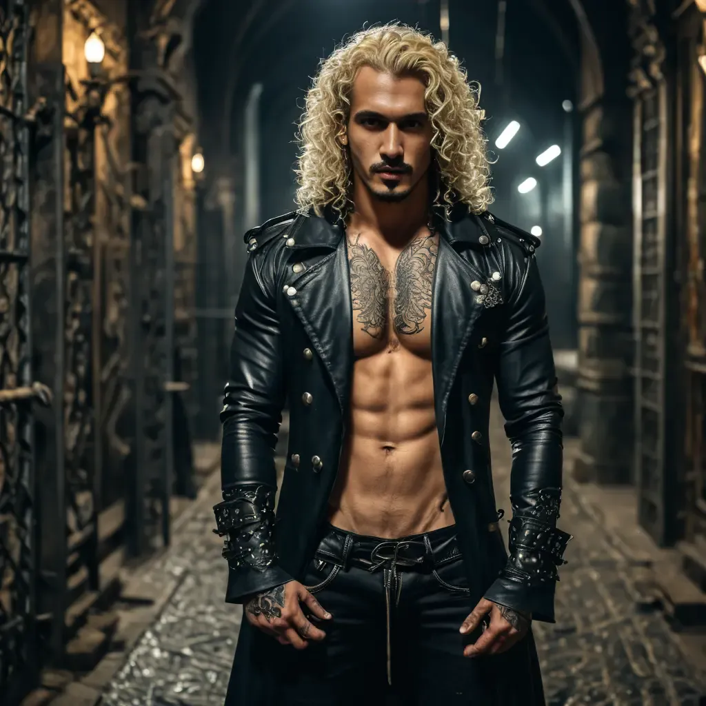 He is just wearing an old {biker jacket|t-shirt|open leather coat}.