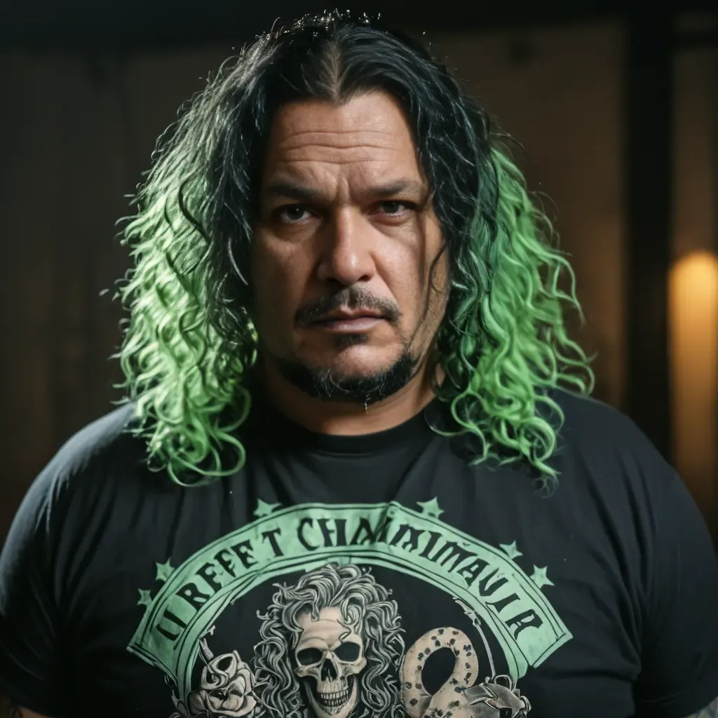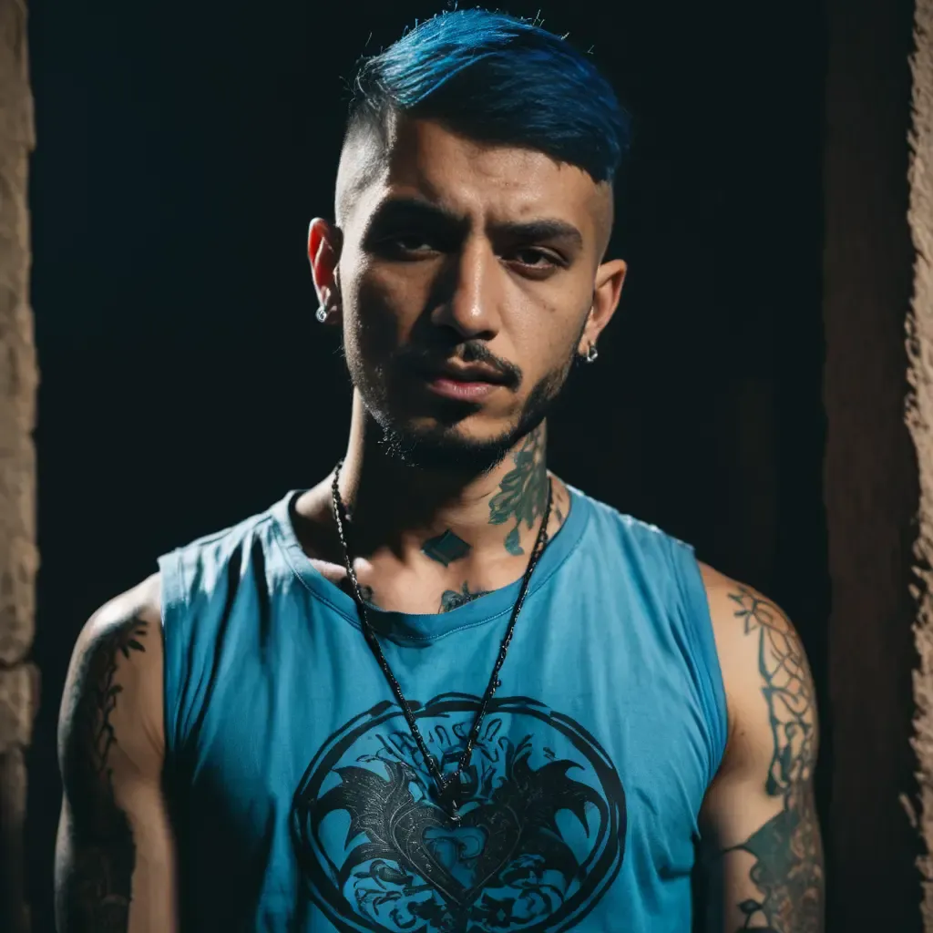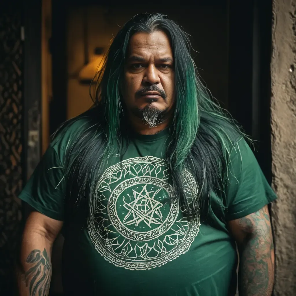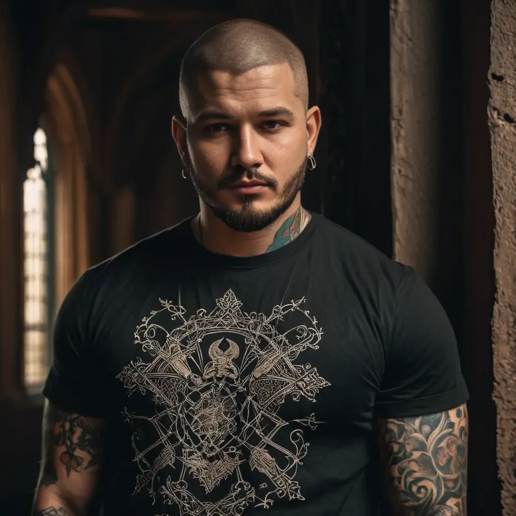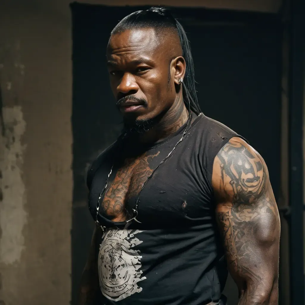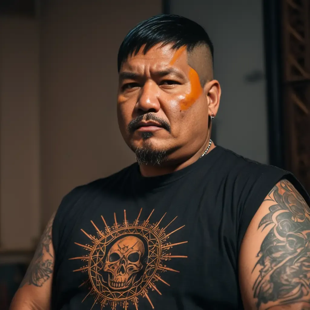 He is just wearing an old {biker jacket|t-shirt|open leather coat}.