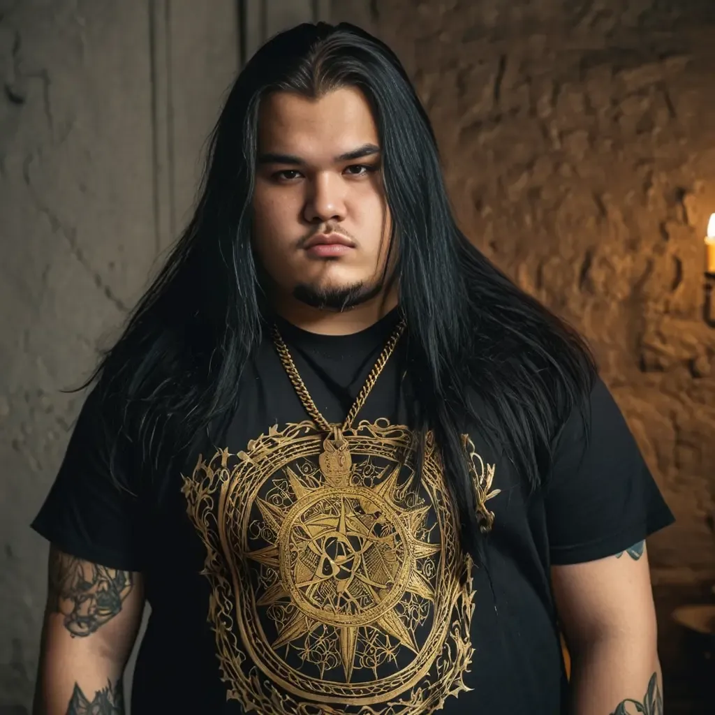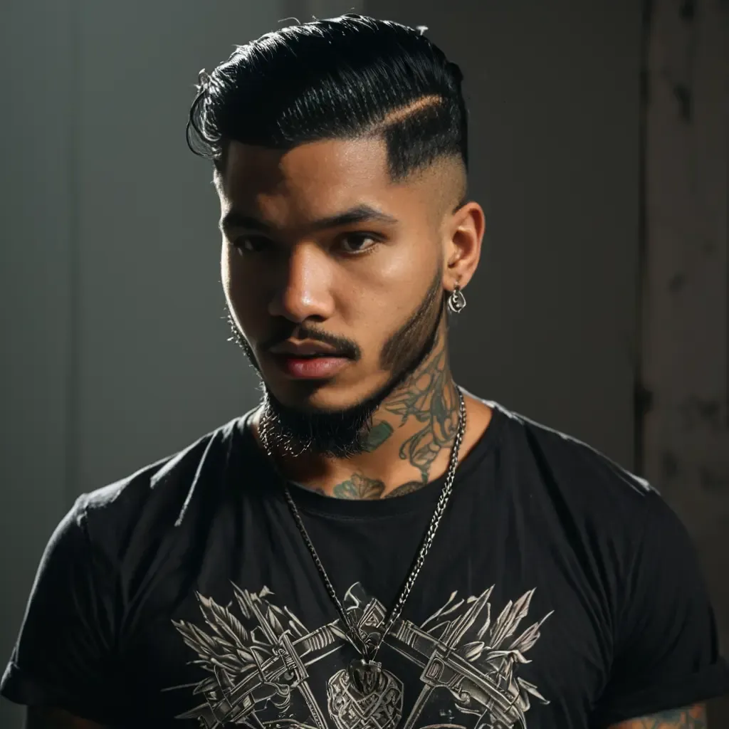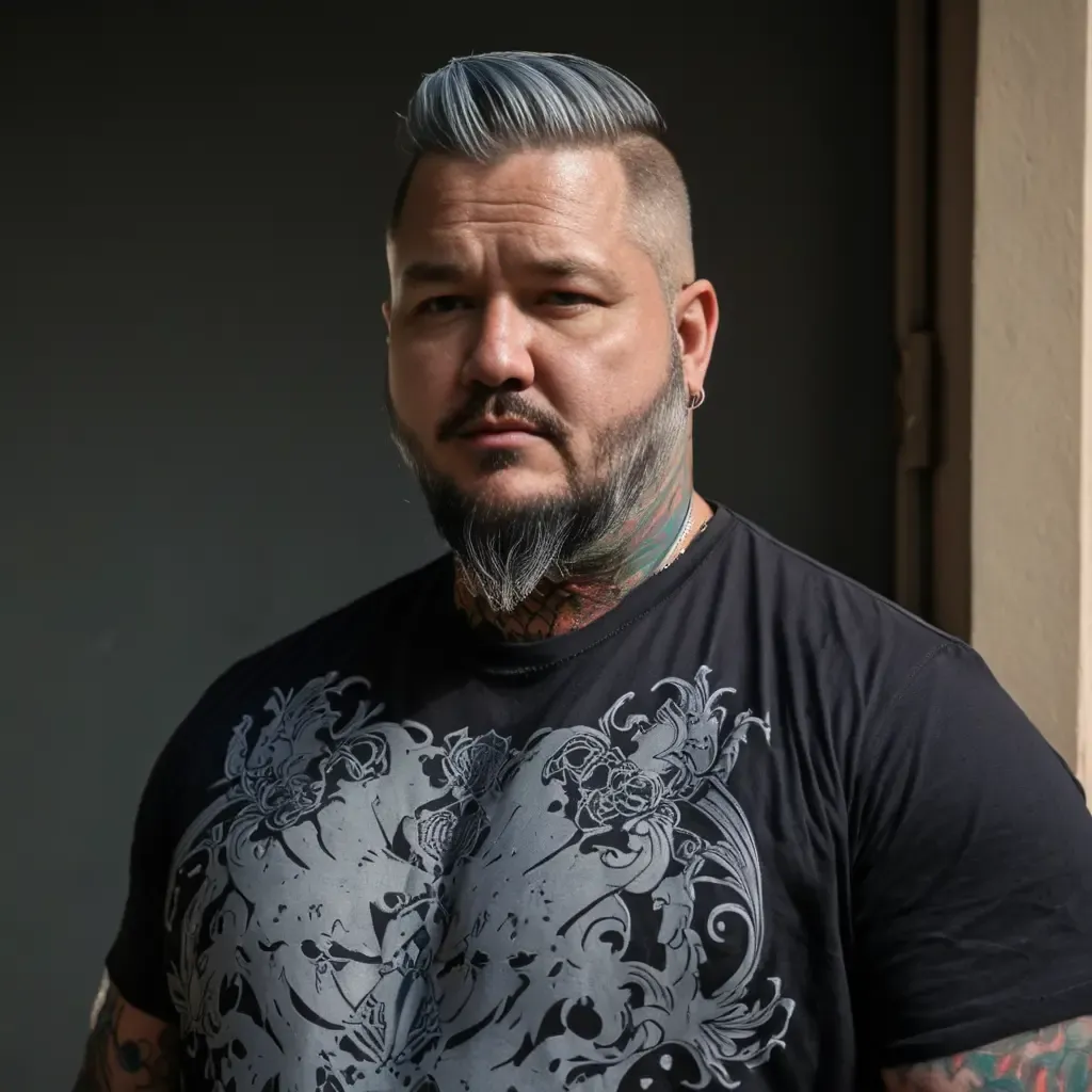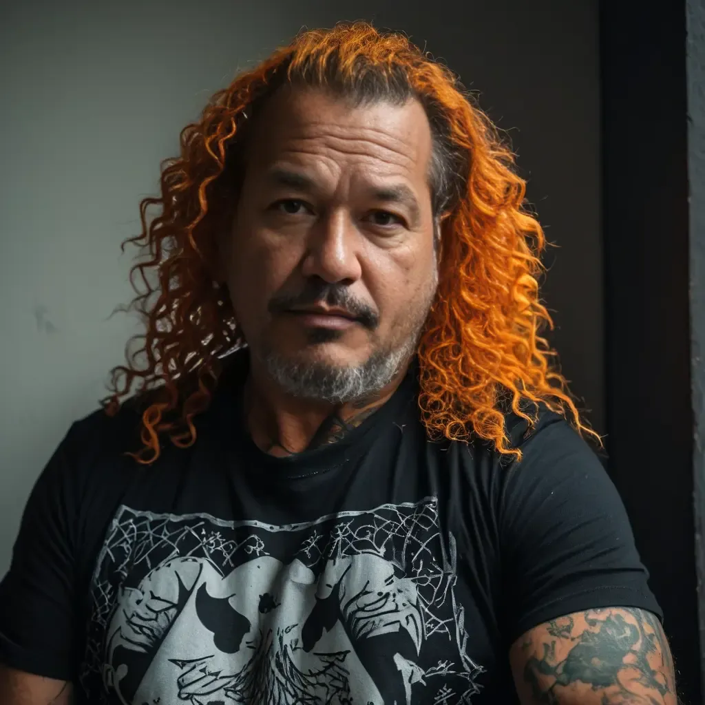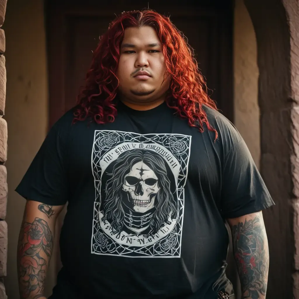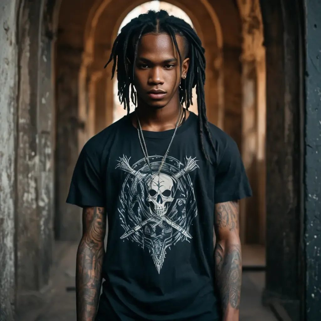 He is just wearing an old {biker jacket|t-shirt|open leather coat}.