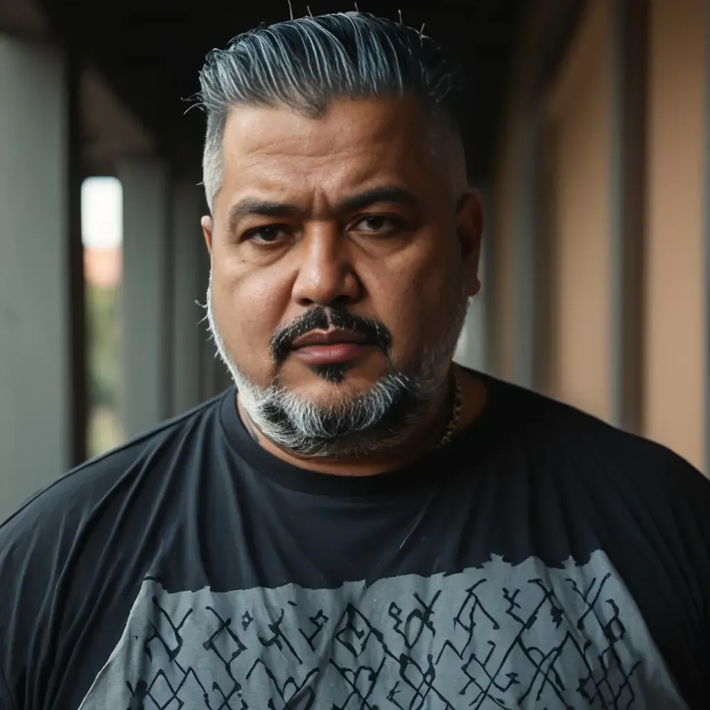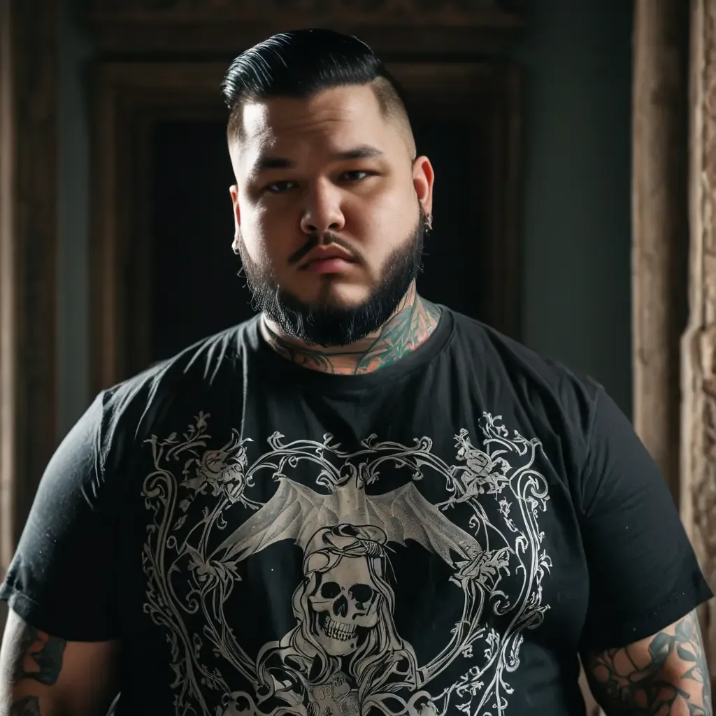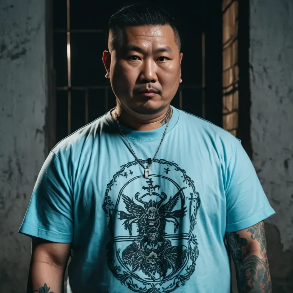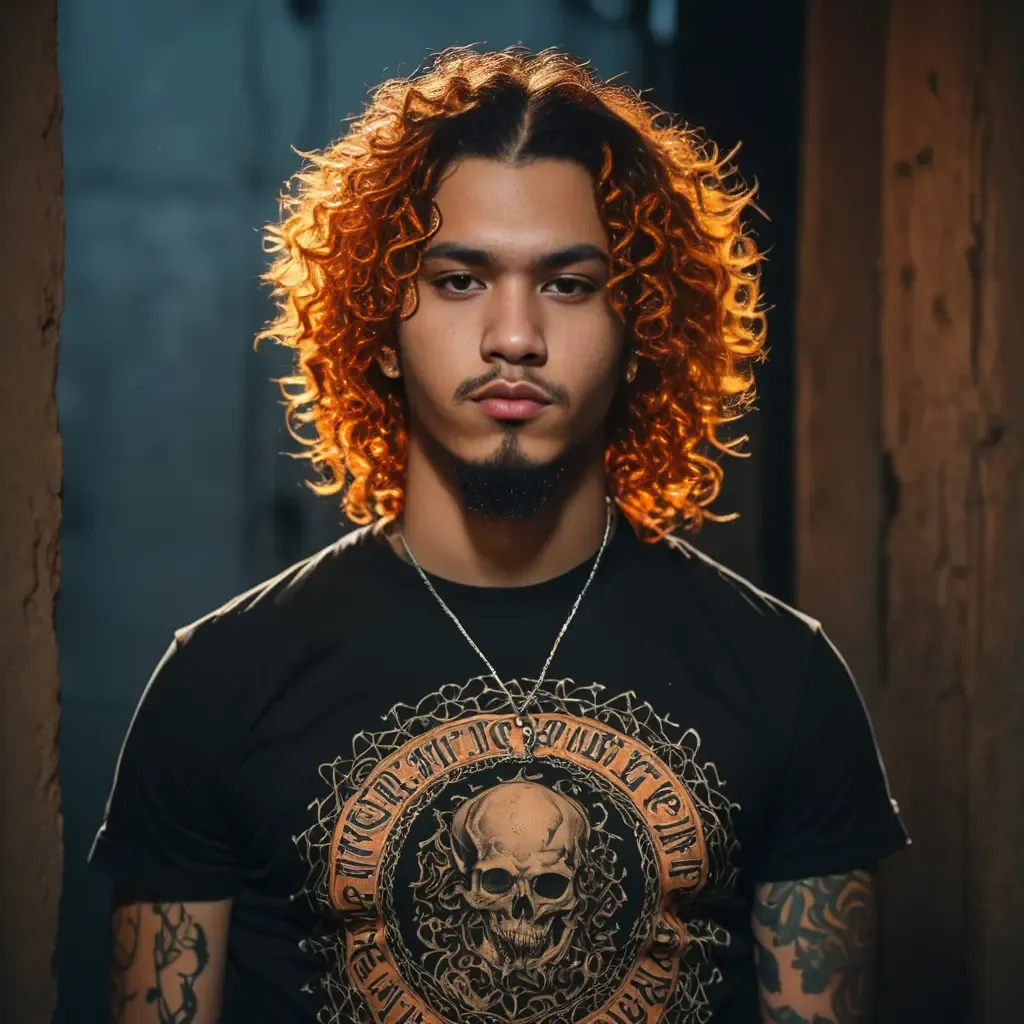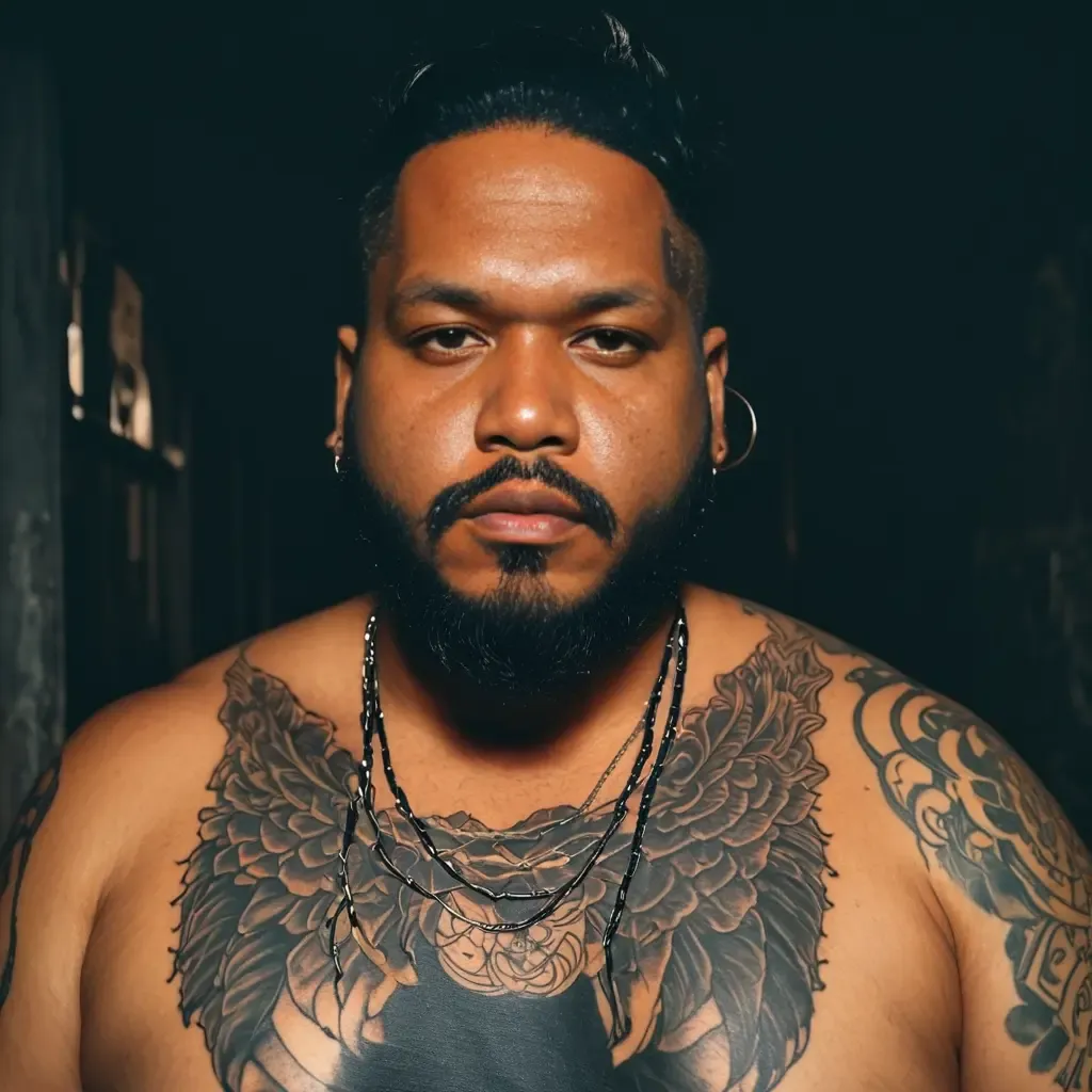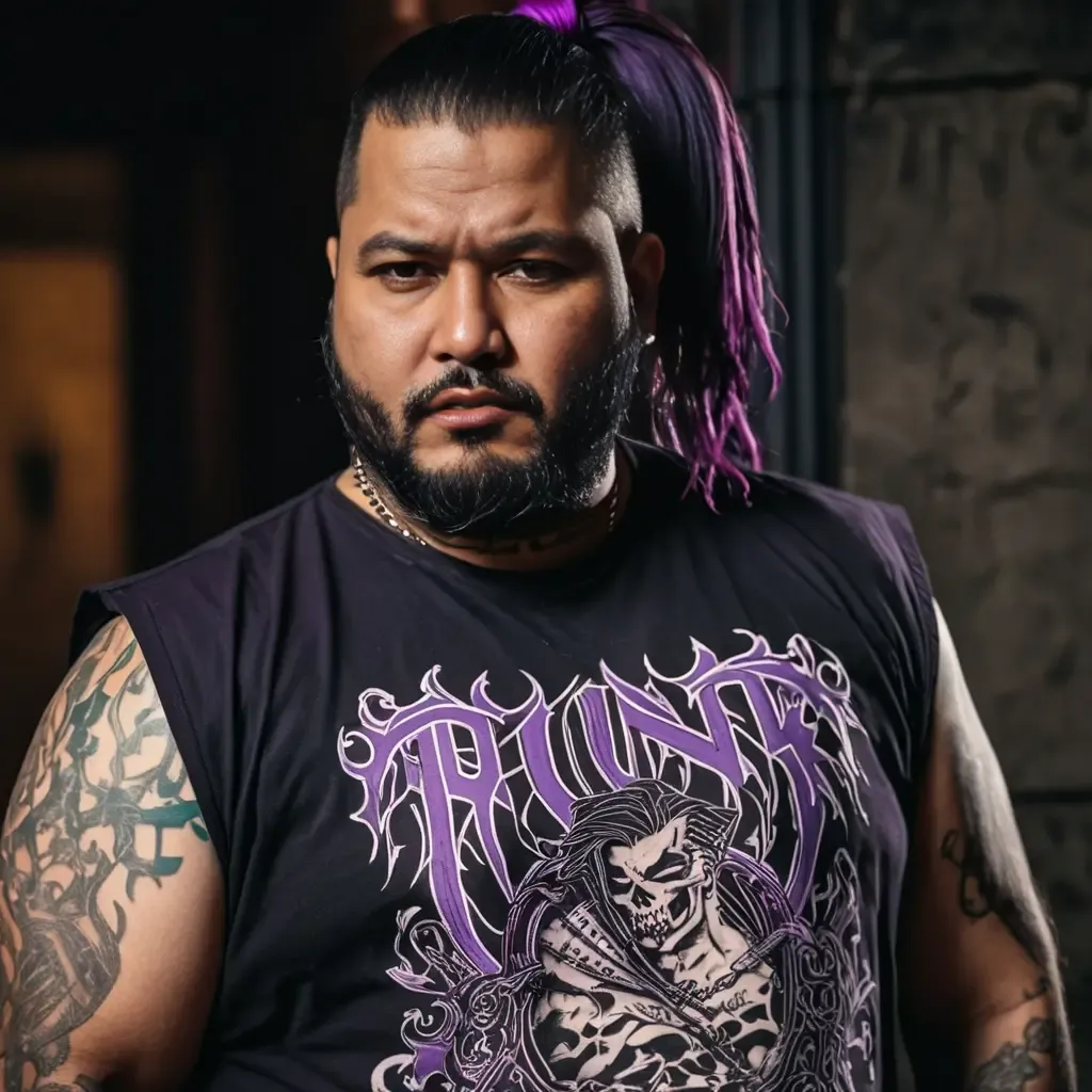 He is just wearing an old {biker jacket|t-shirt|open leather coat}.