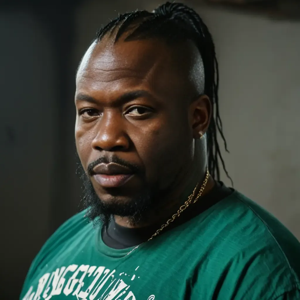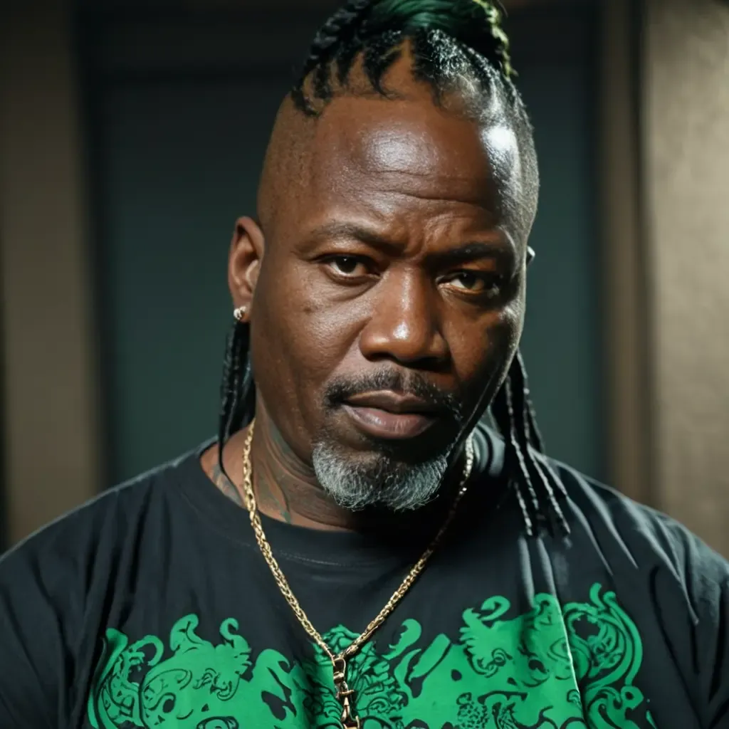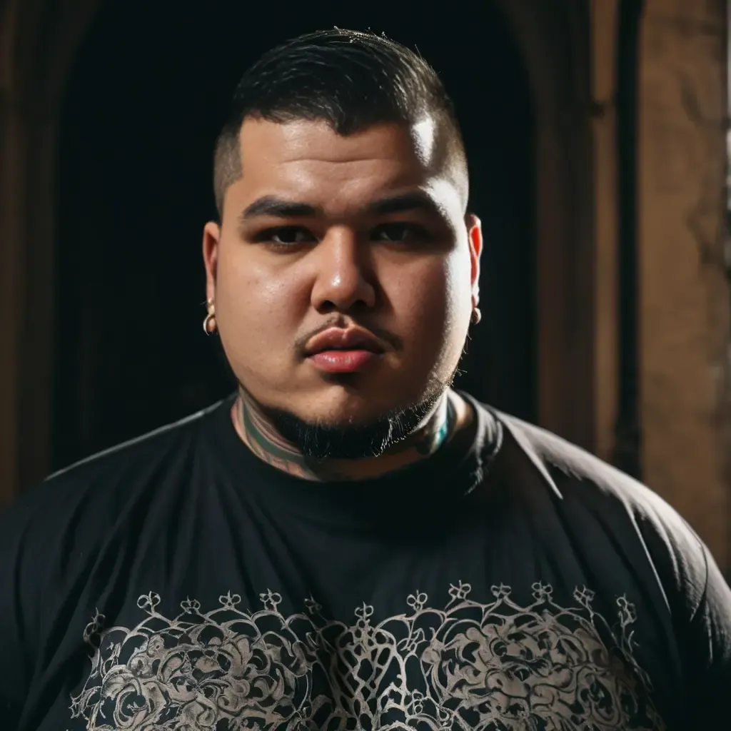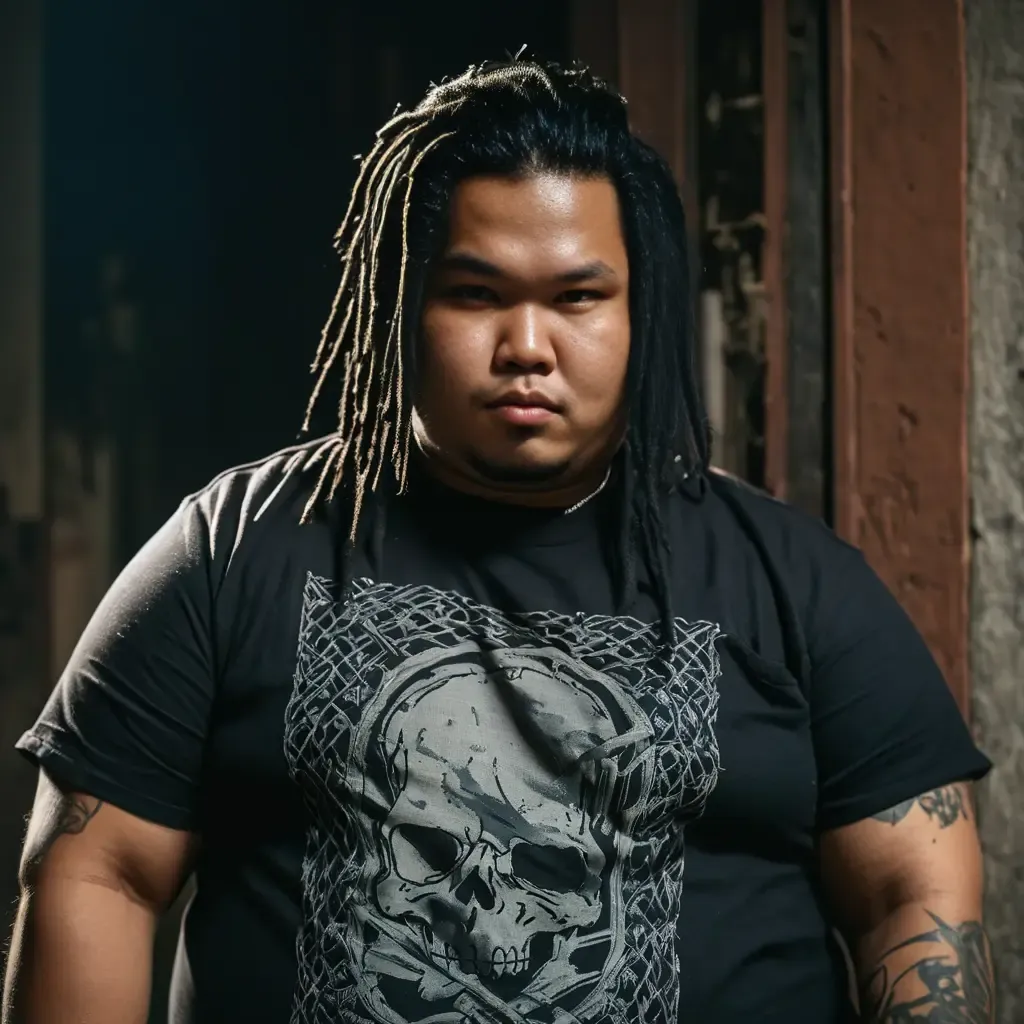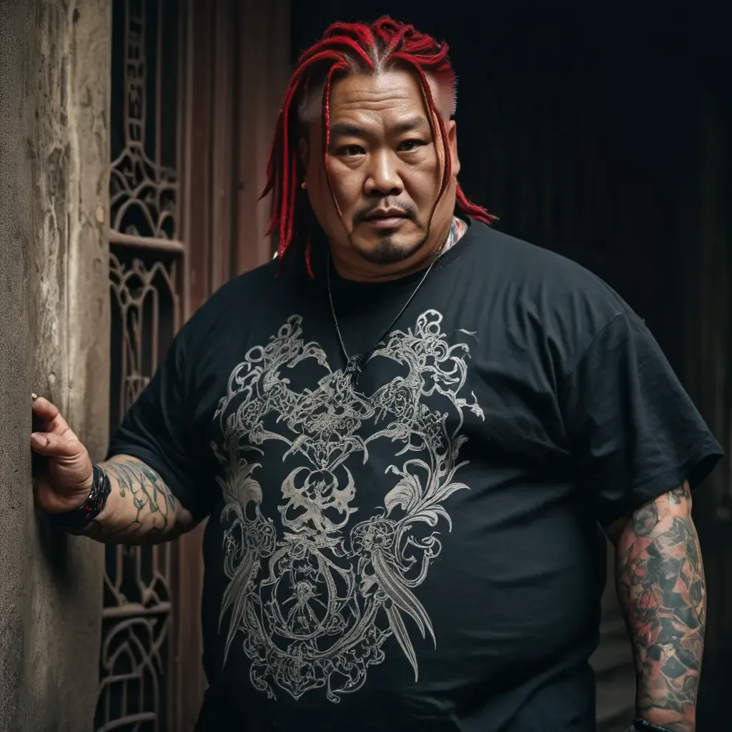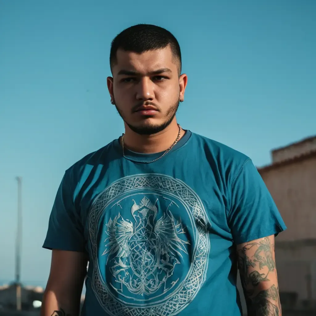 He is just wearing an old {biker jacket|t-shirt|open leather coat}.