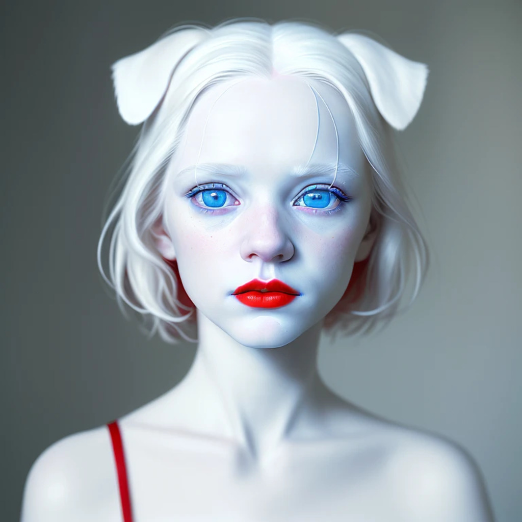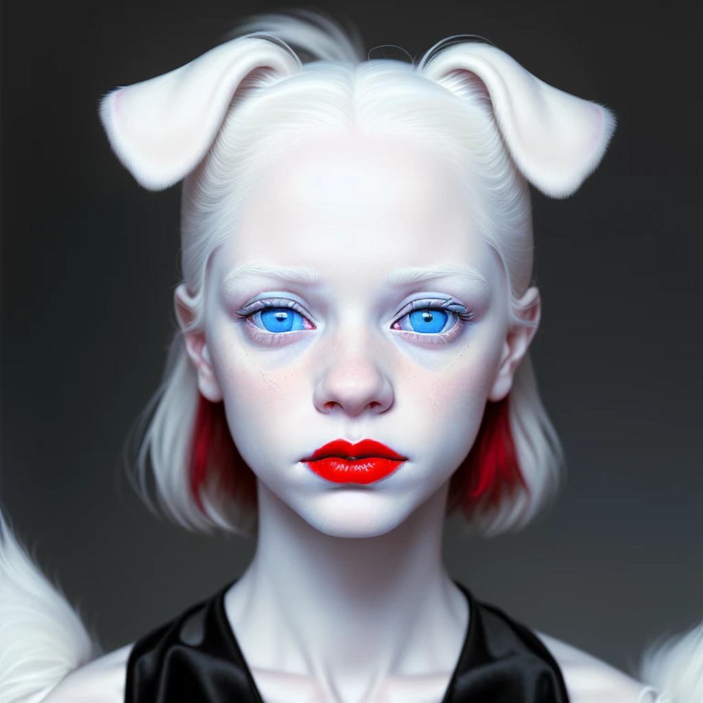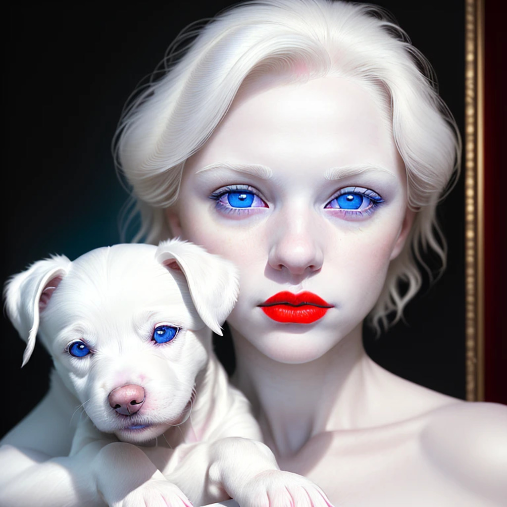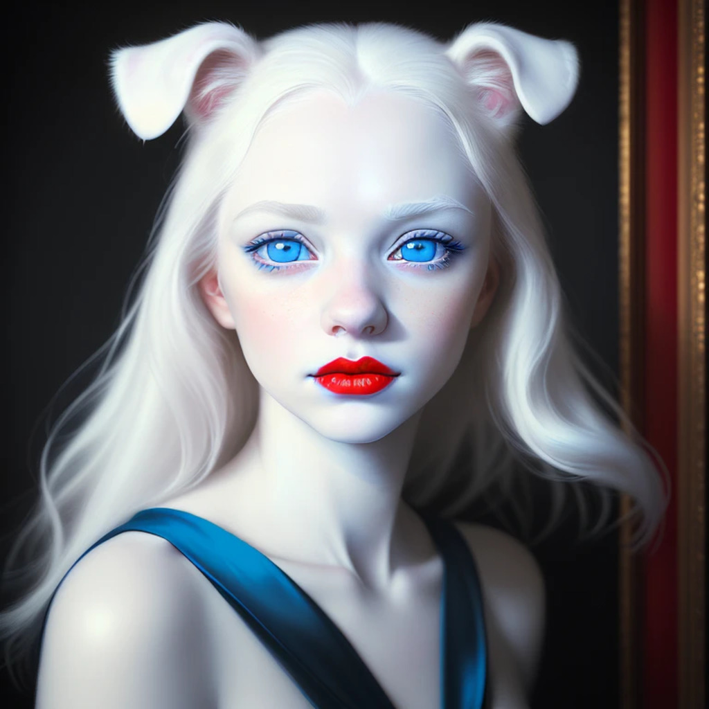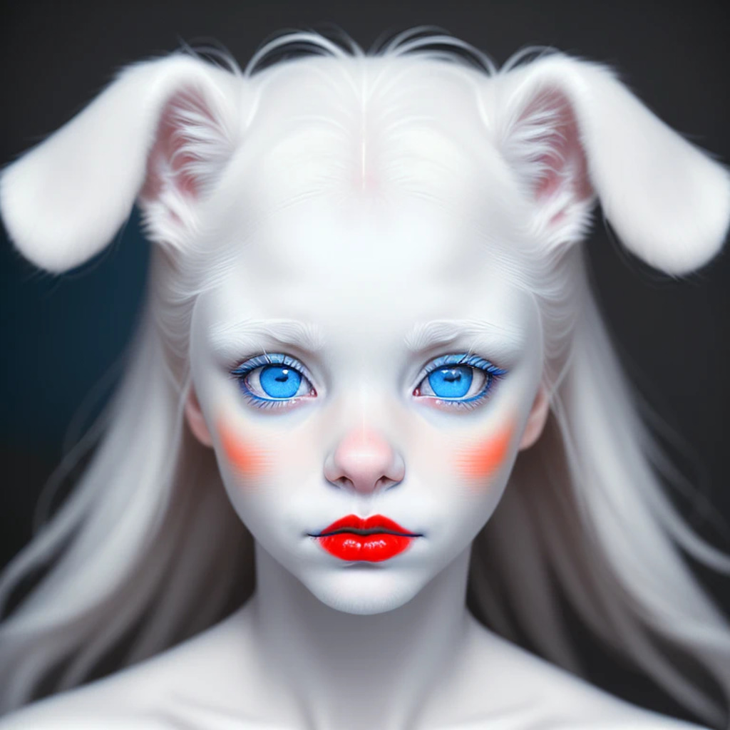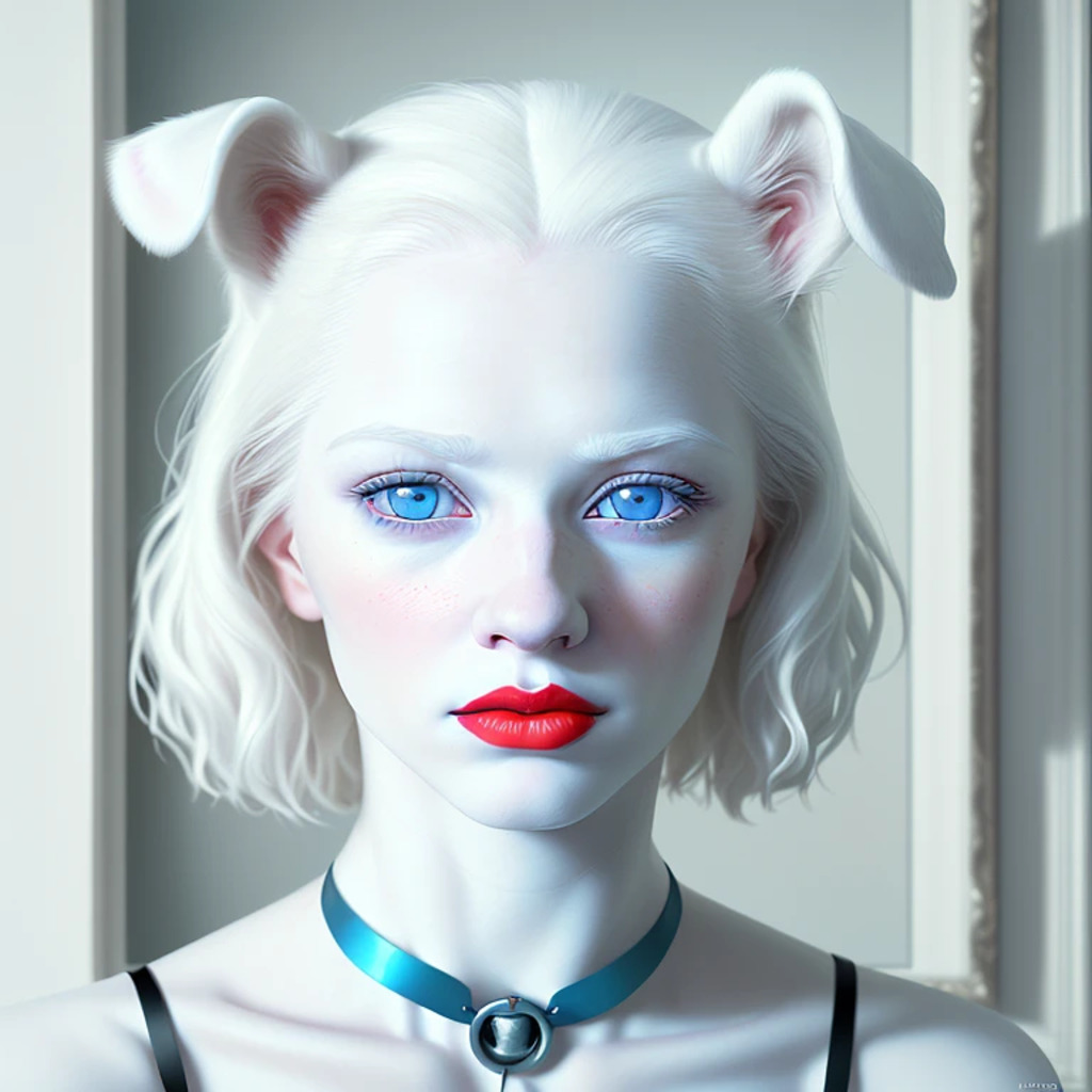 a portrait photography of a (albino:1.5) white ( dog: girl: 0.2), beautiful (blue eyes), (red lipstick: 1.2),