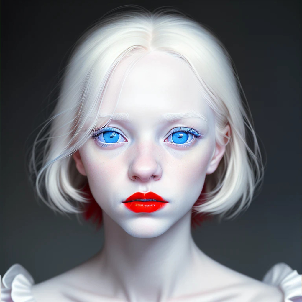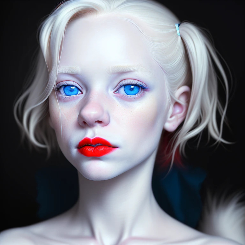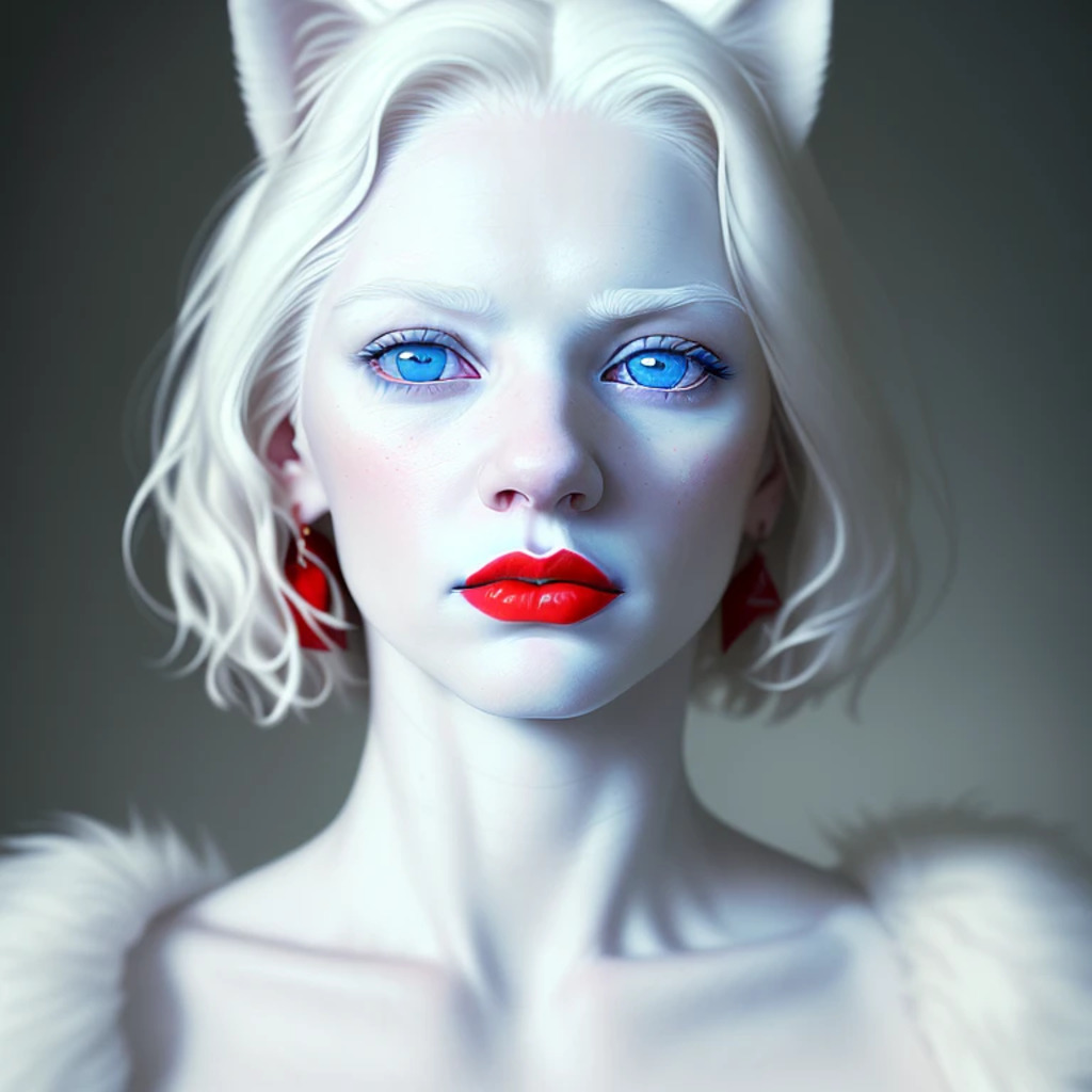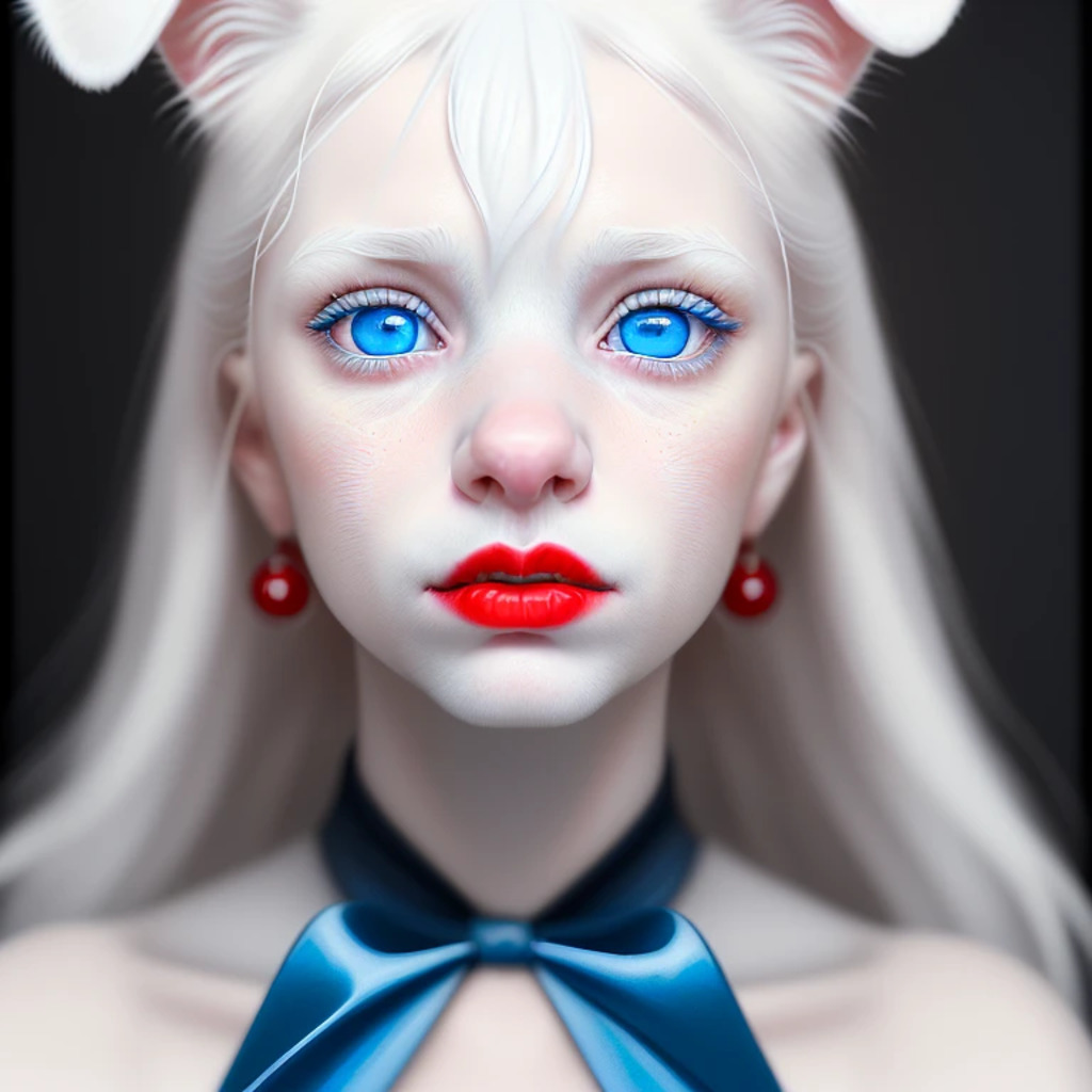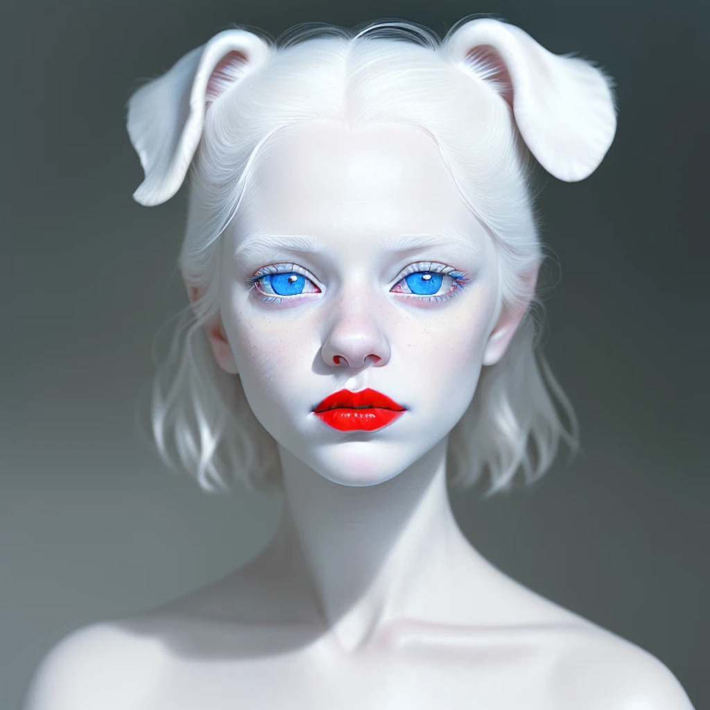a portrait photography of a (albino:1.5) white ( dog: girl: 0.2), beautiful (blue eyes), (red lipstick: 1.2),